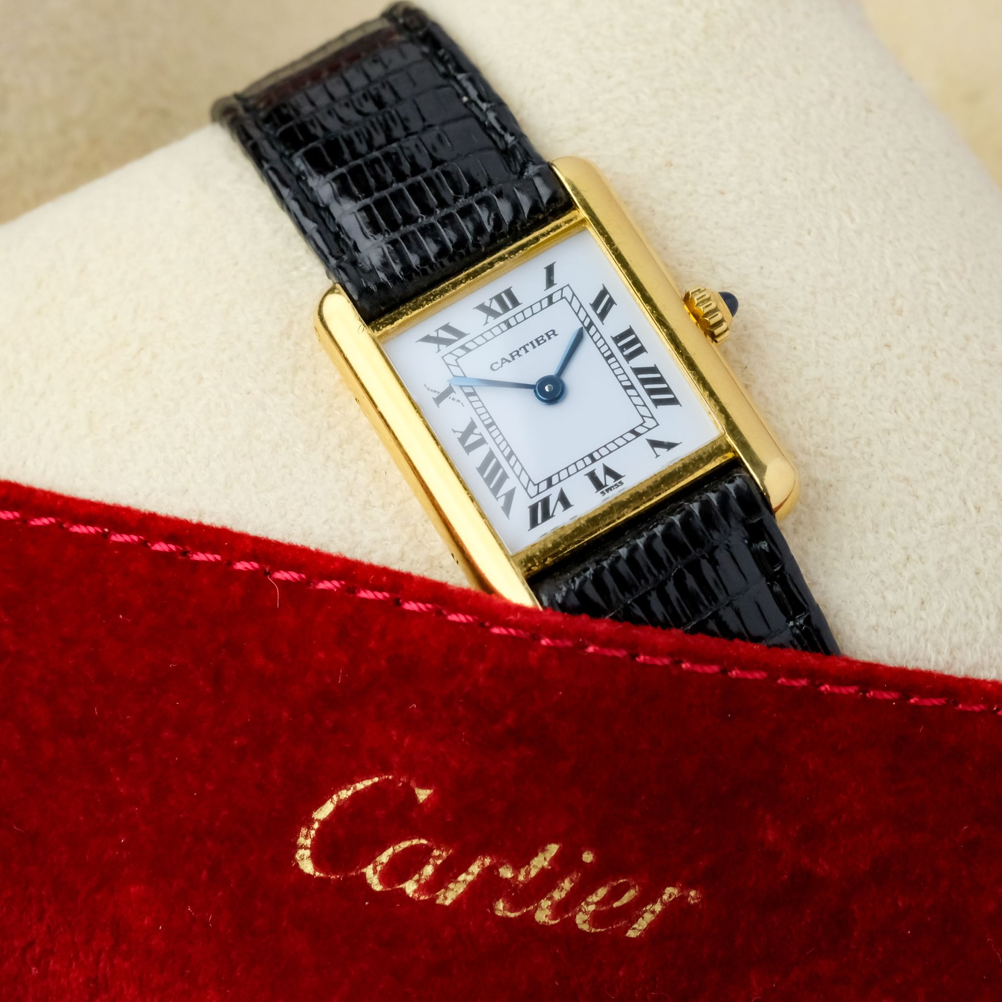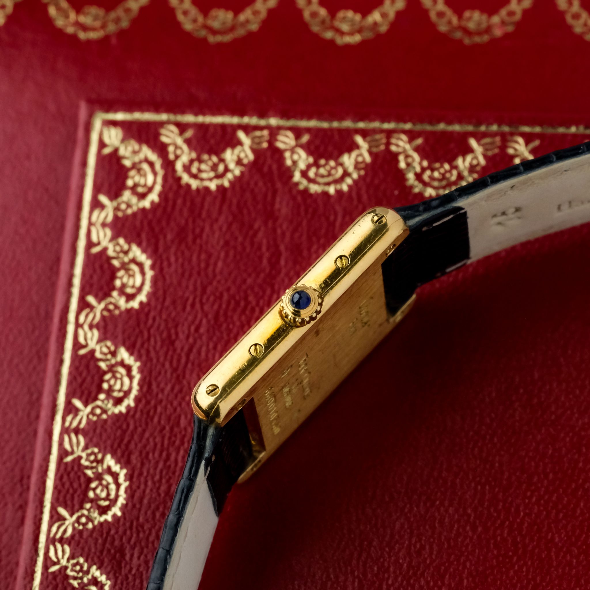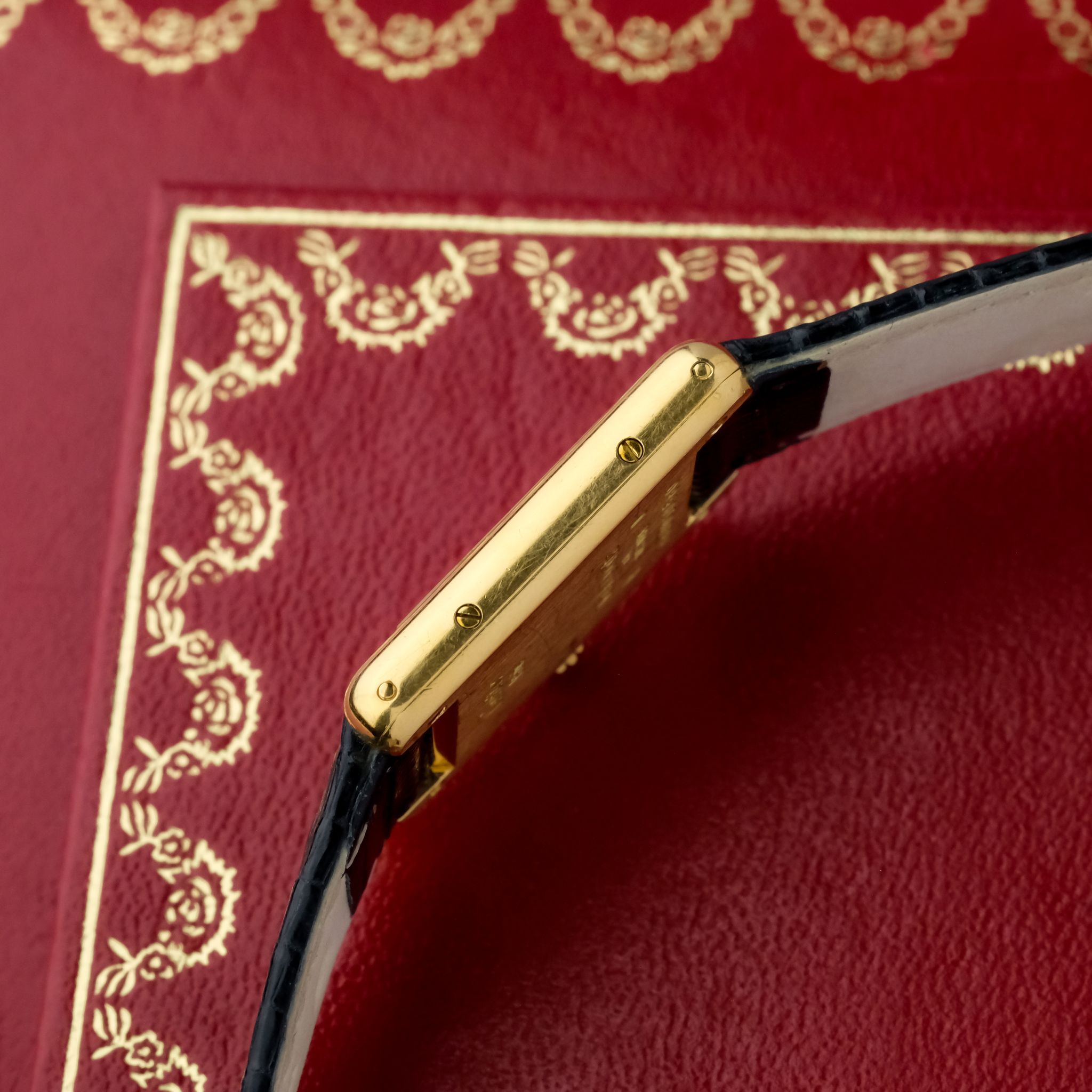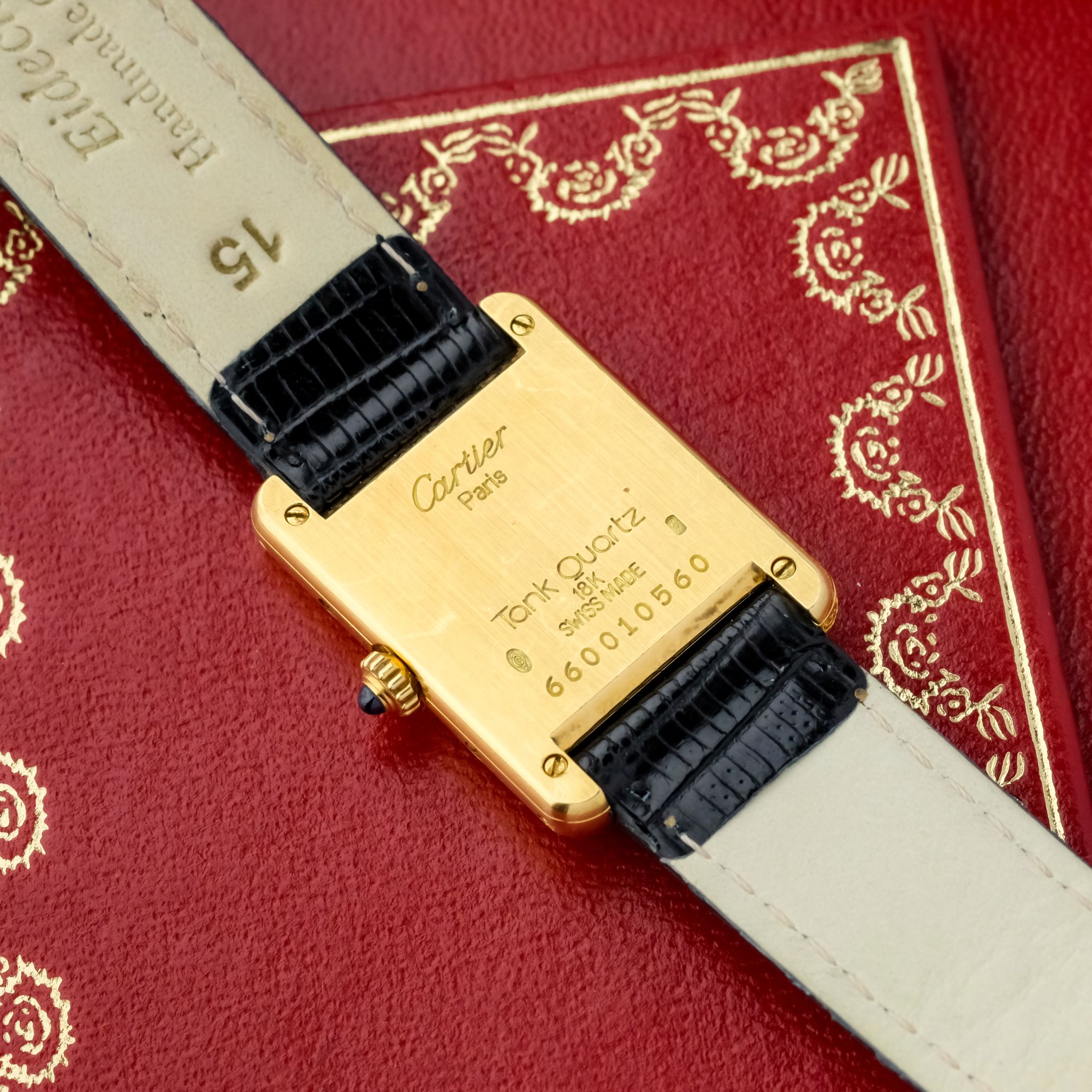 The Cartier Tank PM Ref. 66001 is a refined Lady model that embodies the timeless elegance of the iconic Tank line. Its rectangular 18K yellow gold case, classic white dial with Roman numerals, and blued steel hands reflect Cartier’s unmistakable design heritage. Powered by a precise quartz movement, this watch offers reliable timekeeping with minimal maintenance. Its slim and elegant profile makes it an ideal choice for everyday sophistication as well as evening wear. This example comes on a black leather strap (non-Cartier) and is offered without original box or papers. It is in good, worn condition with light signs of use, retaining its beautiful luster and charm.