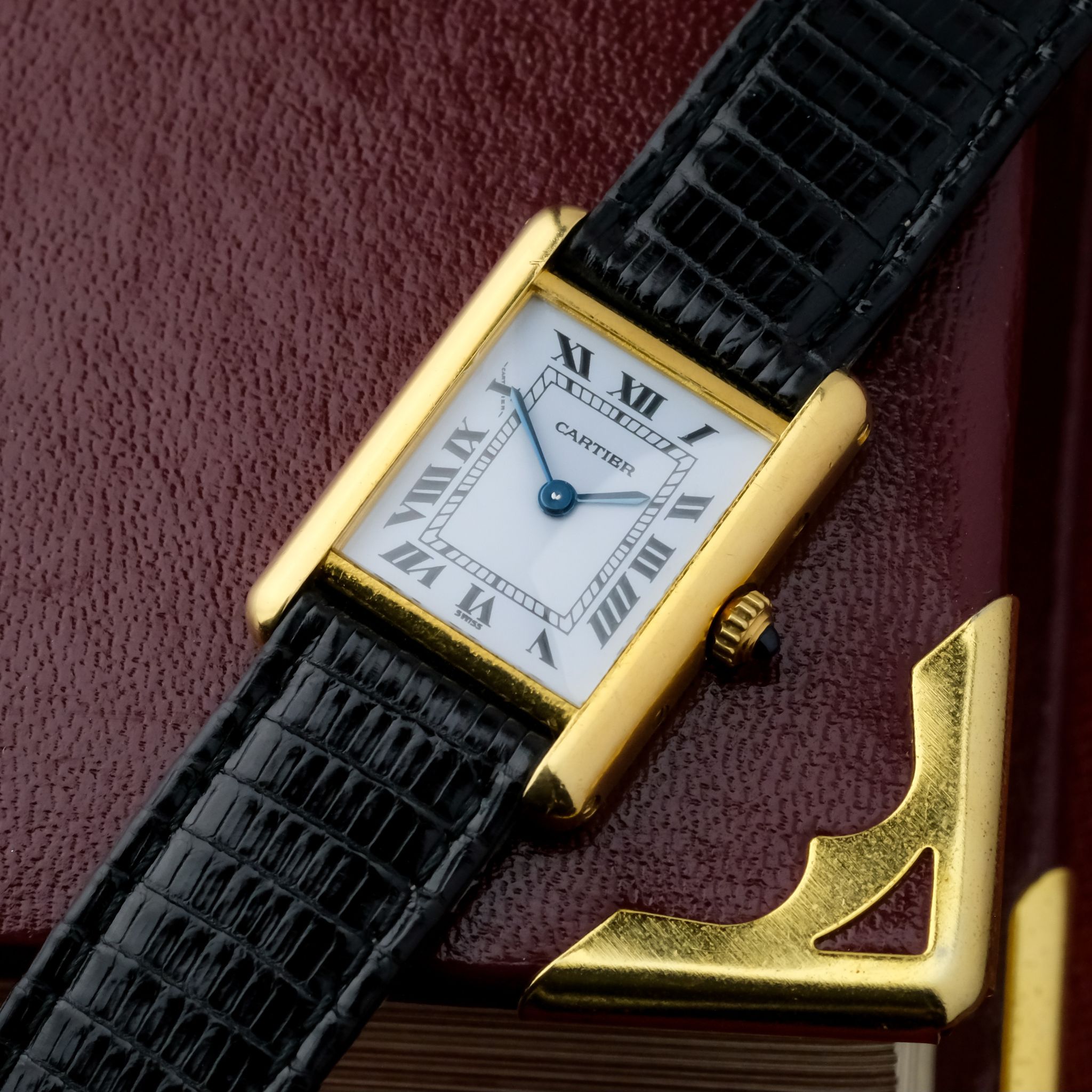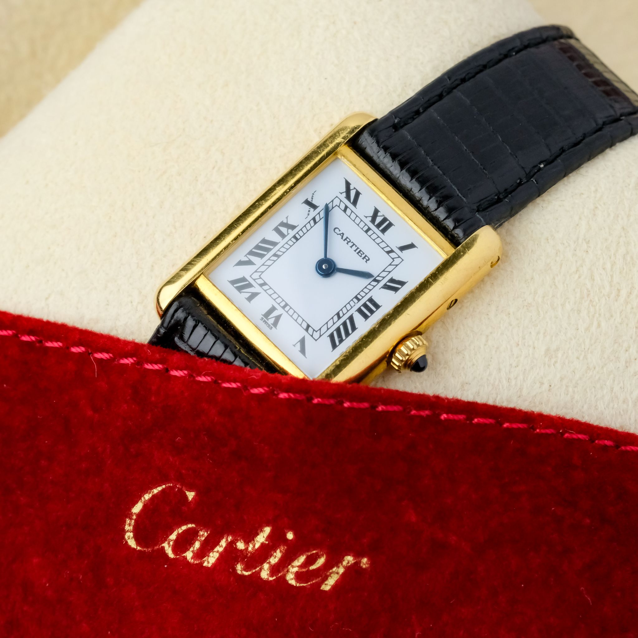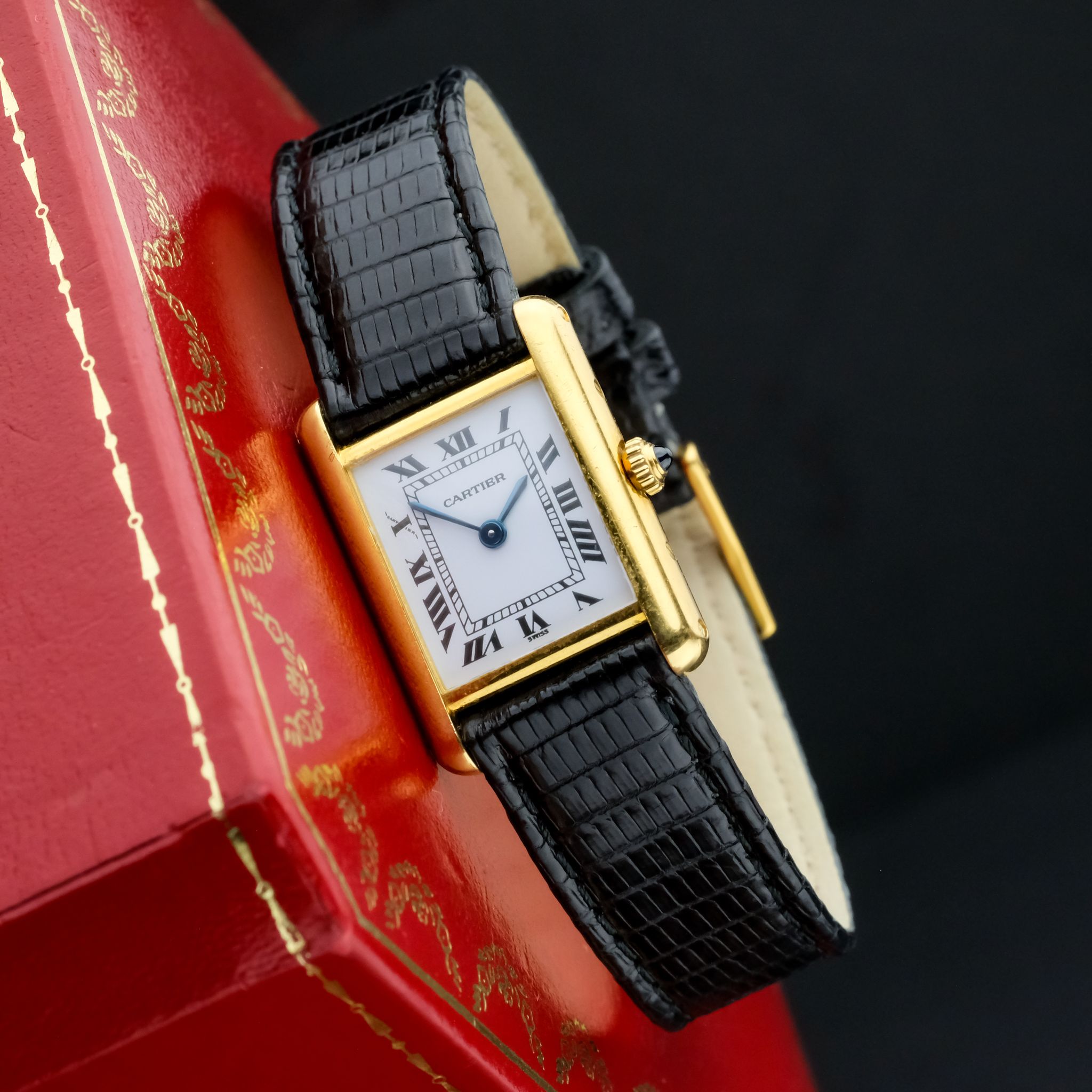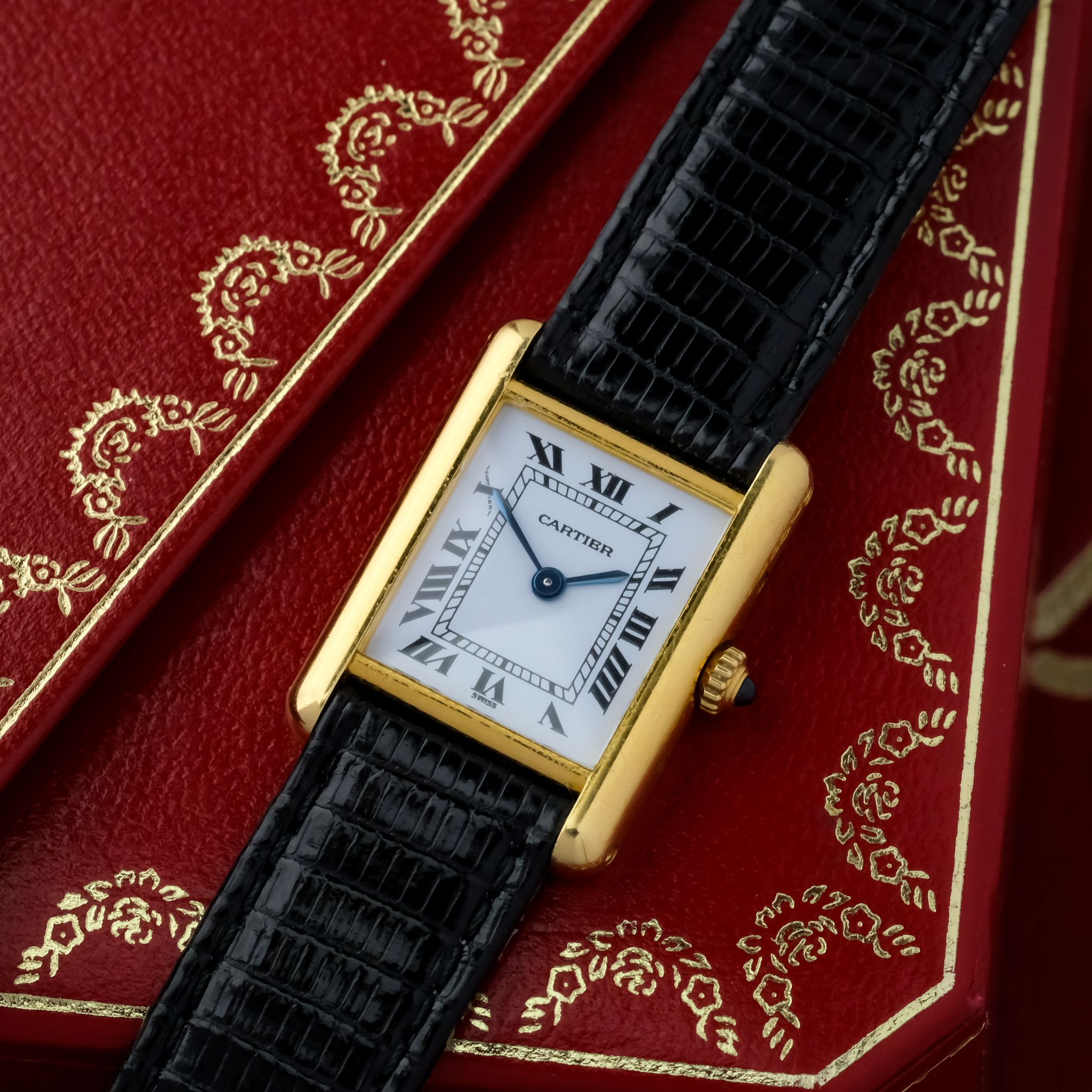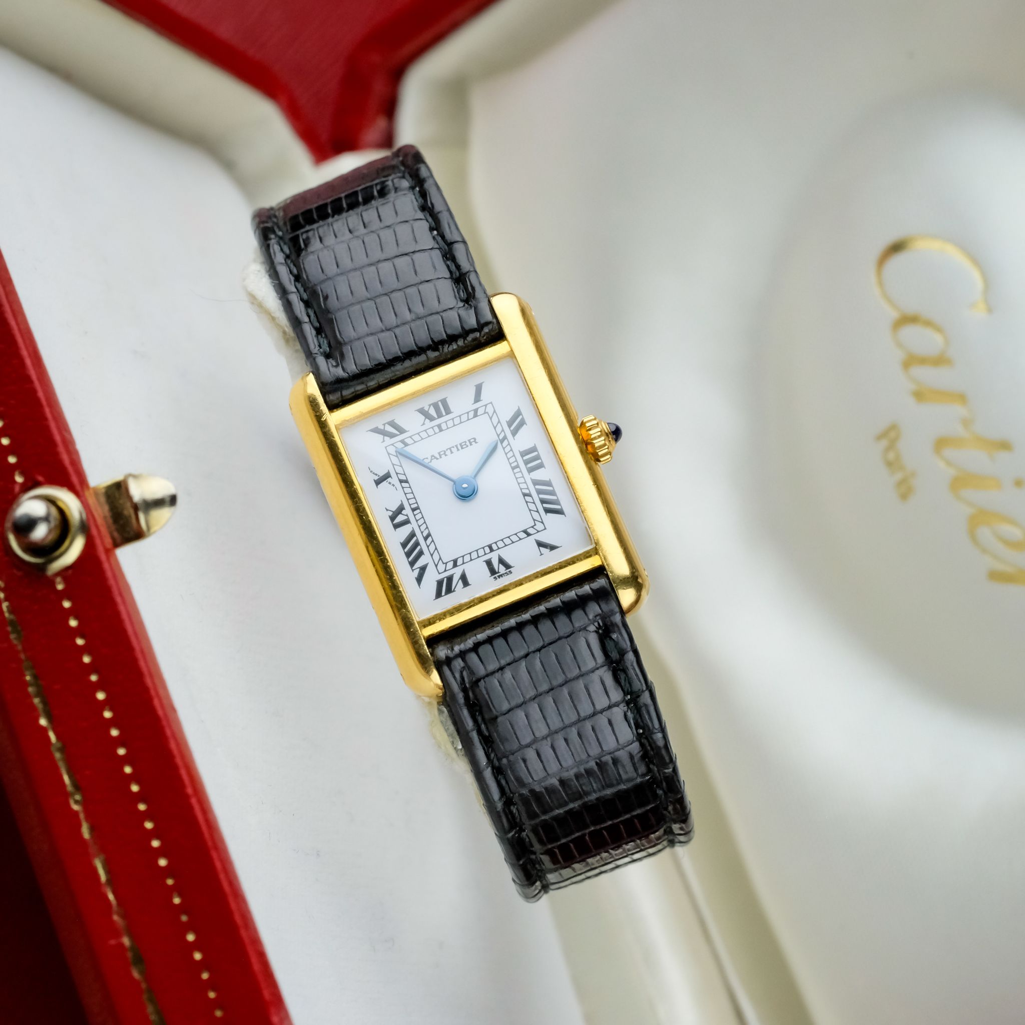 The Cartier Tank PM Ref. 66001 is a refined Lady model that embodies the timeless elegance of the iconic Tank line. Its rectangular 18K yellow gold case, classic white dial with Roman numerals, and blued steel hands reflect Cartier’s unmistakable design heritage. Powered by a precise quartz movement, this watch offers reliable timekeeping with minimal maintenance. Its slim and elegant profile makes it an ideal choice for everyday sophistication as well as evening wear. This example comes on a black leather strap (non-Cartier) and is offered without original box or papers. It is in good, worn condition with light signs of use, retaining its beautiful luster and charm.