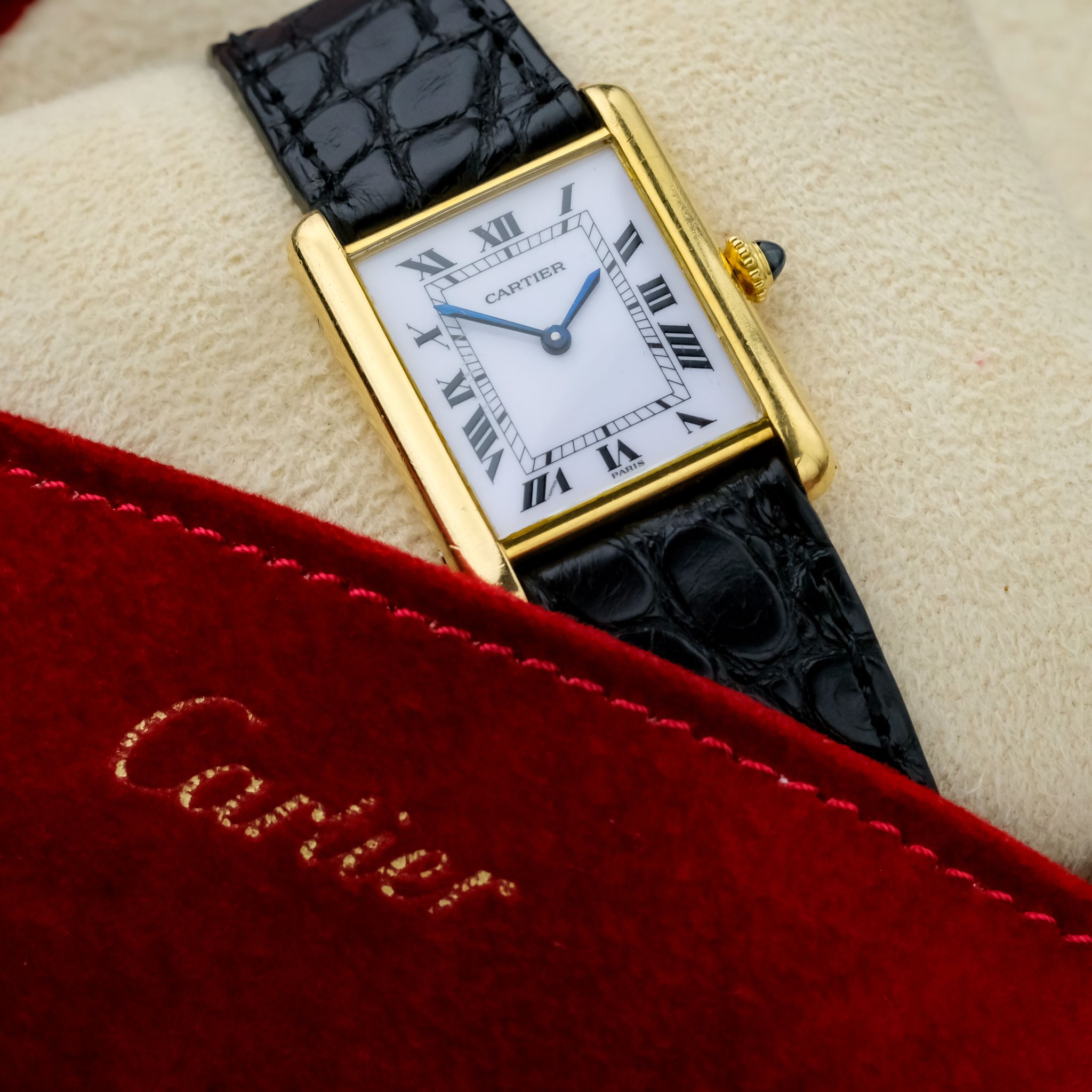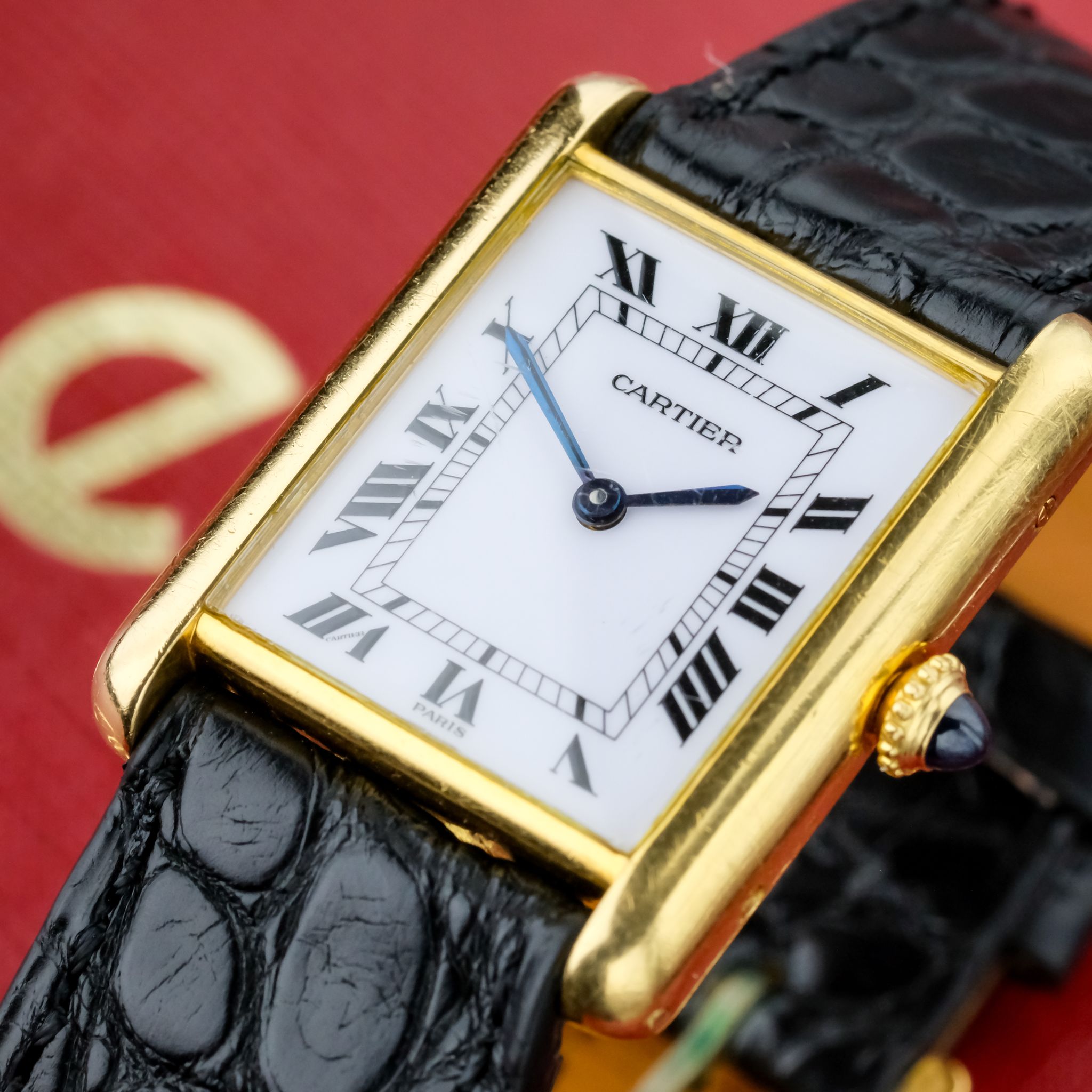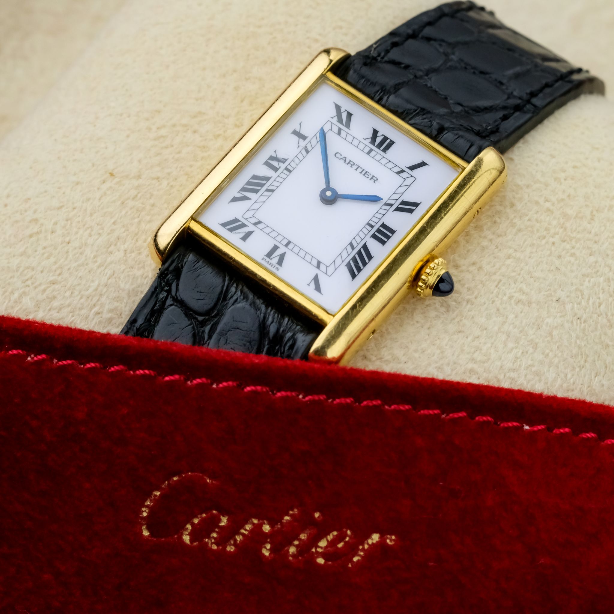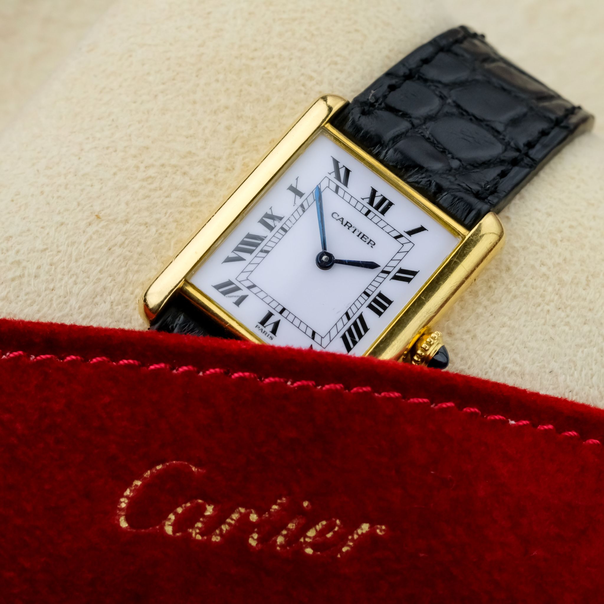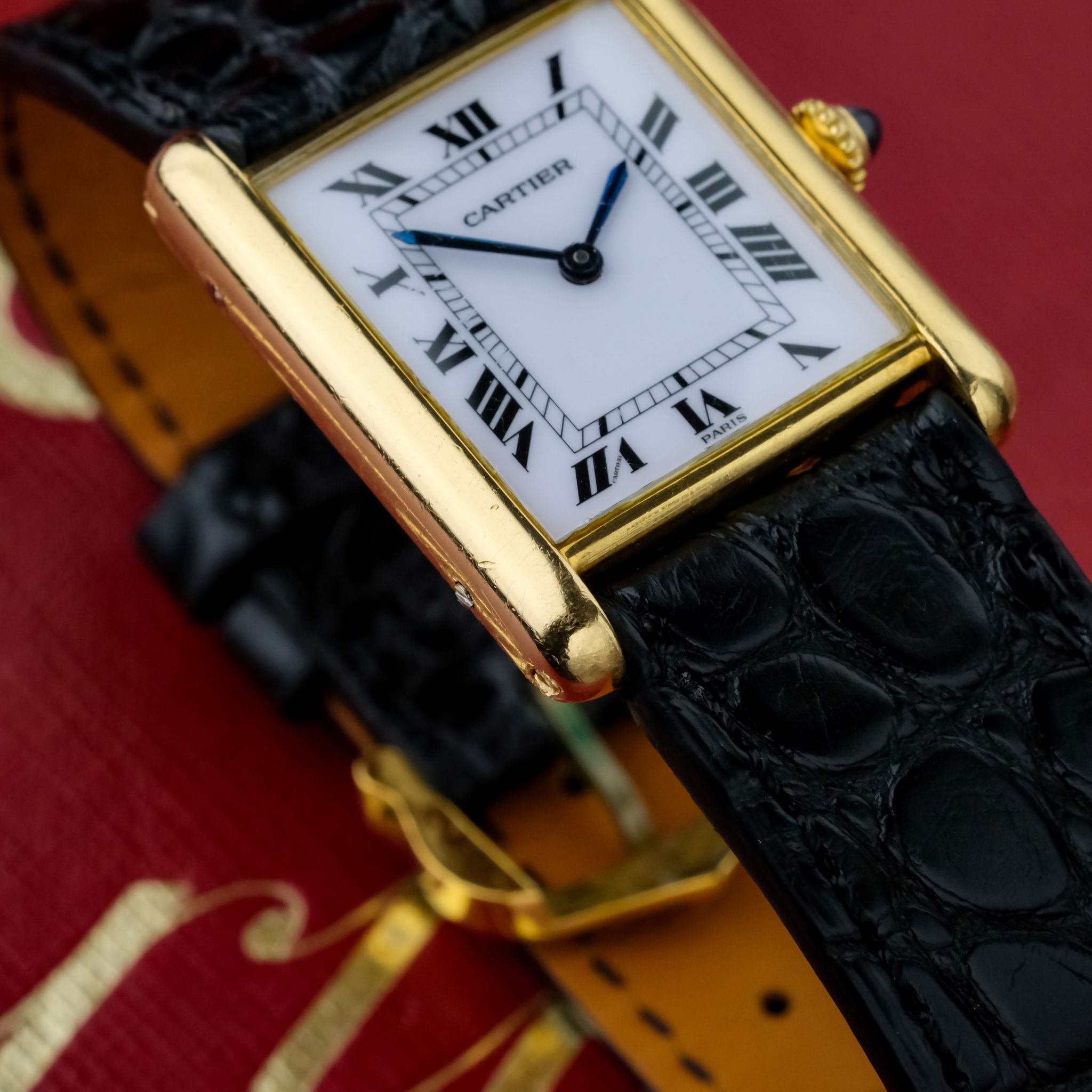 Very nice Cartier Tank Louis ref. 78086 with *Paris signed dial and an unpolished, worn 750/ yellow gold case as well as beautiful gold plated Cartier buckle.