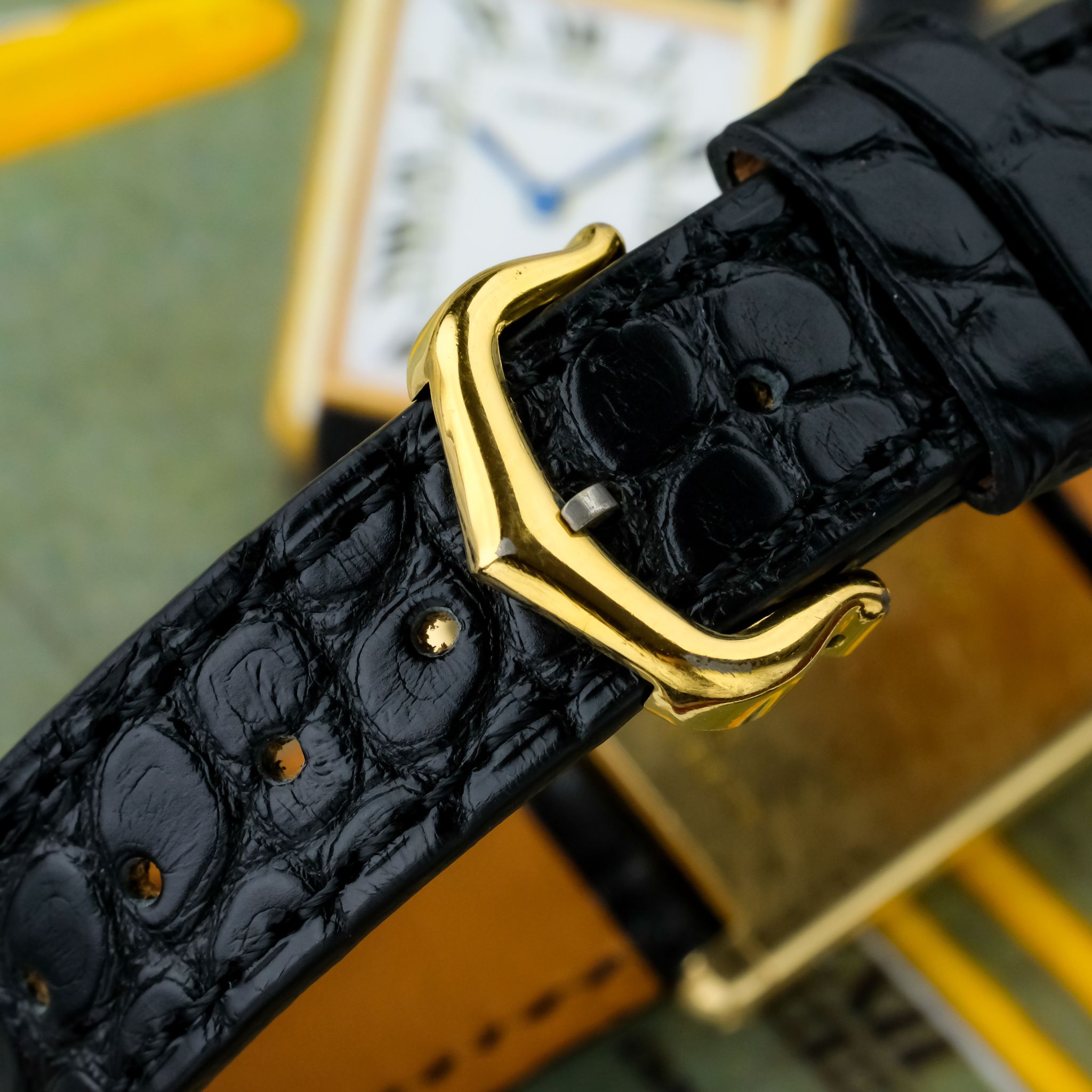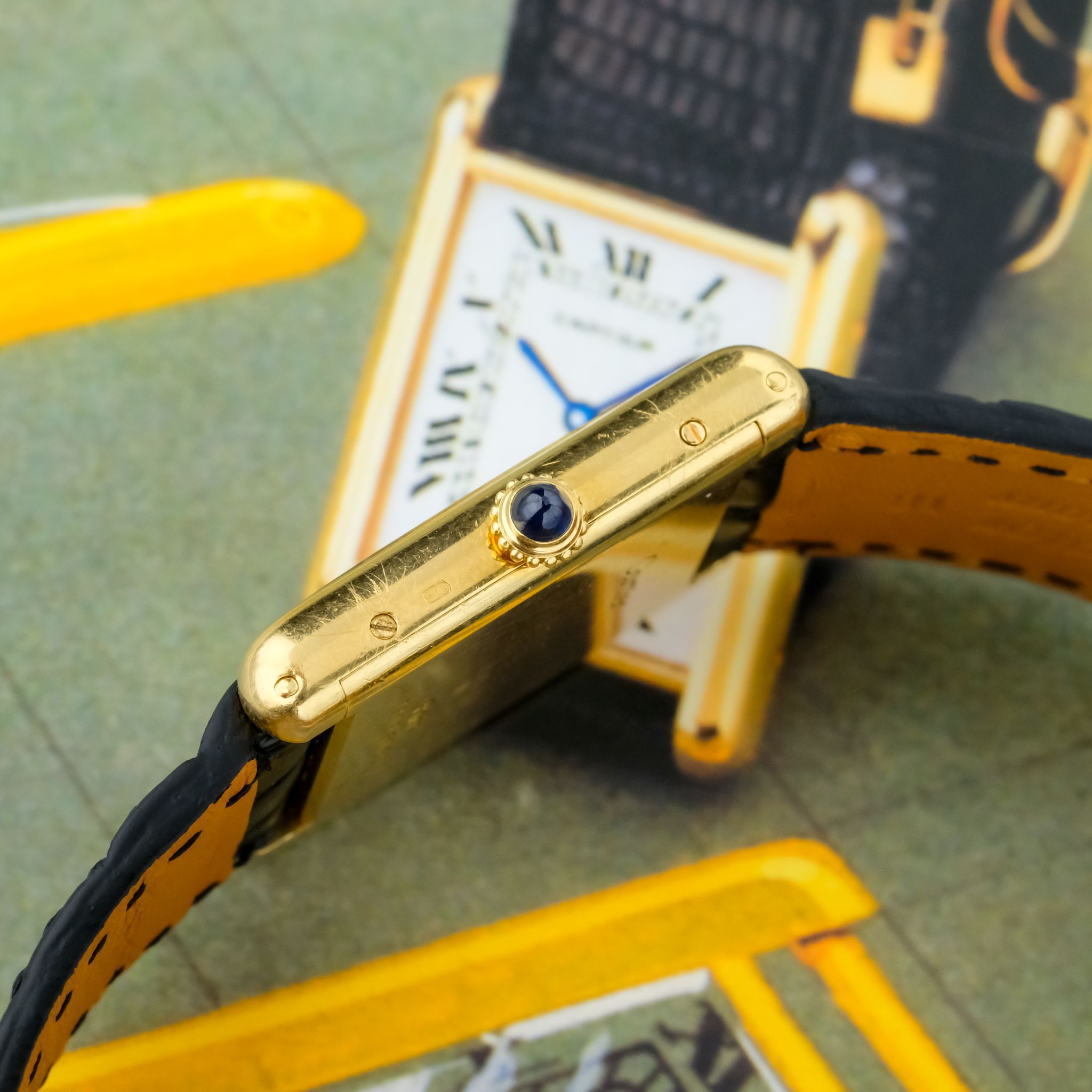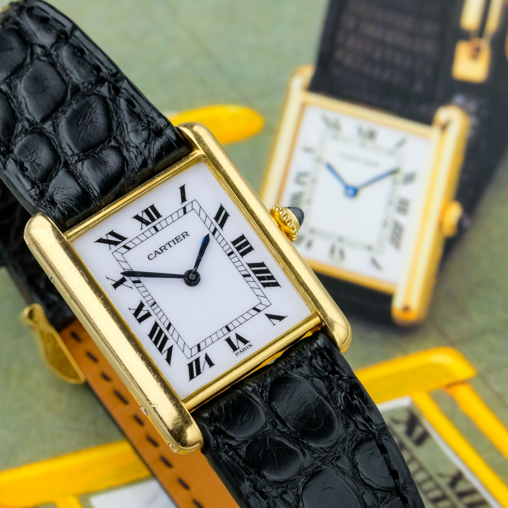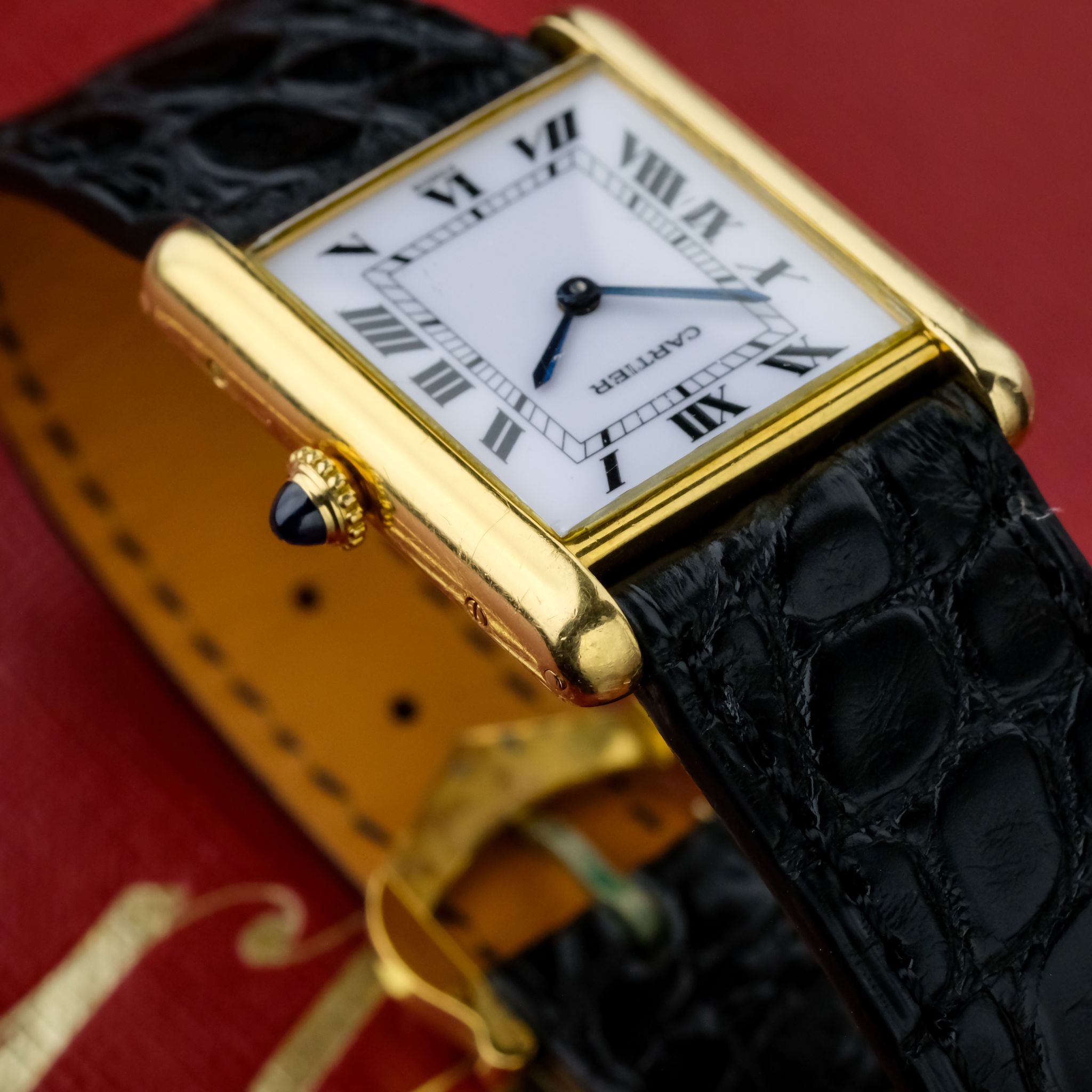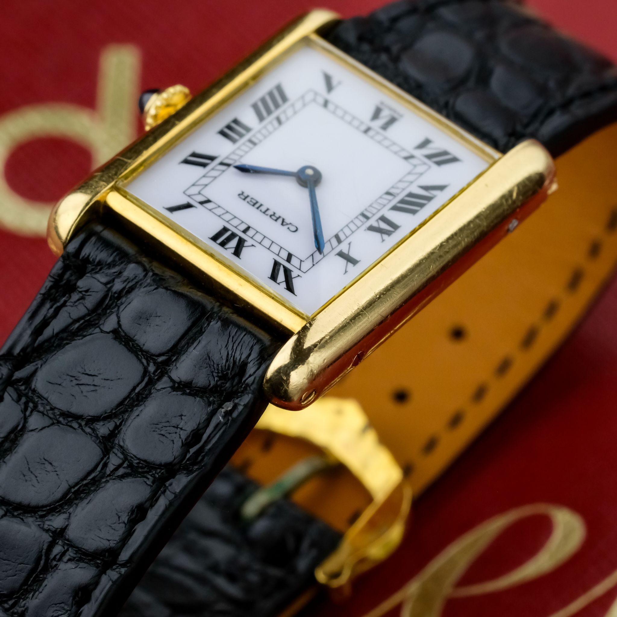 Very nice Cartier Tank Louis ref. 78086 with *Paris signed dial and an unpolished, worn 750/ yellow gold case as well as beautiful gold plated Cartier buckle.