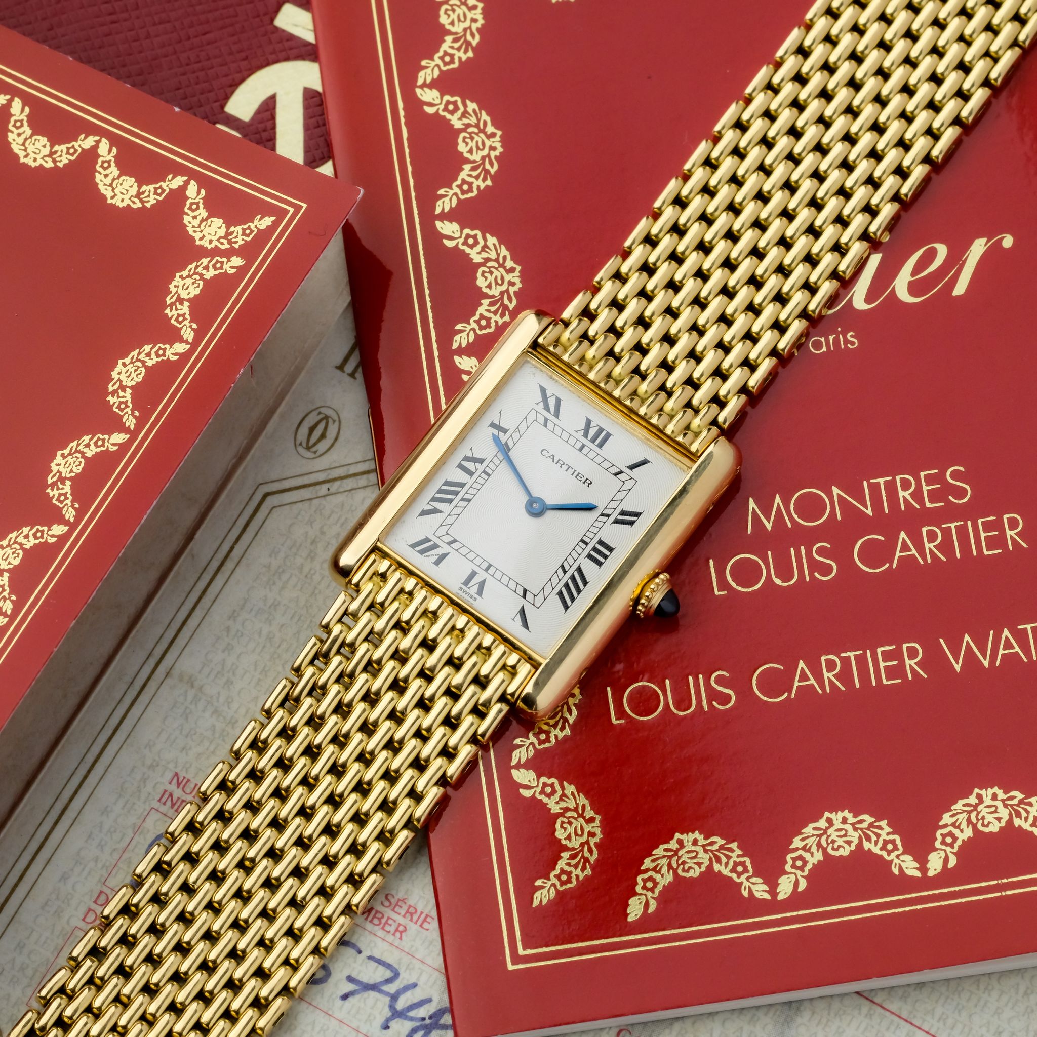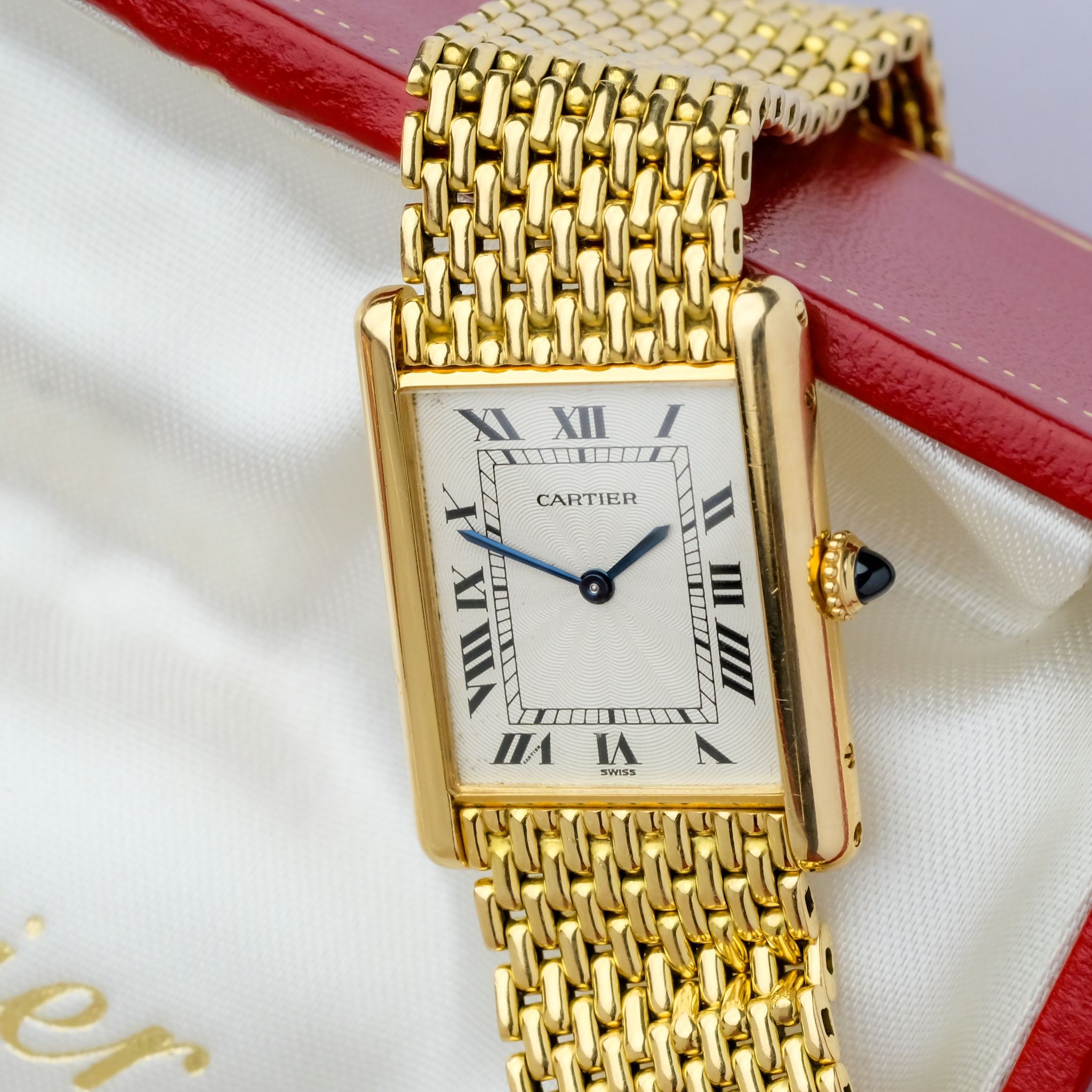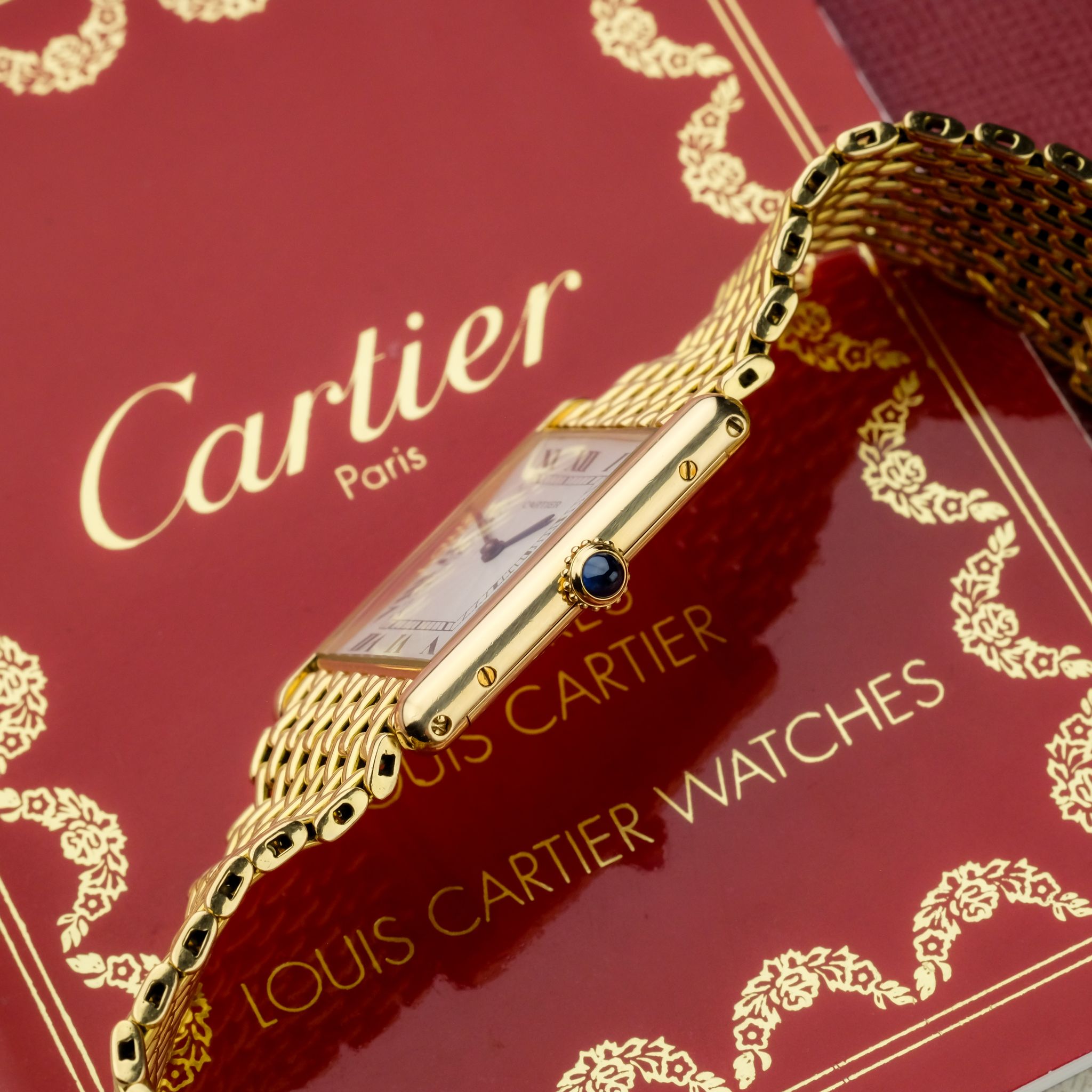 Its standout feature is the beautifully crafted grain de riz bracelet, a supple and intricate gold weave that complements the watch’s minimalist rectangular design. With its clean Roman dial and timeless silhouette, the 96065 captures the essence of Cartier’s golden-era watchmaking: slim, luxurious, and effortlessly sophisticated.