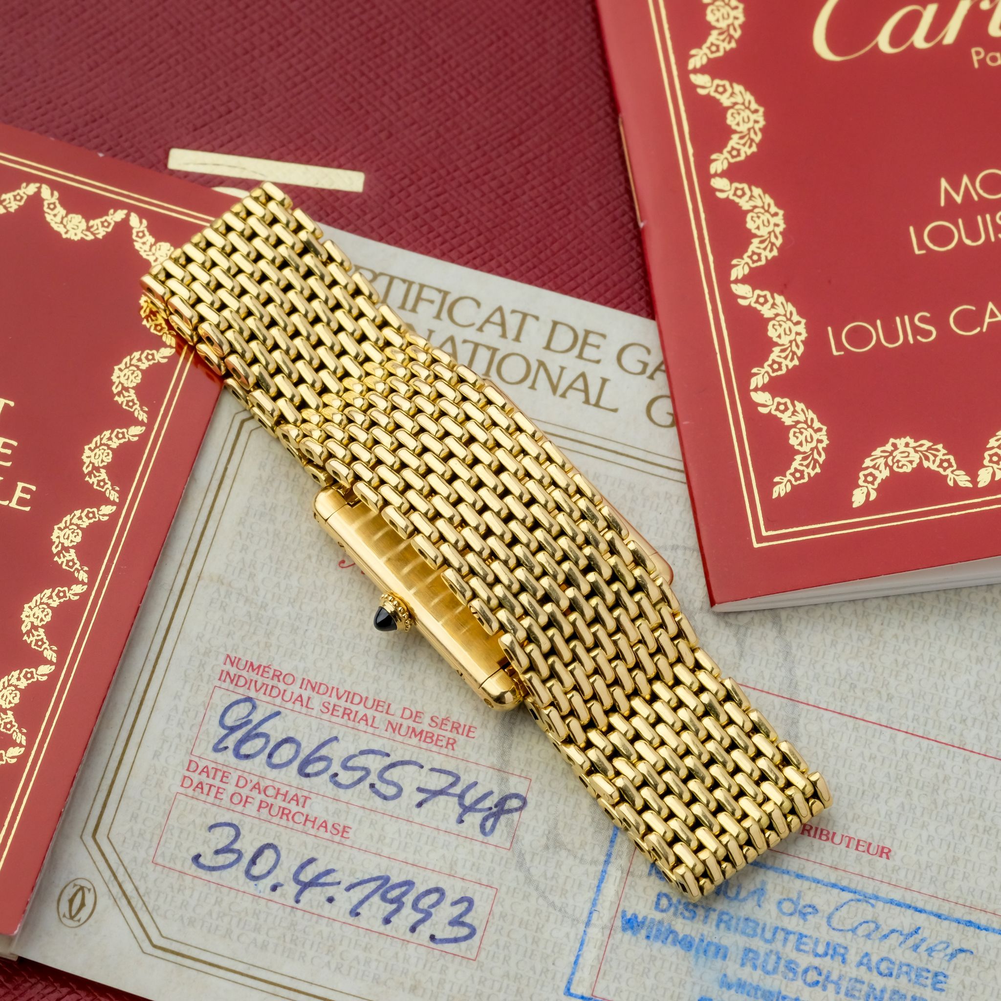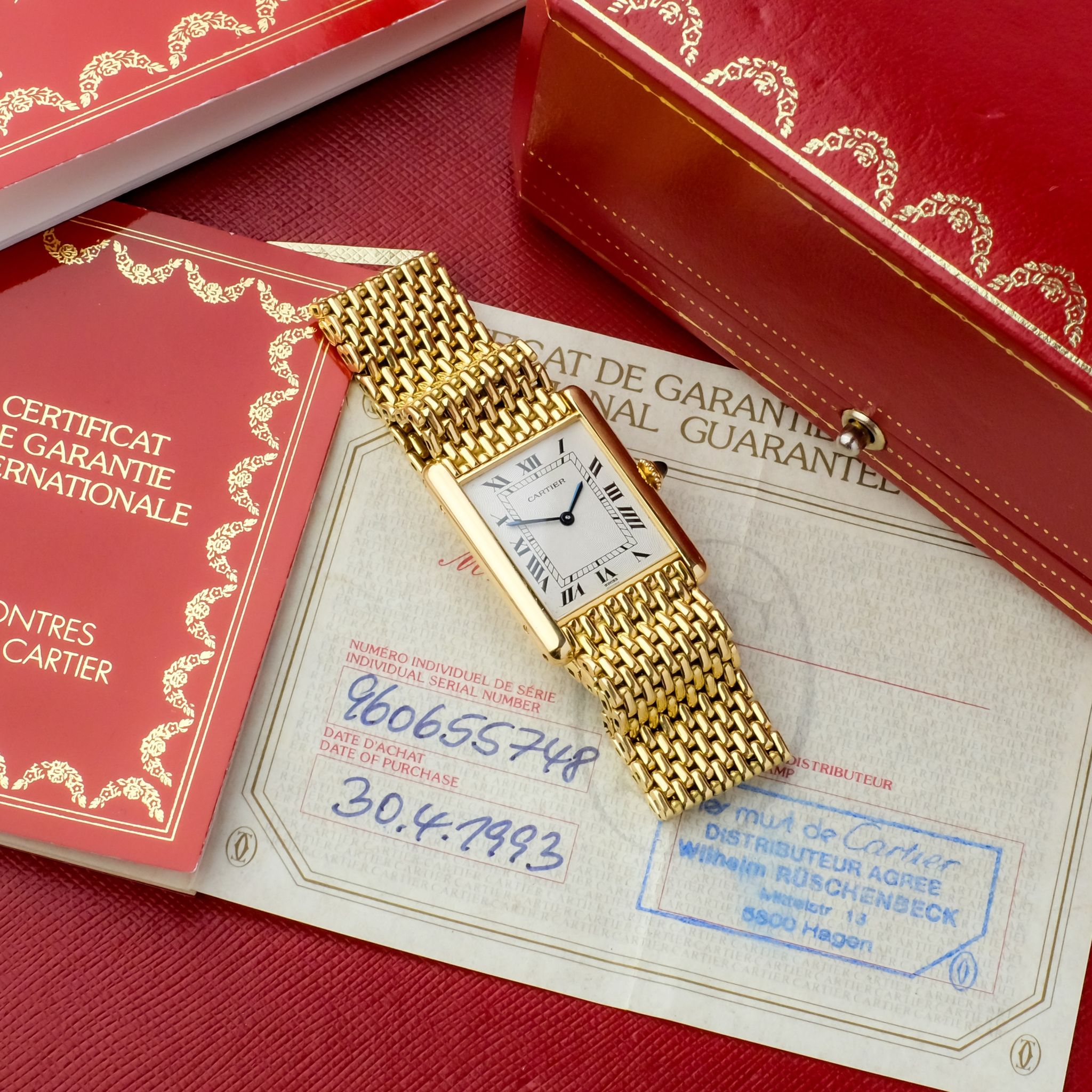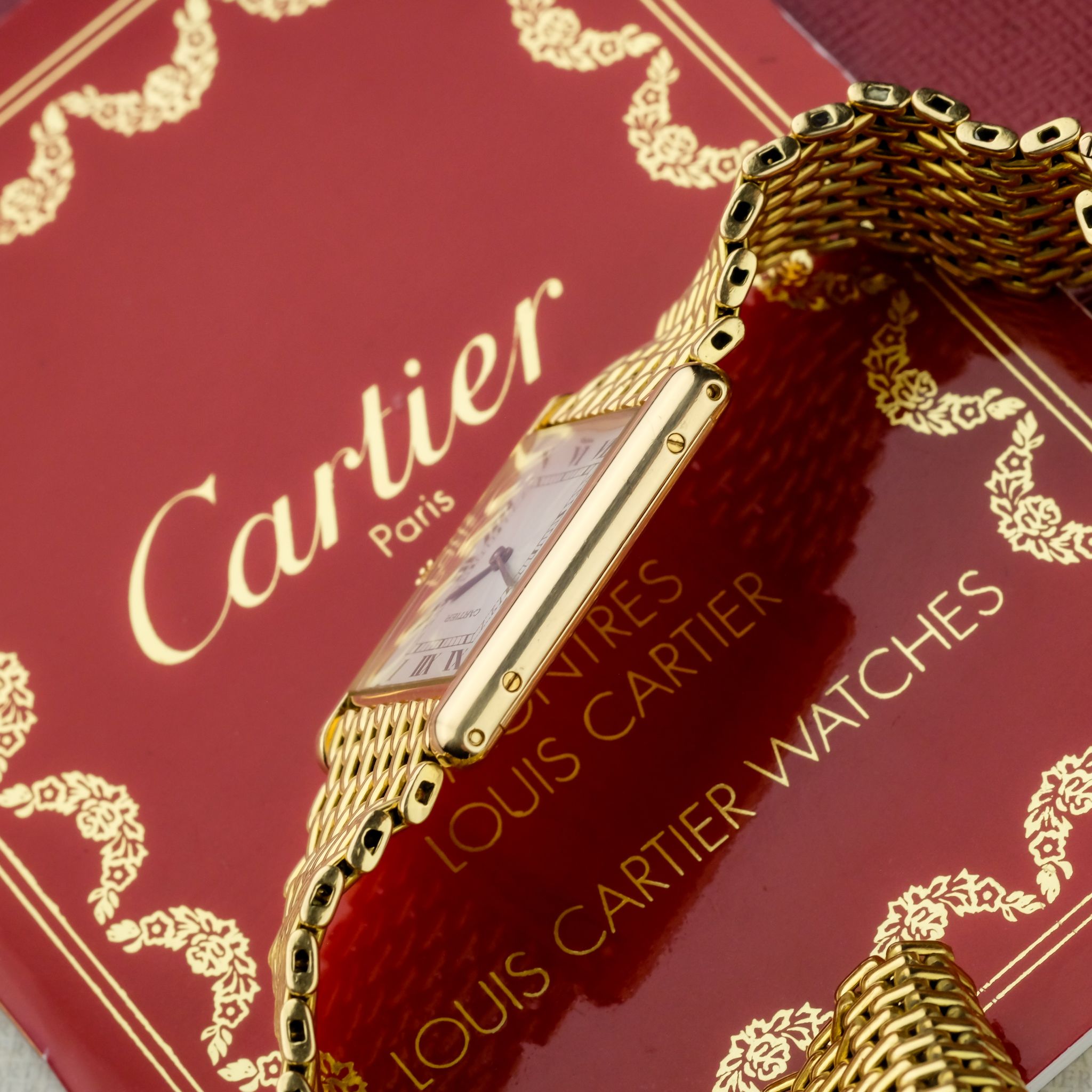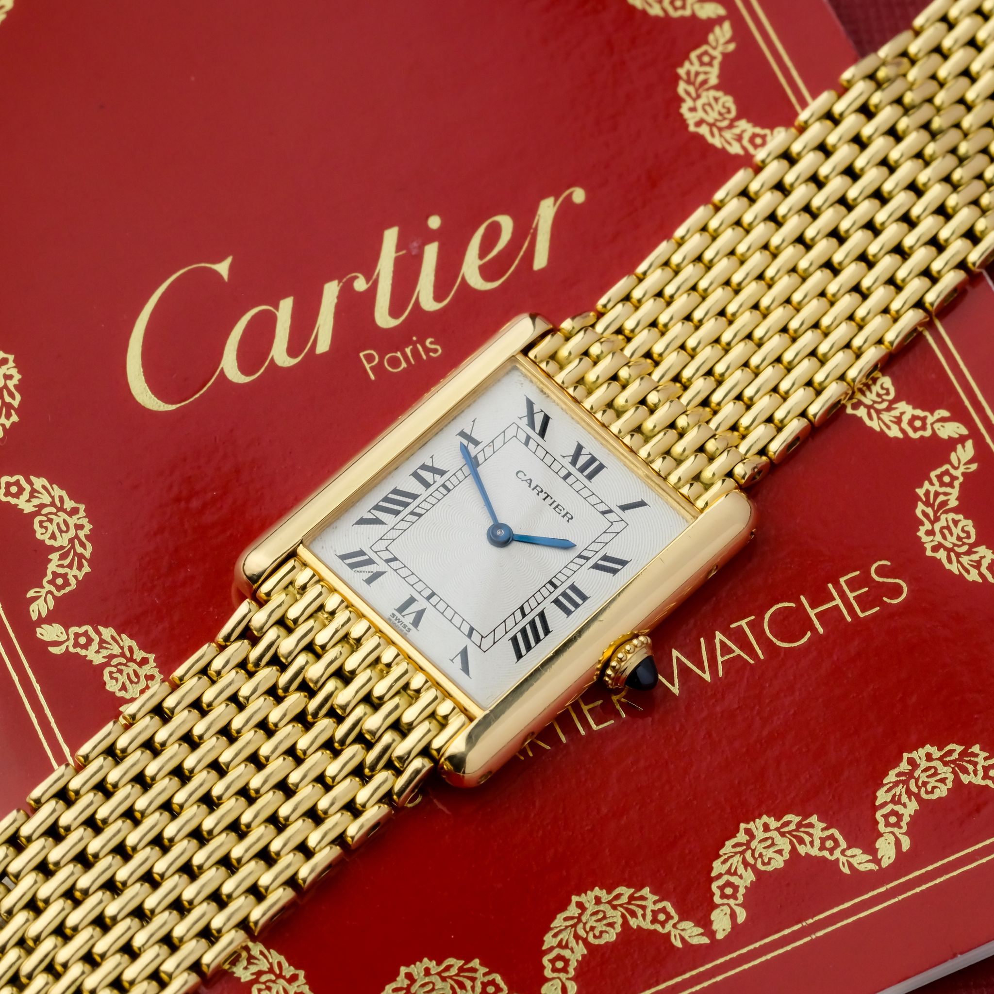 Its standout feature is the beautifully crafted grain de riz bracelet, a supple and intricate gold weave that complements the watch’s minimalist rectangular design. With its clean Roman dial and timeless silhouette, the 96065 captures the essence of Cartier’s golden-era watchmaking: slim, luxurious, and effortlessly sophisticated.