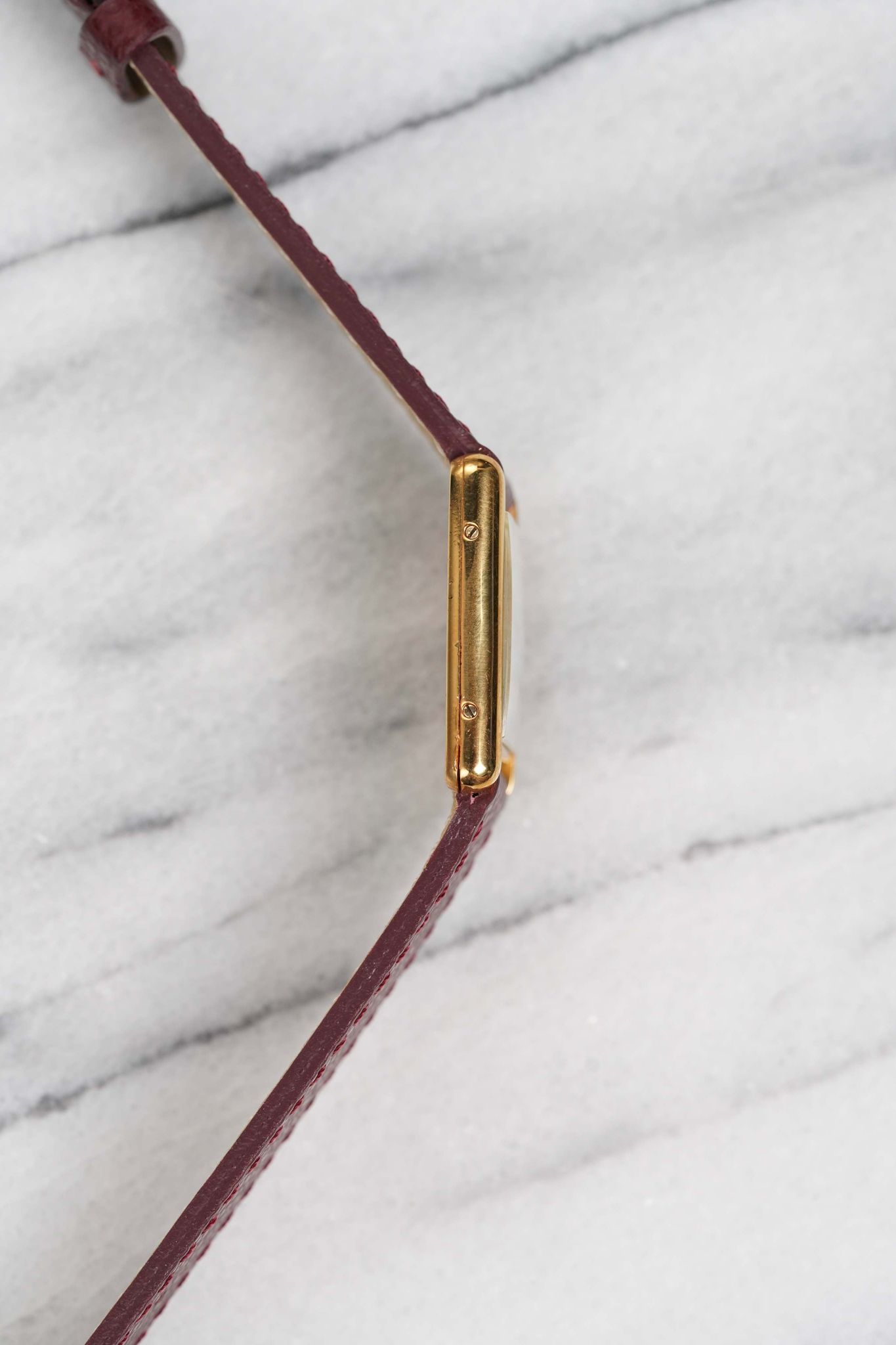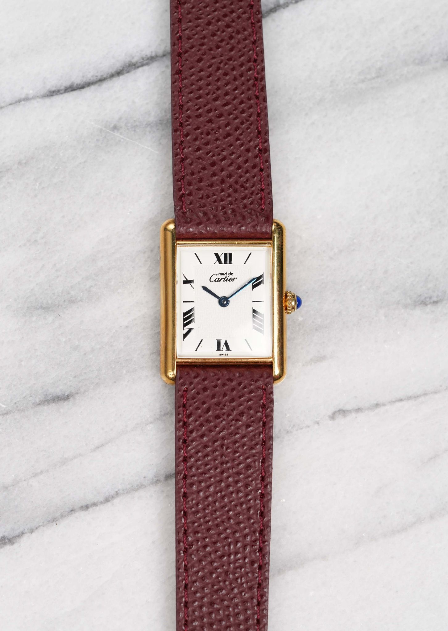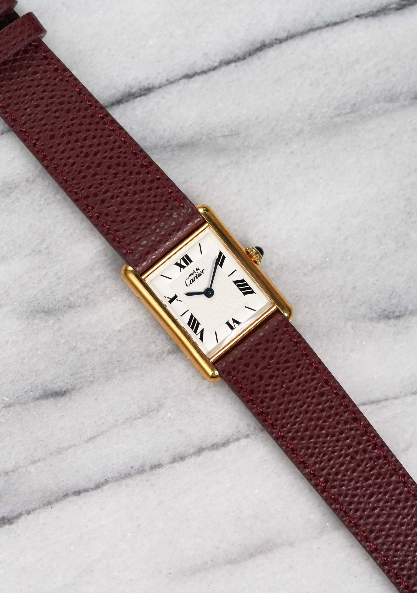 Here's a vintage must de Cartier tank quartz with a white roman numeral dial from early 80s. Keeps great time and is fully functional. Measurements include a 23x30mm tank case size and 18mm lug width. It's on an aftermarket red pebble textured leather strap (Made in Italy). 18K yellow gold electroplated case. The case and caseback are in great condition. Matching black roman numerals and minute track. Blued hands. Original blue cabochon crown. Overall, the case has maintained its yellow gold plating. A unique Cartier monogram dial. The dial and crystal are free from any scratches or marks. All parts are original including the dial, crown, movement, and caseback. Both the dial and case are in great cosmetic, untouched condition.