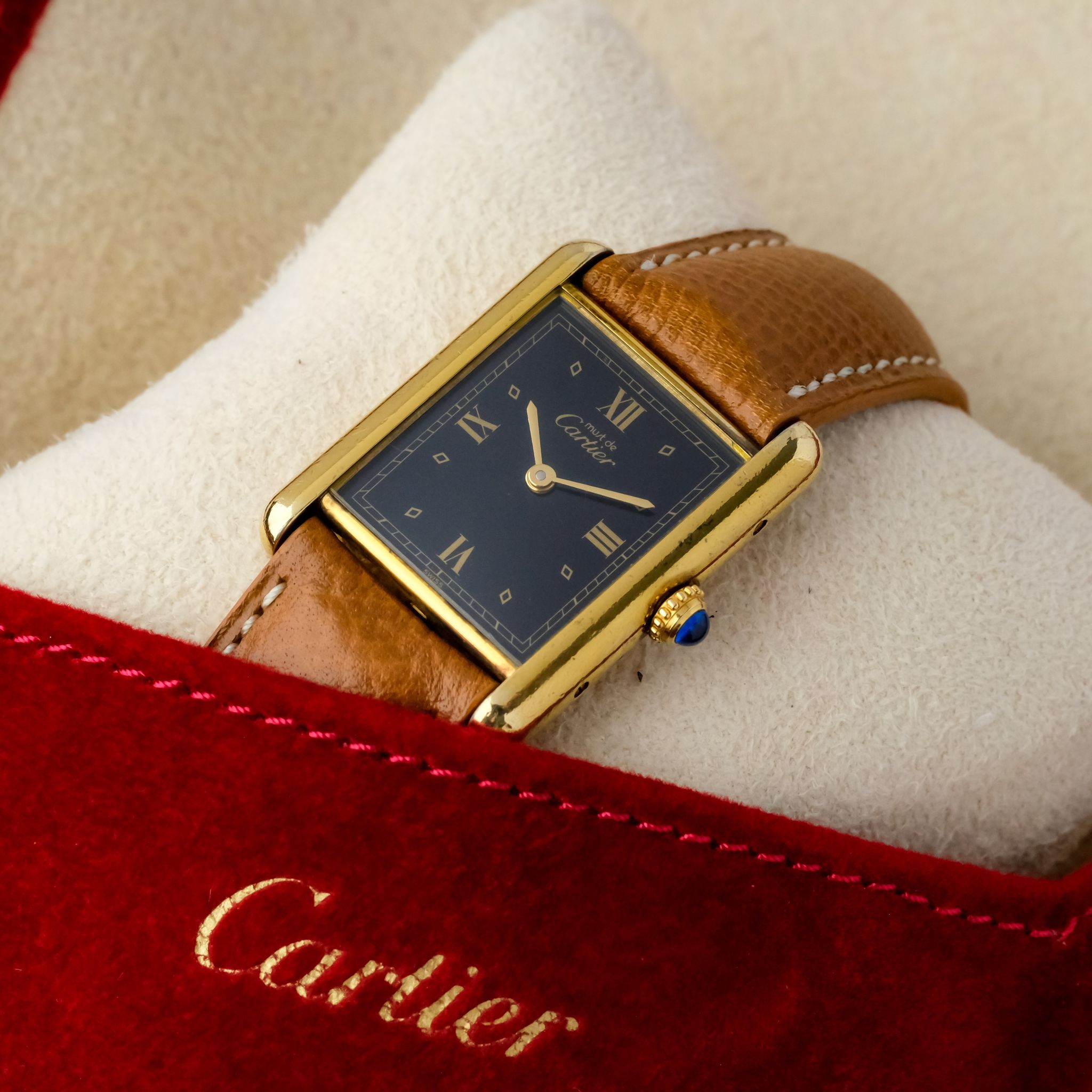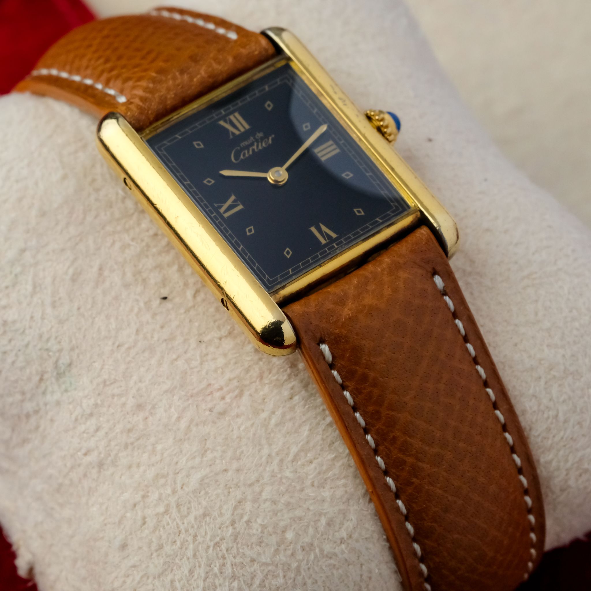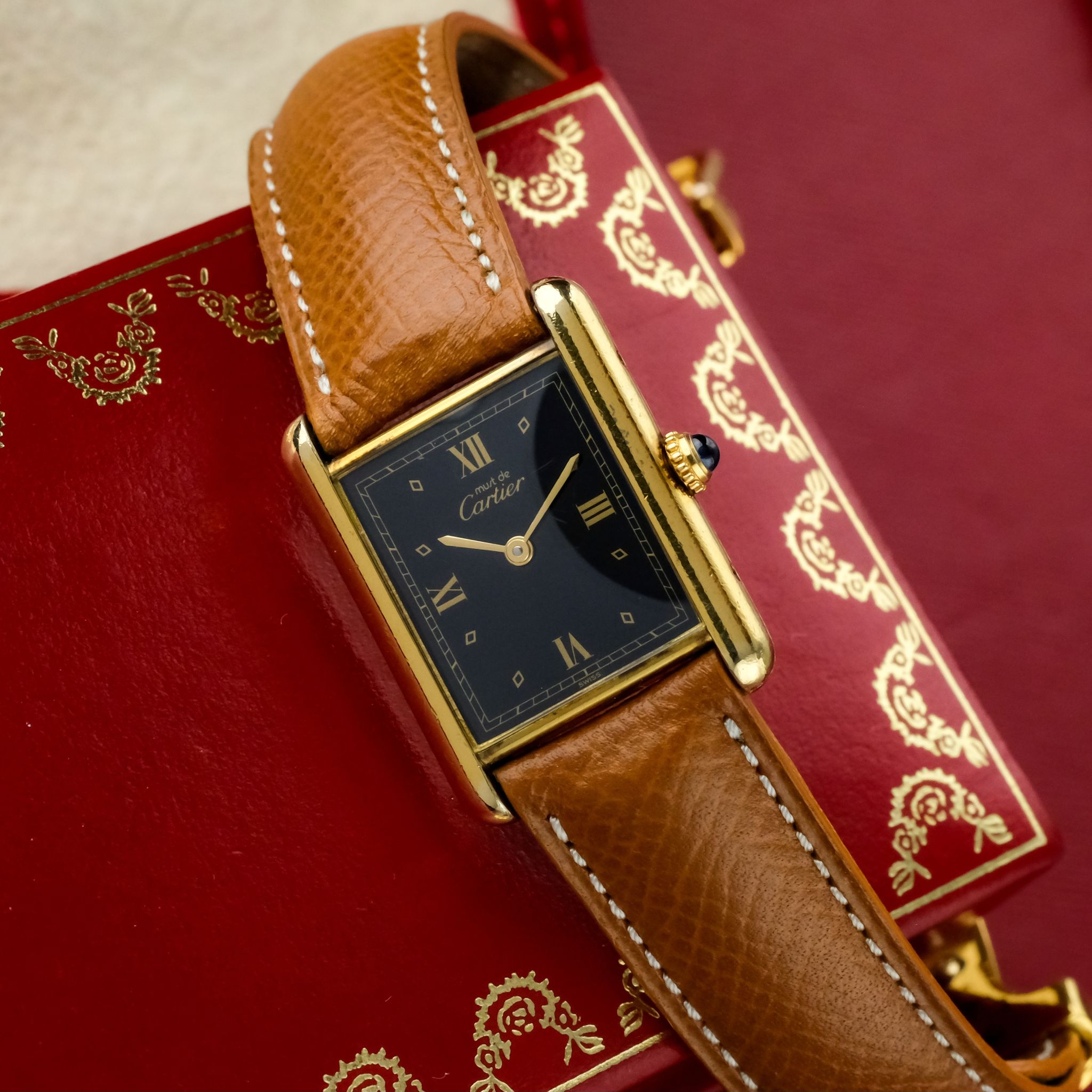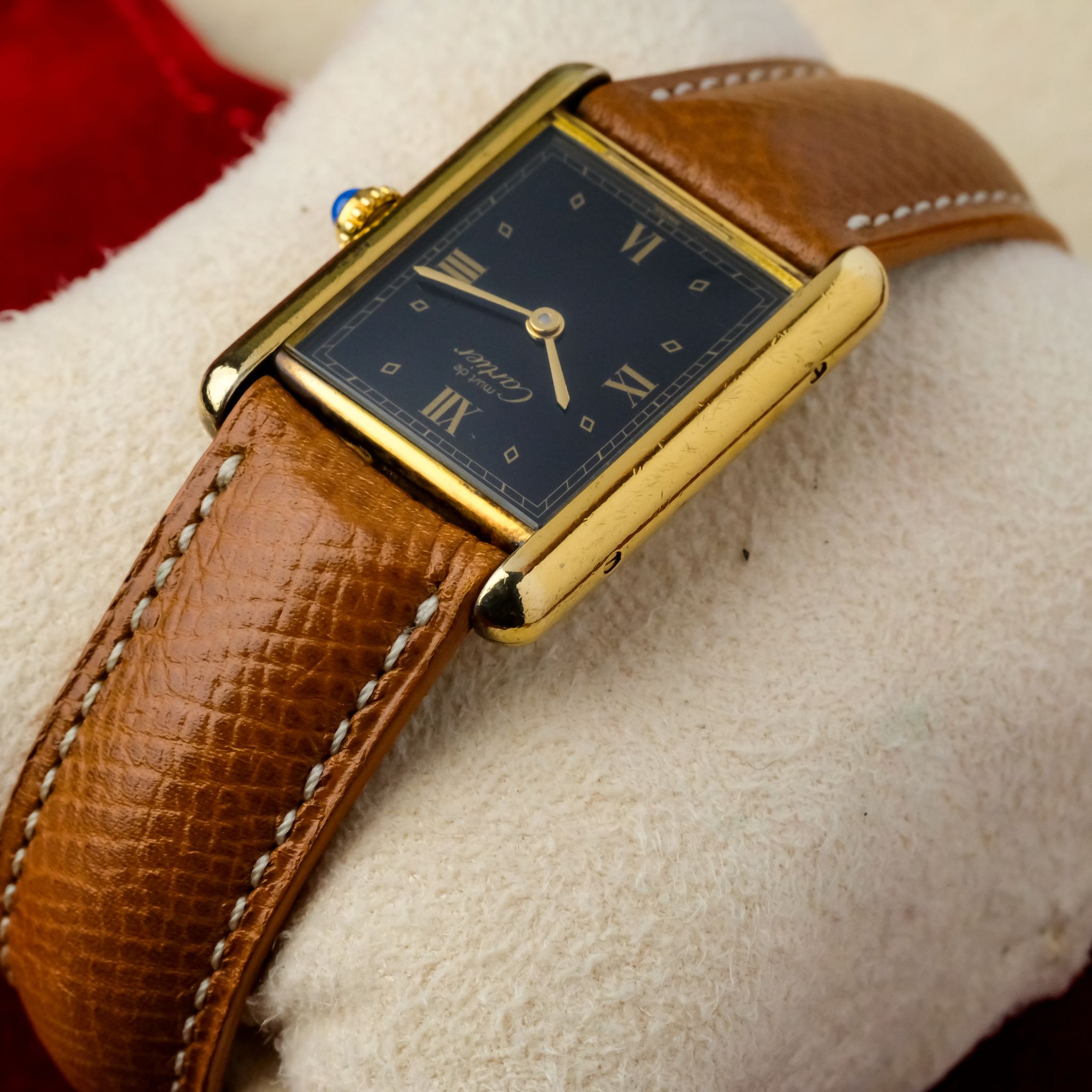 This Cartier Must de Cartier Tank Vermeil GM reference 590005 is a refined and timeless interpretation of the classic Tank. The case is crafted from solid 925 sterling silver and finished with a layer of gold plating, preserving the elegance and proportions of the original design. Measuring 23 by 30 millimeters, the case offers a balanced and elegant wrist presence. The black dial features gold-tone accents with minimalist details and Cartier’s signature sword hands, creating a clean and sophisticated aesthetic. Powered by a reliable quartz movement, the watch delivers precise and low-maintenance performance. Presented in good condition with light signs of wear, this piece is a stylish and accessible entry into the world of vintage Cartier.