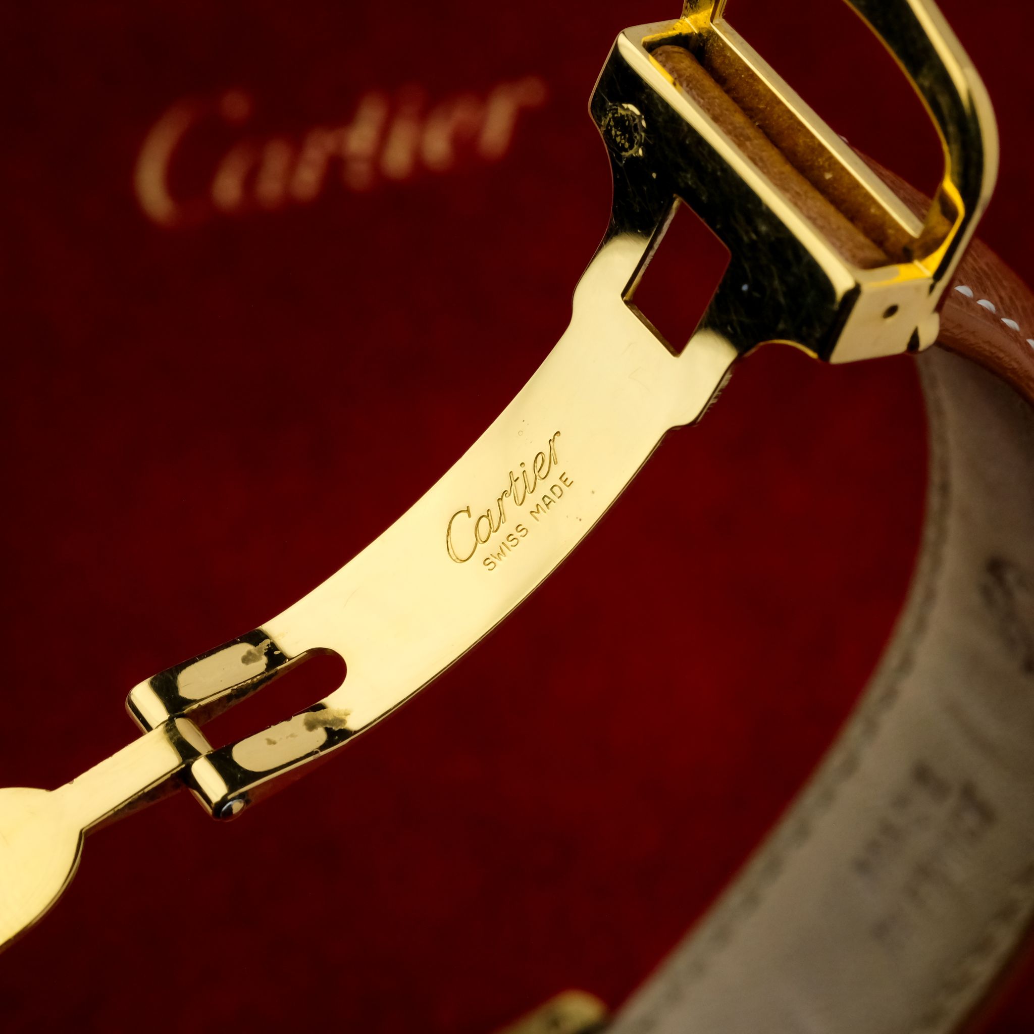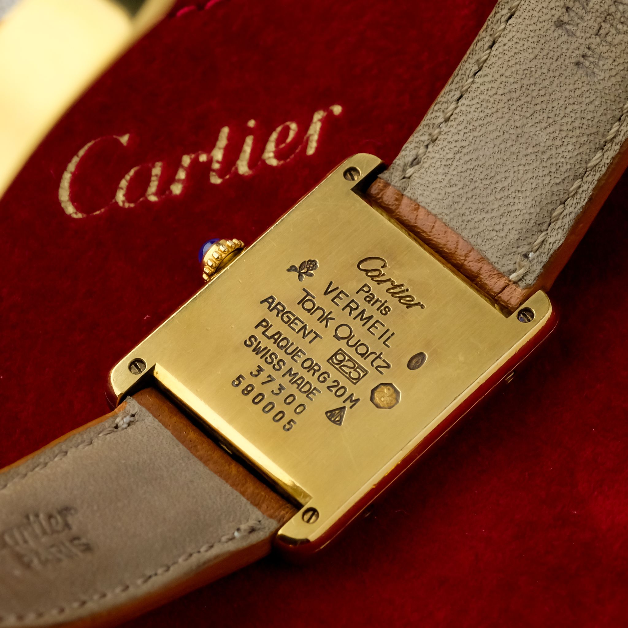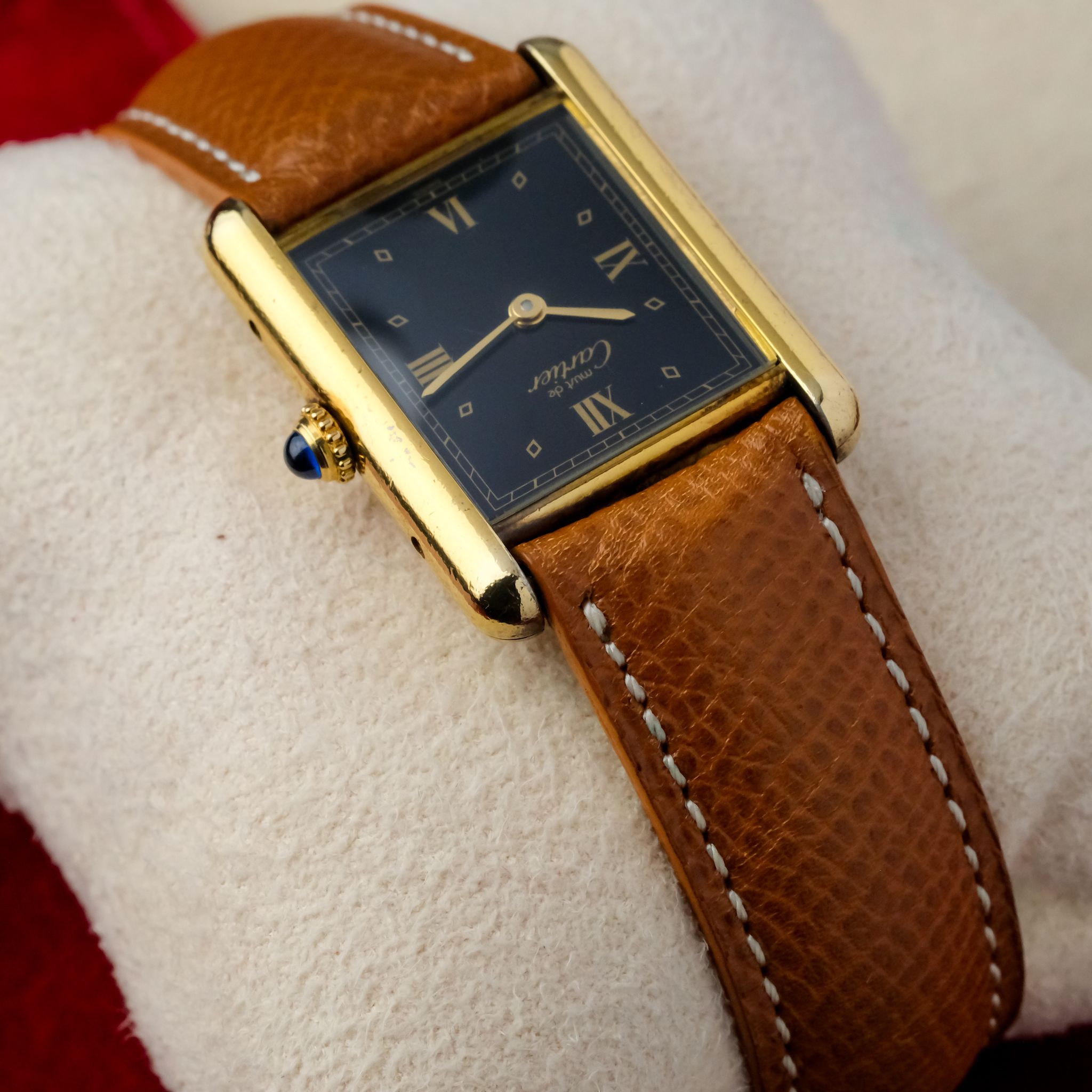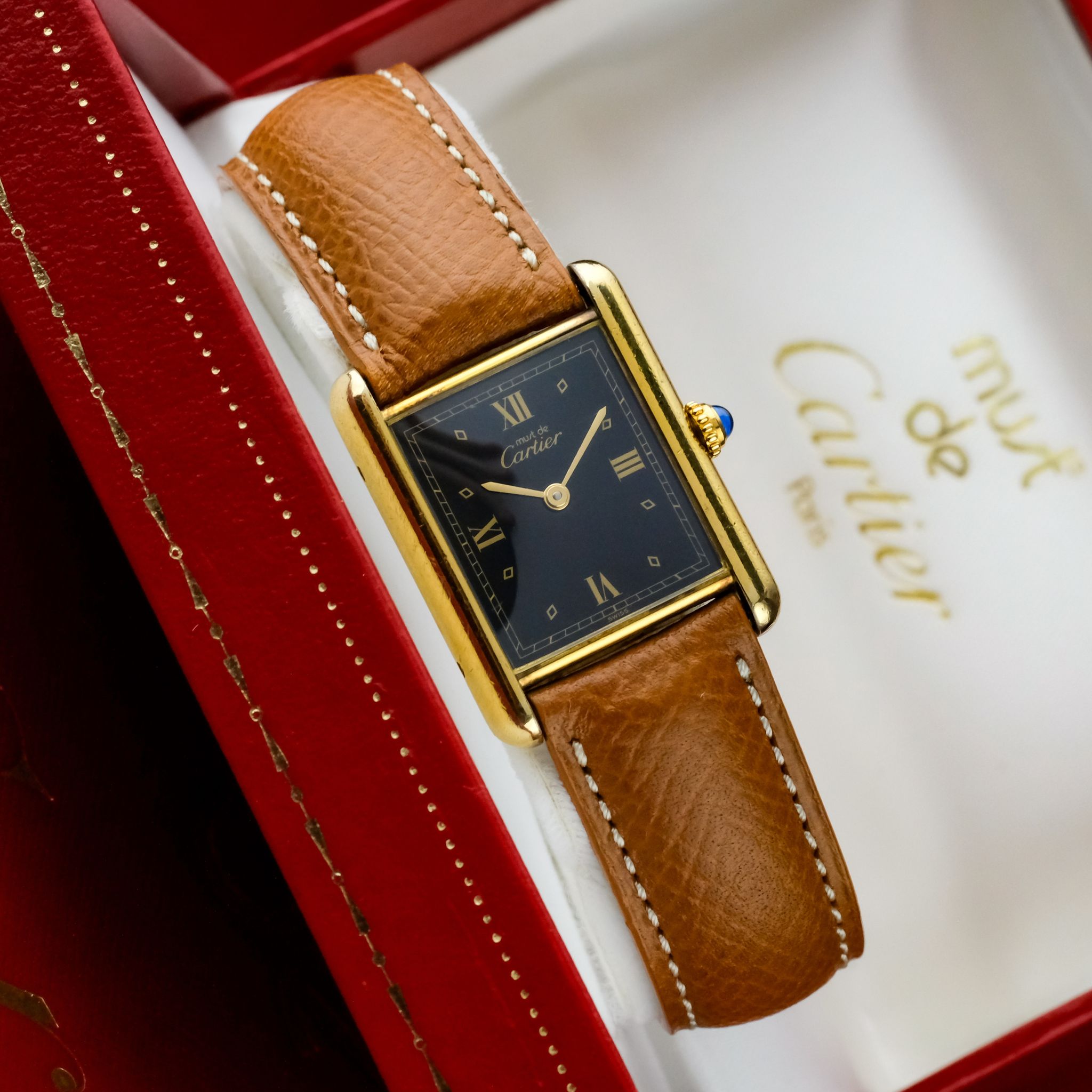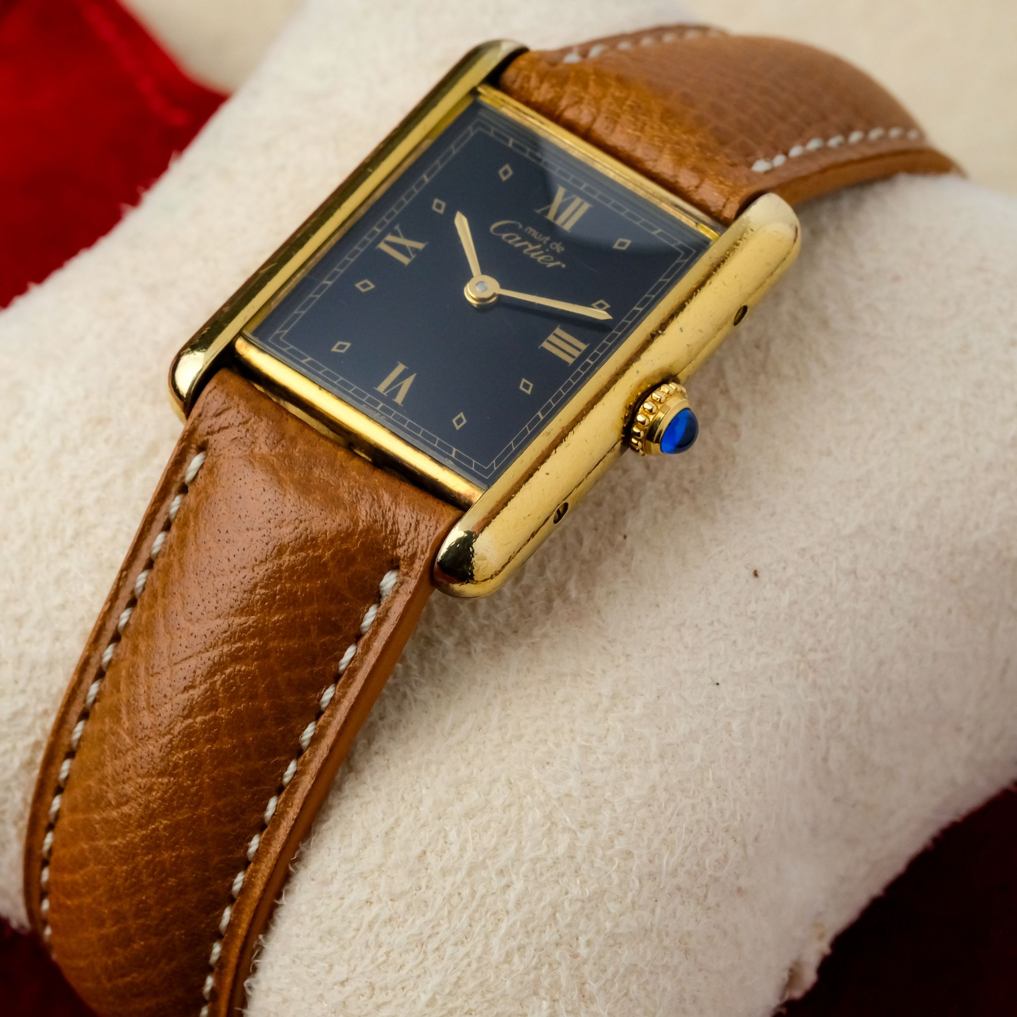 This Cartier Must de Cartier Tank Vermeil GM reference 590005 is a refined and timeless interpretation of the classic Tank. The case is crafted from solid 925 sterling silver and finished with a layer of gold plating, preserving the elegance and proportions of the original design. Measuring 23 by 30 millimeters, the case offers a balanced and elegant wrist presence. The black dial features gold-tone accents with minimalist details and Cartier’s signature sword hands, creating a clean and sophisticated aesthetic. Powered by a reliable quartz movement, the watch delivers precise and low-maintenance performance. Presented in good condition with light signs of wear, this piece is a stylish and accessible entry into the world of vintage Cartier.