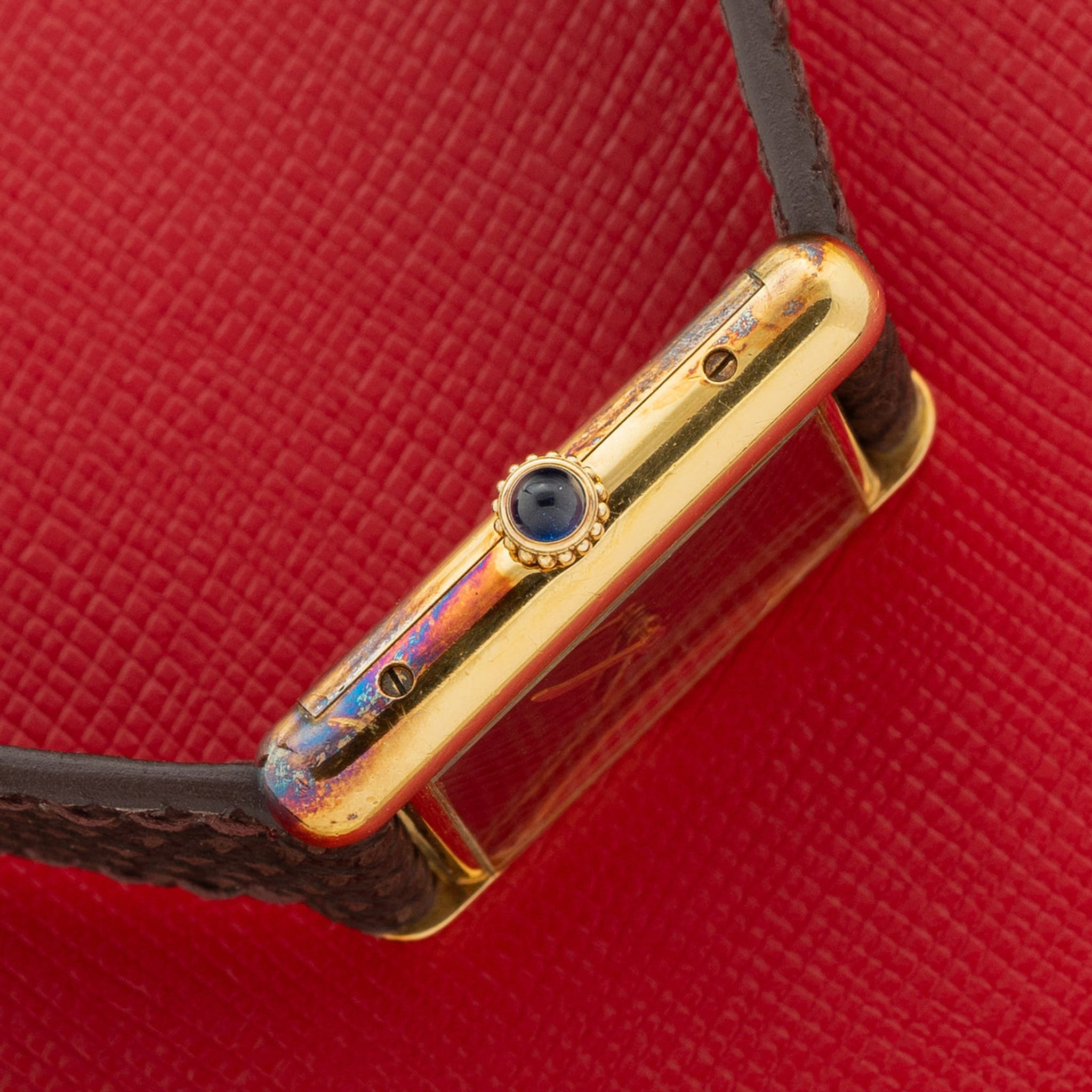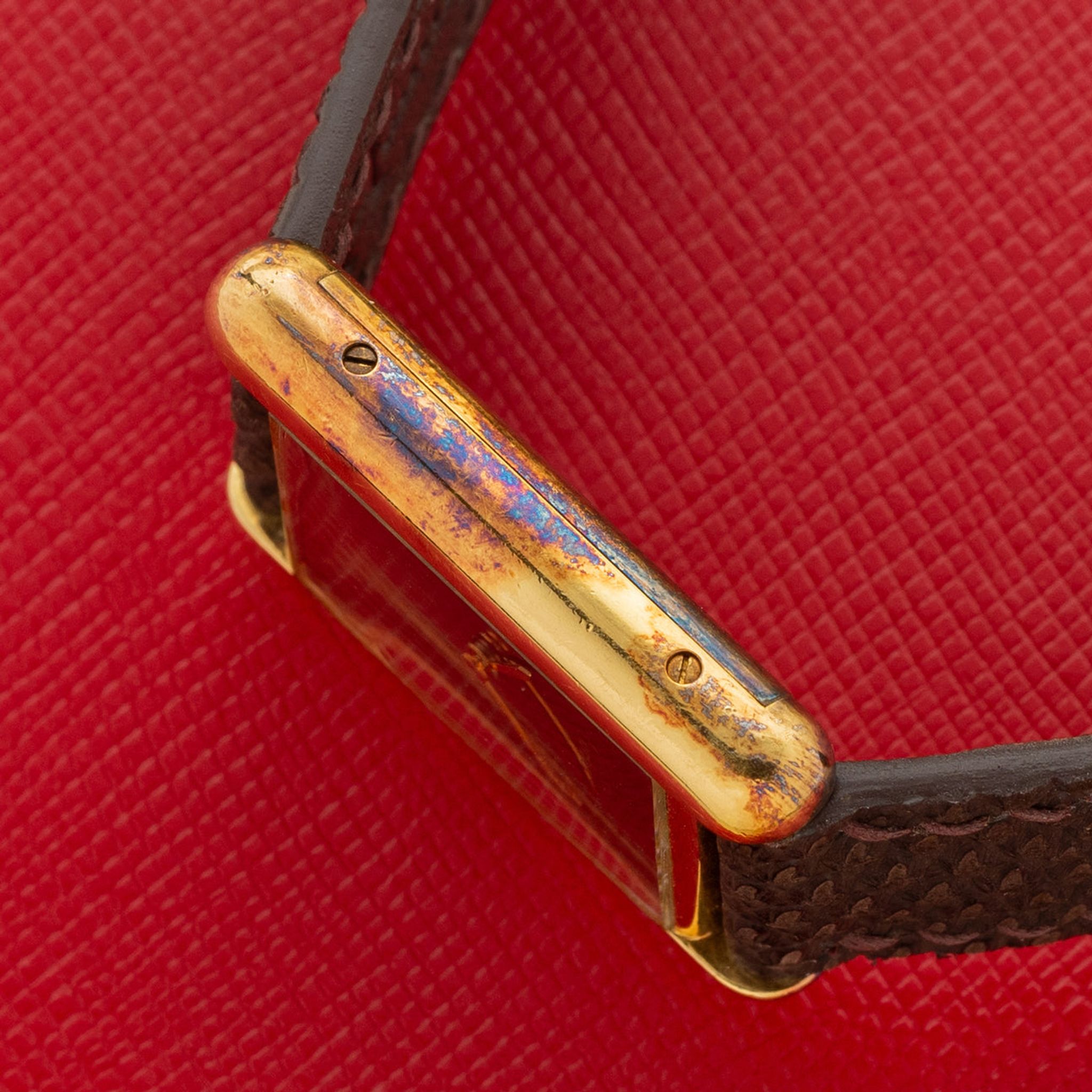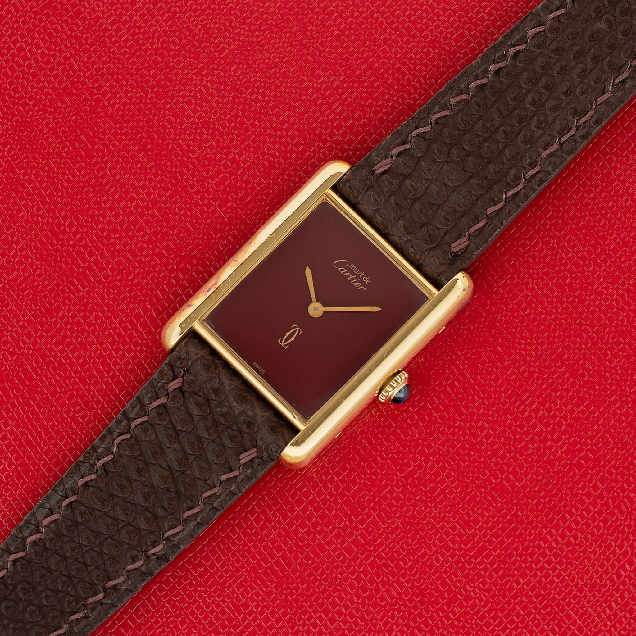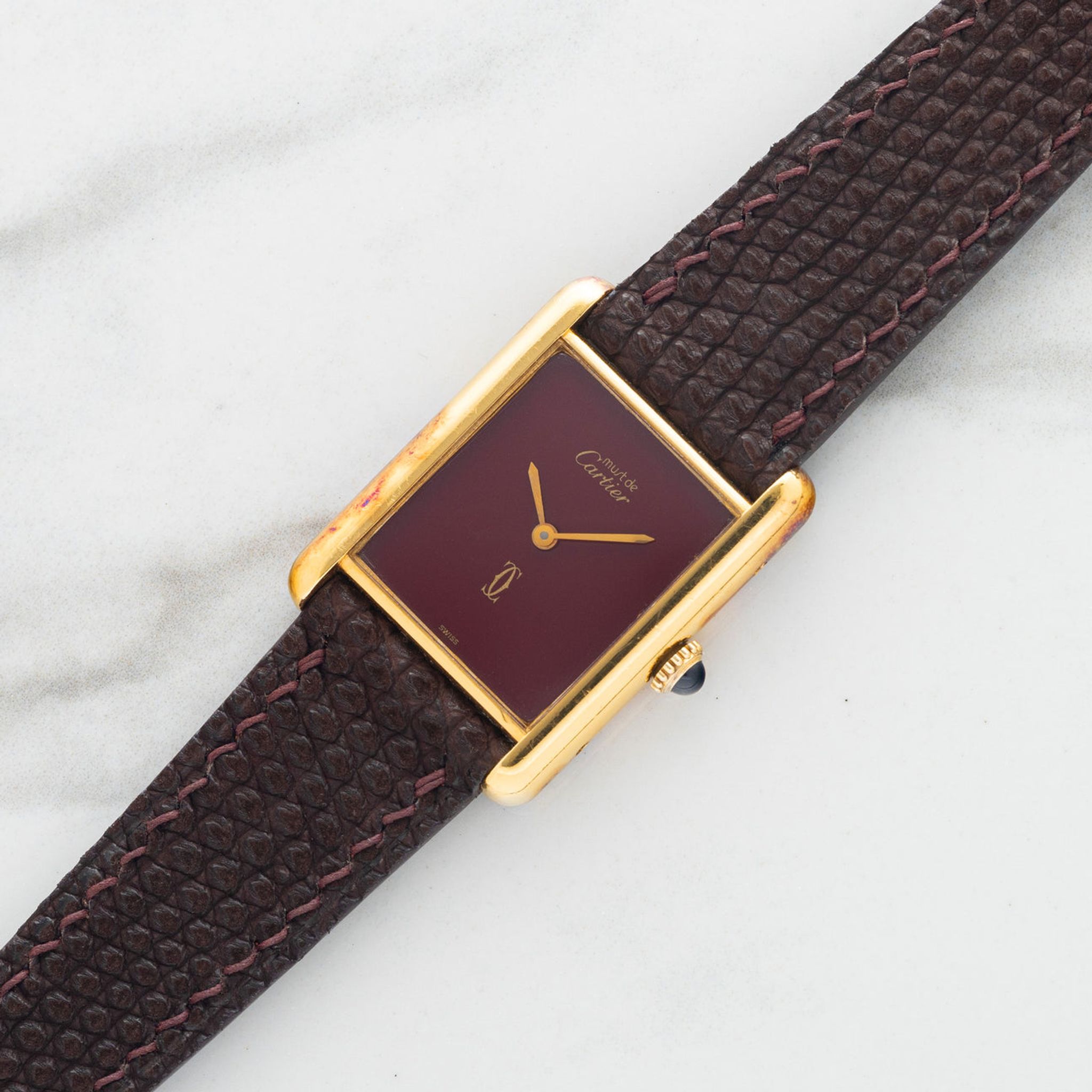 The Must De Cartier line was brought to market in the 1970s as a more accessible price point. This was done with the use of electroplating cases vs using solid gold as well as by leveraging quartz movements for the most part, however, some pieces were also produced with mechanical movements. These mechanical pieces are becoming more collectible today and remain a fantastic point of value for the brand. This particular example features a burgundy dial which we've paired to a suppler brown lizard strap. It remains in fantastic vintage condition with a mint dial/case. If you've been looking for an affordable and less common "Tank," look no further!
