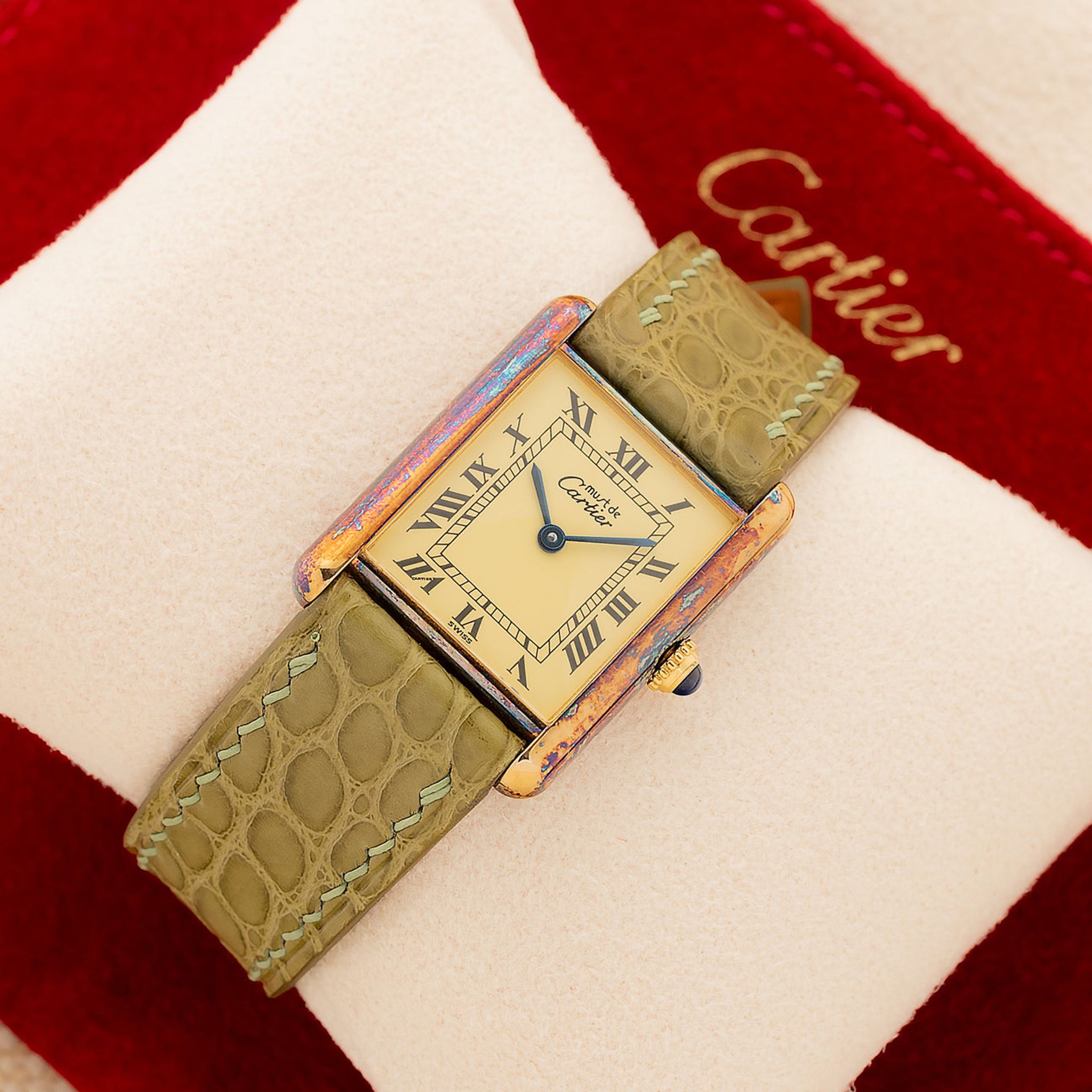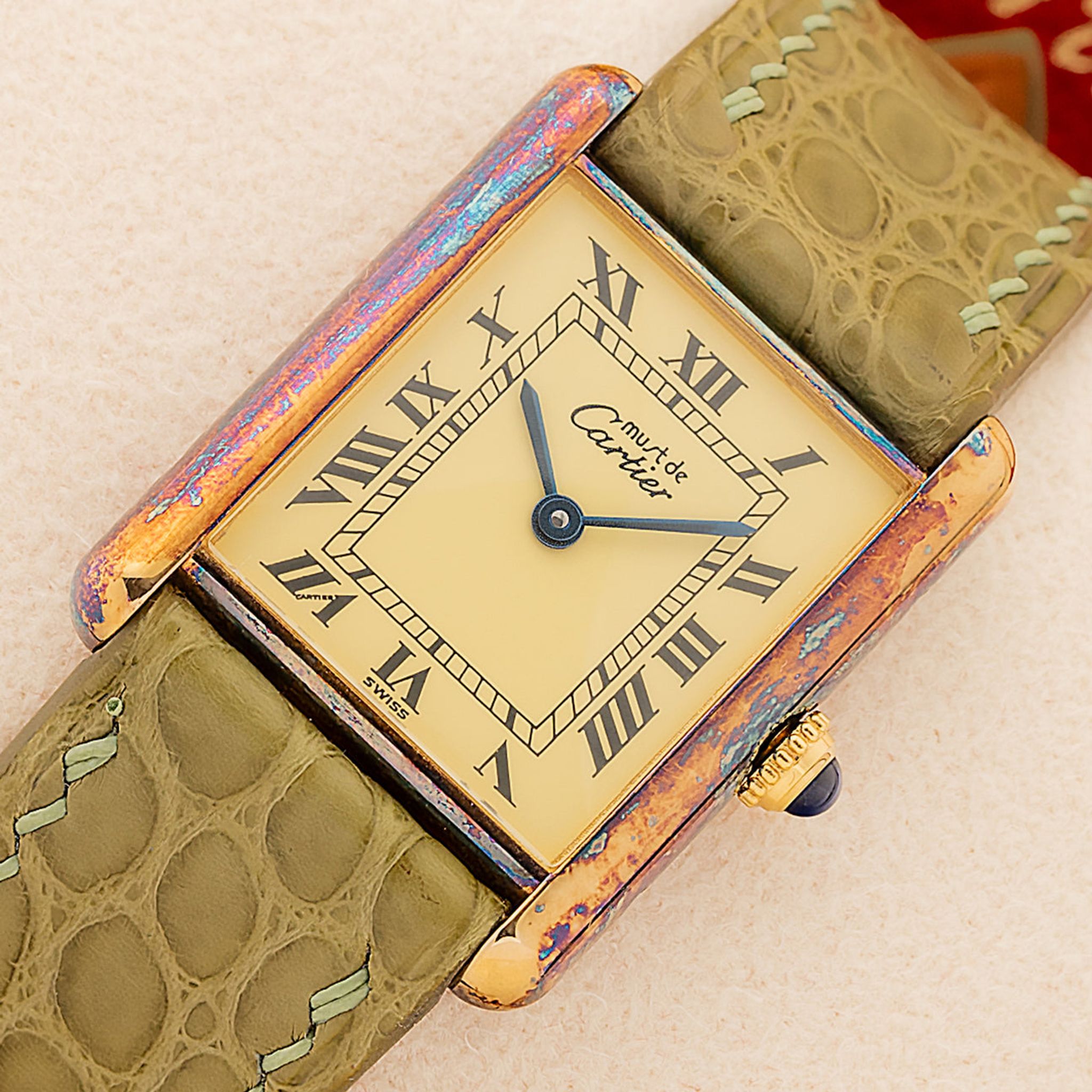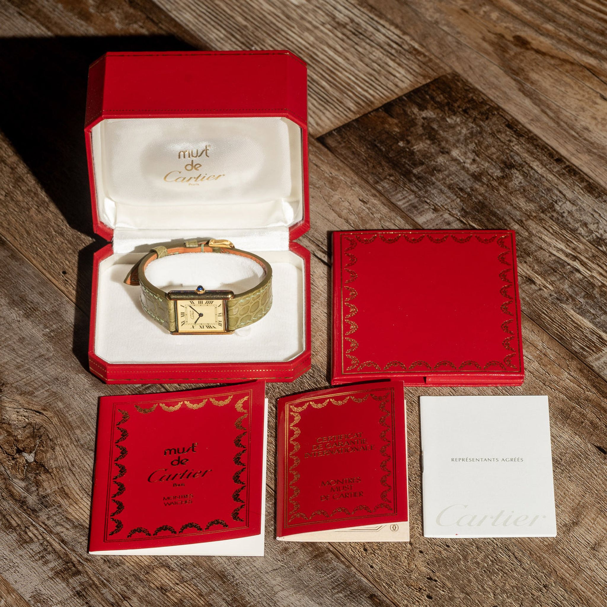 The Must De Cartier line was brought to market in the 1970s as a more accessible price point. This was done with the use of electroplating cases vs using solid gold as well as by leveraging quartz movements for the most part, however, some pieces were also produced with mechanical movements. This particular quartz piece features an elegant yellow/"lemon" toned dial with classic Roman numerals. It remains in beautiful vintage condition with a mint dial/case that has taken on a very striking and unique patina. This piece also comes as a full set with all the all the bells and whistles one could hope for.