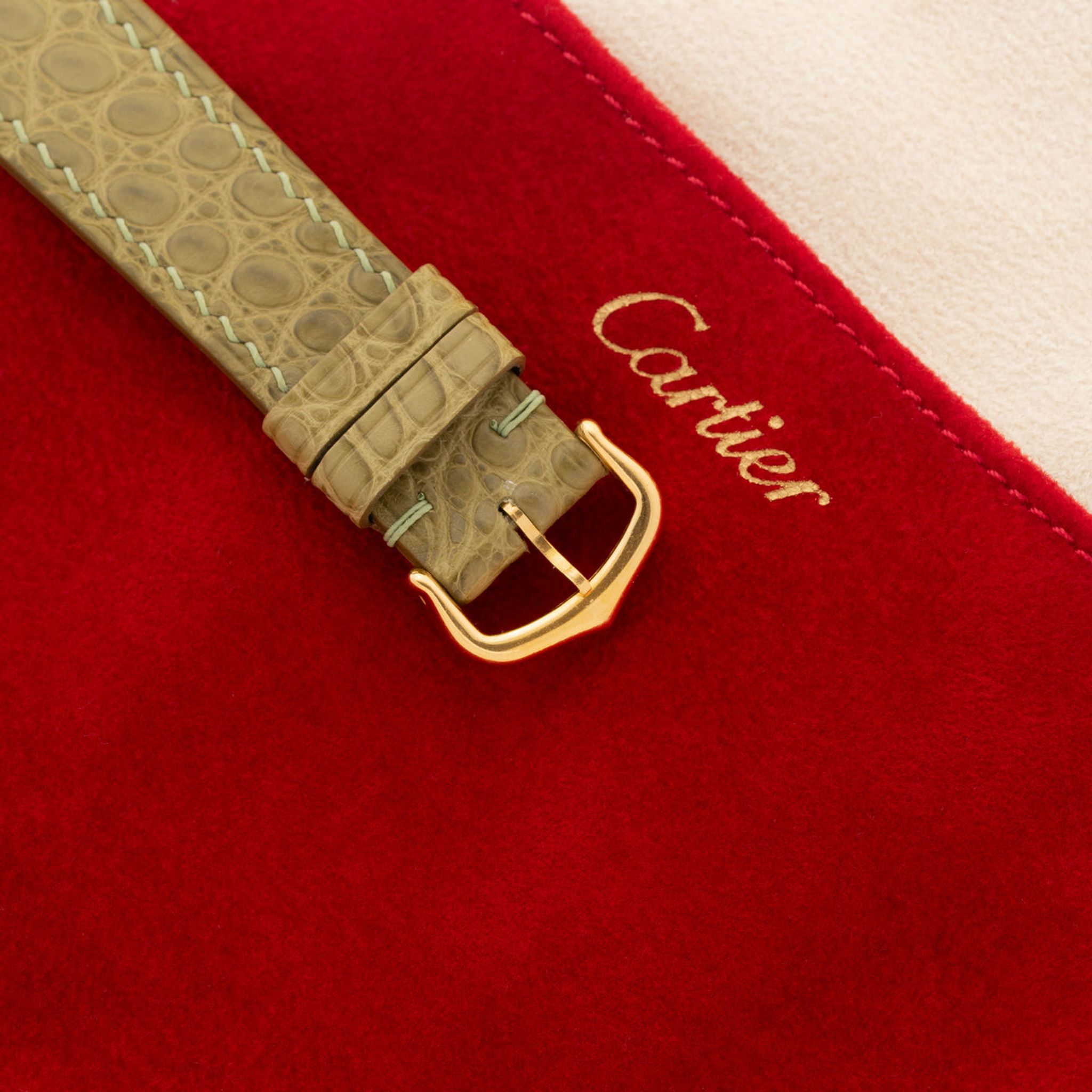 Bracelet: Genuine gator strap in green with Cartier plated buckle.