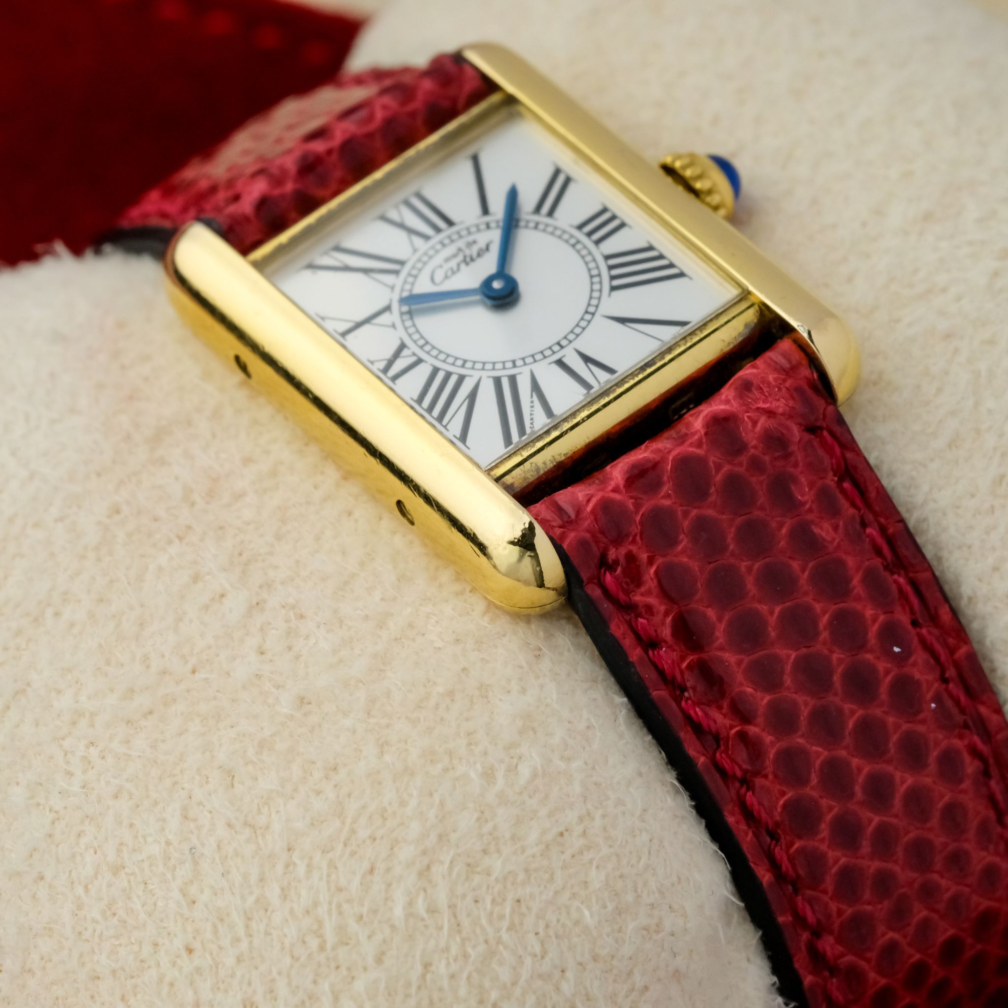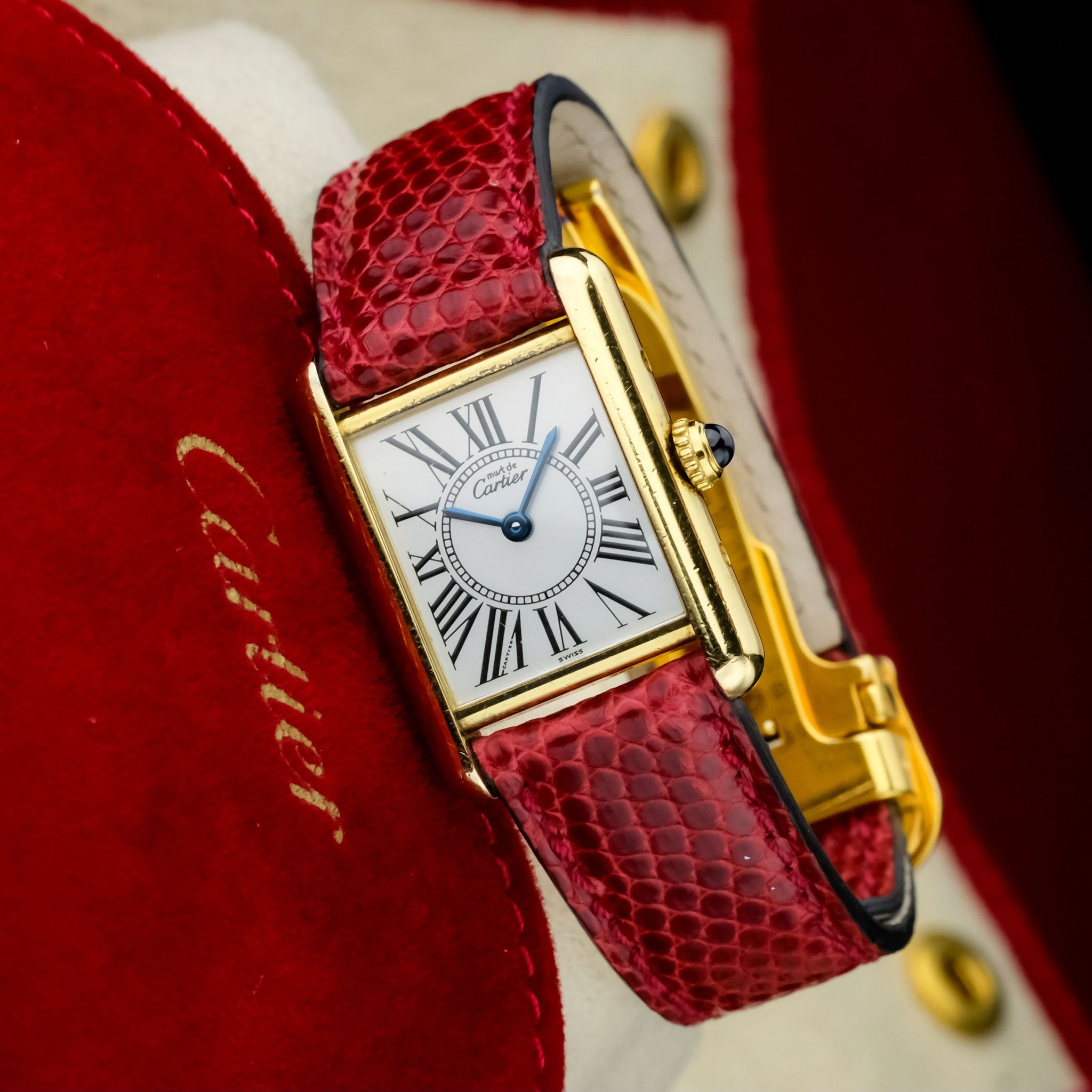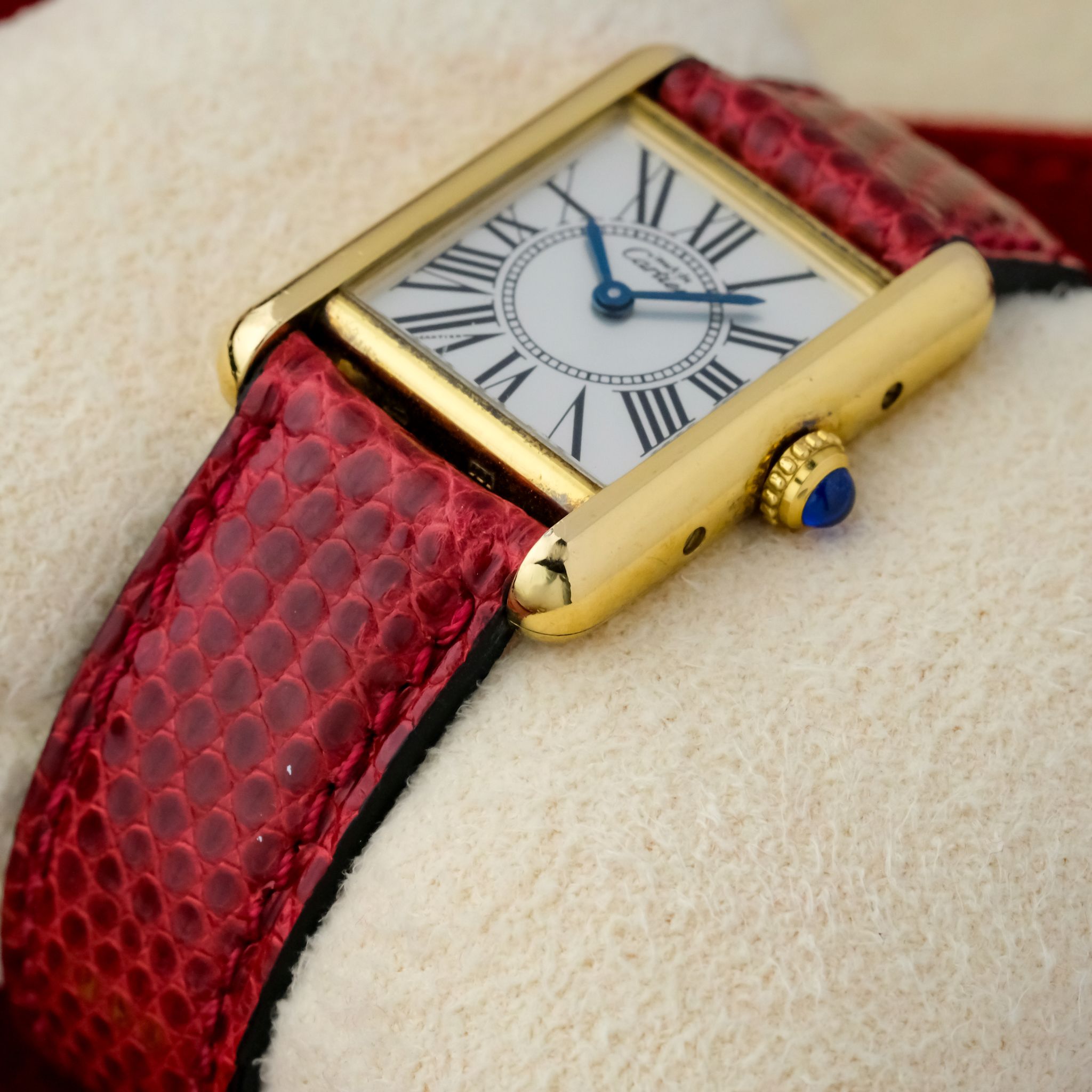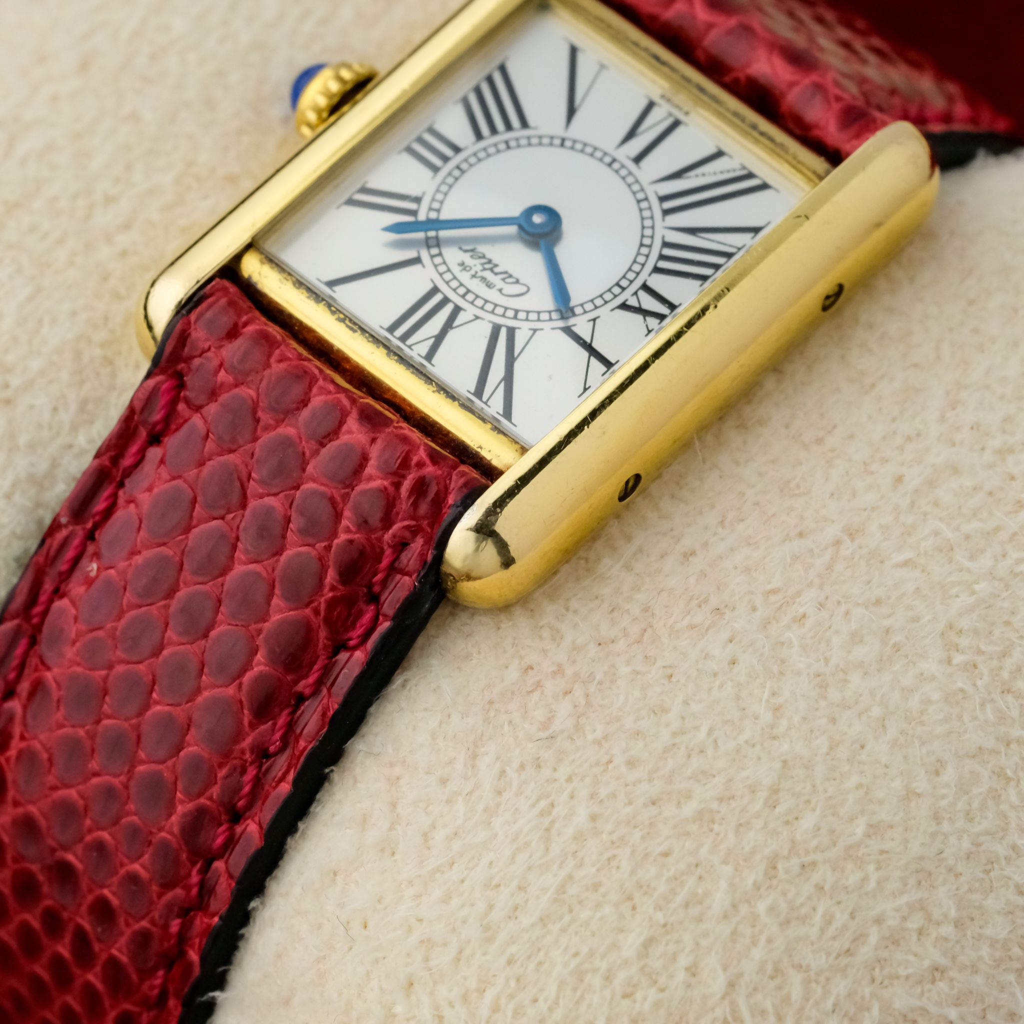 This Cartier Must de Cartier Tank Vermeil PM Reference 5057001 is a beautifully preserved example of one of Cartier’s most classic designs. The case is made from solid 925 sterling silver and finished with a layer of yellow gold plating, giving it the warm appearance of gold while retaining the charm of vintage Cartier craftsmanship. Measuring 21 by 28 millimeters, the watch has elegant proportions that wear well on the wrist without losing presence. The opaline dial features Cartier’s signature Roman numerals, blued steel hands and a clean minute track, offering a refined and timeless aesthetic. In very good overall condition, this Tank Vermeil remains a wonderful expression of Cartier’s understated luxury and continues to represent an iconic piece of design history.