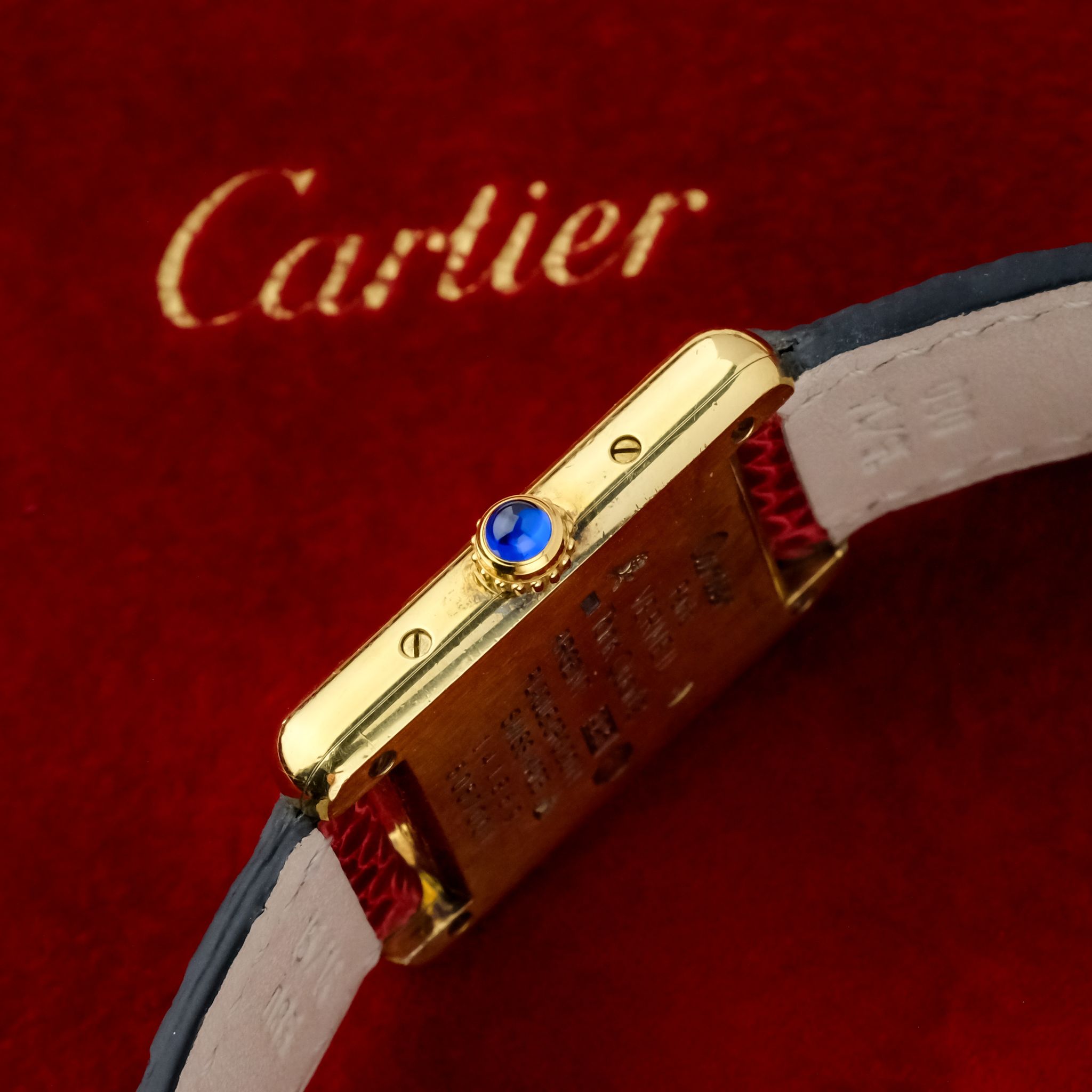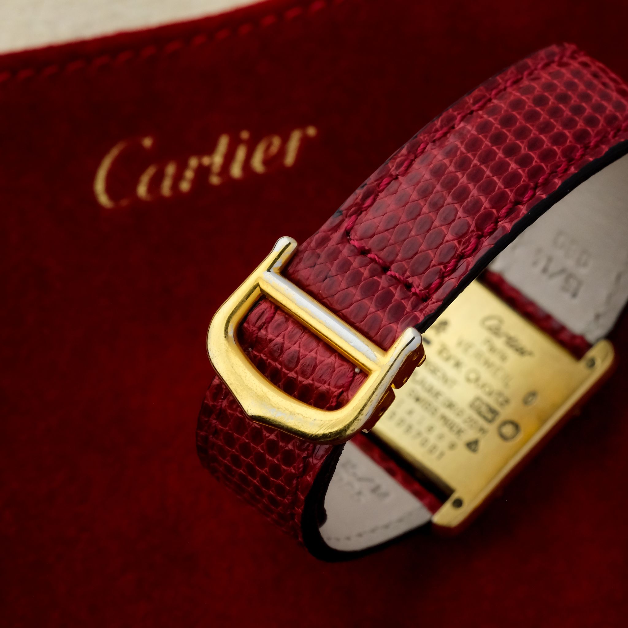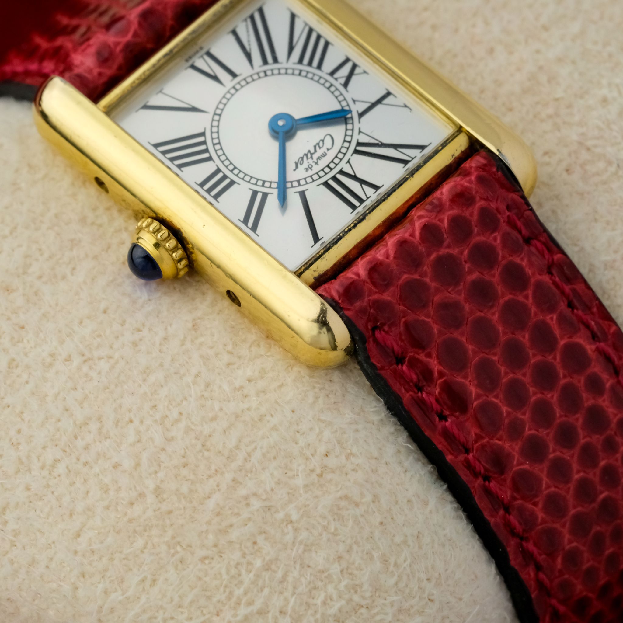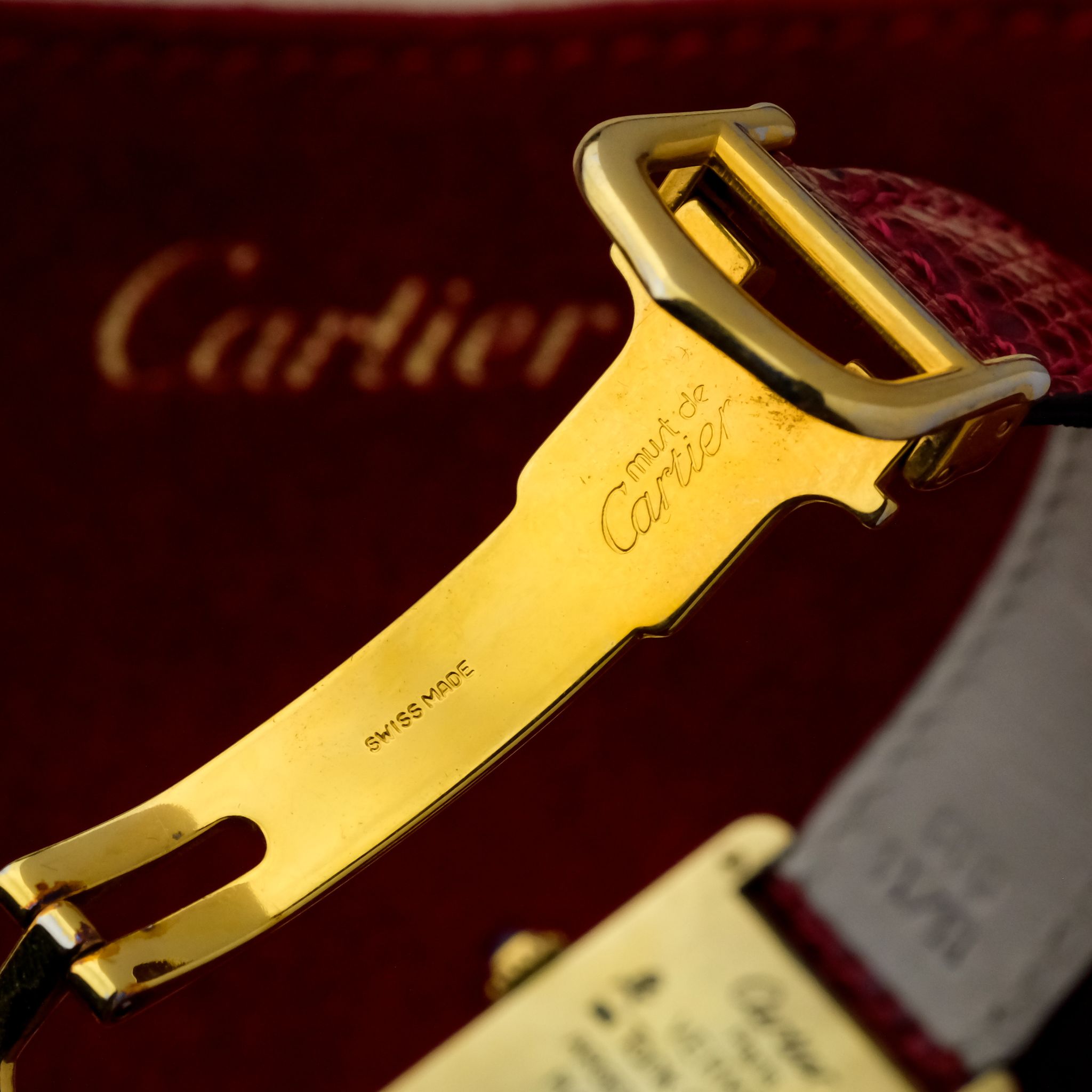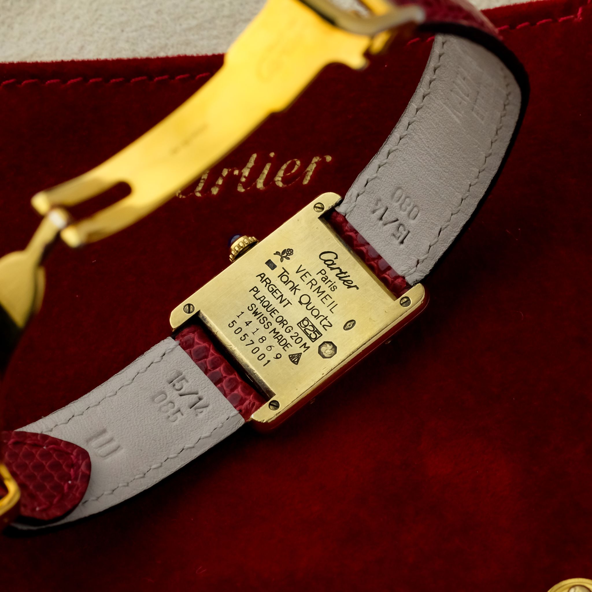 This Cartier Must de Cartier Tank Vermeil PM Reference 5057001 is a beautifully preserved example of one of Cartier’s most classic designs. The case is made from solid 925 sterling silver and finished with a layer of yellow gold plating, giving it the warm appearance of gold while retaining the charm of vintage Cartier craftsmanship. Measuring 21 by 28 millimeters, the watch has elegant proportions that wear well on the wrist without losing presence. The opaline dial features Cartier’s signature Roman numerals, blued steel hands and a clean minute track, offering a refined and timeless aesthetic. In very good overall condition, this Tank Vermeil remains a wonderful expression of Cartier’s understated luxury and continues to represent an iconic piece of design history.