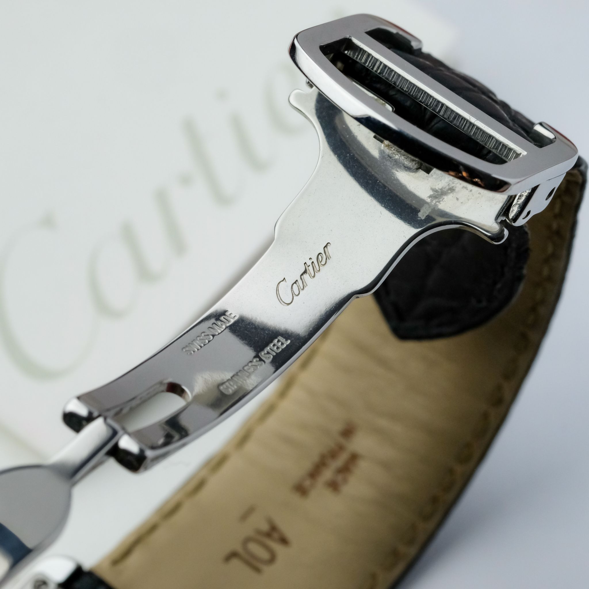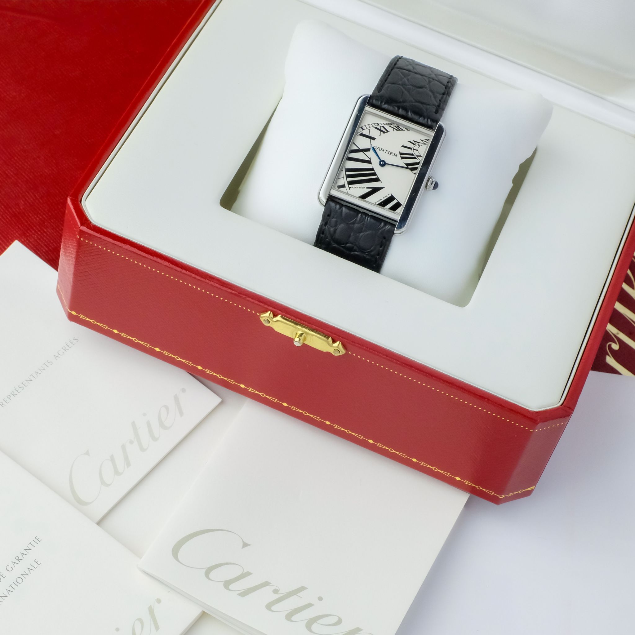 Cartier Tank, this model features the striking “Piano” dial, where the traditional Roman numerals burst outward from the center in a bold radial layout. This playful reinterpretation of the classic Cartier dial gives the watch a modern, almost surrealist energy while still maintaining the elegance and refinement the Tank is known for. The case measures 27 x 35 mm in polished stainless steel, with a sapphire cabochon crown, classic black leather strap, and the reliable Cartier 690 quartz movement inside. The dial is finished in matte white, which enhances the contrast and dramatic presence of the oversized numerals. A true design statement from Cartier, this rare variant appeals to collectors who appreciate both tradition and bold artistic flair within a classic form.