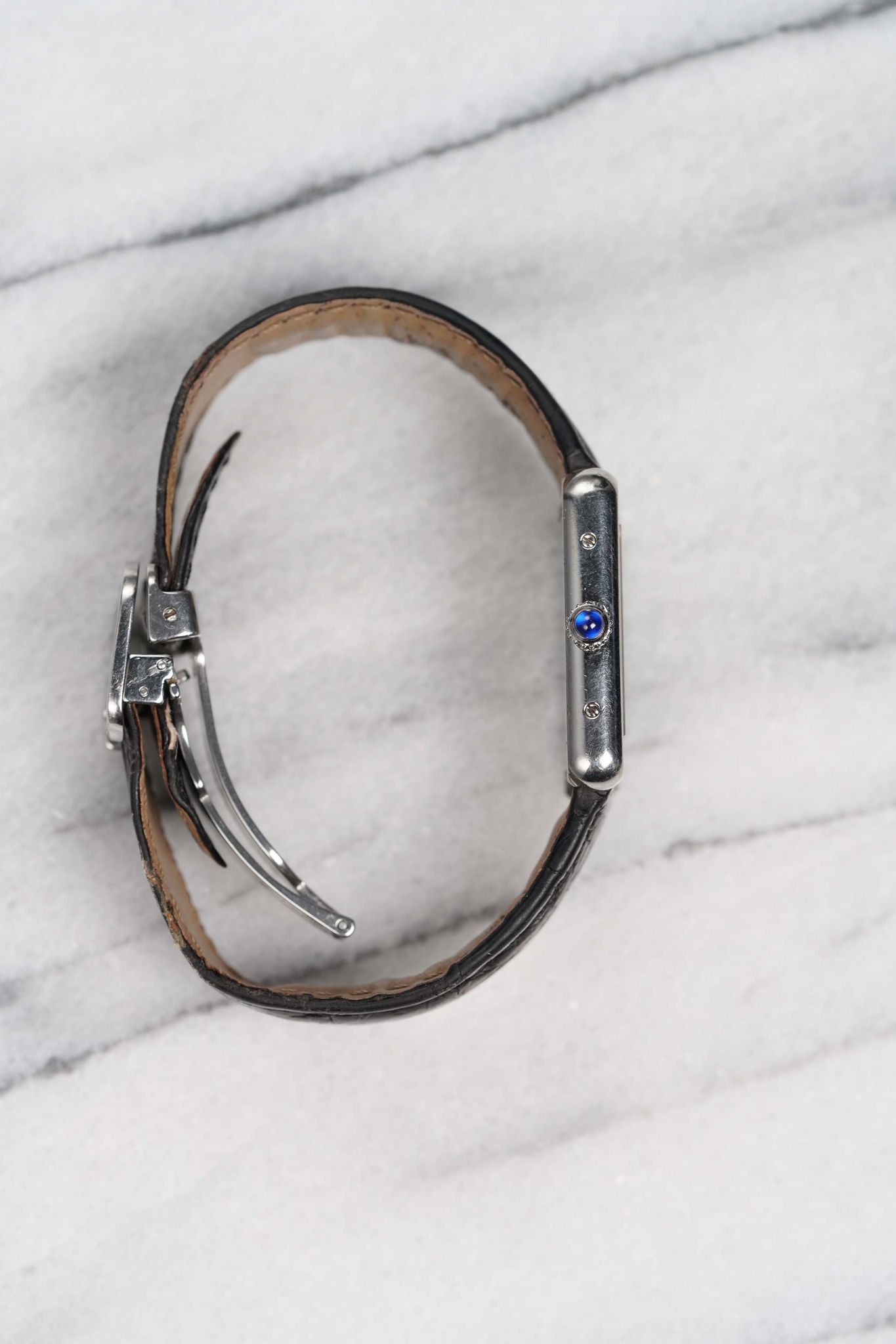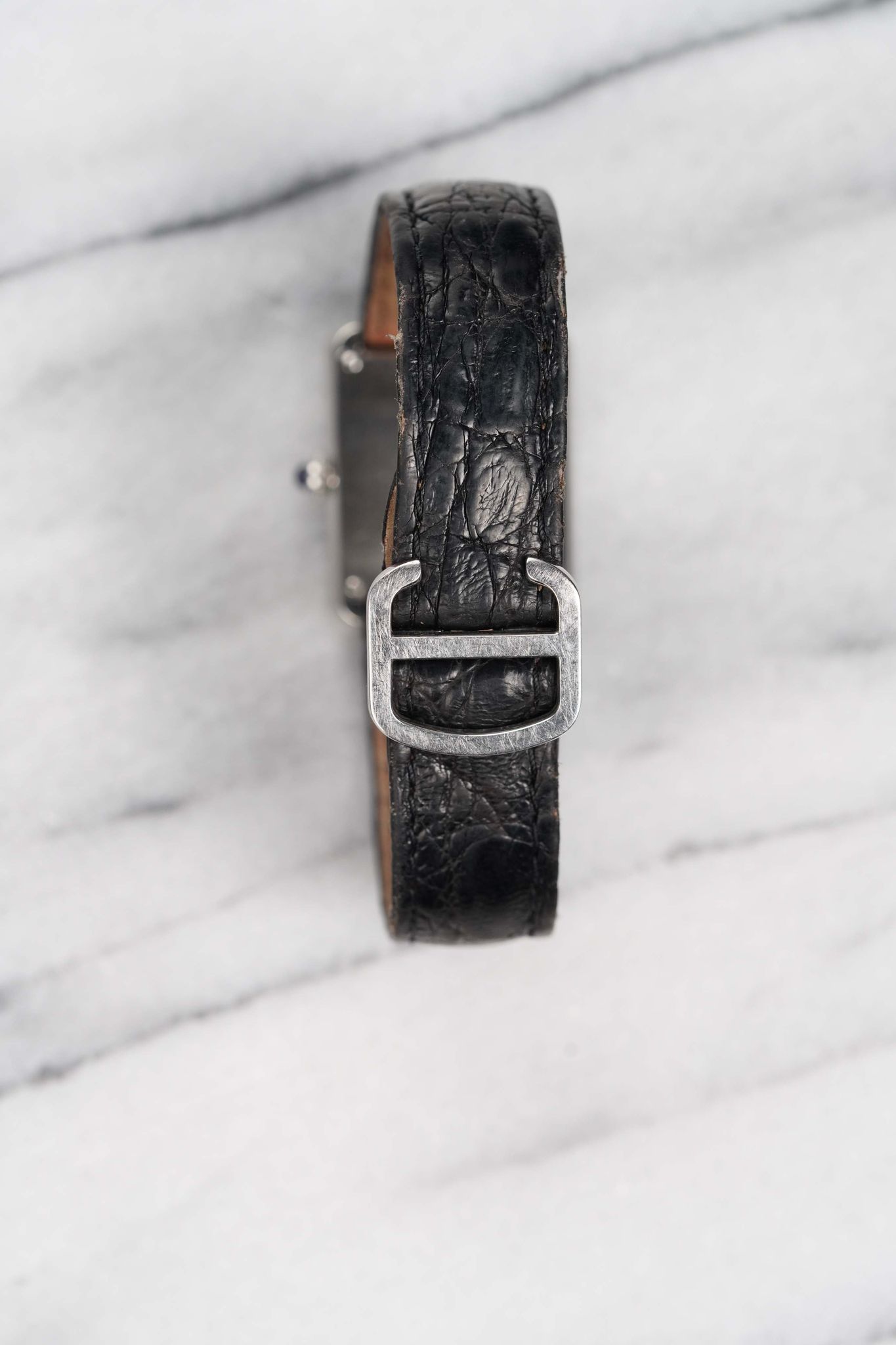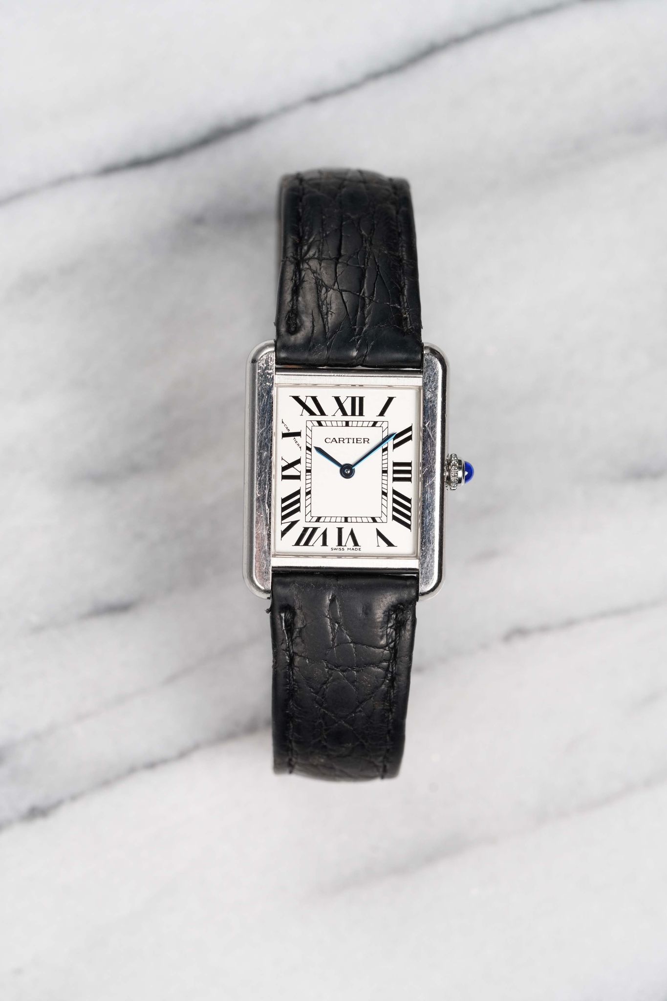 Here's a Cartier Tank Solo quartz reference 3167 with a white roman numeral dial from the early 2000s. Keeps great time and is fully functional. Measurements include a 31mmmm case size and 18mm lug width. Stainless steel case and caseback. On its original black leather strap and deployant buckle. The watch is in good condition. All parts are original including the crown, dial, and caseback. Both the dial and case are in great cosmetic, untouched condition.