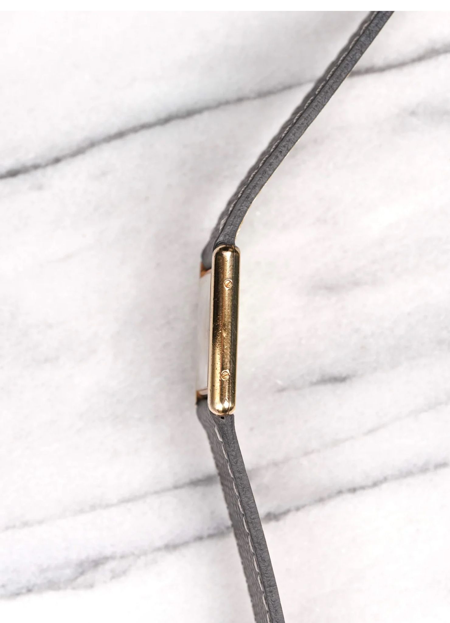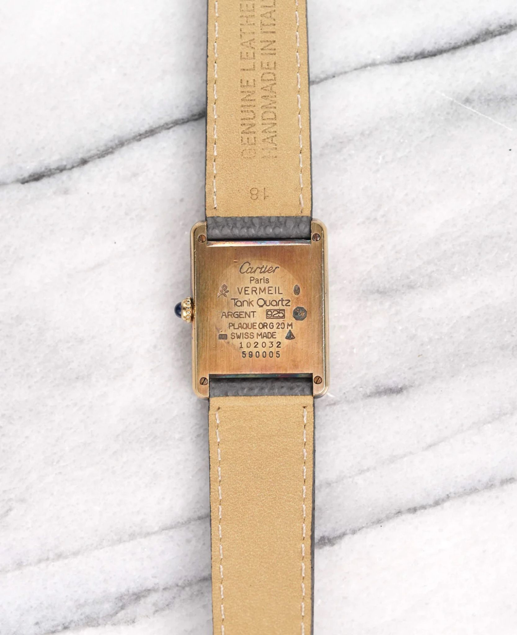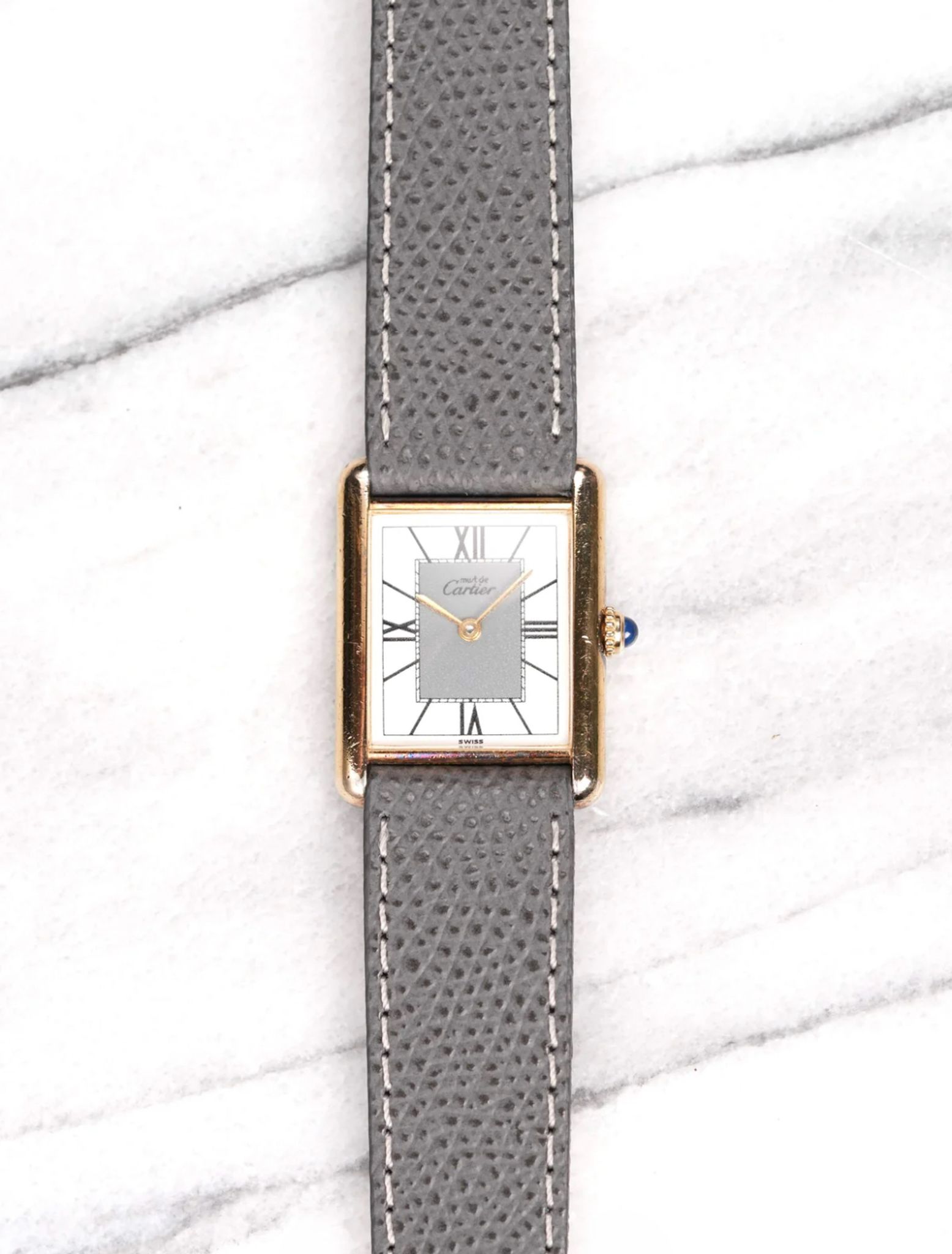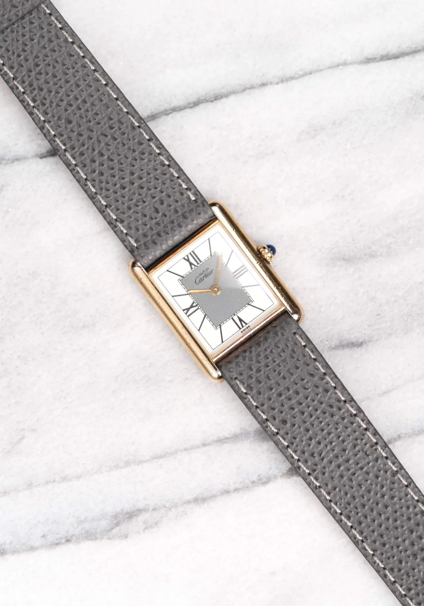 Here's a vintage Cartier tank (must de Cartier) quartz with a beautiful two tone grey and white two tone dial from the 80s. Keeps great time and is fully functional. Measurements include a 23x30mm case size and 18mm lug width. It's on an aftermarket grey pebble textured leather strap (made in Italy). Time only. 18K gold electroplated case. The minute track and center of the dial are grey and the hour track is white (where the roman numerals are). Matching gold hands and hour markers. Both the dial and case are clean from any scratches or marks. All parts are original including the cabochon crown, dial, movement, and caseback. Both the dial and case are in great cosmetic, untouched condition.