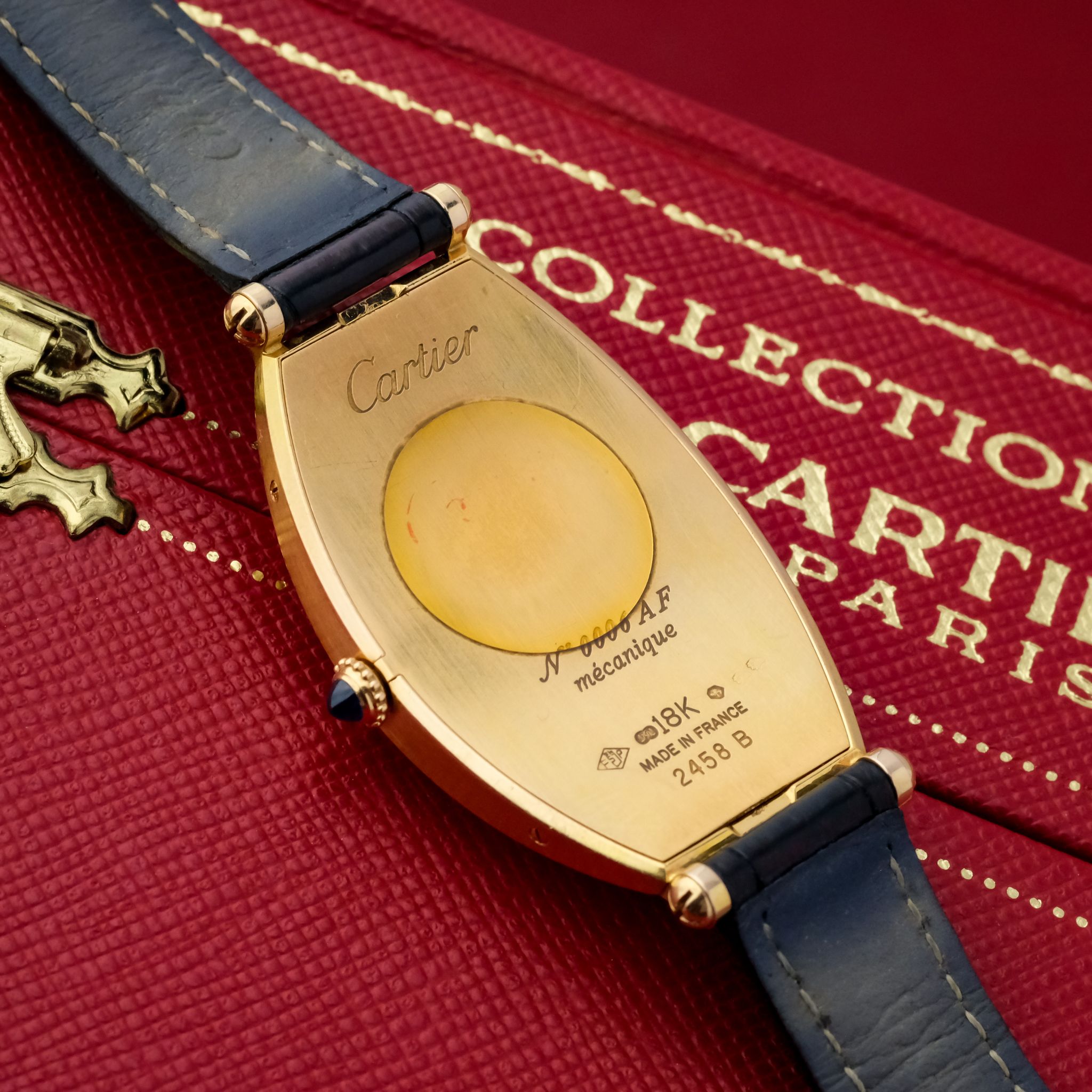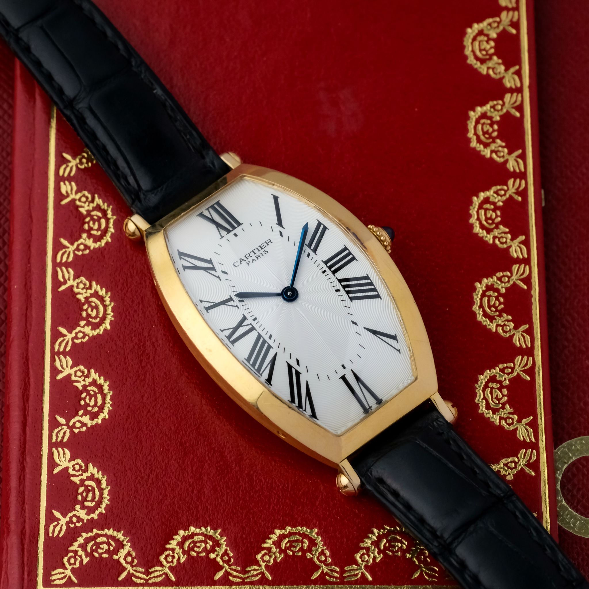 The Cartier Tonneau CPCP Ref. 2458B is a refined and elegant embodiment of Cartier’s historical commitment to form-driven watchmaking. Part of the prestigious Collection Privée Cartier Paris line, the 2458B revives one of Cartier’s oldest and most graceful case shapes, the Tonneau, first introduced in 1906. Crafted in 18k yellow gold, the case is defined by its elongated, curved profile and delicate proportions, hugging the wrist with exceptional comfort and visual harmony. At approximately 26mm wide and 44mm long, it wears with a presence that is both understated and distinguished. The silvered guilloché dial features Cartier’s signature Roman numerals.