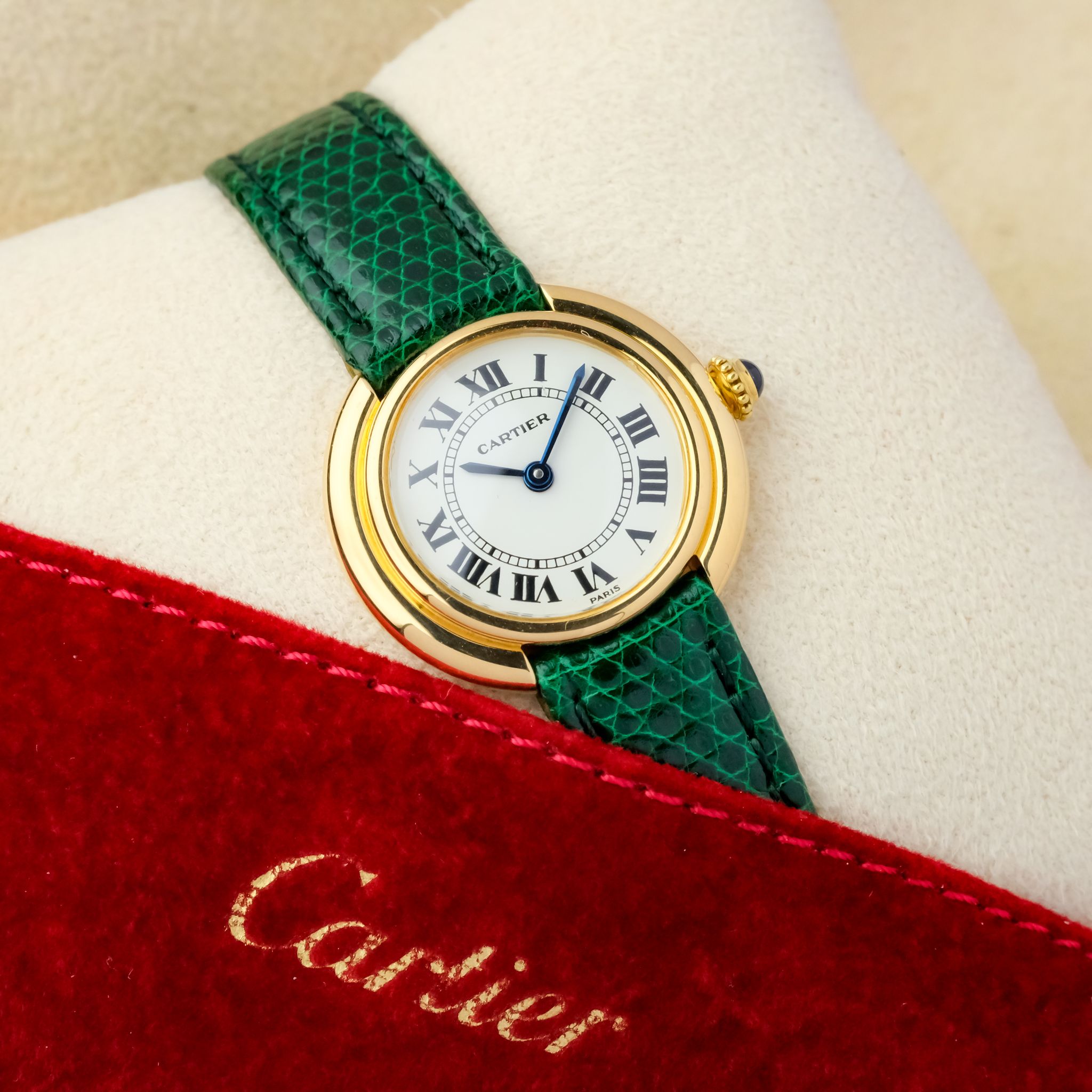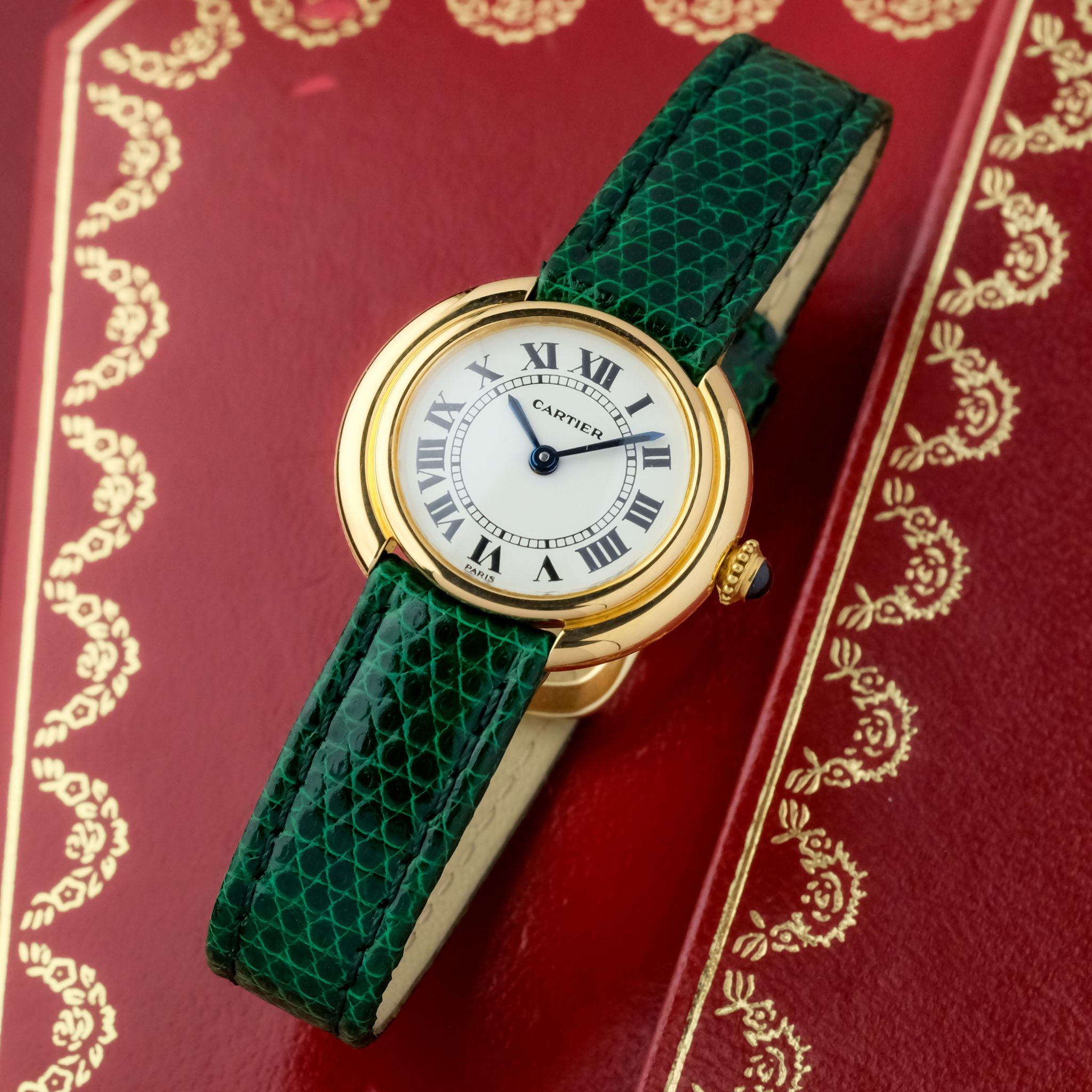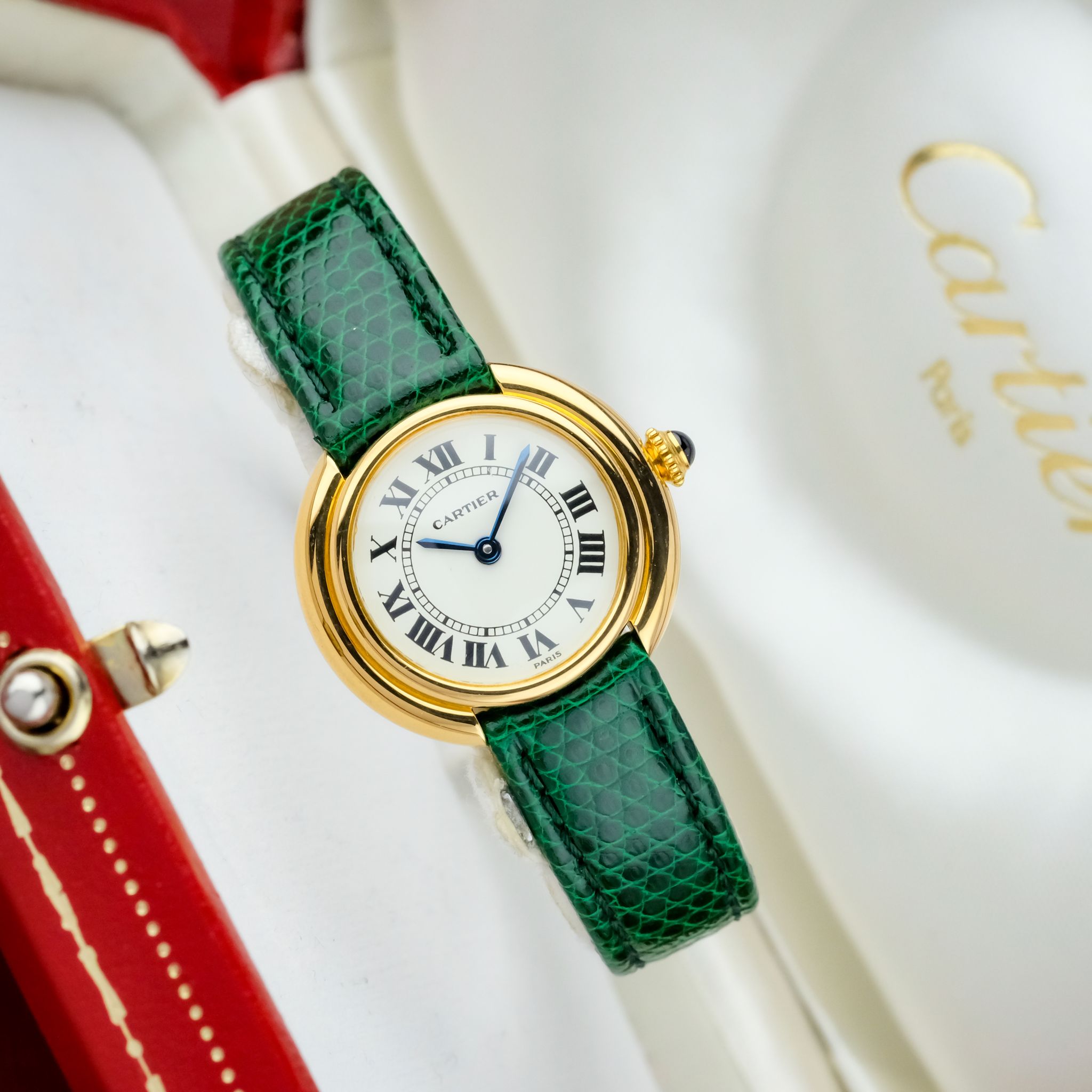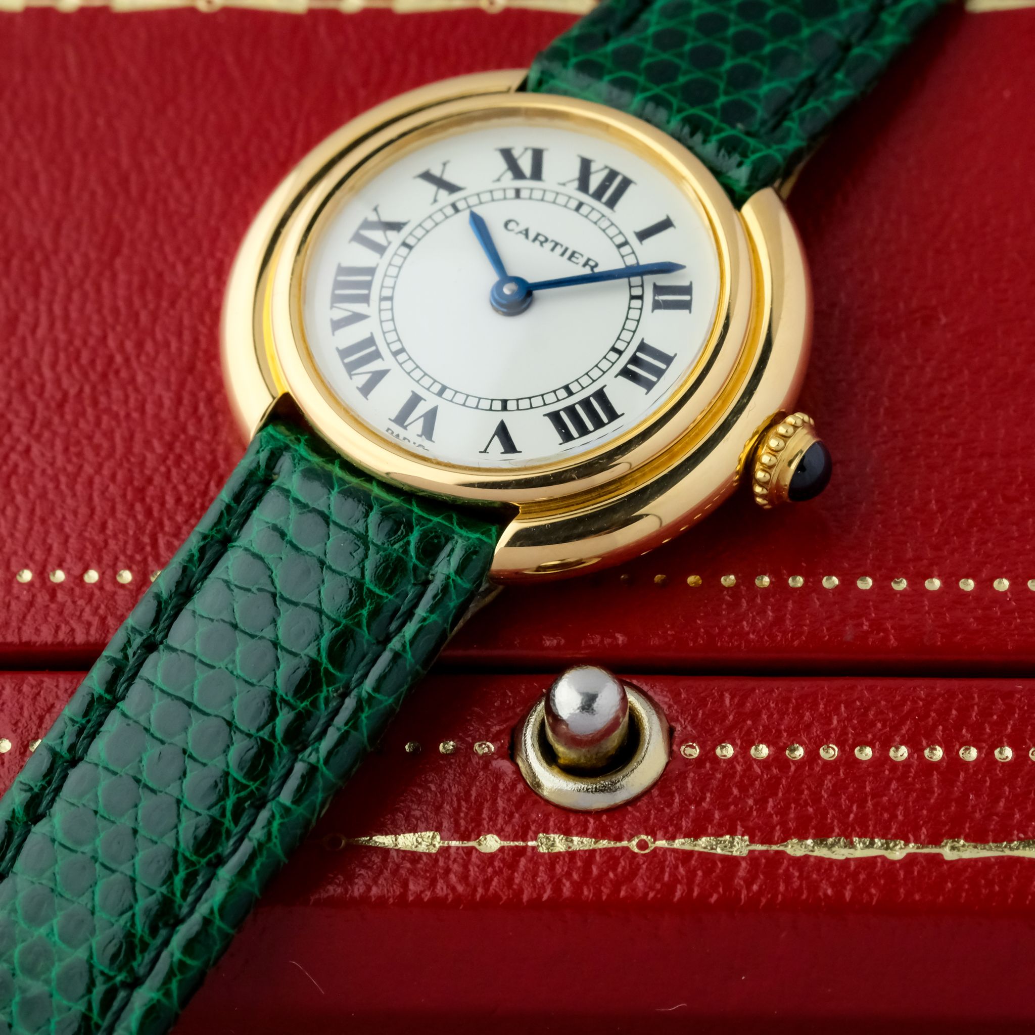 The Cartier Vendôme Ref. 67080 is a classic Lady model from the Maison, embodying timeless elegance in its purest form. The 26mm round 18K yellow gold case, white dial with Roman numerals, and blued steel hands showcase Cartier’s iconic design language. The signature sapphire cabochon crown adds a refined finishing touch. Powered by a manual winding movement, 9P this piece reflects traditional watchmaking artistry in a slim, elegant profile. Its harmonious proportions make it a perfect companion for both special occasions and everyday wear. This example comes fitted with a green leather strap (non-Cartier) and is offered without original box or papers. The watch is in very good condition with light signs of wear and the gold case retains its beautiful luster. A superb choice for collectors and enthusiasts of classic vintage Cartier Lady timepieces.