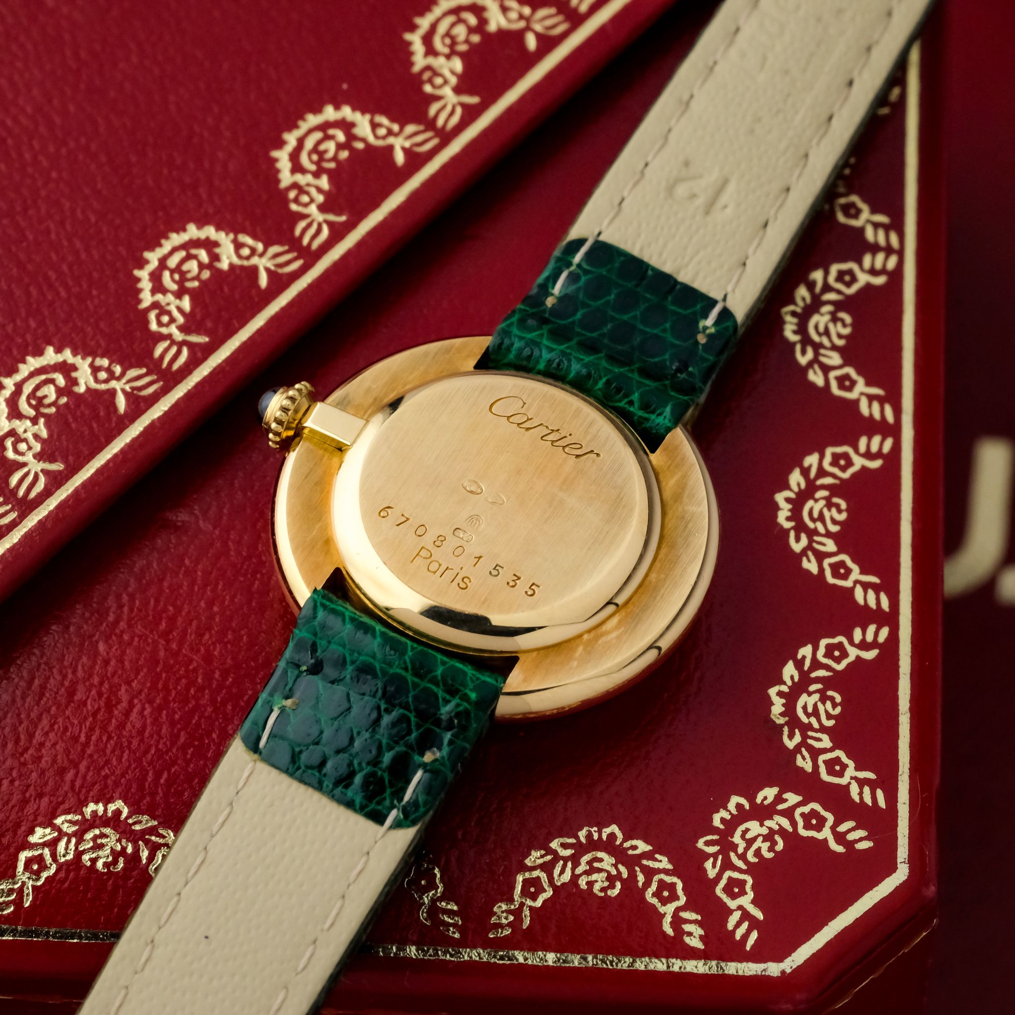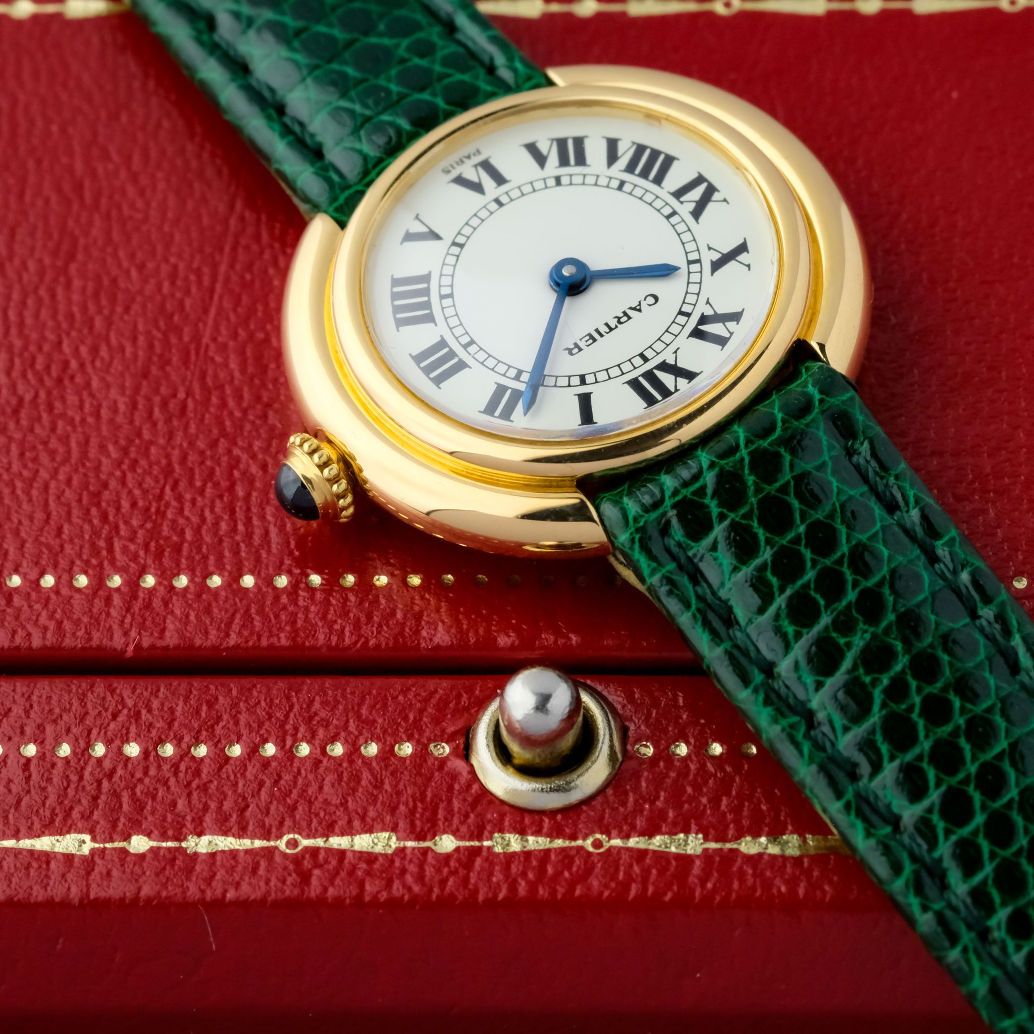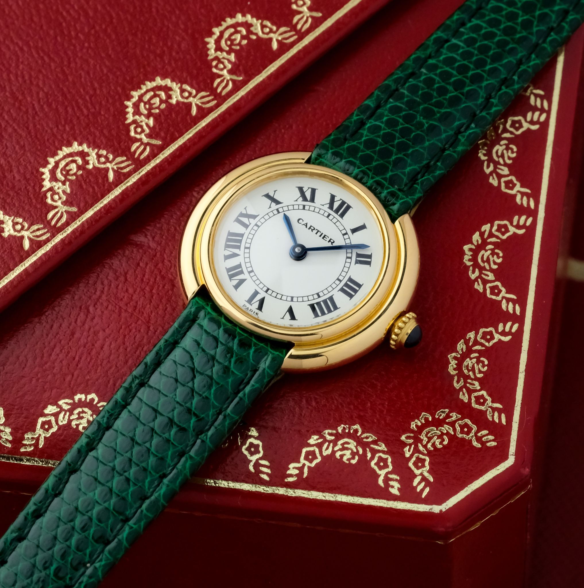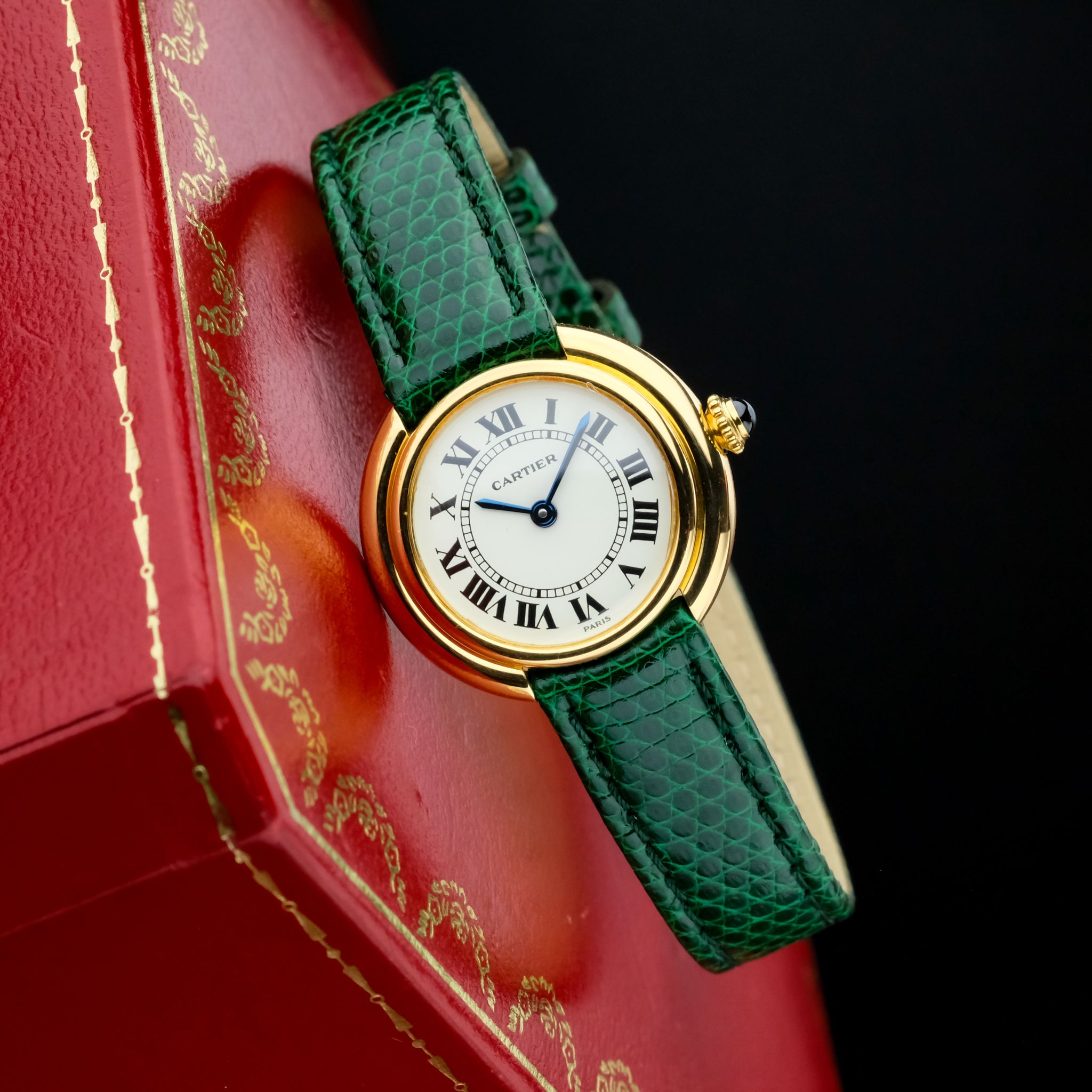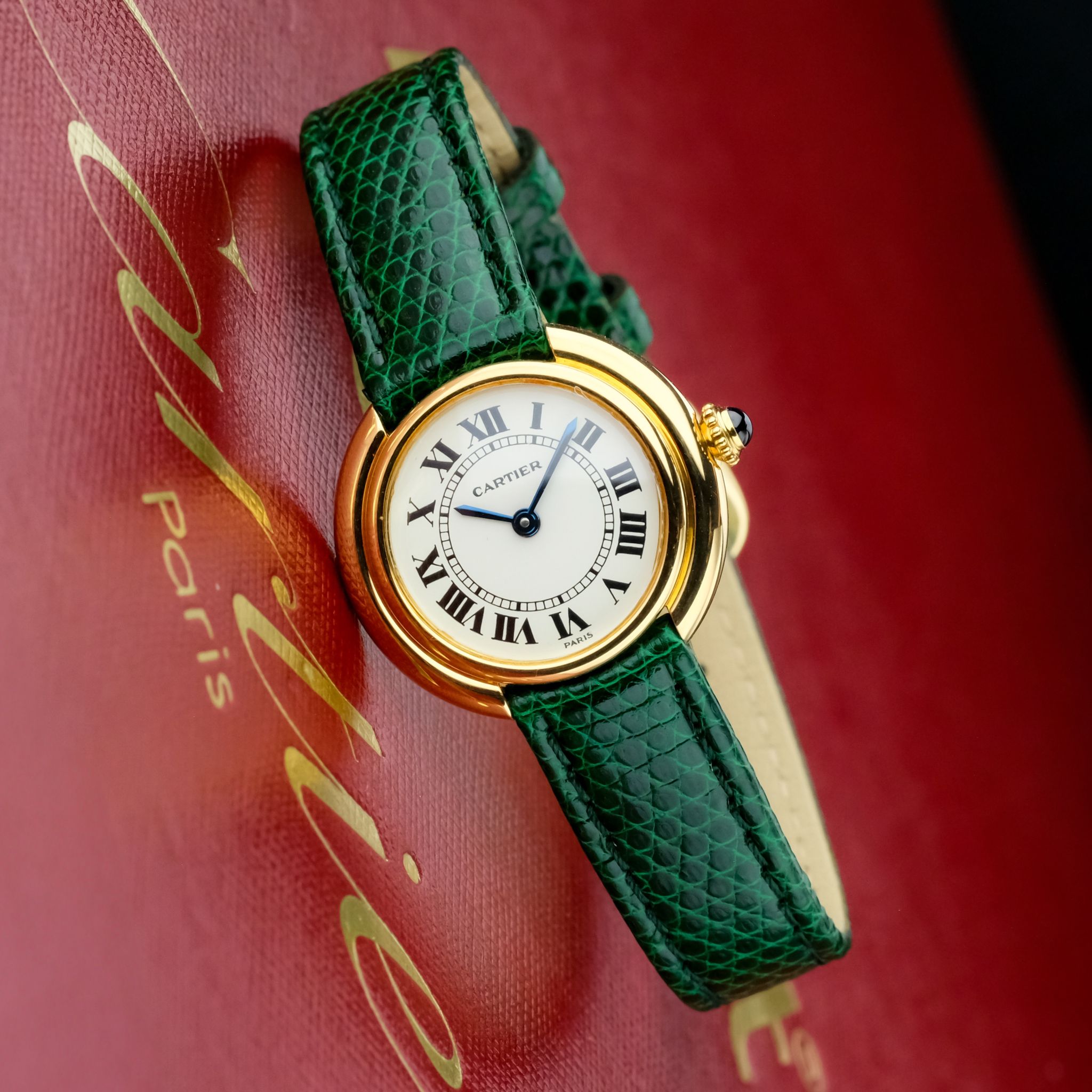 The Cartier Vendôme Ref. 67080 is a classic Lady model from the Maison, embodying timeless elegance in its purest form. The 26mm round 18K yellow gold case, white dial with Roman numerals, and blued steel hands showcase Cartier’s iconic design language. The signature sapphire cabochon crown adds a refined finishing touch. Powered by a manual winding movement, 9P this piece reflects traditional watchmaking artistry in a slim, elegant profile. Its harmonious proportions make it a perfect companion for both special occasions and everyday wear. This example comes fitted with a green leather strap (non-Cartier) and is offered without original box or papers. The watch is in very good condition with light signs of wear and the gold case retains its beautiful luster. A superb choice for collectors and enthusiasts of classic vintage Cartier Lady timepieces.