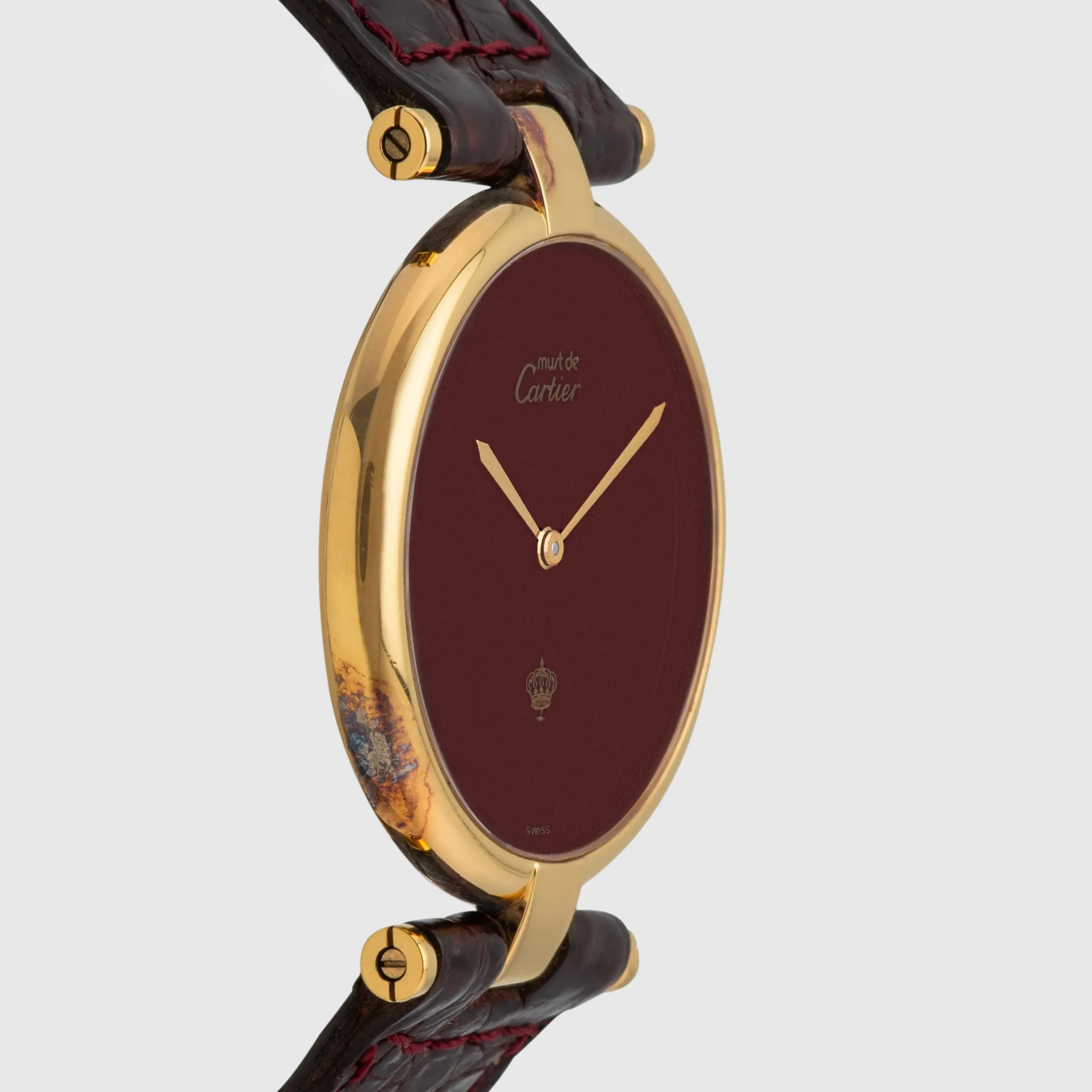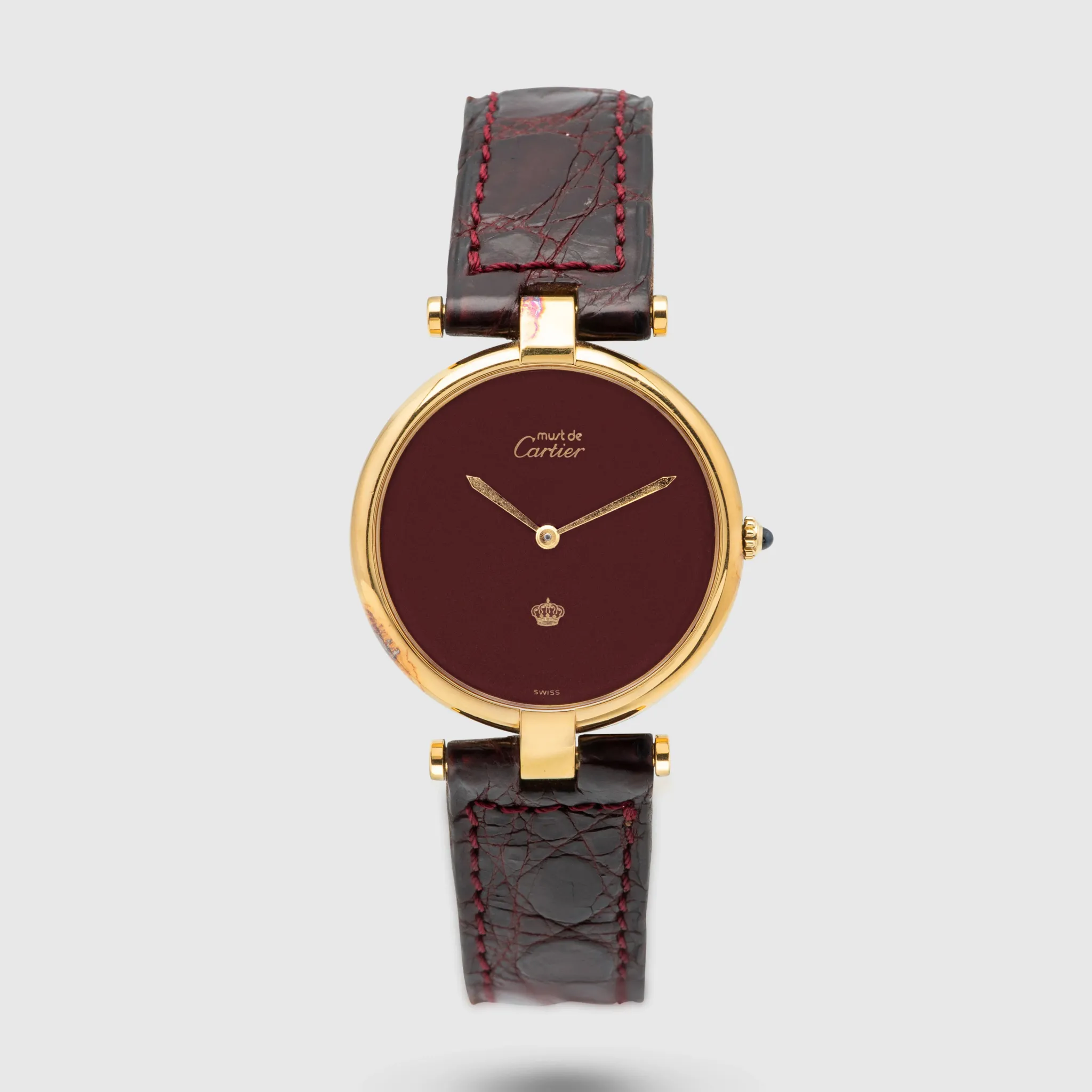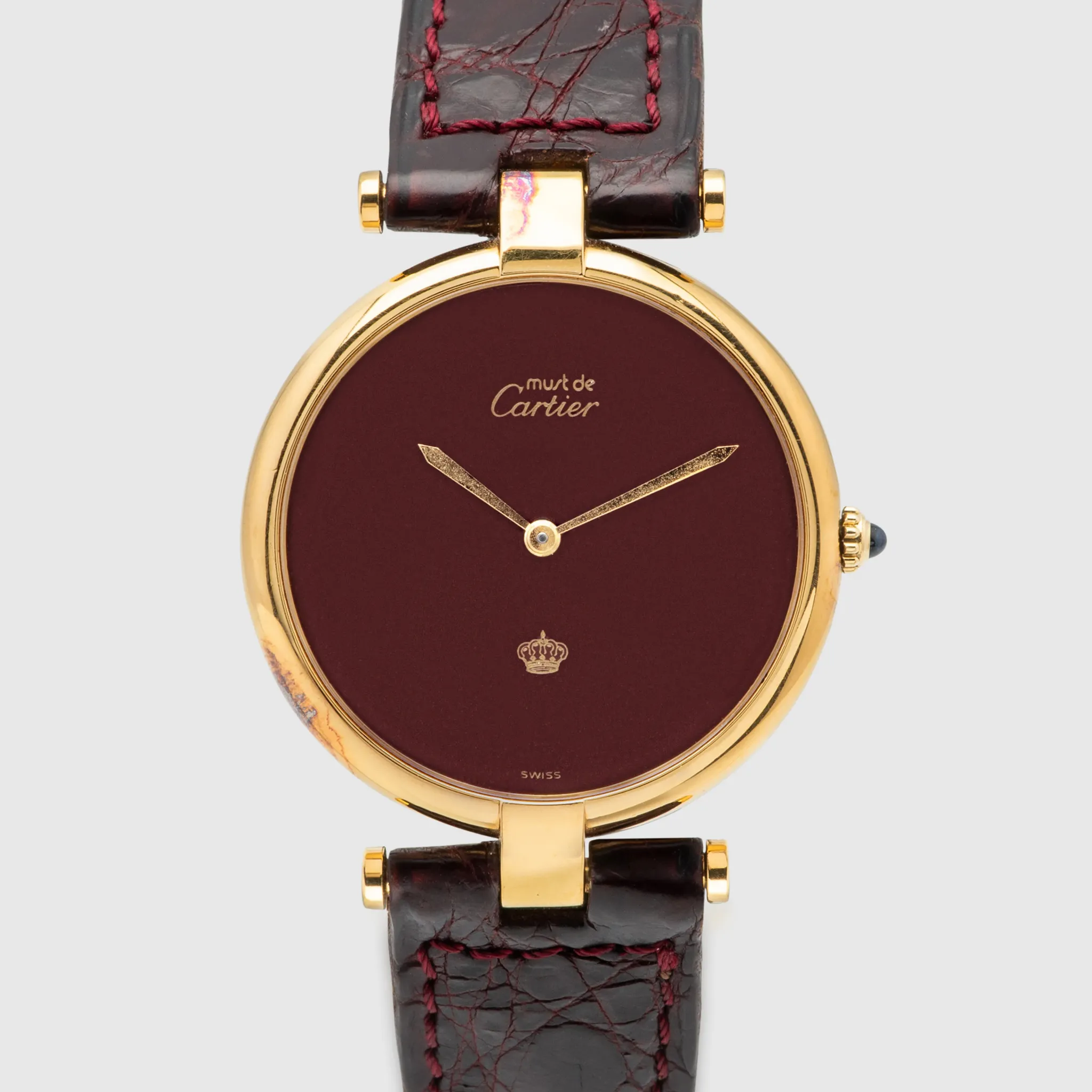 We have her a very rare Cartier Must de Cartier Vermeil in 30mm which is the largest size they have done on this model. The case is in 925 Sterling Silver and has a gold plating which shows signs of patina/oxidation from storage. The movement is Quartz powered. The dial is beautiful, a deep wine red color lacquered dial as seen on some Santos models from the time. The print is in gold, minimalistic to the logo itself and at 6 o'clock we see the Royal Jordanian crown. This very small detail boosts the rarity on this watch and bearing a crown on a Cartier gives it a really exclusive look and feel. The watch comes on a bordeaux Cartier leather strap and gold plated Cartier pin buckle.