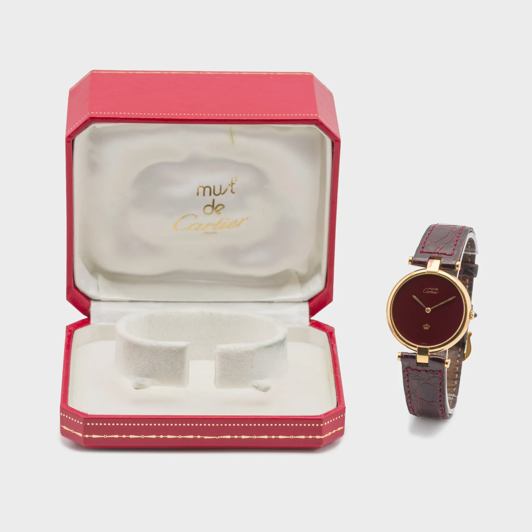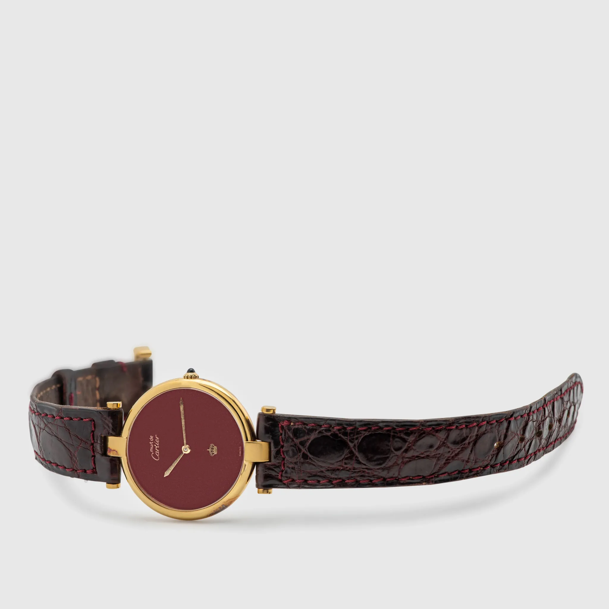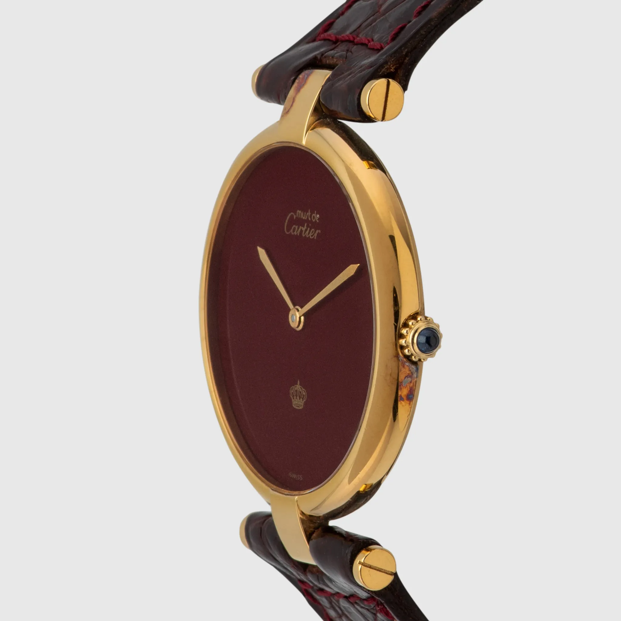 We have her a very rare Cartier Must de Cartier Vermeil in 30mm which is the largest size they have done on this model. The case is in 925 Sterling Silver and has a gold plating which shows signs of patina/oxidation from storage. The movement is Quartz powered. The dial is beautiful, a deep wine red color lacquered dial as seen on some Santos models from the time. The print is in gold, minimalistic to the logo itself and at 6 o'clock we see the Royal Jordanian crown. This very small detail boosts the rarity on this watch and bearing a crown on a Cartier gives it a really exclusive look and feel. The watch comes on a bordeaux Cartier leather strap and gold plated Cartier pin buckle.