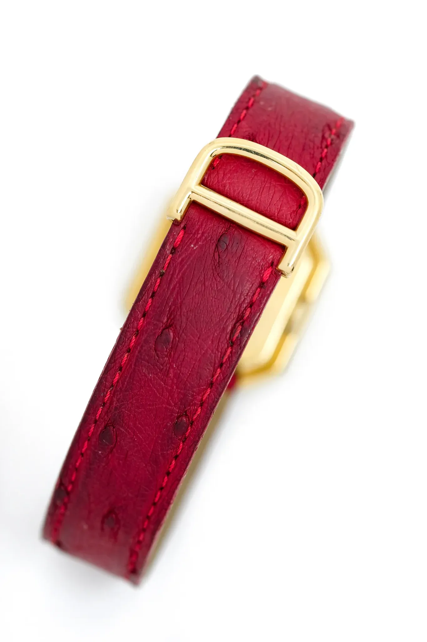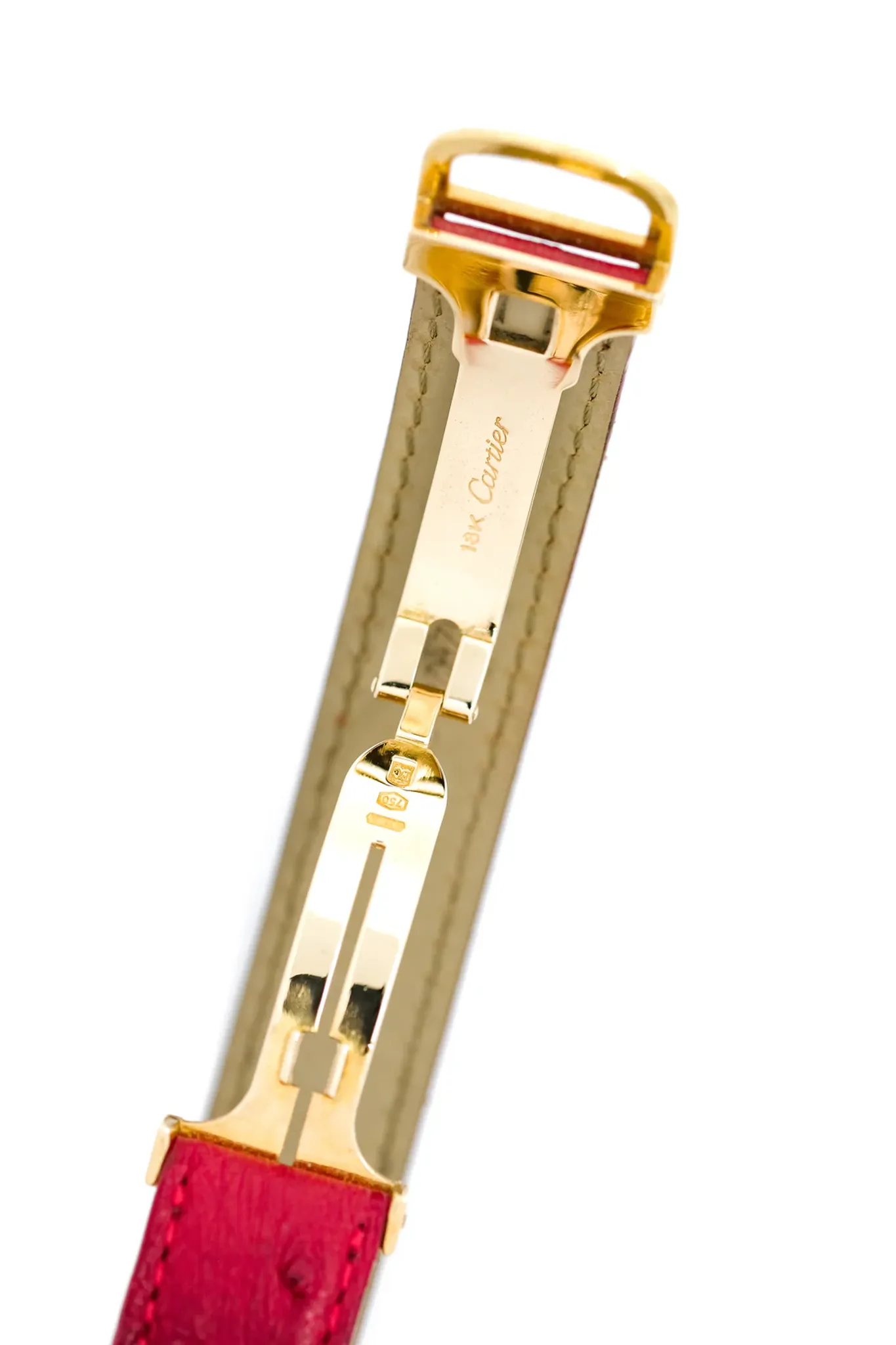18K yellow gold case. Cartier 18K yellow gold folding clasp. Custom-made Cartier ostrich leather strap. Cartier pounch.