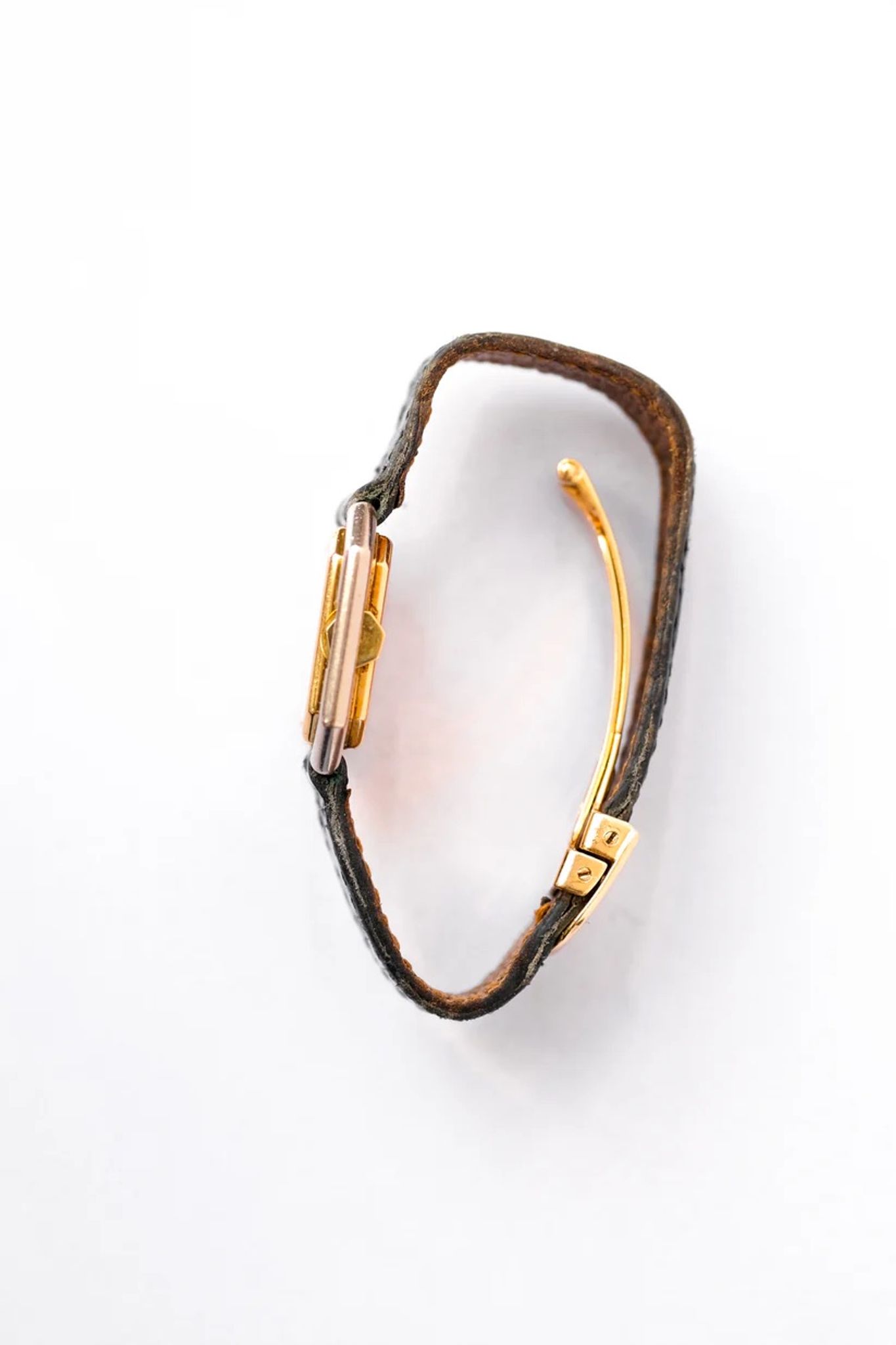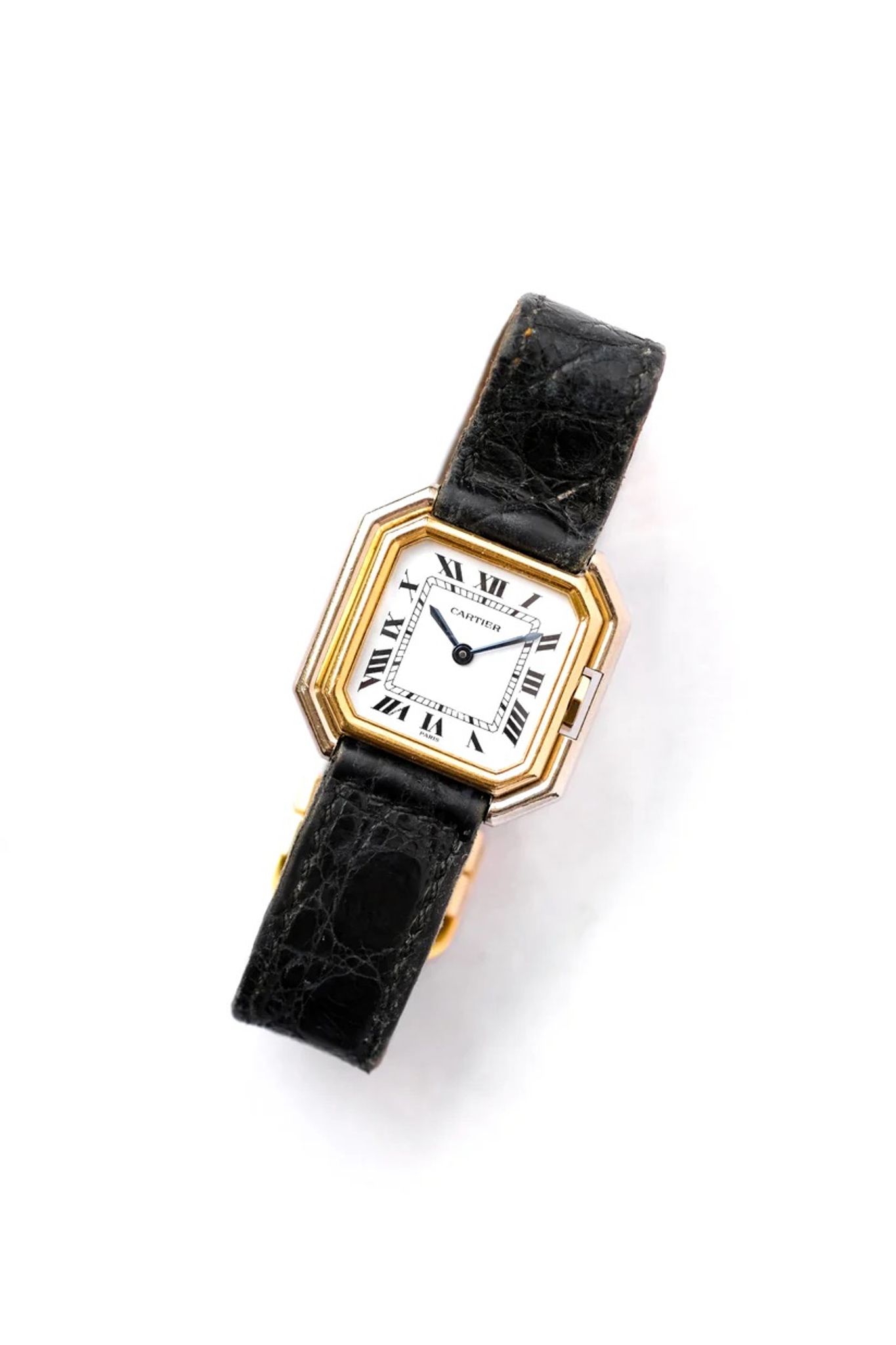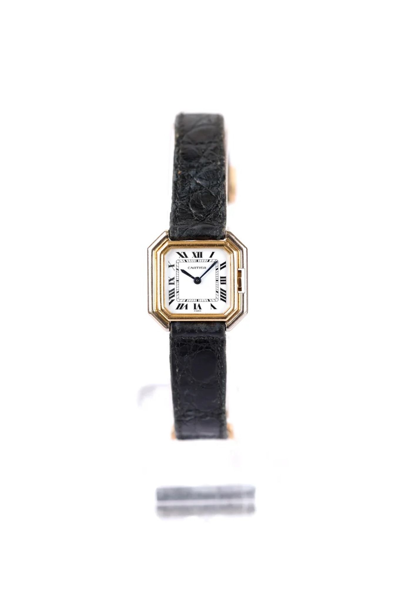 A square case with beveled corners, the gadroon that protects the crown: no doubt, this is indeed a Ceinture! Square and flat, this model is as elegant as it is pleasant on the wrist. Even if it is thin, the gadroon of its case (the wave of gold along the case) gives the Ceinture a real presence on the wrist. However, this is a much rarer version of the Cartier Ceinture. It has a case combining yellow and white gold.