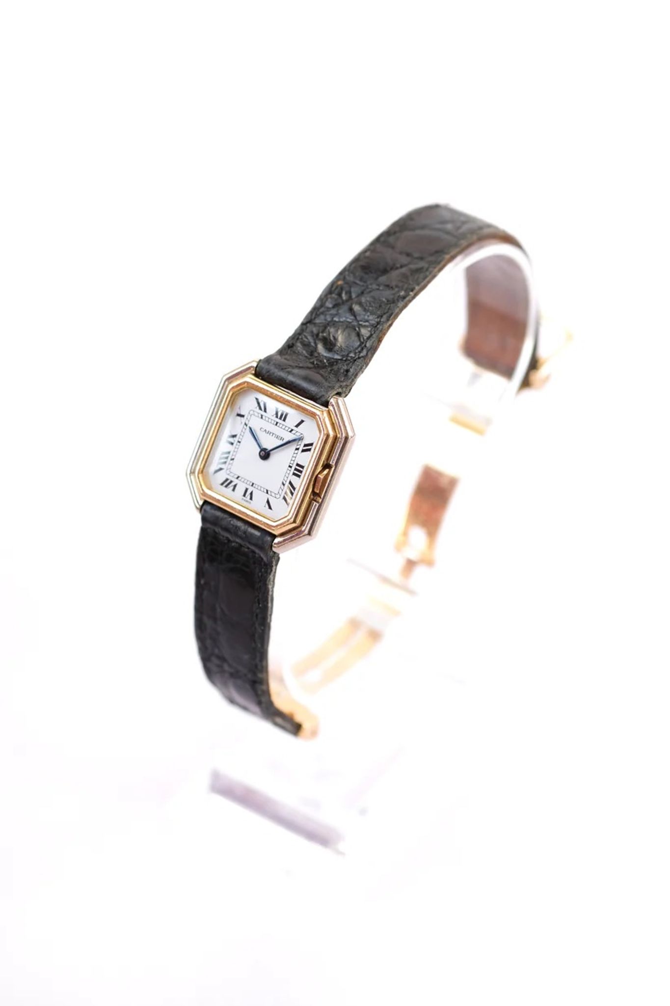 18K yellow gold and 18K white gold case. 18K yellow gold Cartier folding clasp. Custom-made black leather strap.