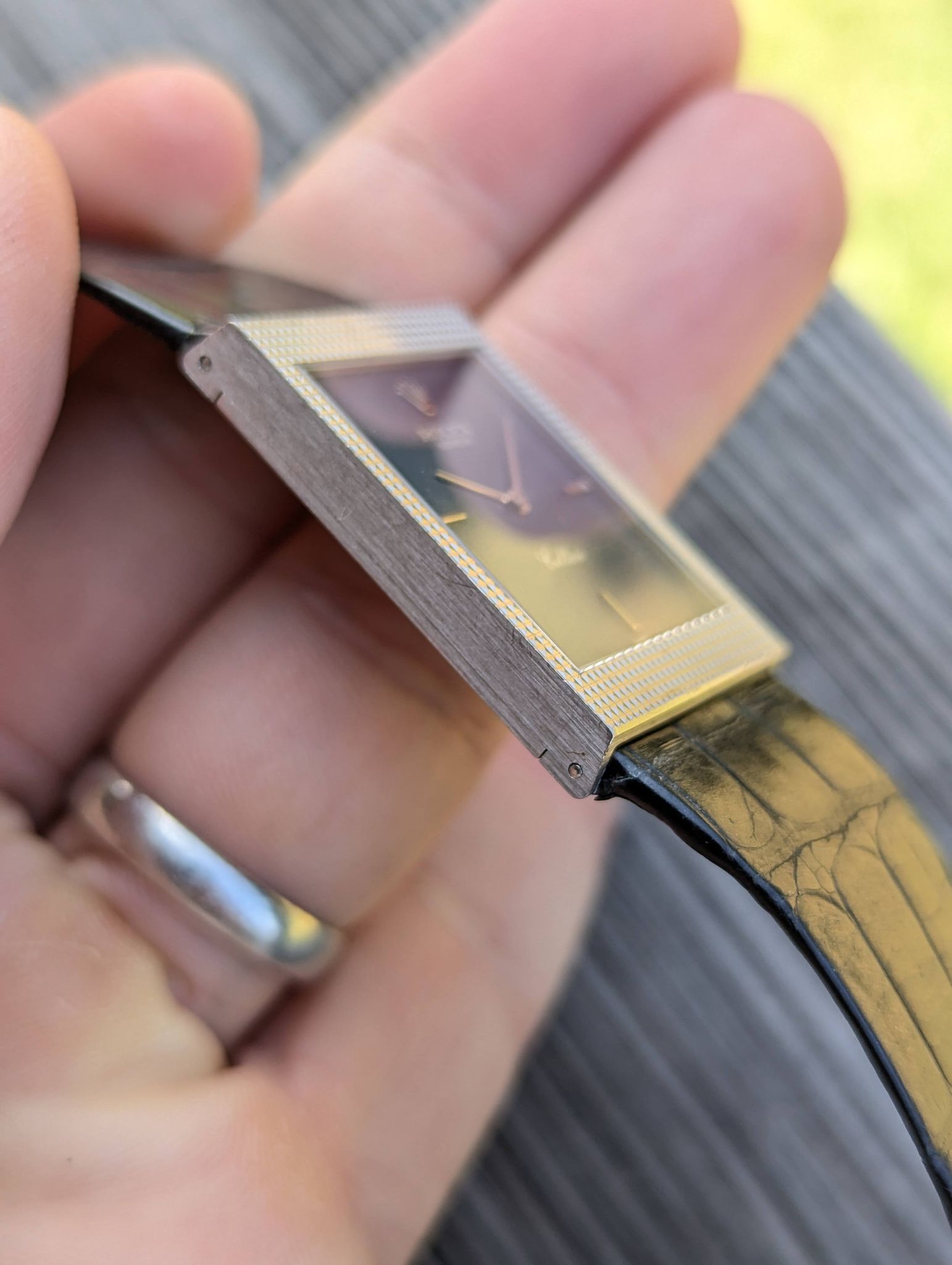 This particular one is a brilliant example of what the 70s could produce in terms of good design. Clean, elegant and sophisticated. The white gold case with pyramidal texture in extremely crisp, and the blue dial brings a very elegant touch.