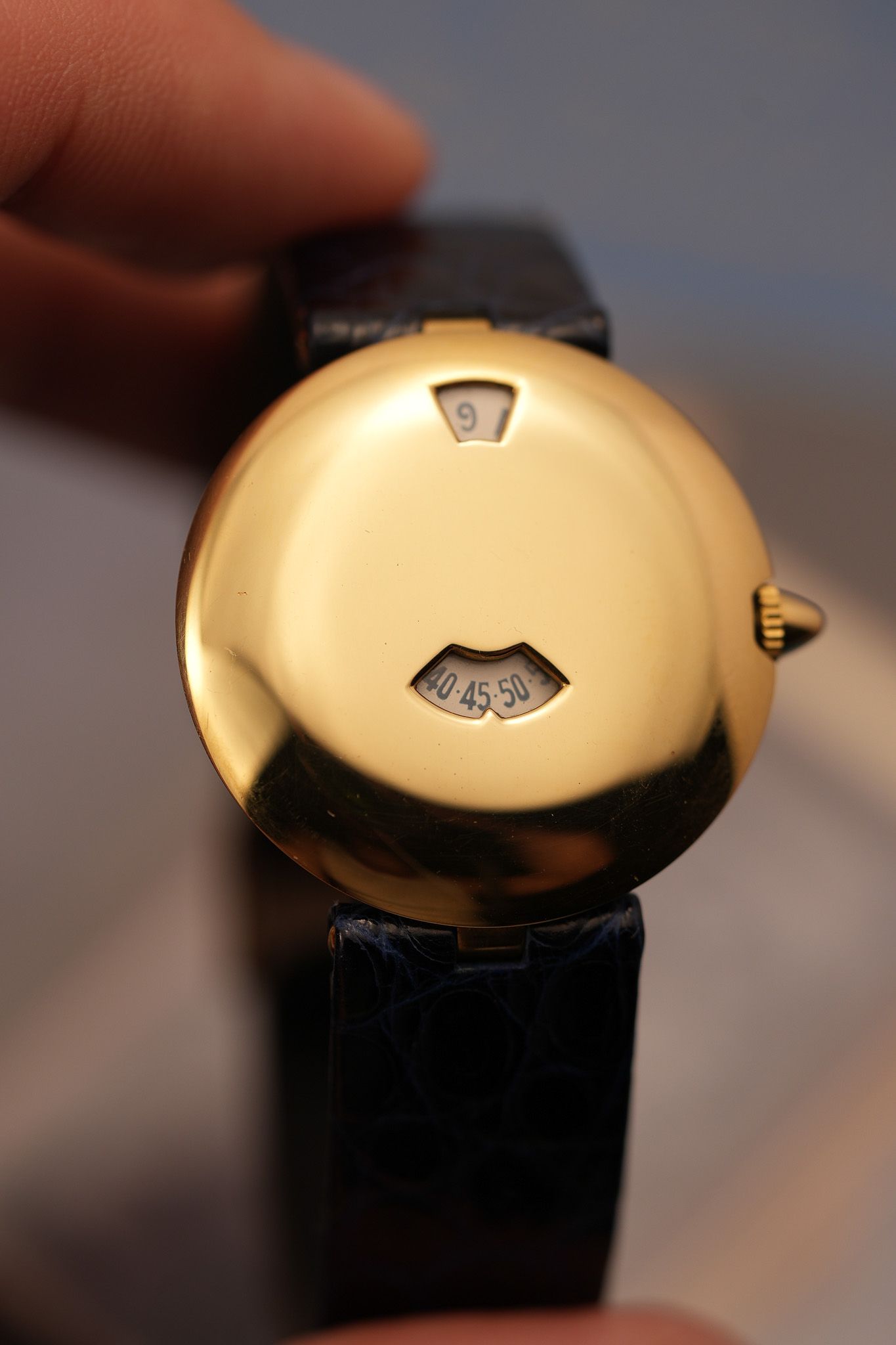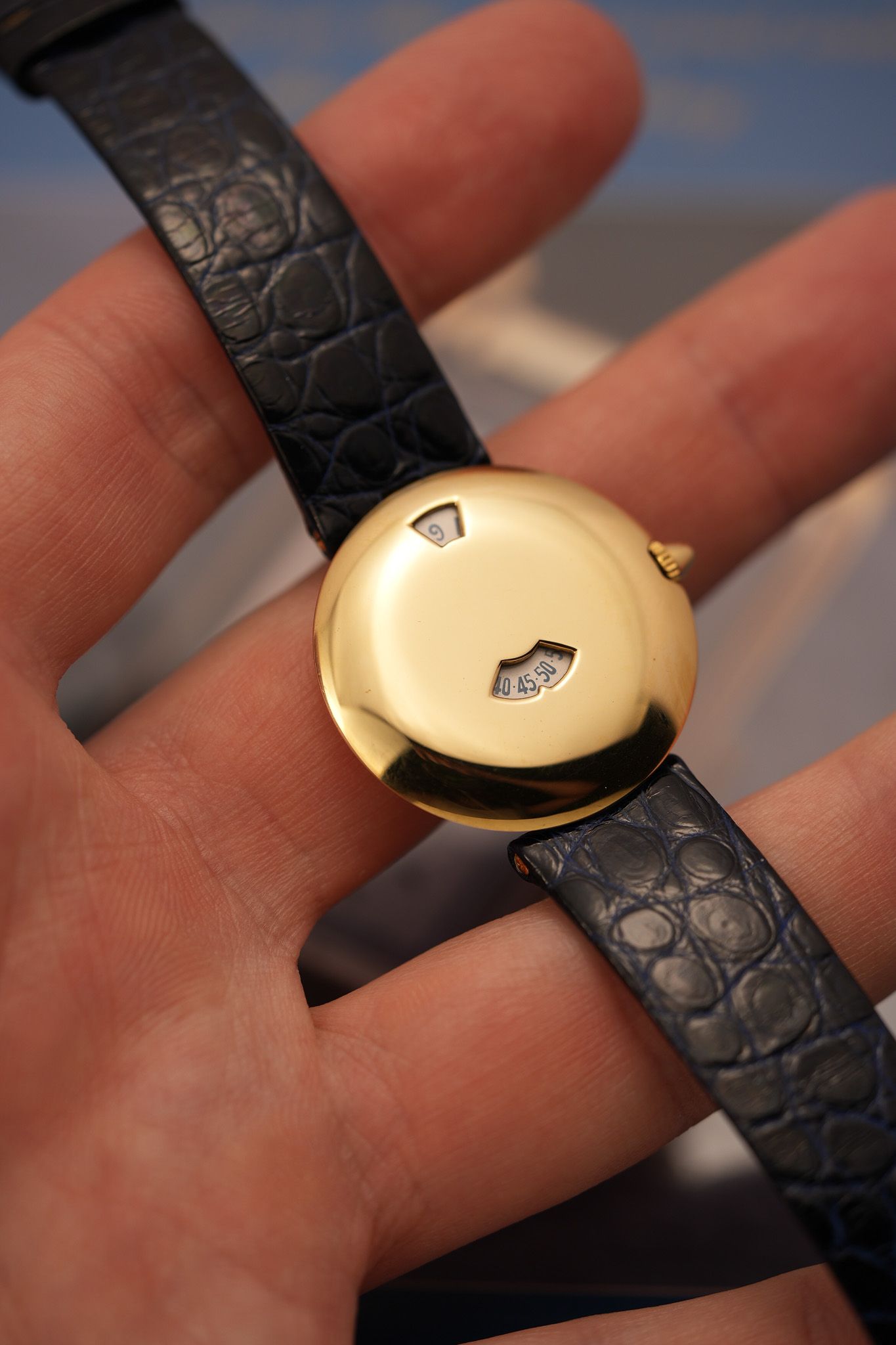 There’s something oddly serene about wearing a watch like this. It doesn’t constantly remind you of the time—it reveals it, one clean step at a time. A rare golden blink, over and over again.
