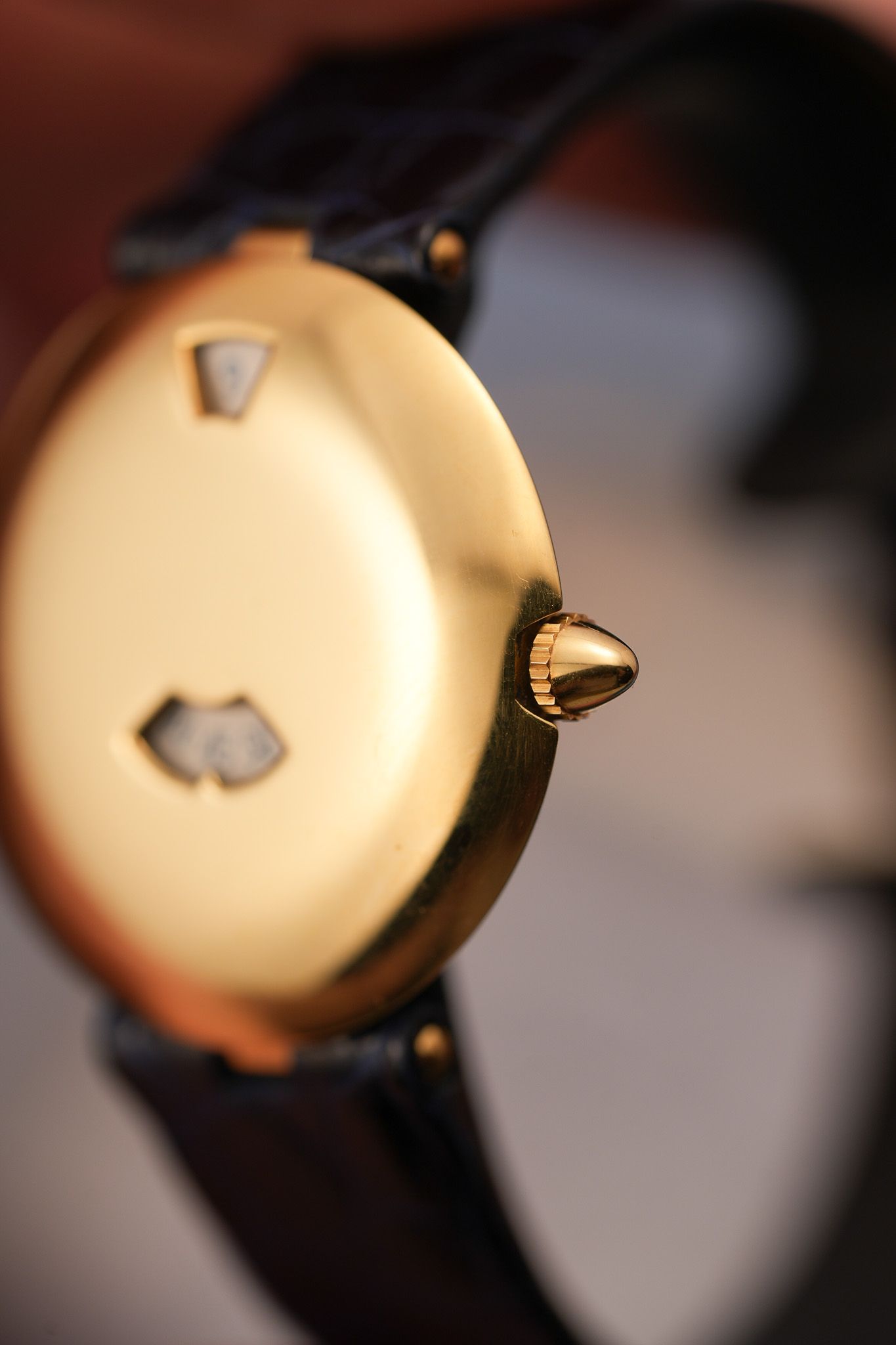 What we have here is the midsize variant, a more compact version of the automatic 36mm, and frankly, the better-looking sibling. The case is shaped like a polished gold saucer—ultra-smooth, ultra-thin, and surprisingly bold for something this discreet. Because of the shape, it wears larger than you'd expect. You’re not looking at lugs and crown guards and excess bezel here—just one smooth curve of gold that hugs the wrist like it was sculpted for it. And then there are the apertures: two little windows that break the surface just enough to show you the hour and the minutes, printed on rotating discs. It’s quirky. It’s quiet. It’s captivating.