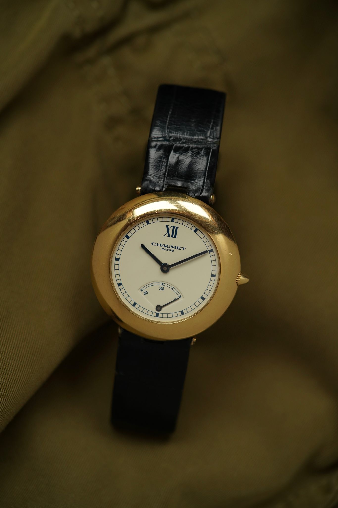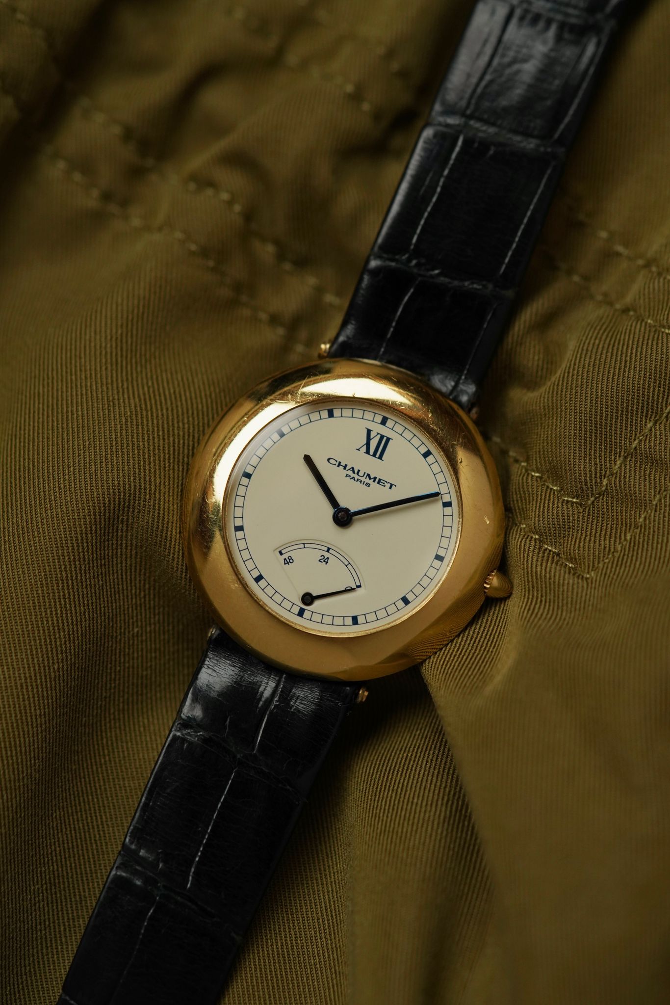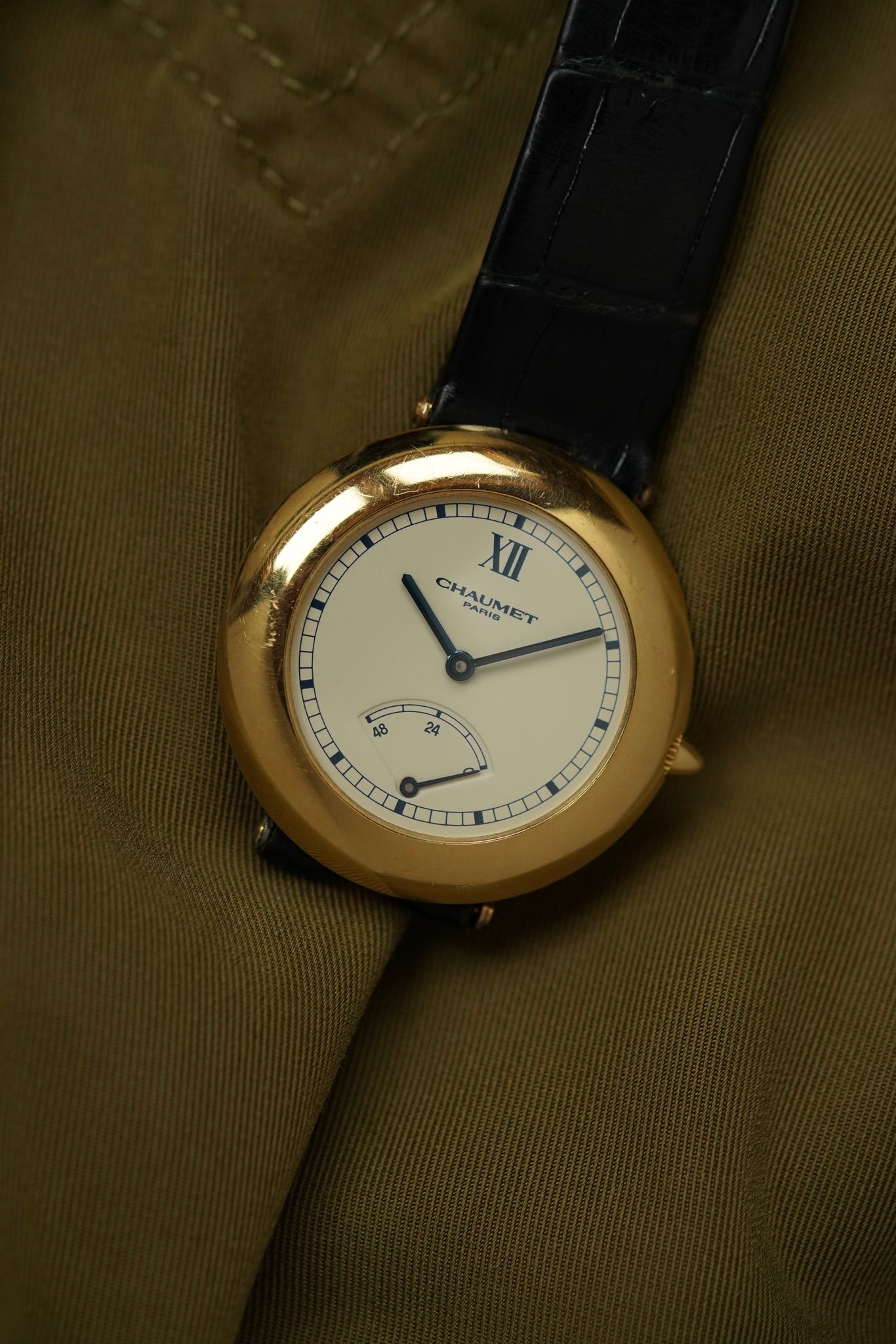 A Chaumet Power Reserve, 36 mm in 18k yellow gold with its softly curved “pebble” case and hidden lugs. The ivory dial is pared-back yet striking—anchored by a lone Roman XII, blued hands, and a retrograde power reserve at 6 o’clock.