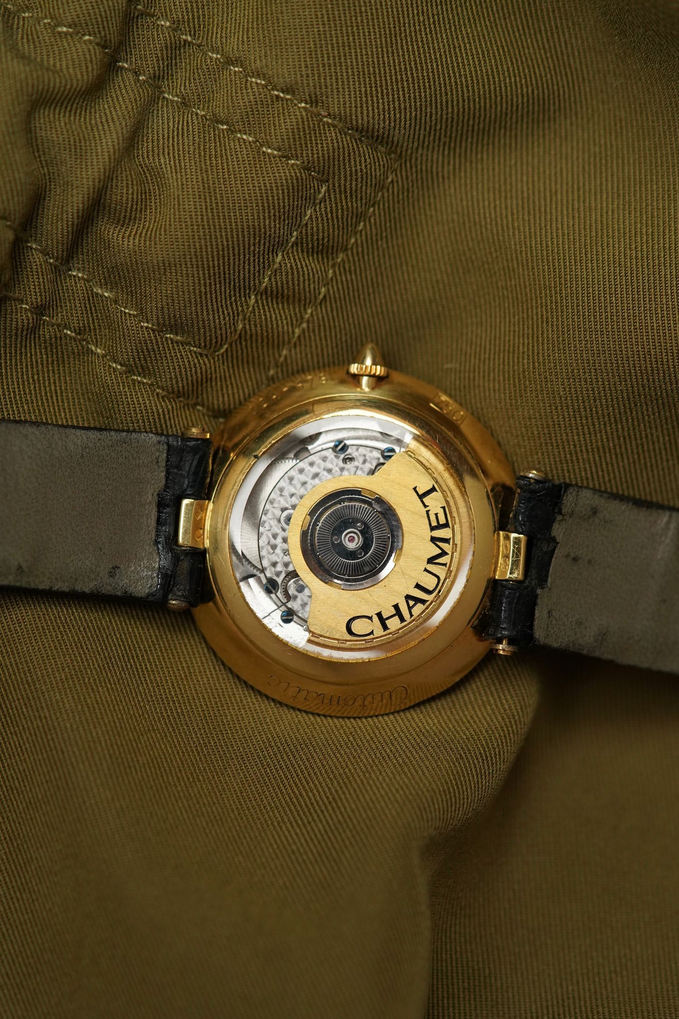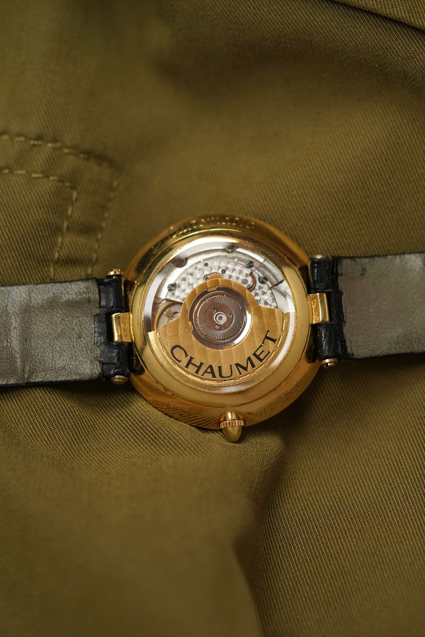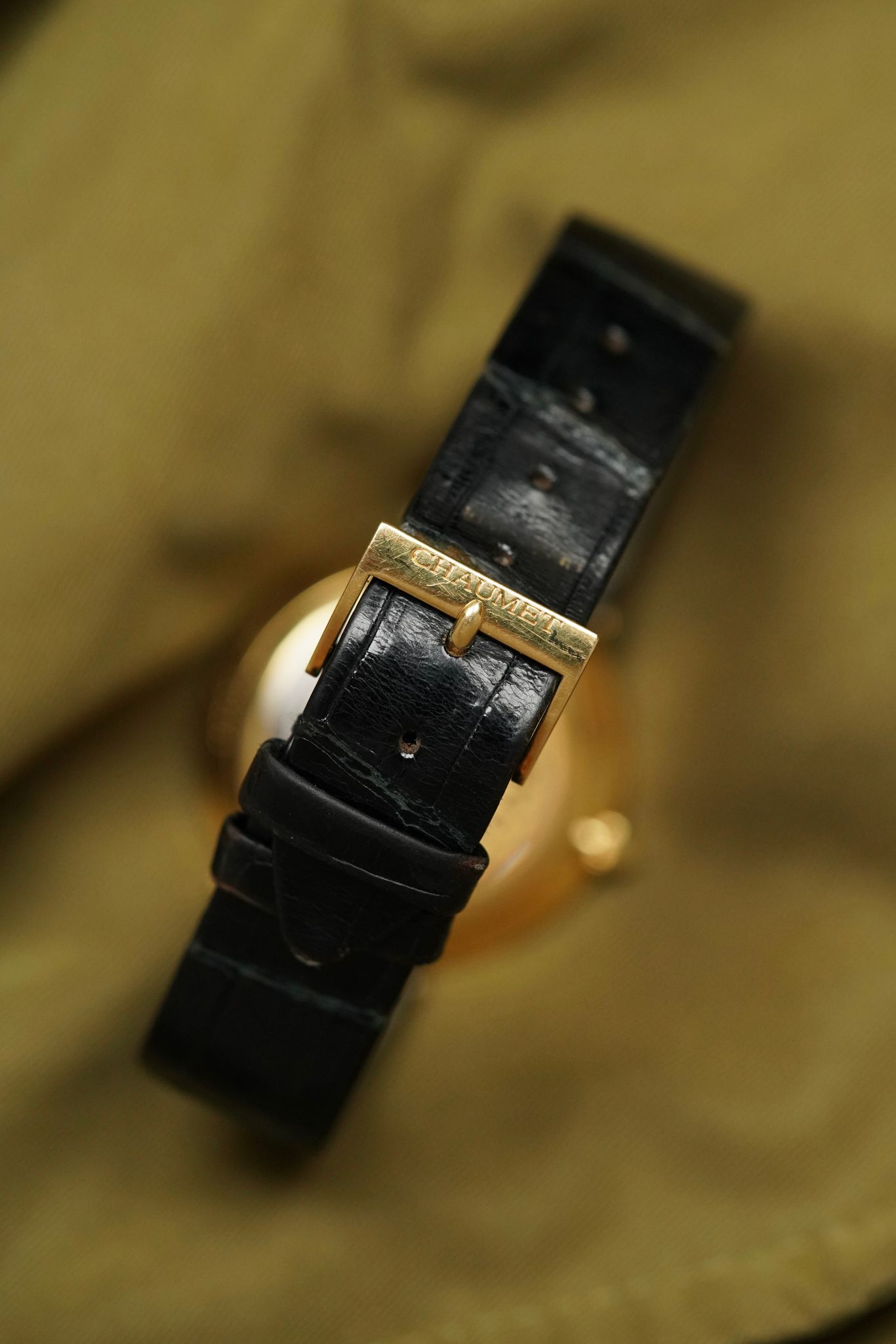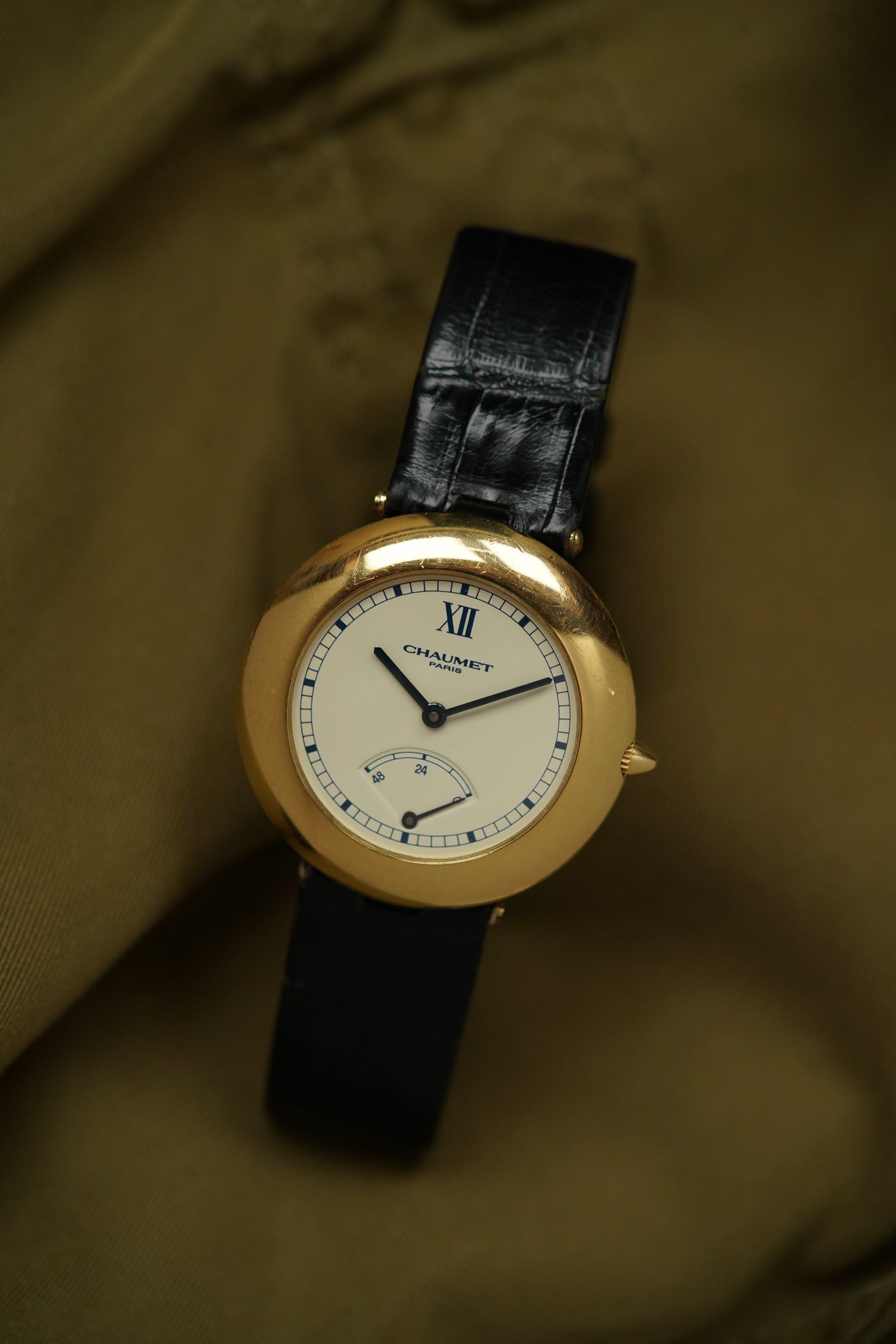 A Chaumet Power Reserve, 36 mm in 18k yellow gold with its softly curved “pebble” case and hidden lugs. The ivory dial is pared-back yet striking—anchored by a lone Roman XII, blued hands, and a retrograde power reserve at 6 o’clock.