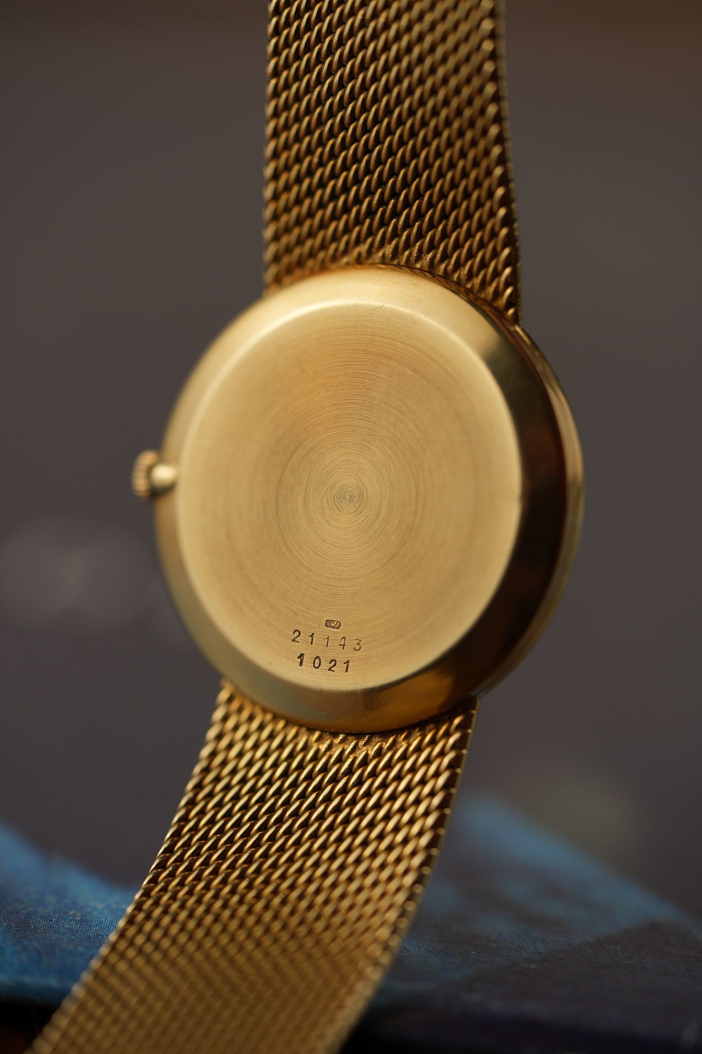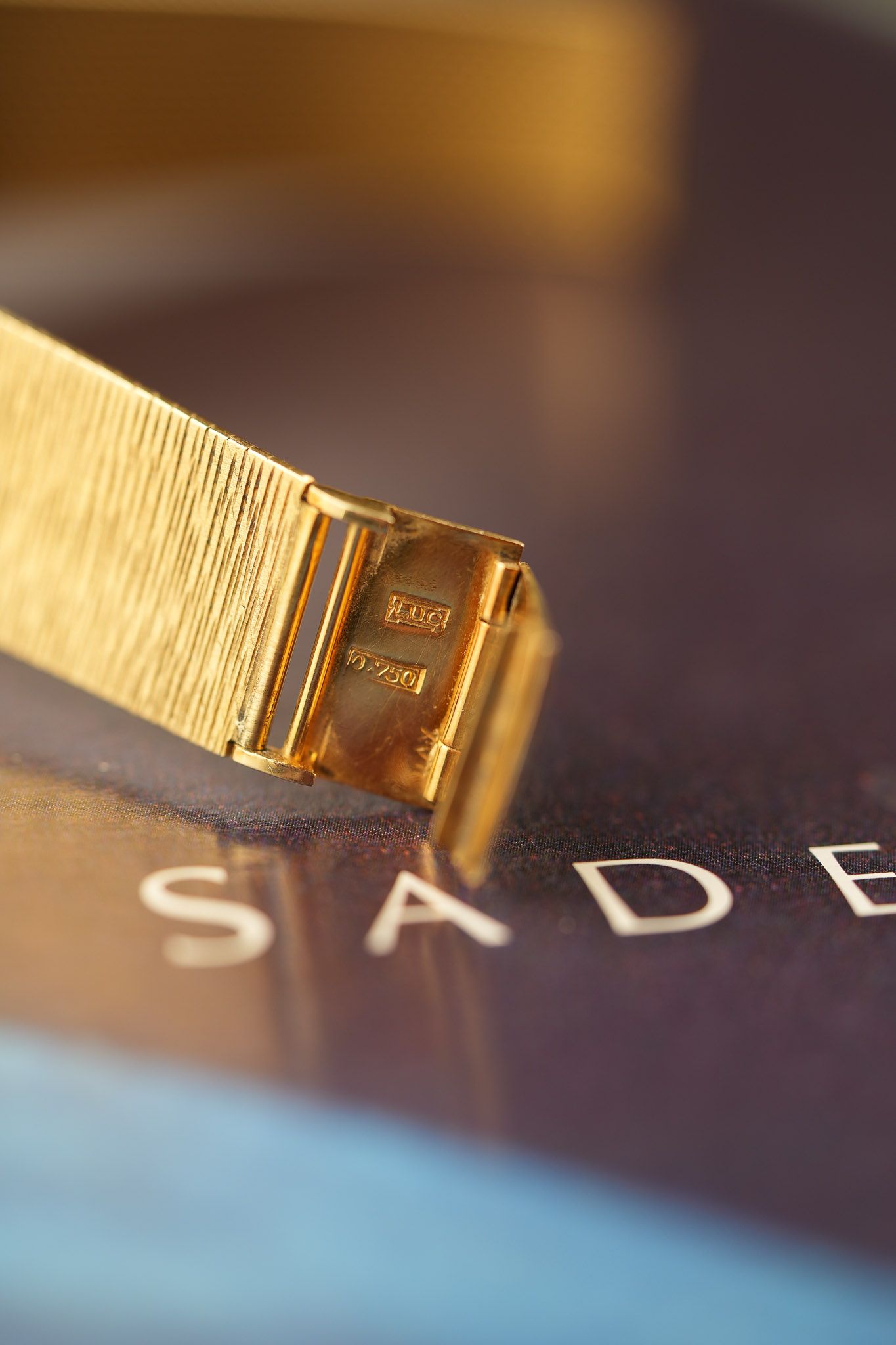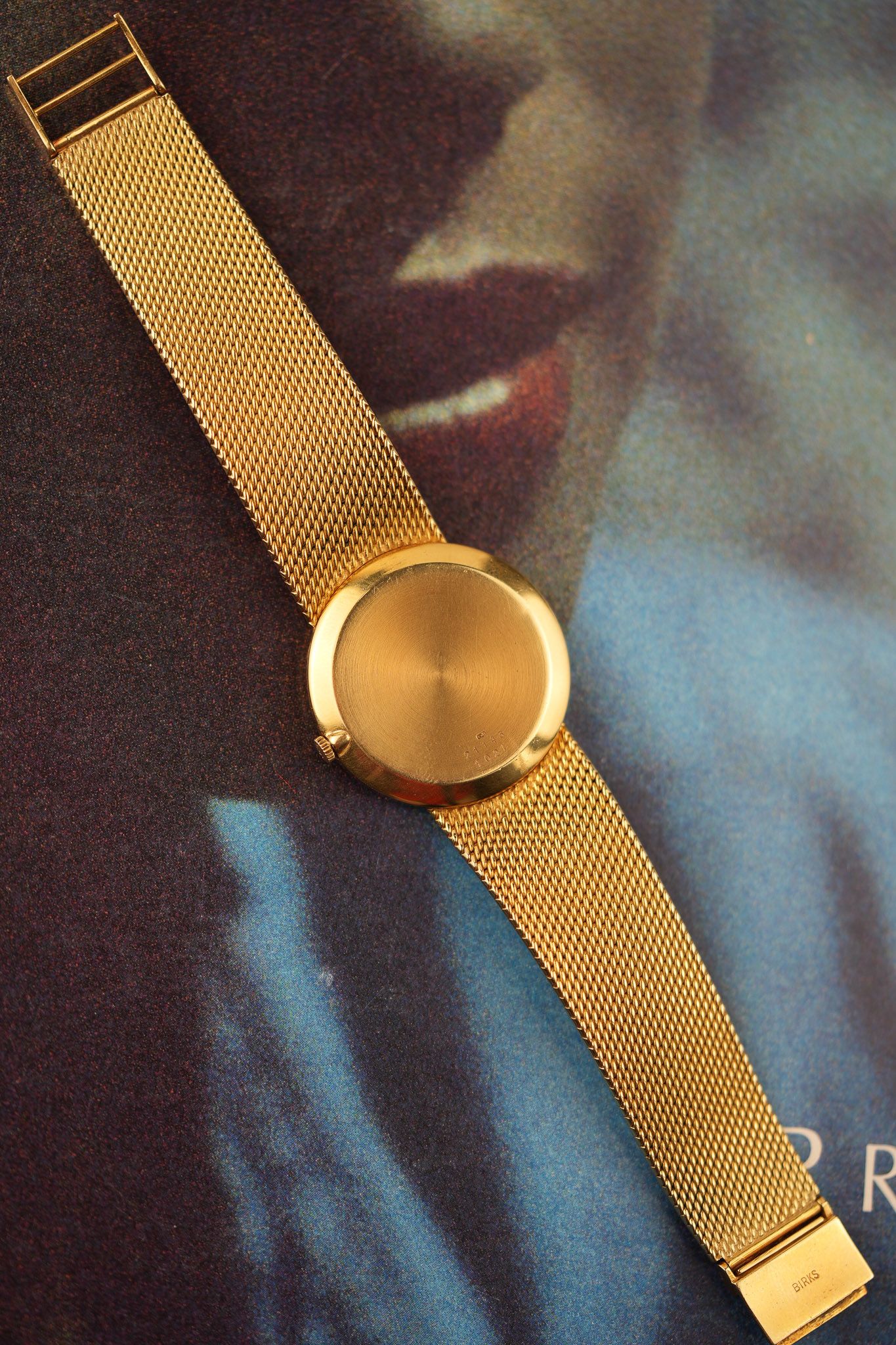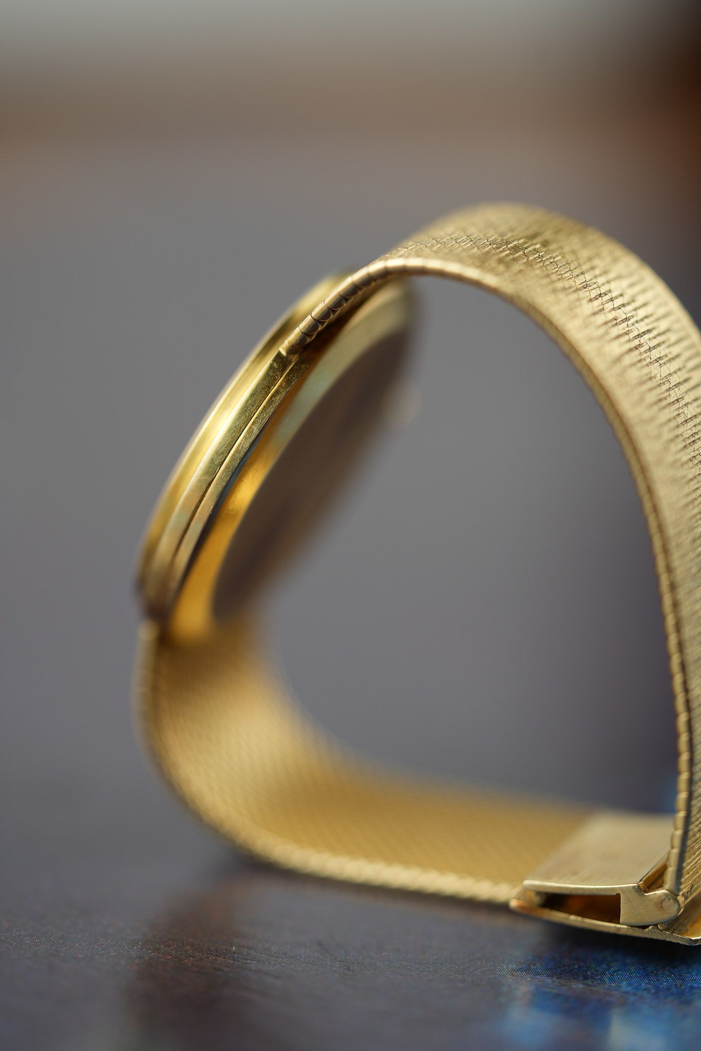This particular watch is a rarity for its automatic movement, an uncommon find in precious metal dress watches of this era, which were often manually wound. The case measures 33mm but wears more like 35mm due to its wide, integrated bracelet.