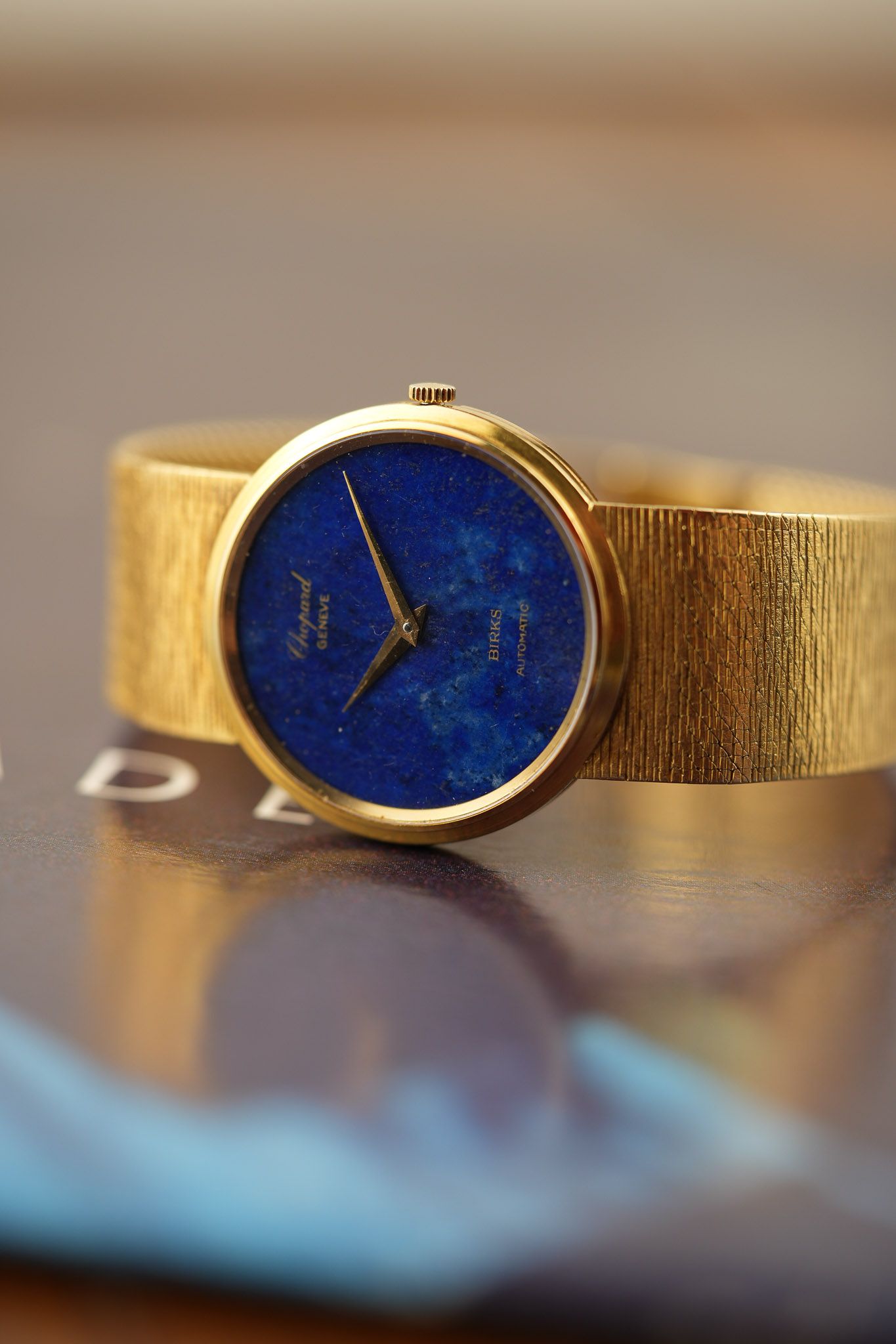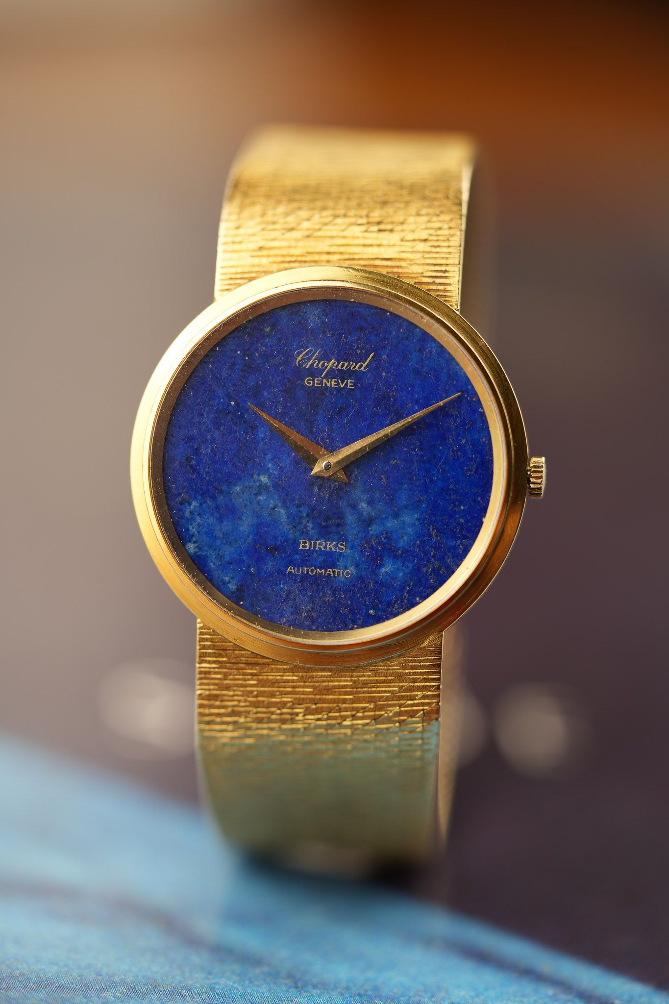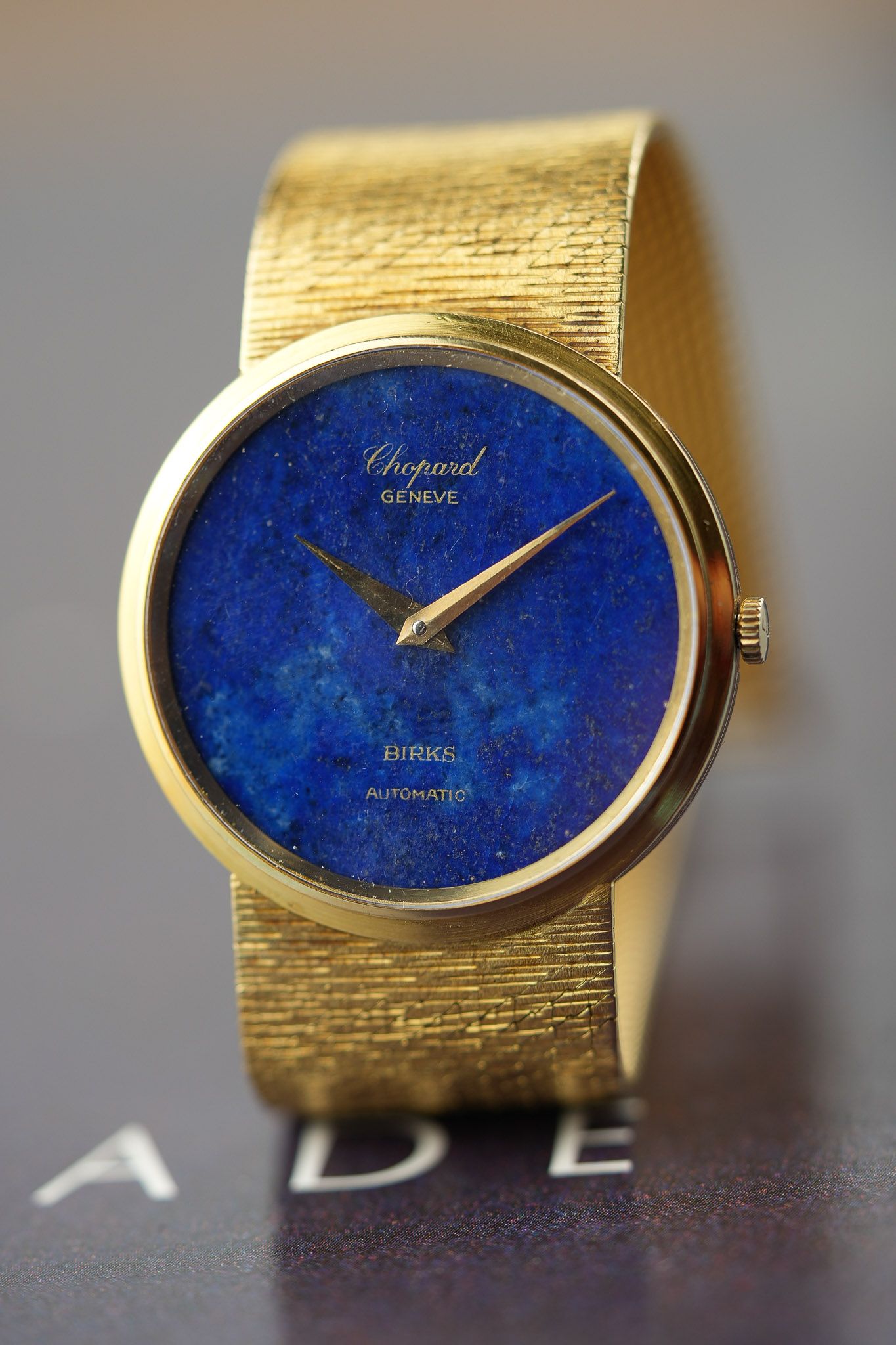 The Chopard Lapis Lazuli in 18K yellow gold, double signed by the iconic Canadian jeweler Birks, is a timepiece that captures the spirit of the 1980s corporate heyday. The hypnotic lapis lazuli dial, with its deep blue hue and streaks of white resembling clouds, captures the essence of a limitless sky, a metaphor for aspirations that never wavered.