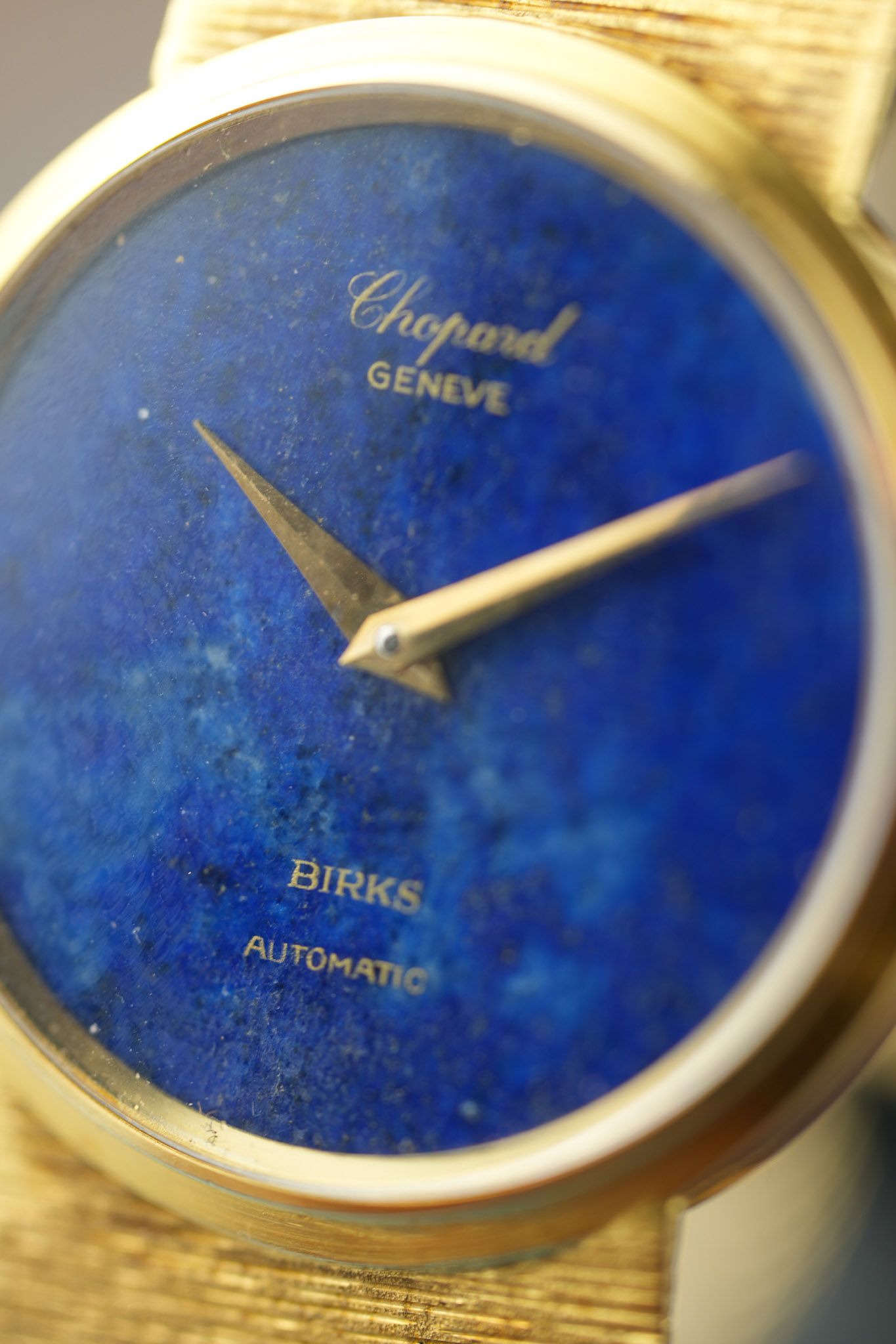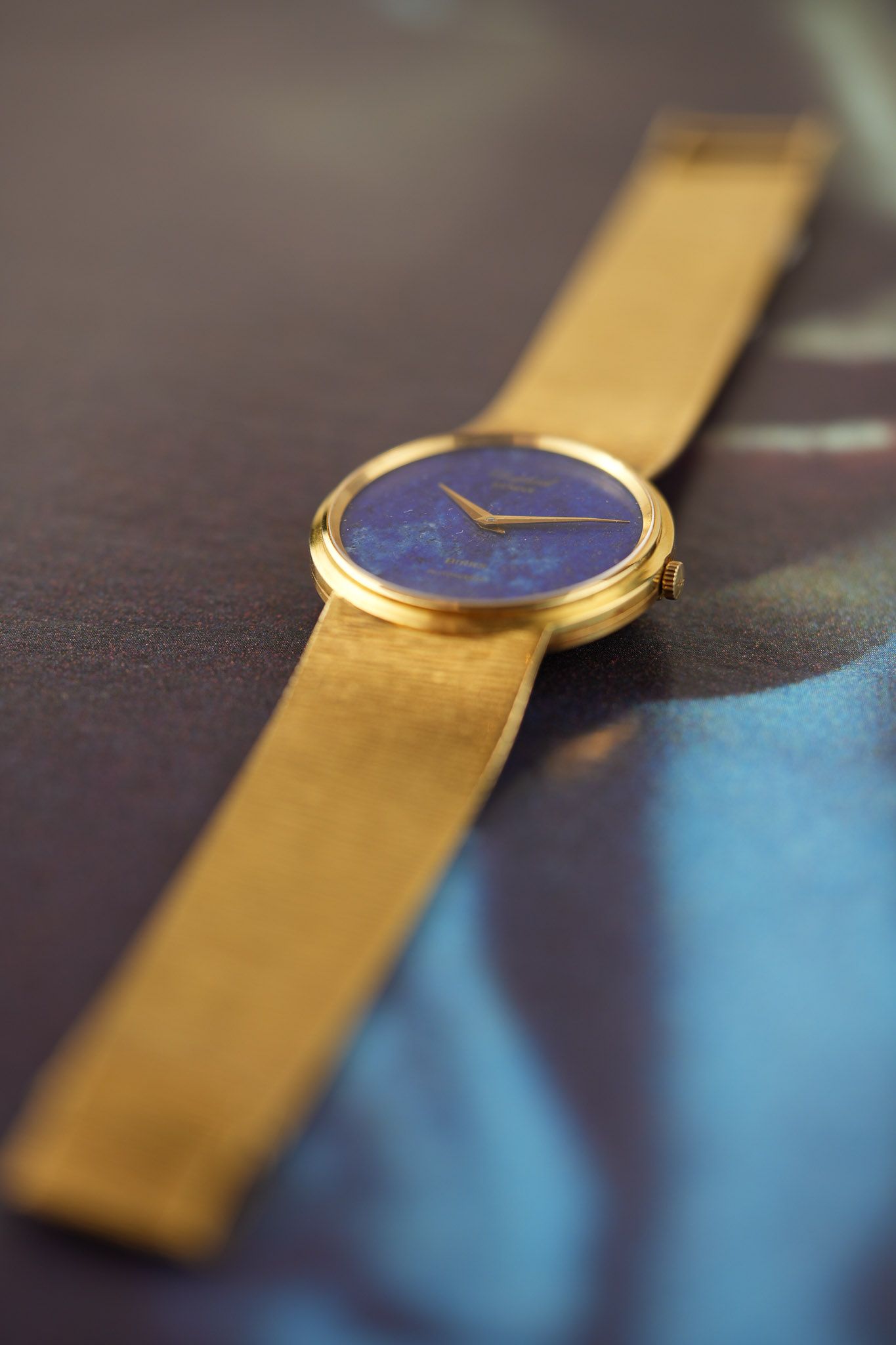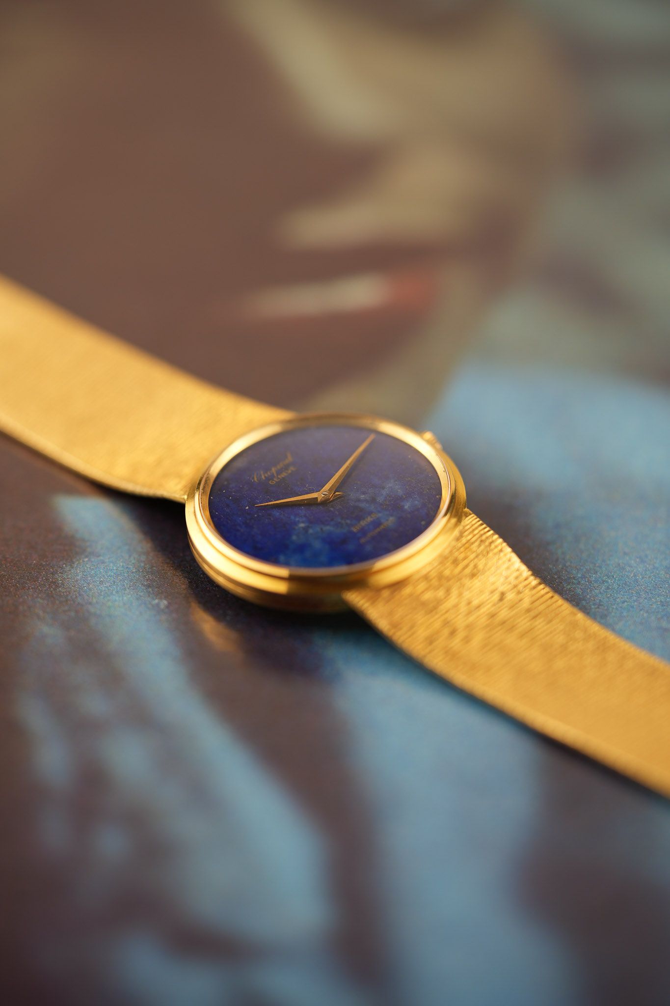 The Chopard Lapis Lazuli in 18K yellow gold, double signed by the iconic Canadian jeweler Birks, is a timepiece that captures the spirit of the 1980s corporate heyday. The hypnotic lapis lazuli dial, with its deep blue hue and streaks of white resembling clouds, captures the essence of a limitless sky, a metaphor for aspirations that never wavered.