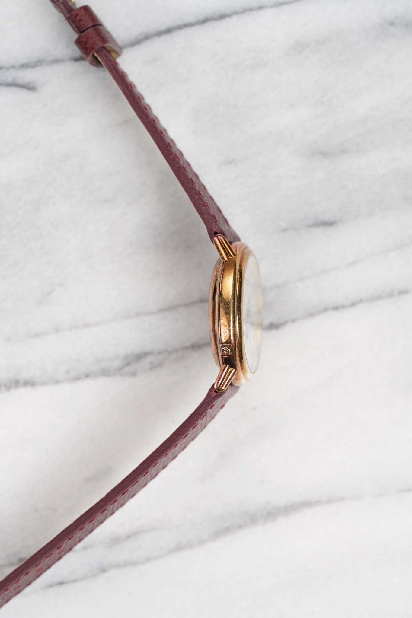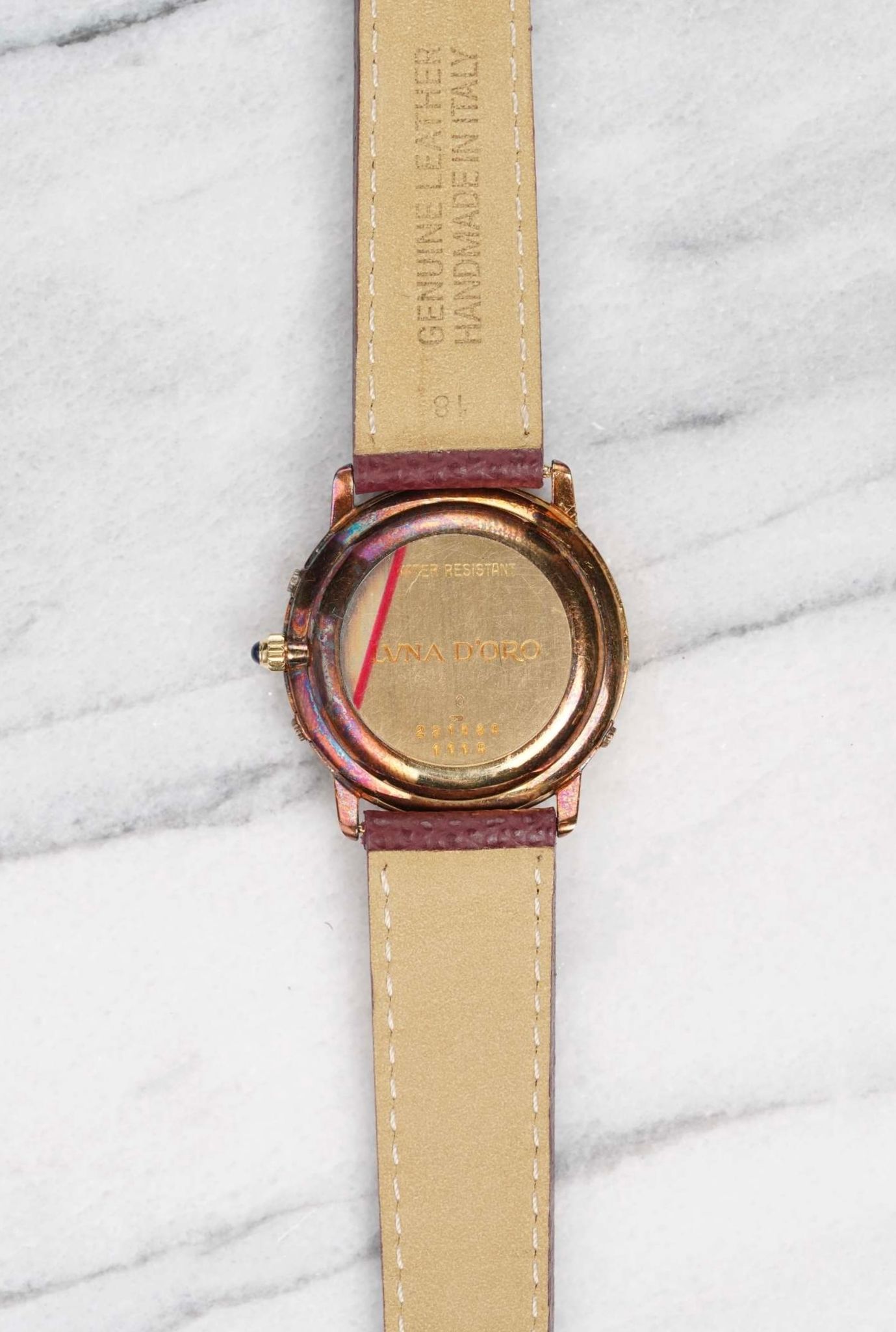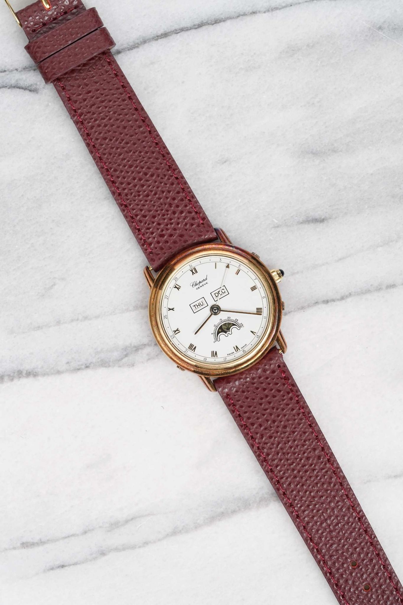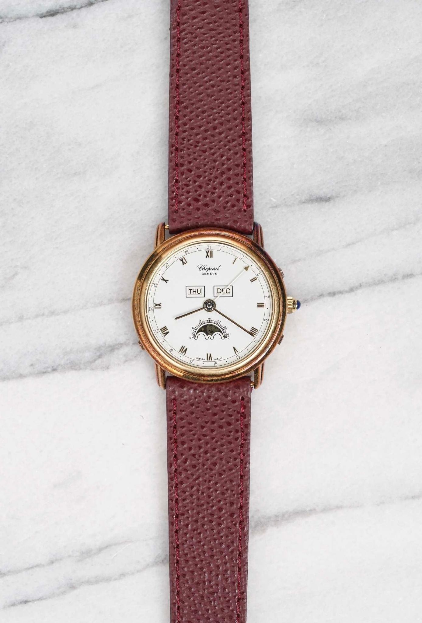 Here's a vintage Chopard Geneve moon phase Daydate in 18k yellow gold in quartz from the 1990s. Keeps great time and is fully functional. Measurements include a 34mm case size and 18mm lug width. On a maroon pebble textured leather strap (made in Italy) White dial. Matching gold stick hands and Roman numerals. Day and date indicators in the 3 and 9 a clock position. Moonphase indicator at the 6 a clock position. 18k yellow gold case and caseback. The case oxidized to a darker purple color as seen in photos. Hard to find these examples. All other parts are original including the signed caseback, dial, and movement. Both the dial and case are in great cosmetic, untouched condition.