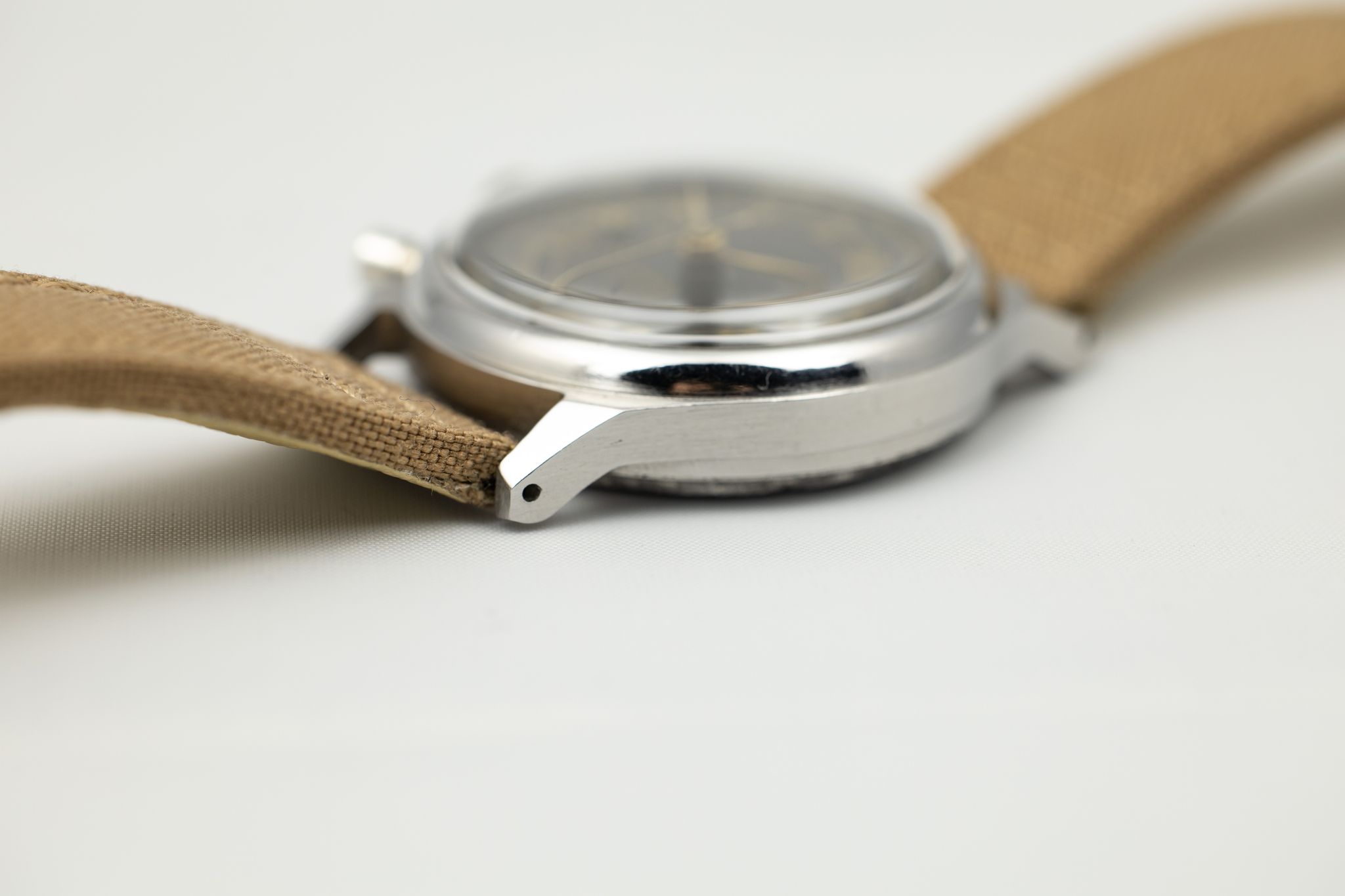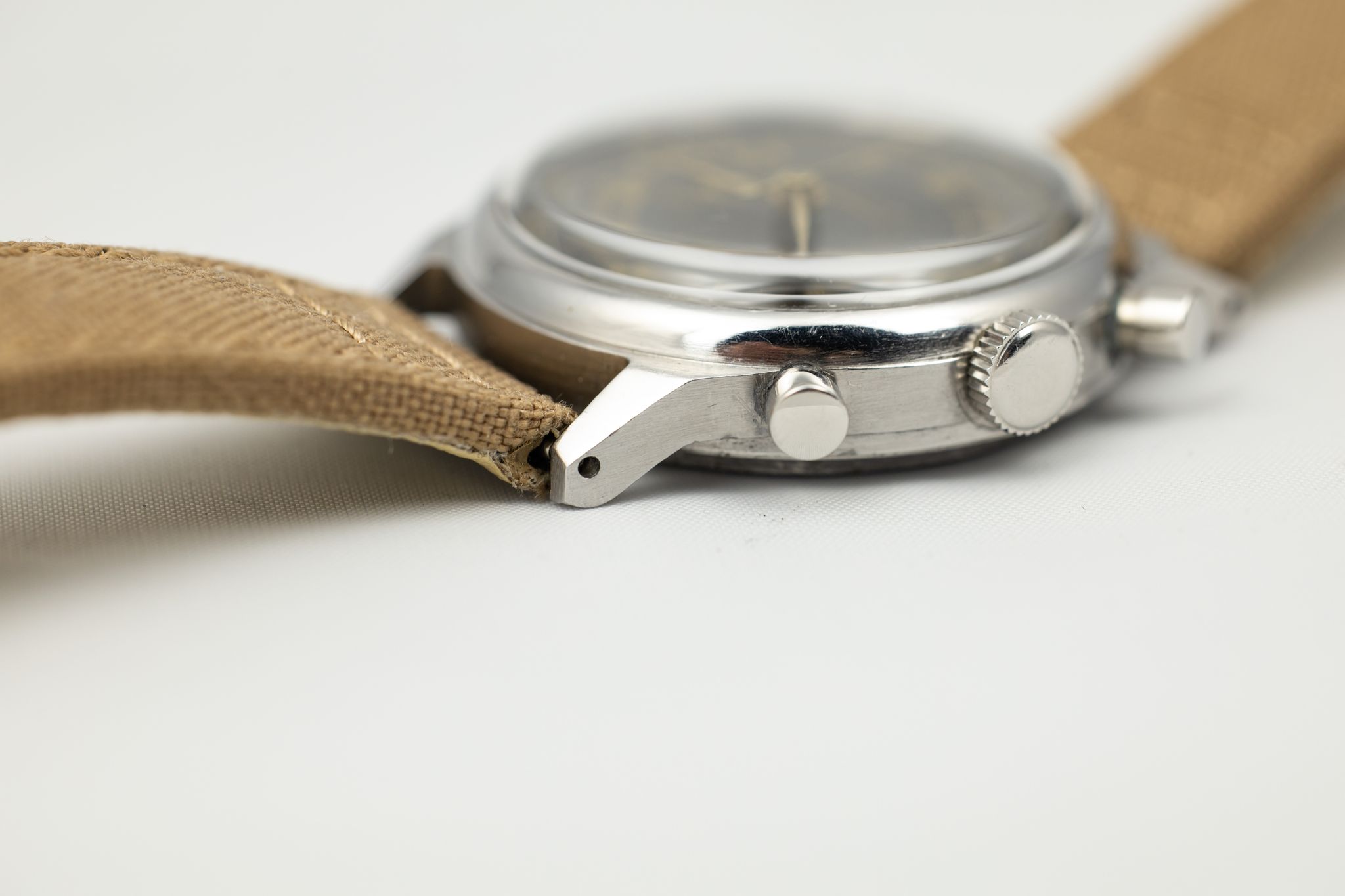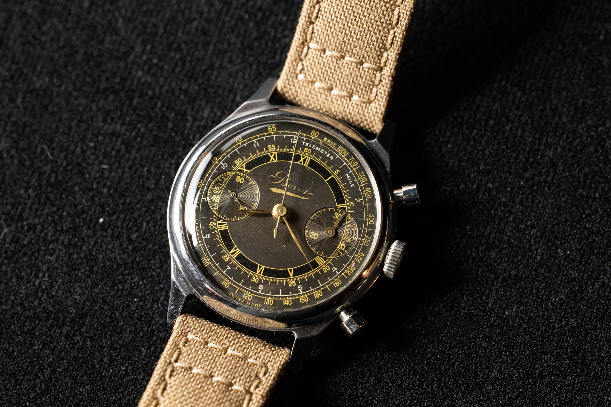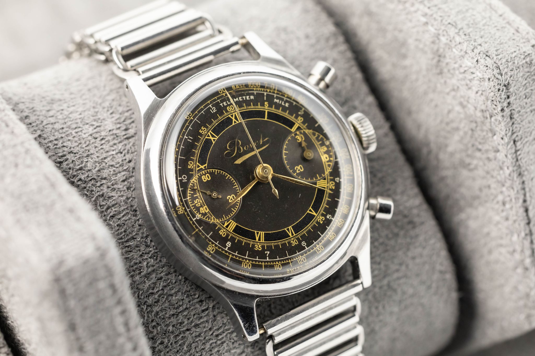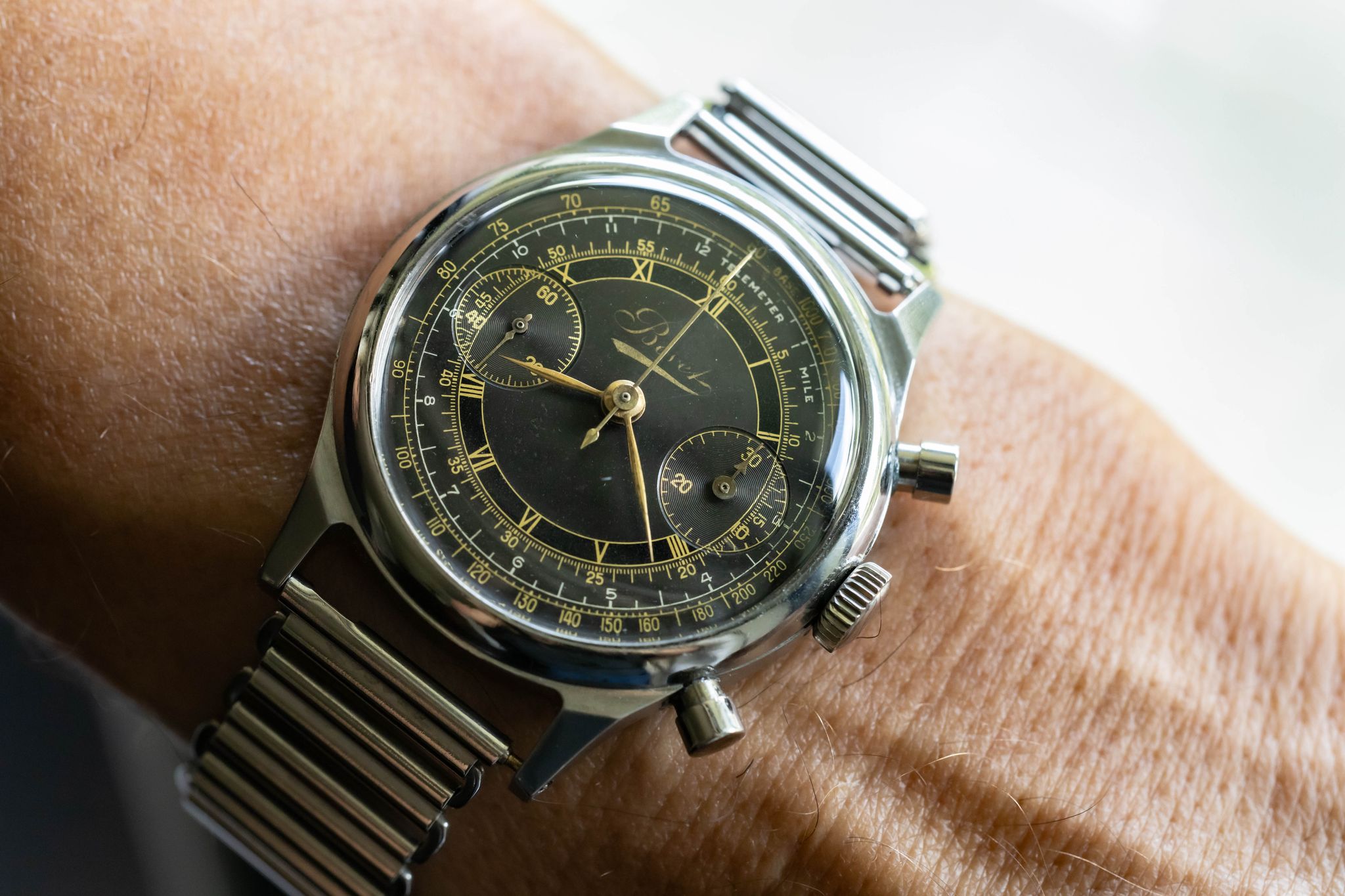 Featuring an oversized Spillman stainless steel case, powered by a manual-wind Valjoux 22 equipped with a column wheel, this 37mm watch stands out as a bicompax chronograph. It showcases aesthetic characteristics of mid-century chronographs, such as a black and chocolate colored dial with gold script and a white telemeter scale. Great vintage character and nice presence on the wrist. A beautiful piece.