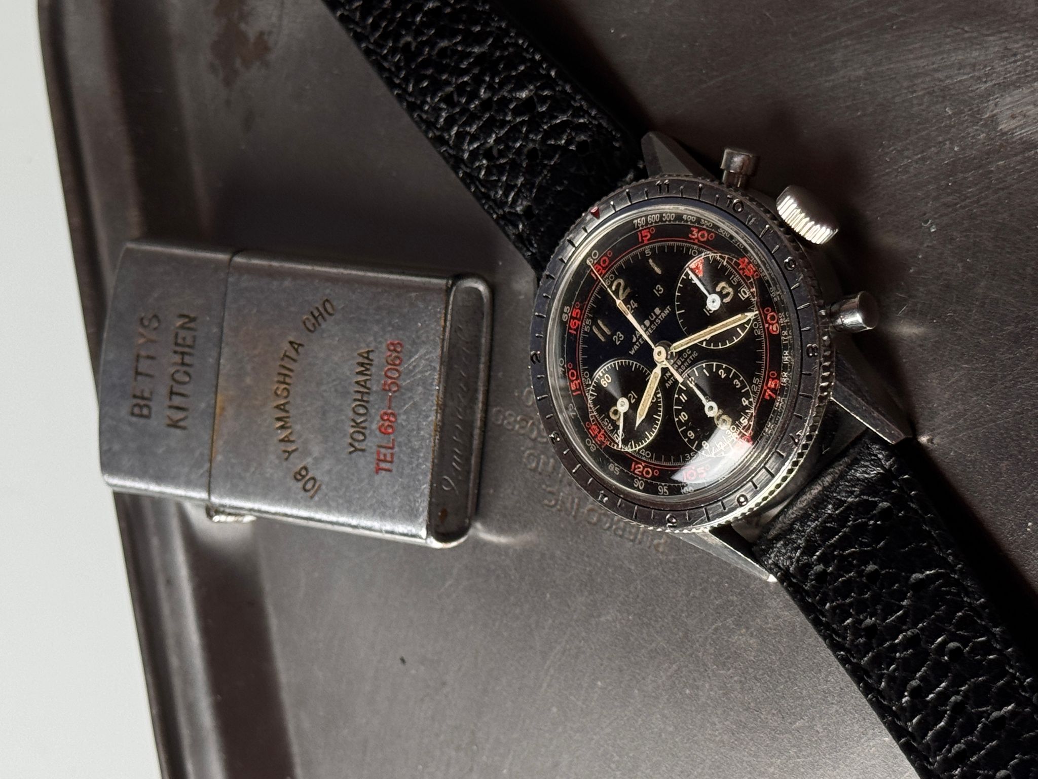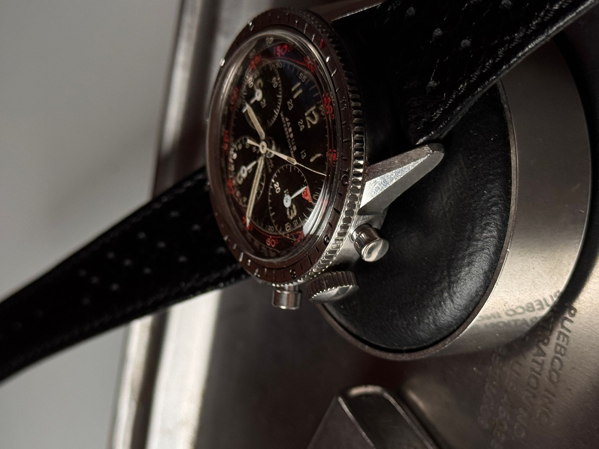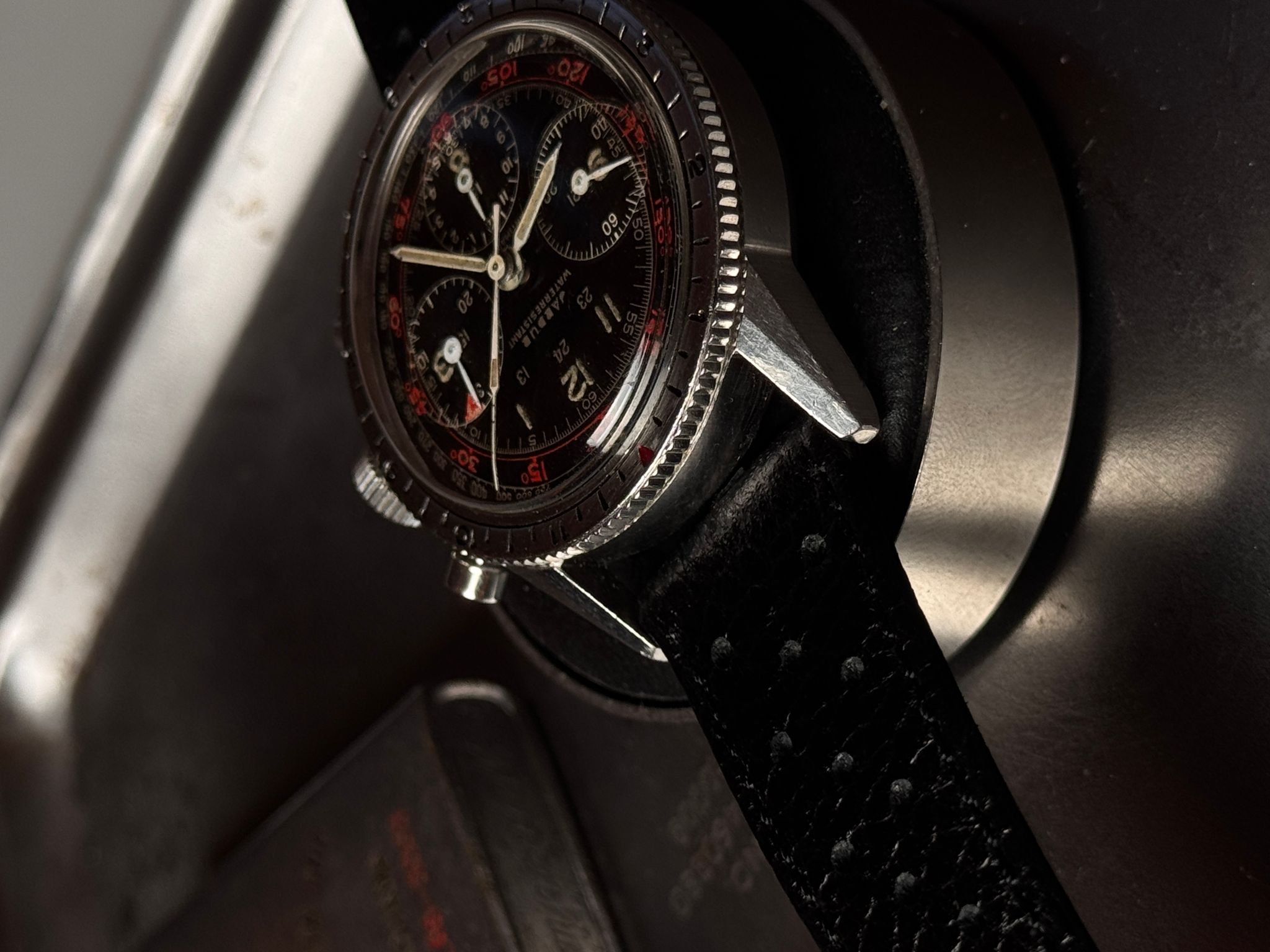 We Love this black glossy dial with the red accents. Sized at 38mm, the watch has a unique presence on the wrist. Keep in mind that this Jardur has more than 80 years. Now look at theses faceted lugs, sharp and unpolished like the rest of the watch. The design is one of a kind, a very eclectic chronograph for all aesthete collectors