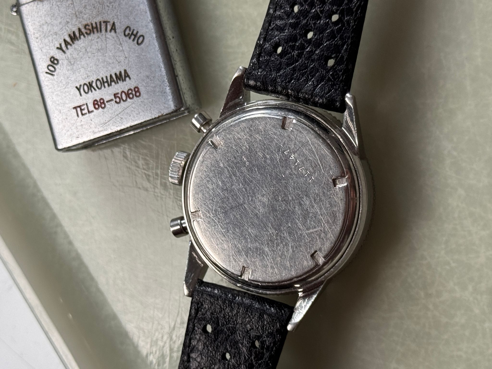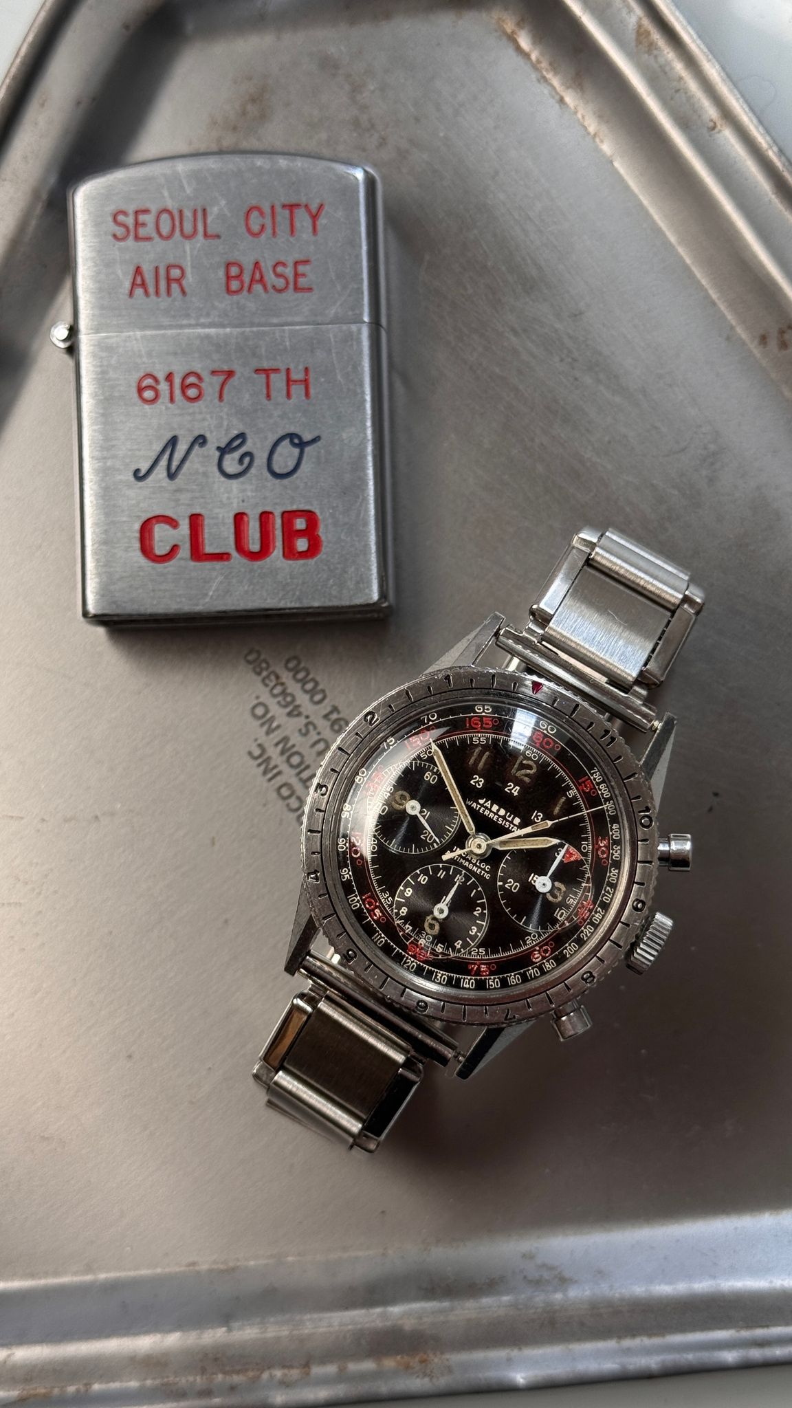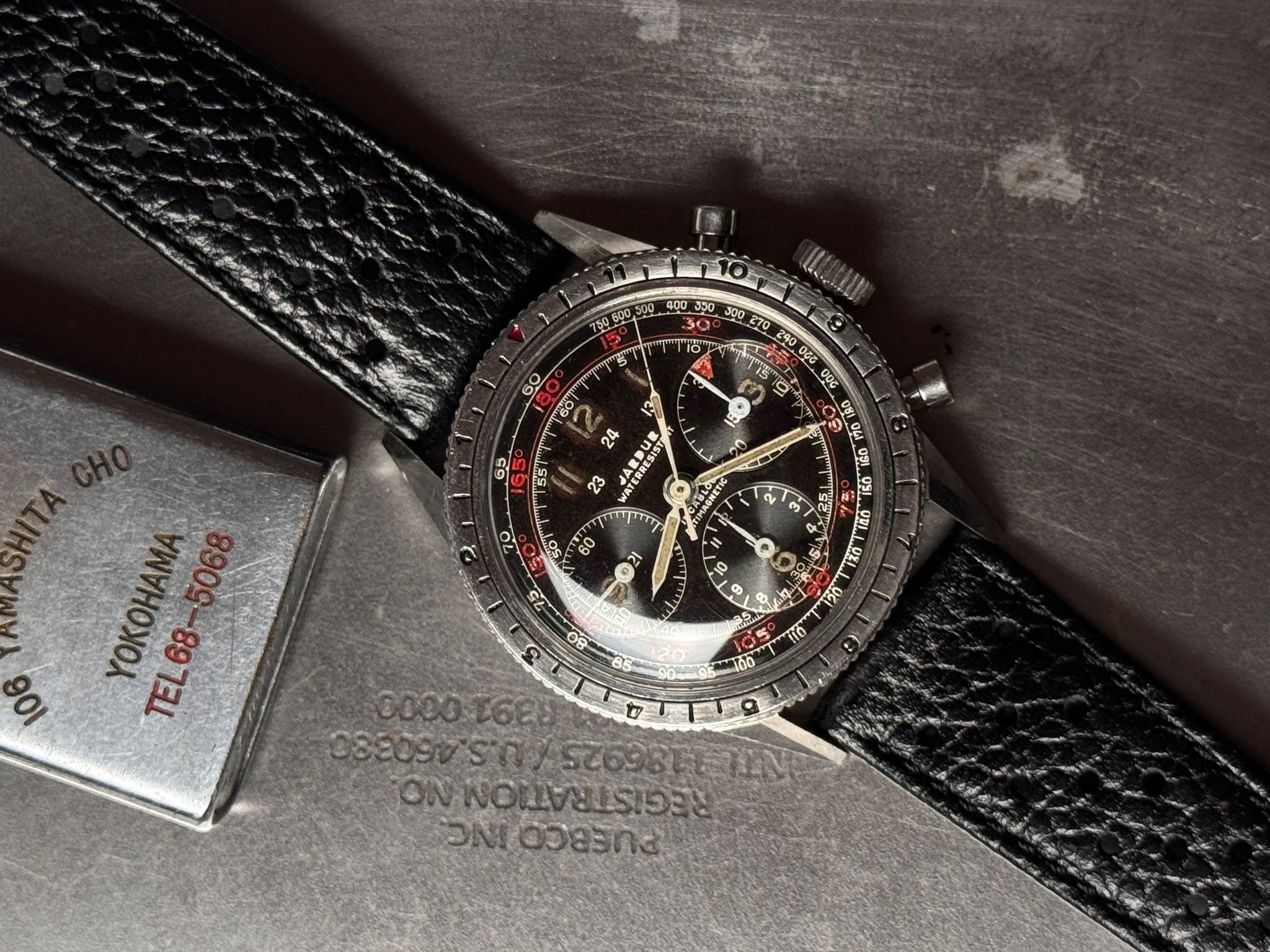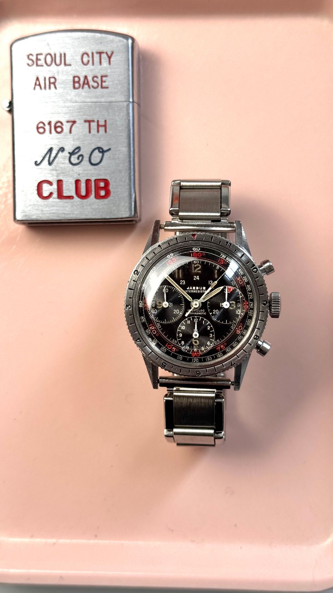 We Love this black glossy dial with the red accents. Sized at 38mm, the watch has a unique presence on the wrist. Keep in mind that this Jardur has more than 80 years. Now look at theses faceted lugs, sharp and unpolished like the rest of the watch. The design is one of a kind, a very eclectic chronograph for all aesthete collectors