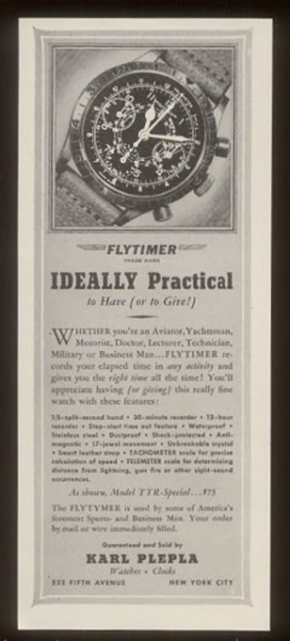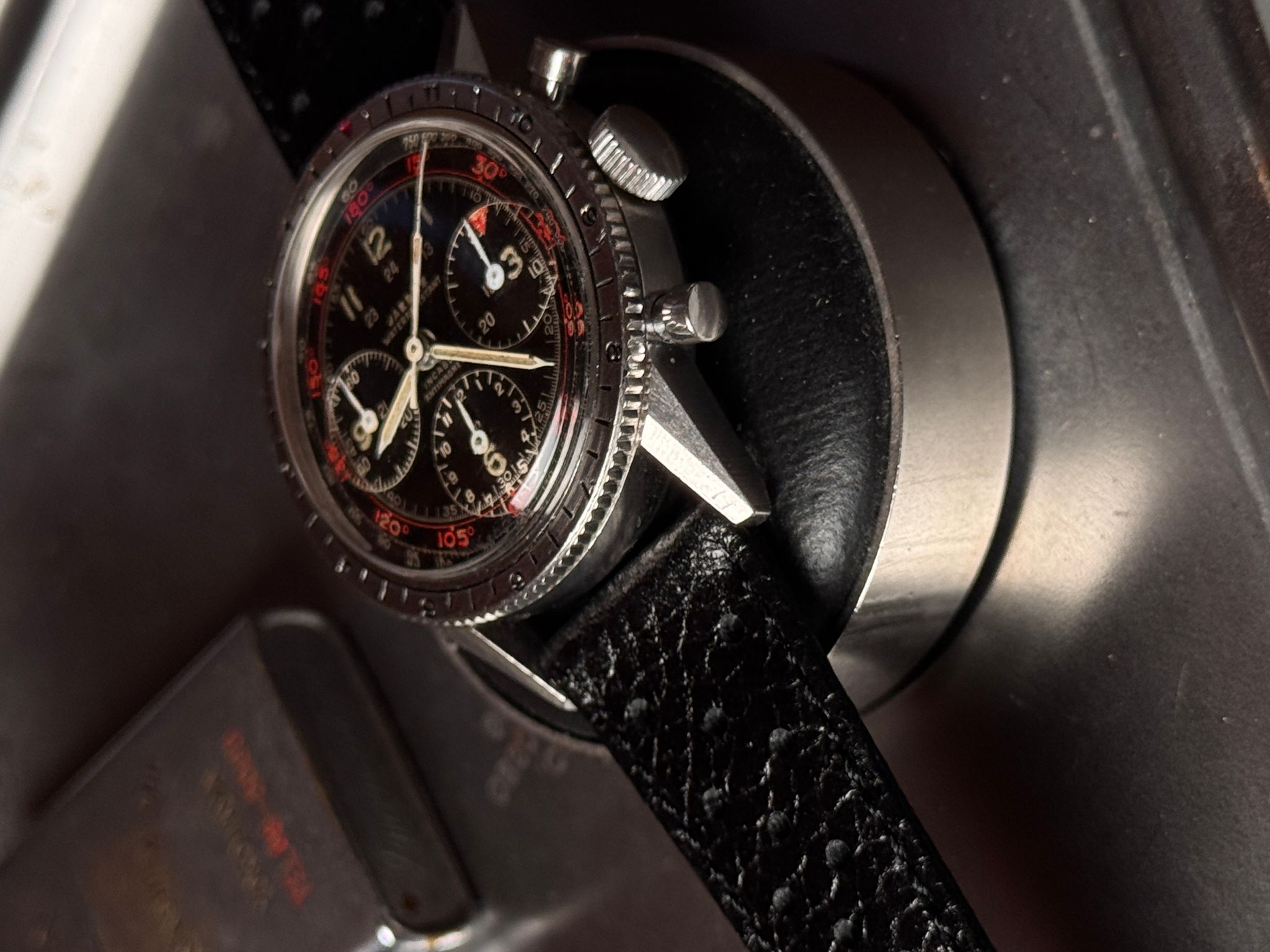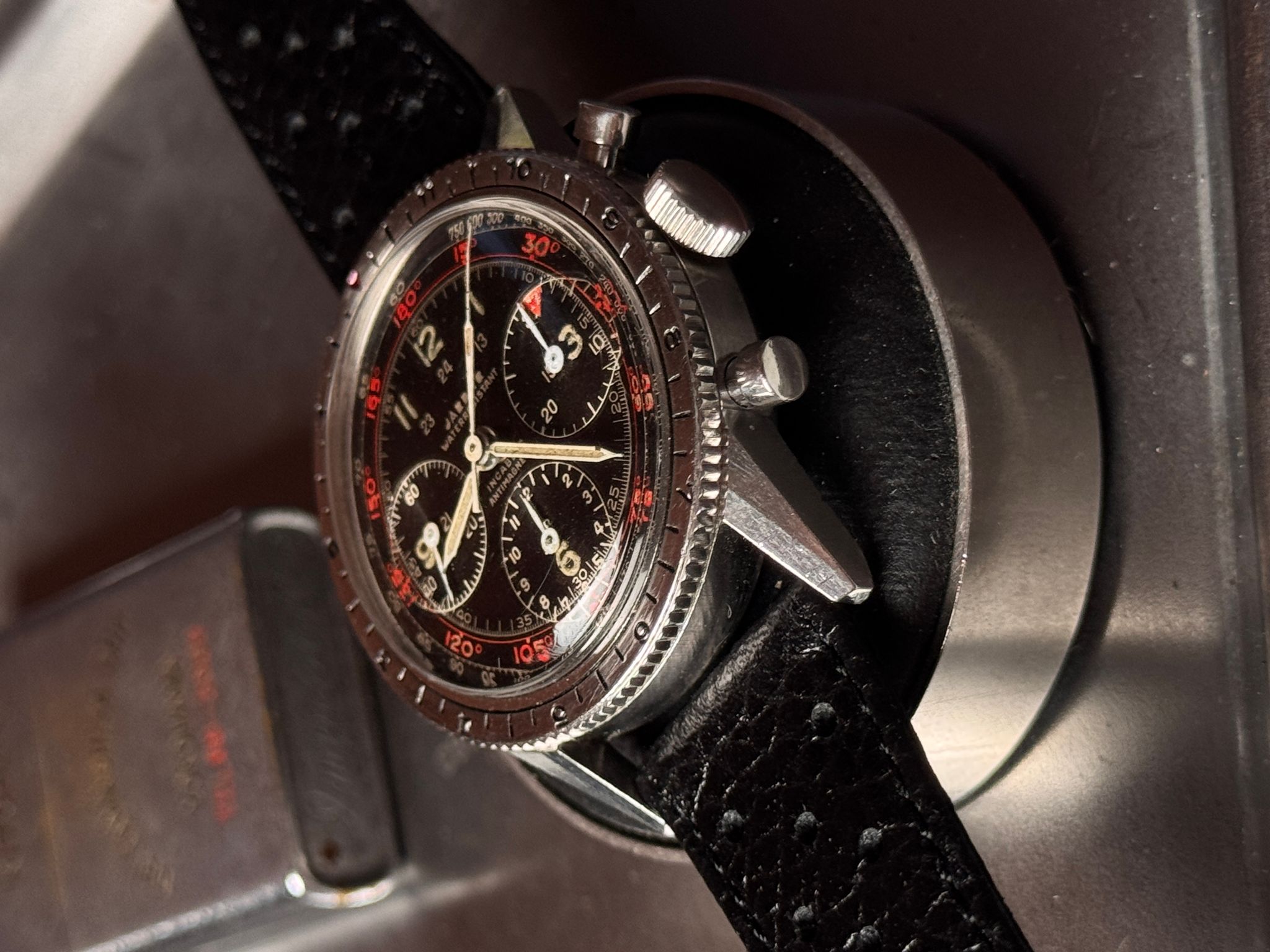 Here is a 1940’s pilote watch with a unique degrees scale on the dial. It’s allows the pilot to calculate the duration to achieve a certain degrees turn at a constant degree angle. At 3° per second, the pilot would reach 90° right after the central chronograph hand passed the 30-second mark.