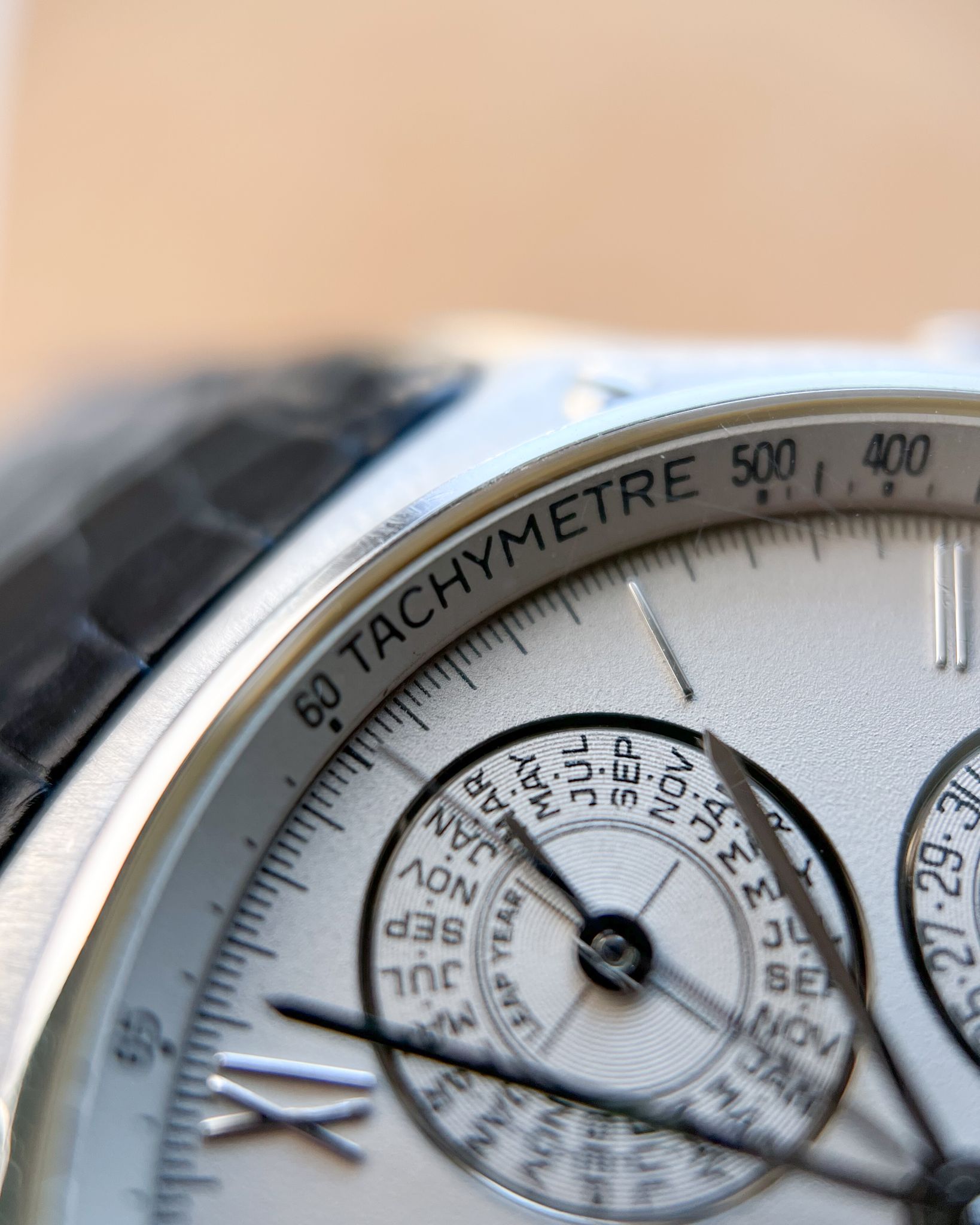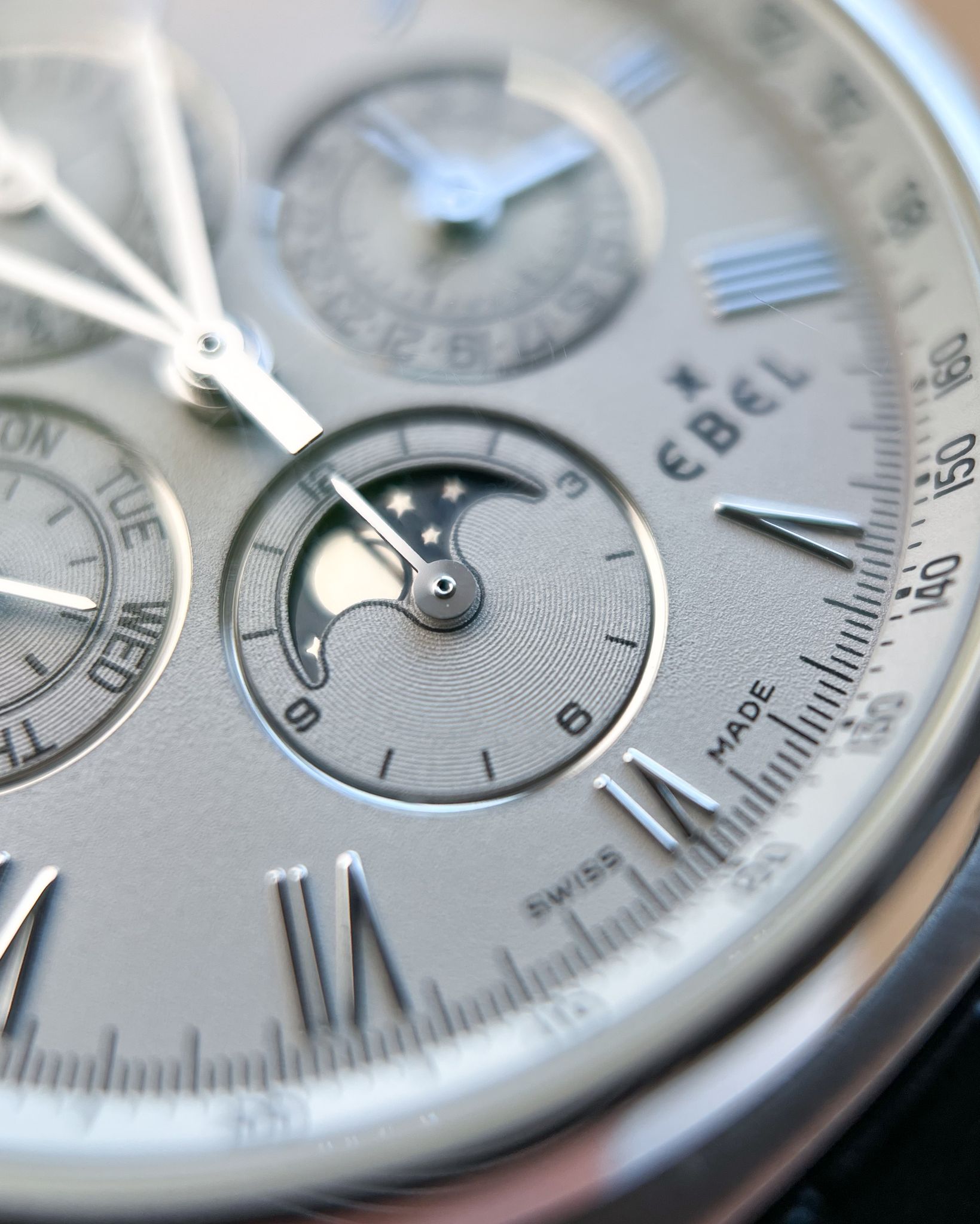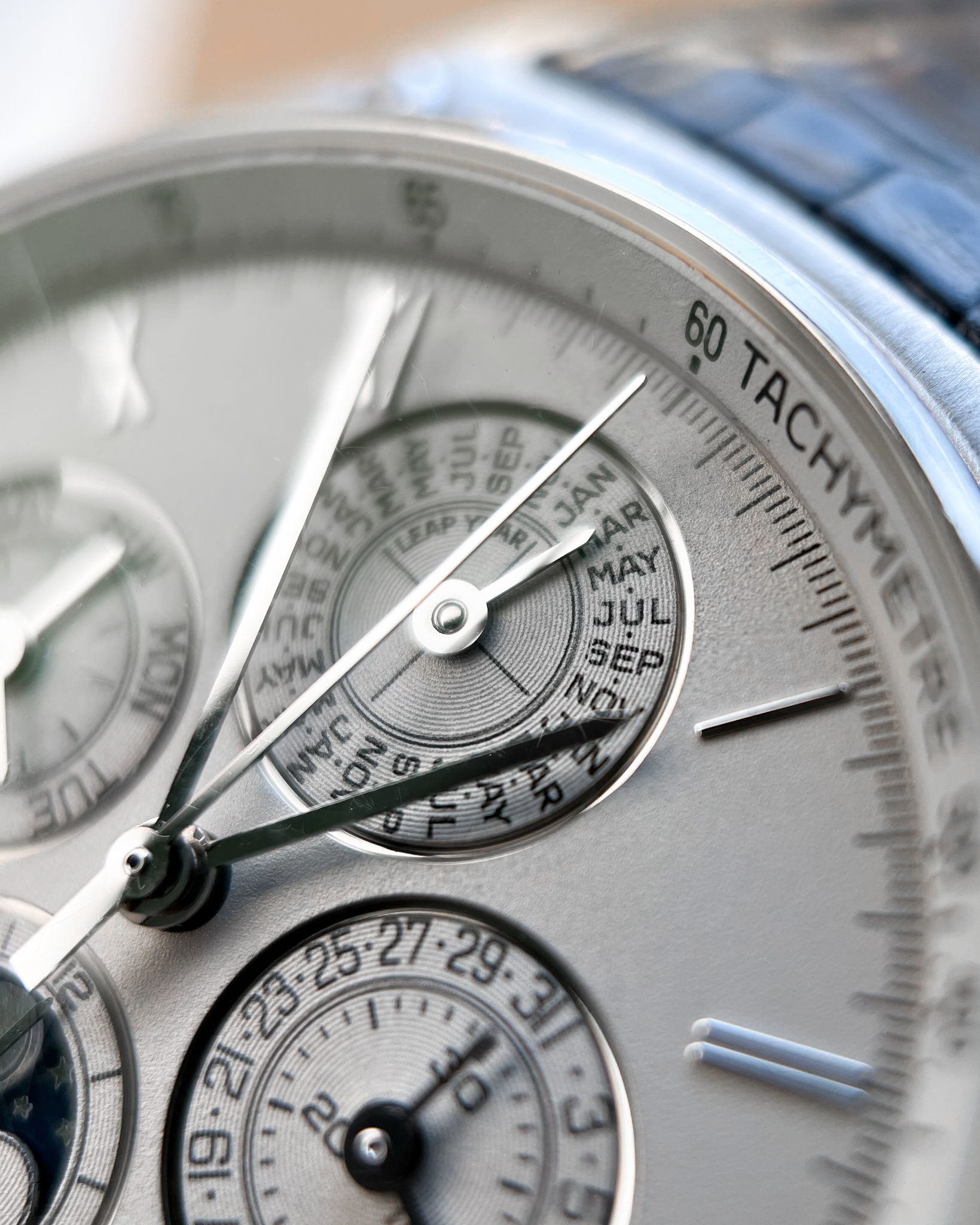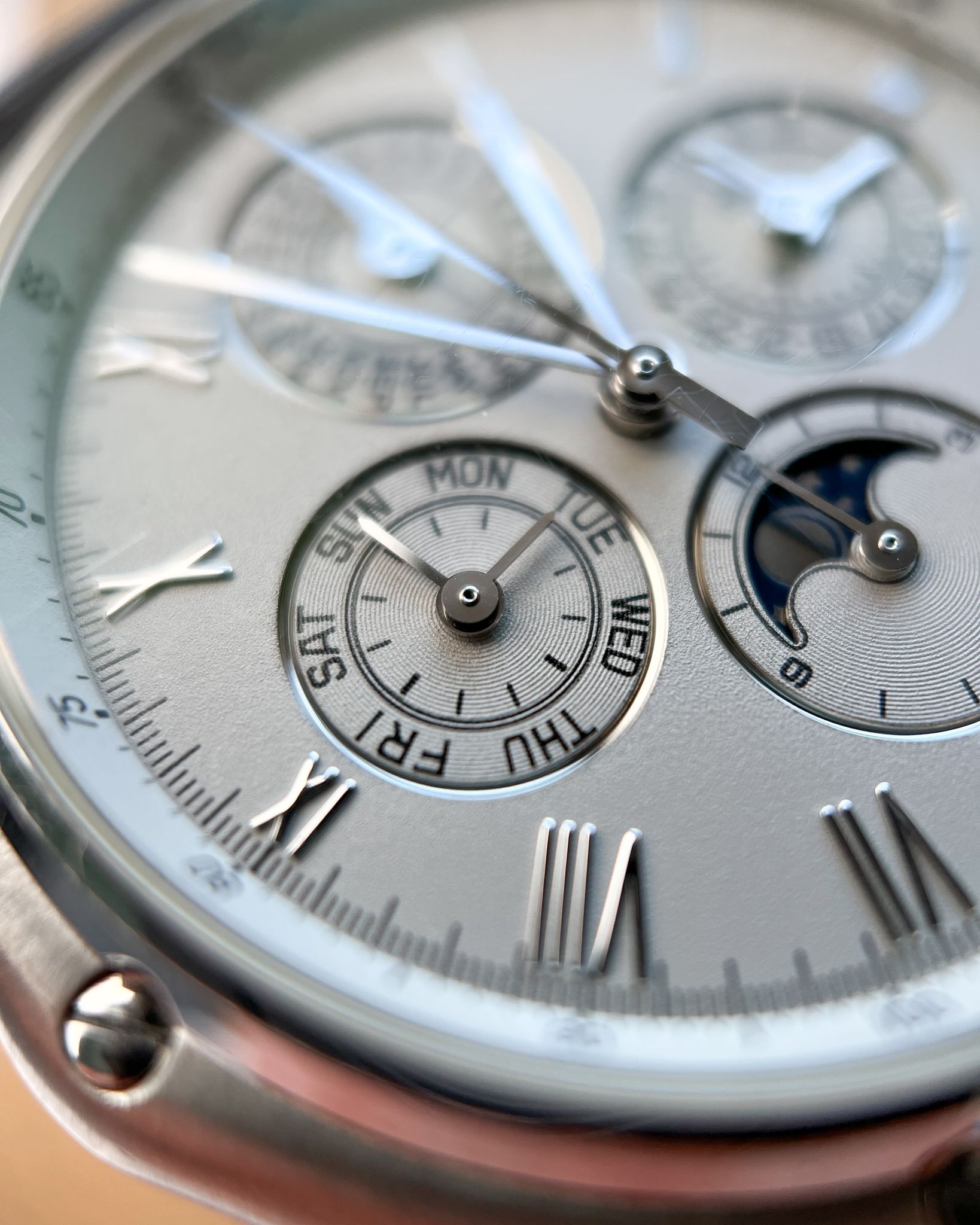 The dial features two different finishes, light texture for the main part and concentric circles for the sub dials. The color is hard to explain and capture in camera but it’s a silverly light grey to my eye. The non lume dial is complimented but the original non lume handset with the chronograph and perpetual calendar functions working perfectly.