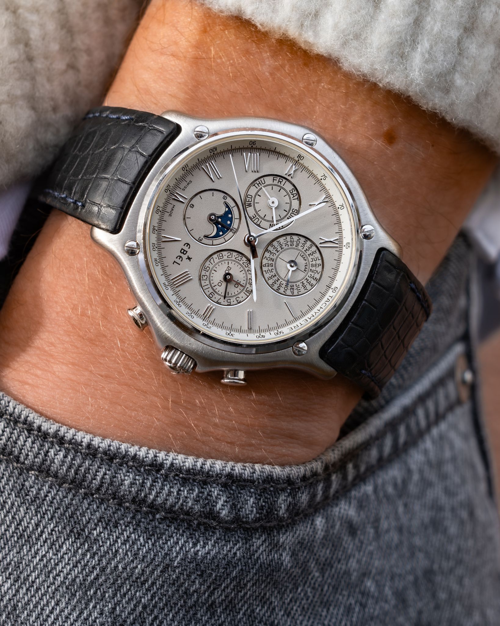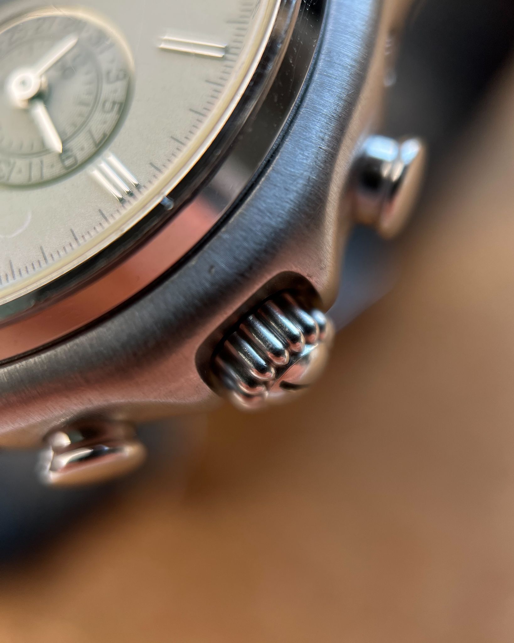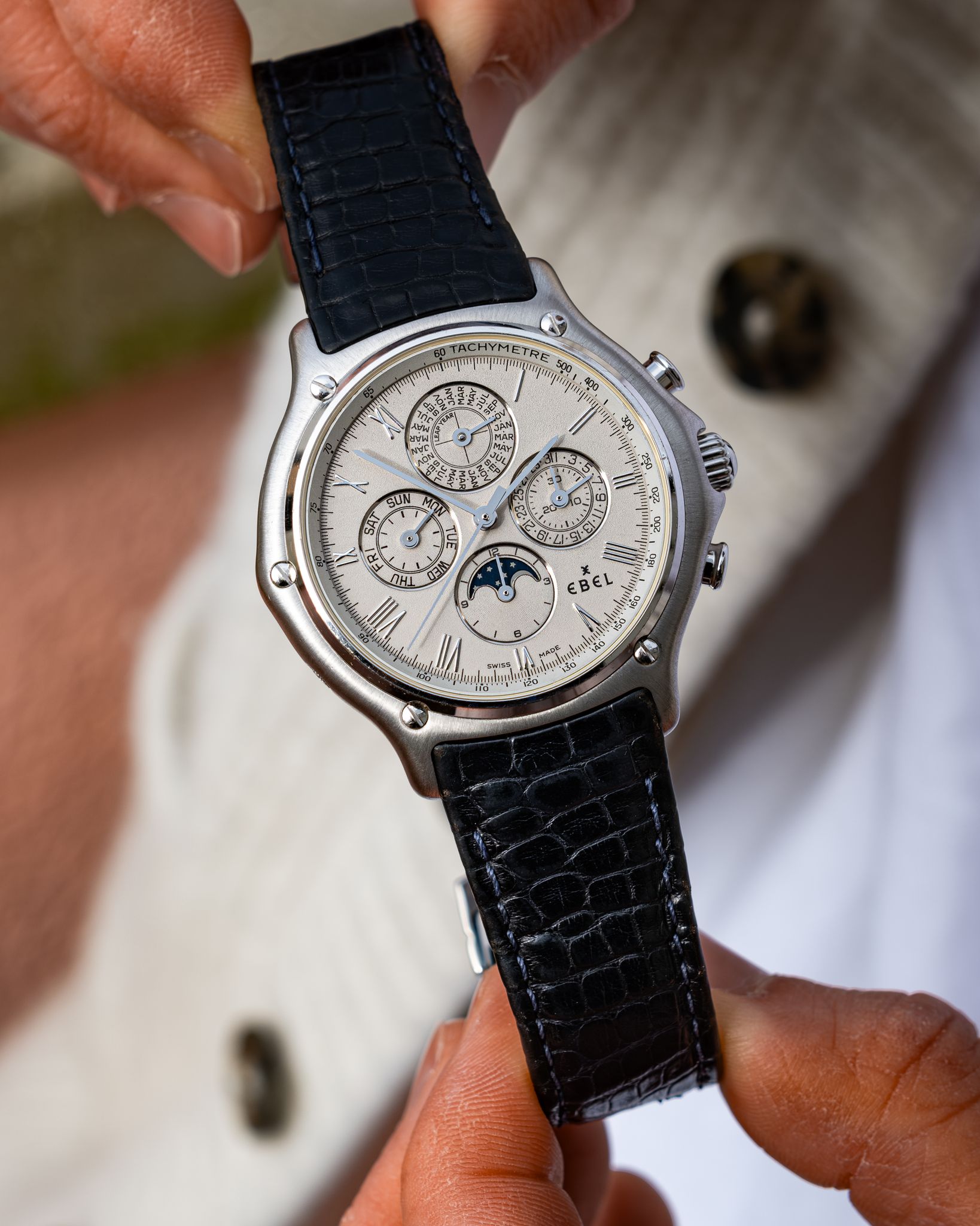 What I love — A rarely seen model, quoted by Ebel brochures to have been ‘on request’ only, is this gorgeous Perpetual Calendar Chronograph powered by the El Primero caliber + in-house perpetual module. Packing a serious punch for the price tag, the white gold variant is hard to come by and I’m delighted to have one for sale.