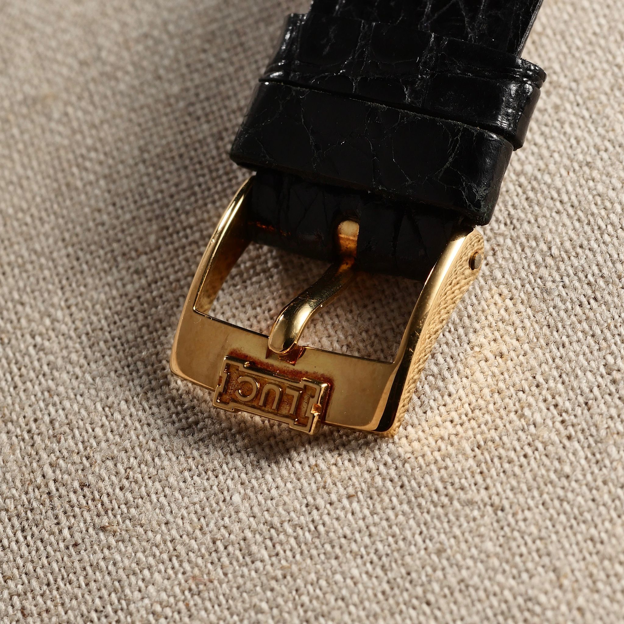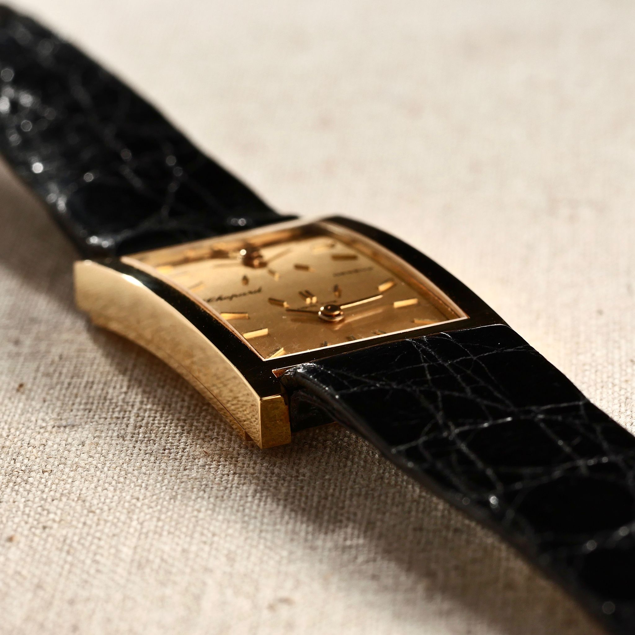 FEATURES: 18k Yellow Gold, Original Chopard Strap, Original Chopard Buckle, 2 Champagne Dials, Rare Jumbo Size, 1980s