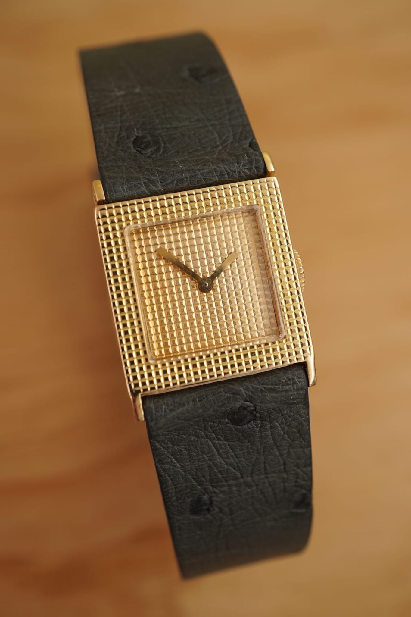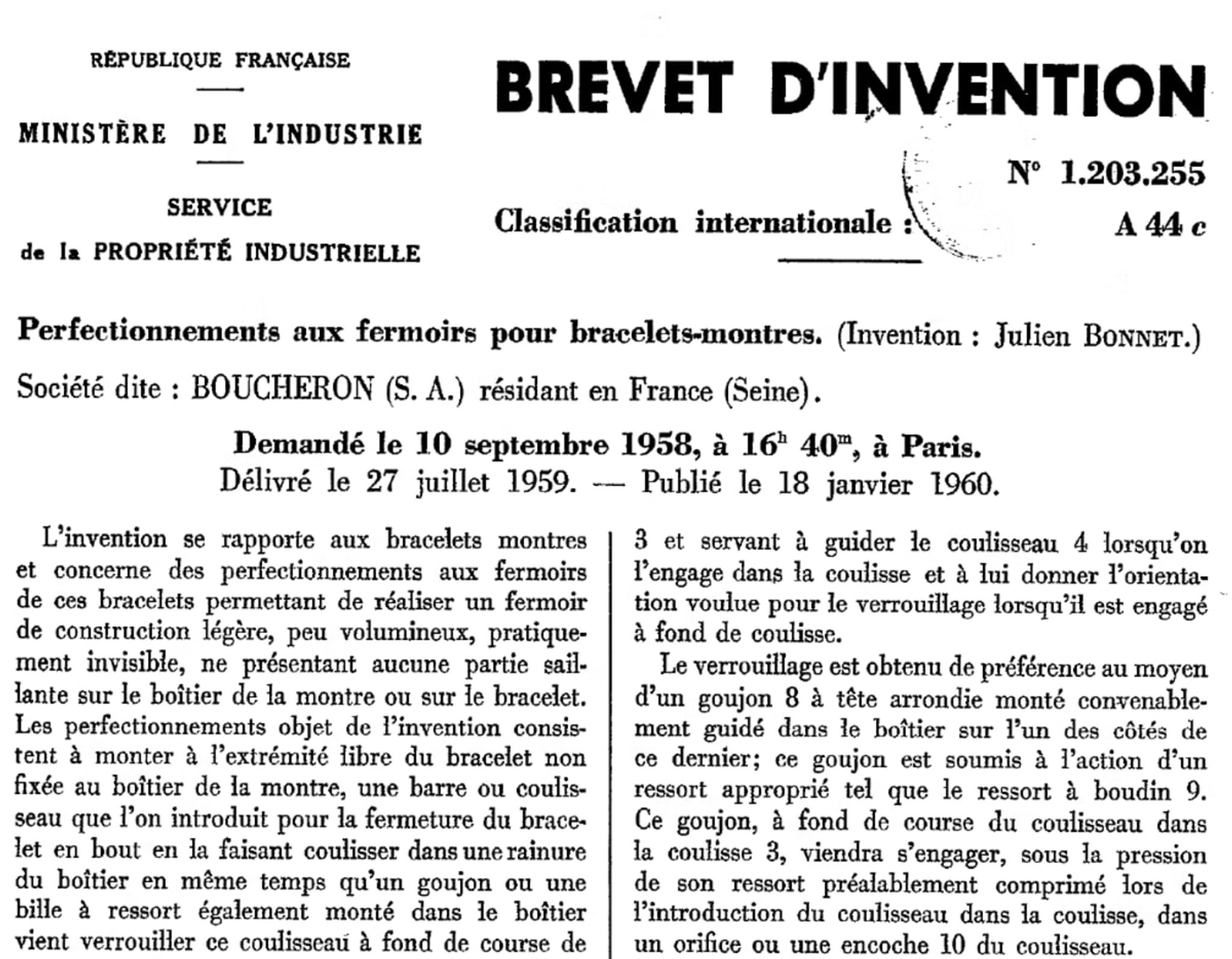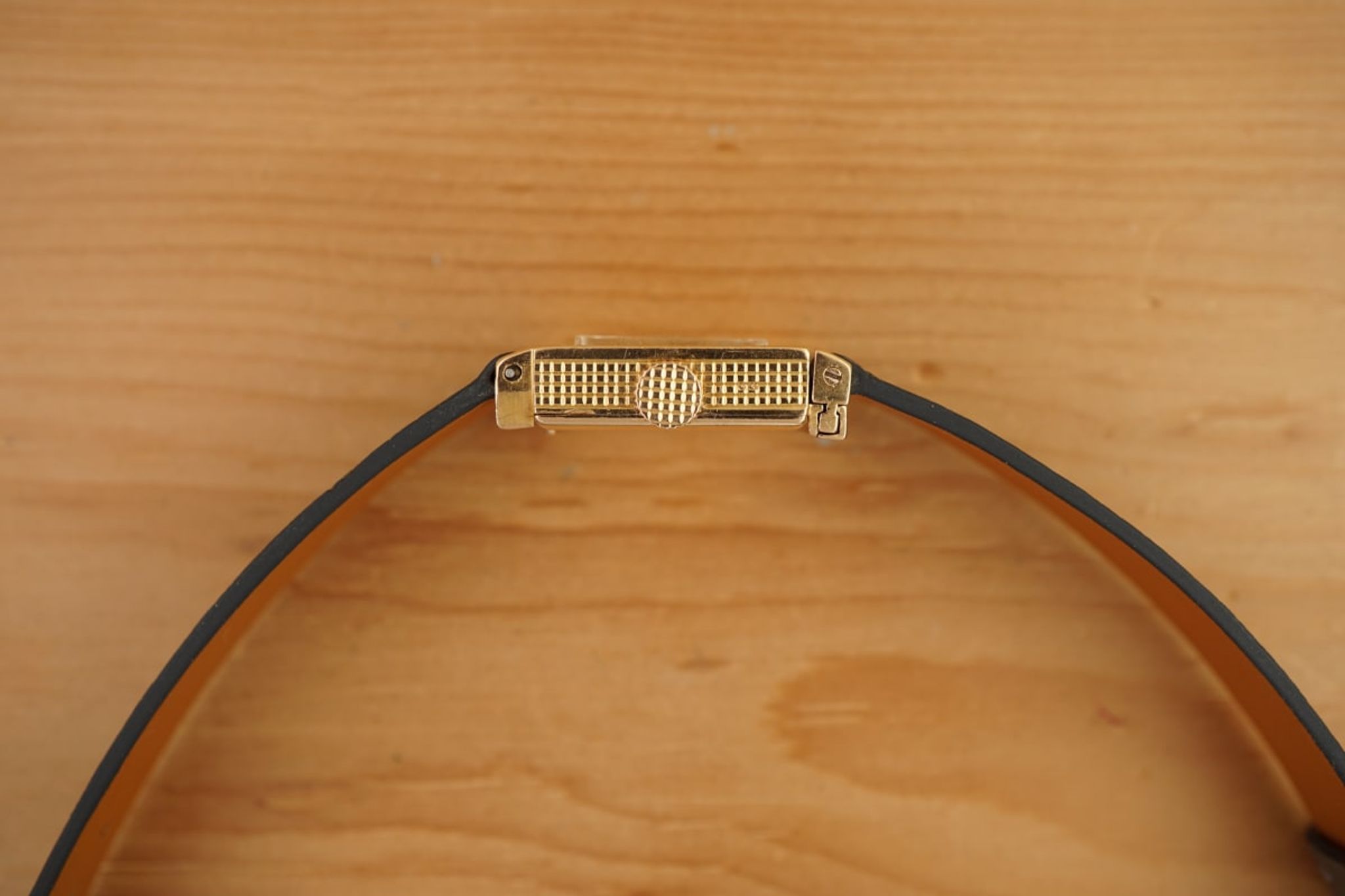The Boucheron Reflet: No clasp in the classic sense but a closing-mechanism on the 18K-gold case and a single-piece leather-strap. This innovation is unique to Boucheron and was patented by the French jewellery-pioneer with their patent BT1203255 (engraved on the caseback, see document) in 1958 -- probably the year this watch was made.