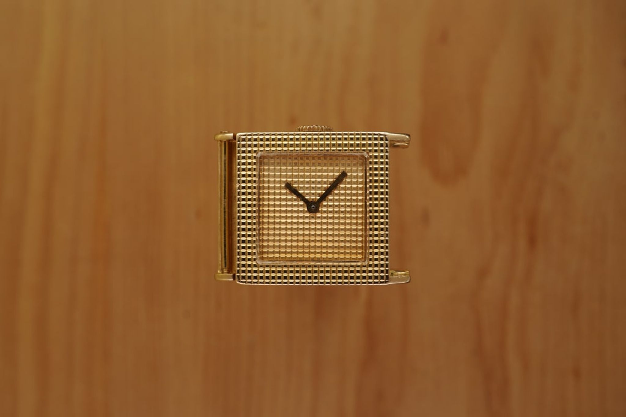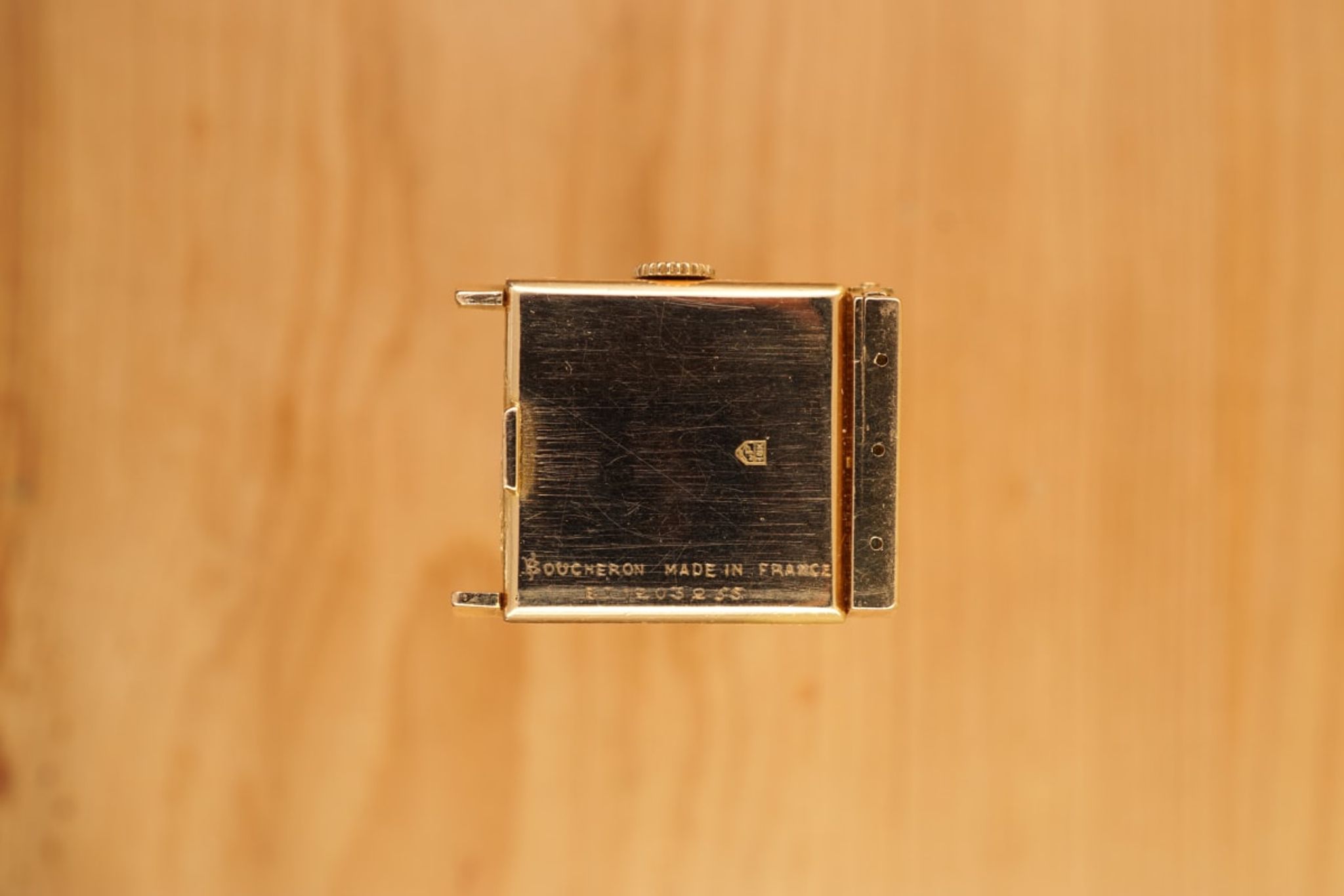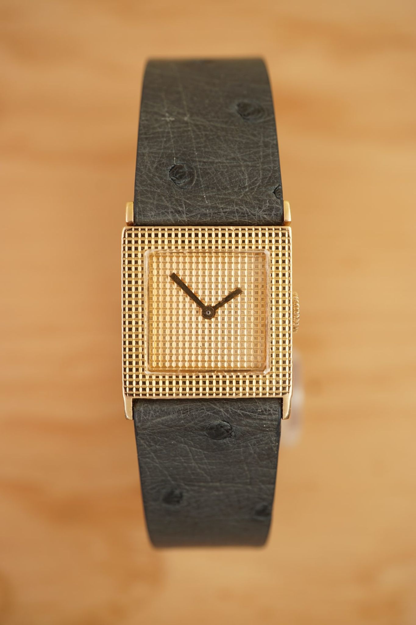 The Boucheron Reflet: No clasp in the classic sense but a closing-mechanism on the 18K-gold case and a single-piece leather-strap. This innovation is unique to Boucheron and was patented by the French jewellery-pioneer with their patent BT1203255 (engraved on the caseback, see document) in 1958 -- probably the year this watch was made.