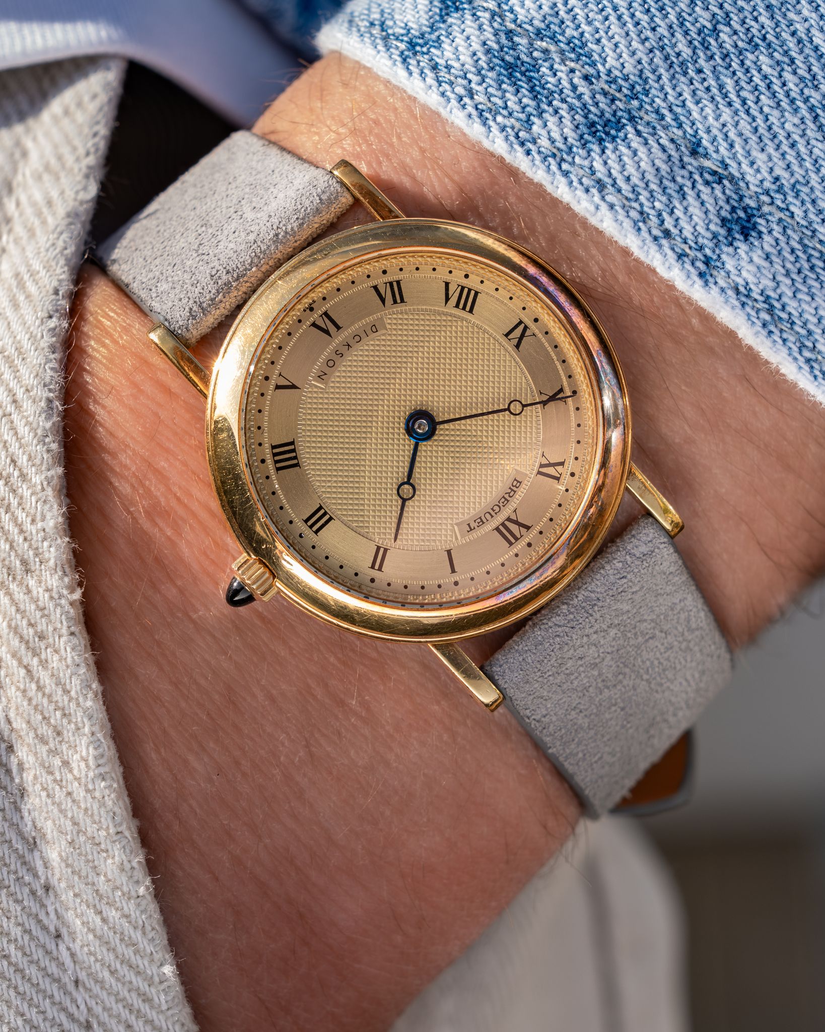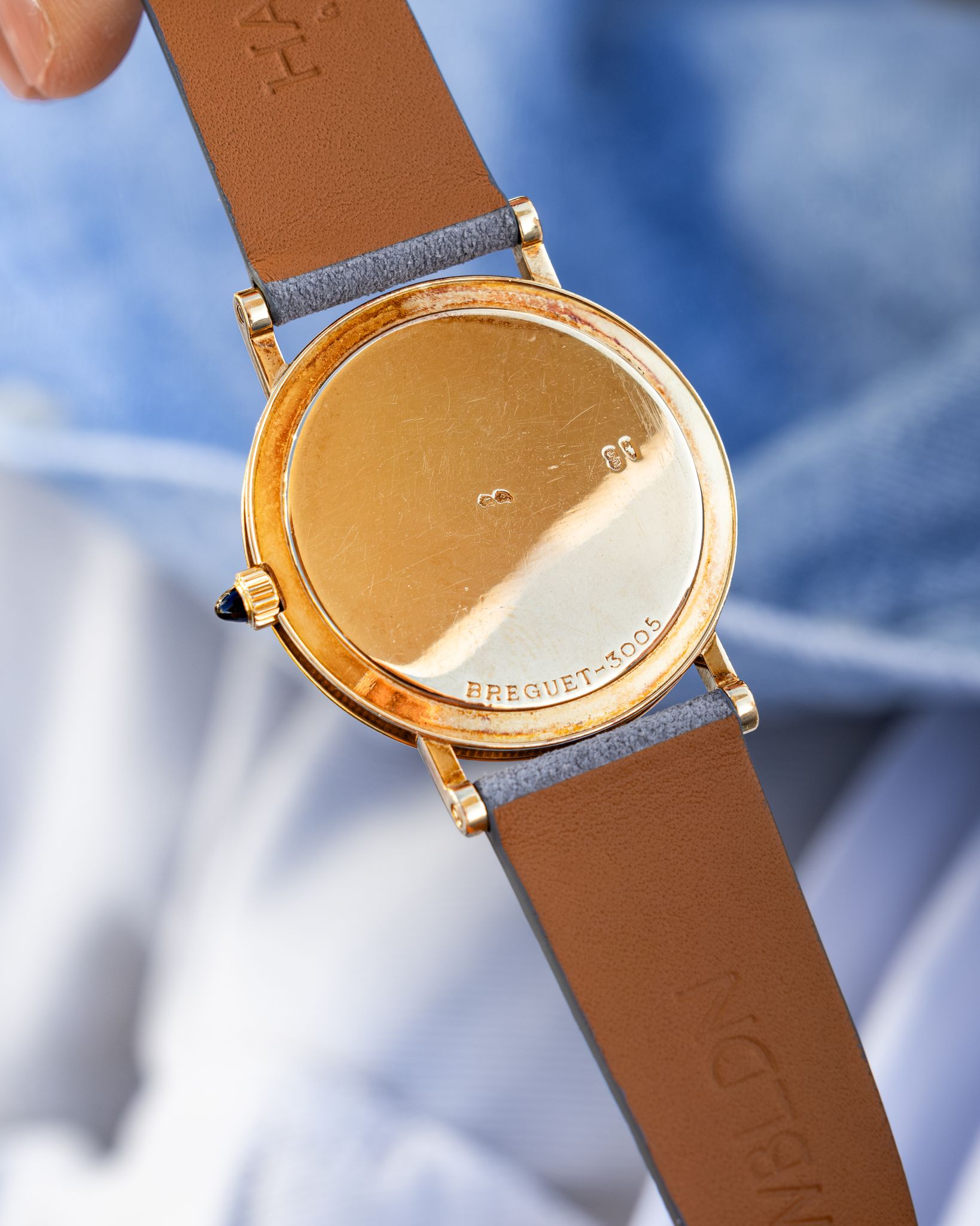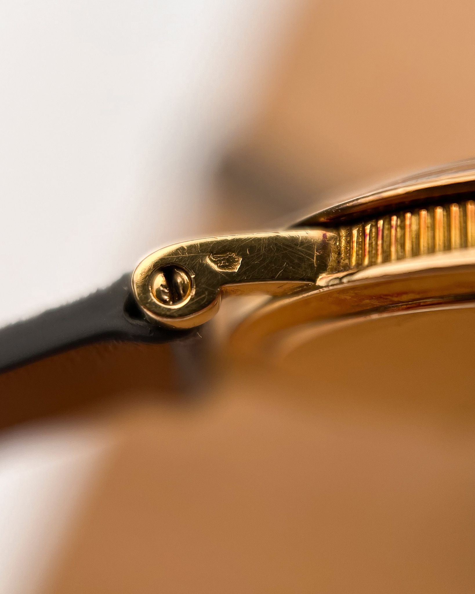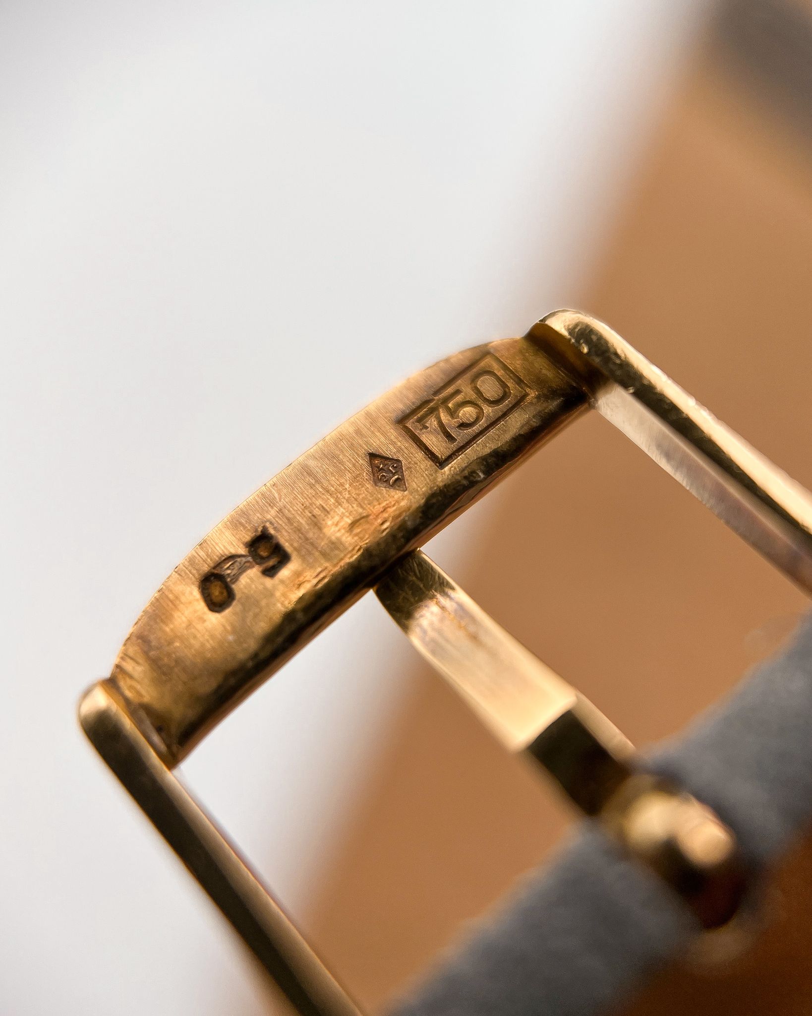 What I love — Gold on gold 80’s rarity with a sprinkling of double-signed delight and rosey patina! This gorgeous watch is covered in French hallmarks and features the smooth case back with hand engraved serial. Overall fantastic vintage condition coming with original buckle and classic Breguet charm, find me another …