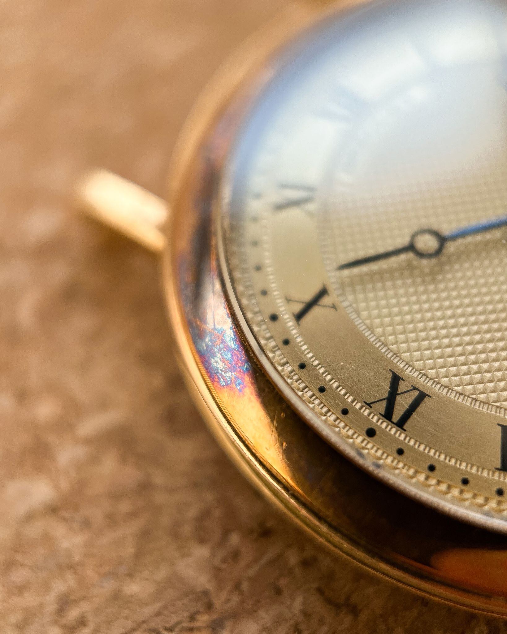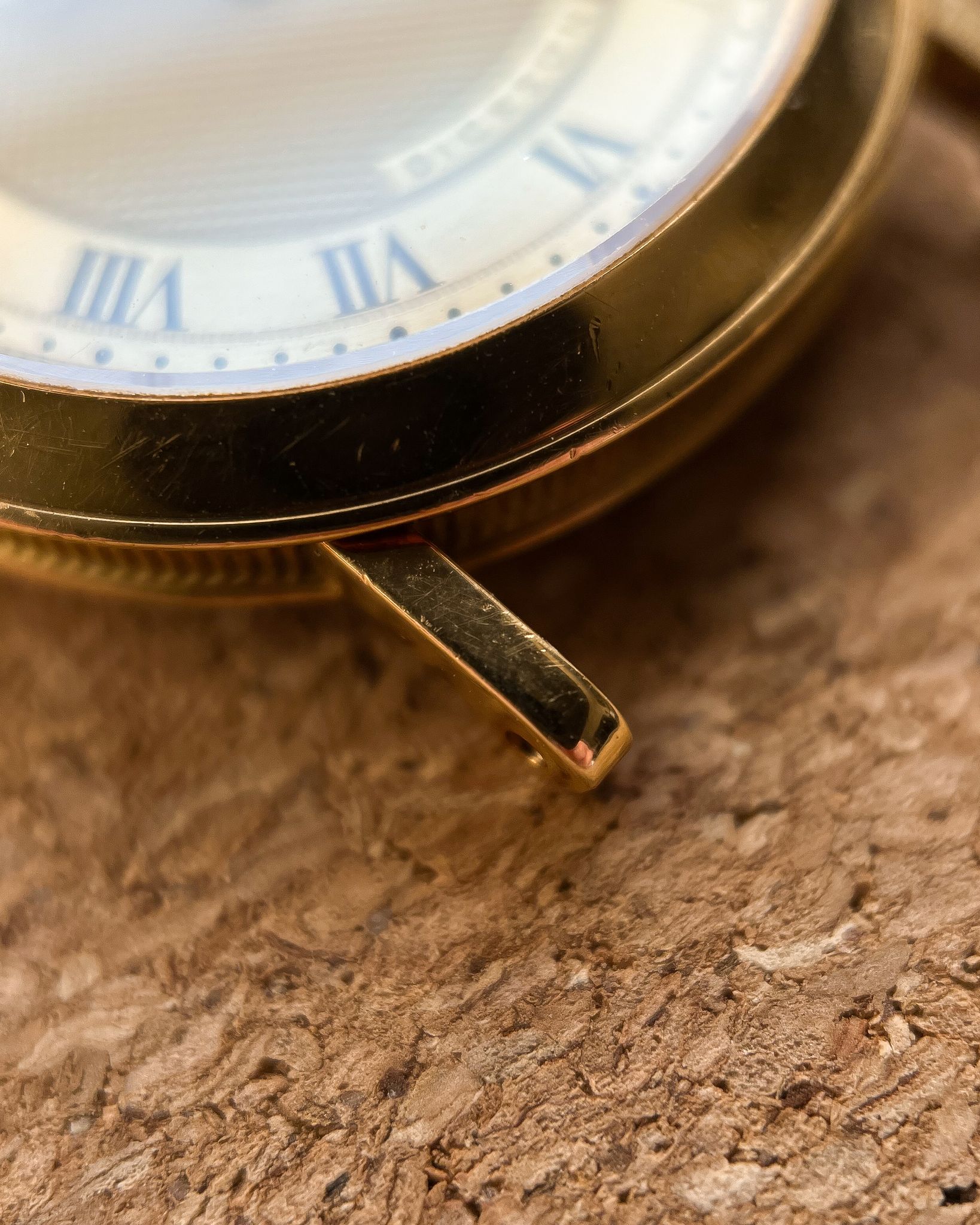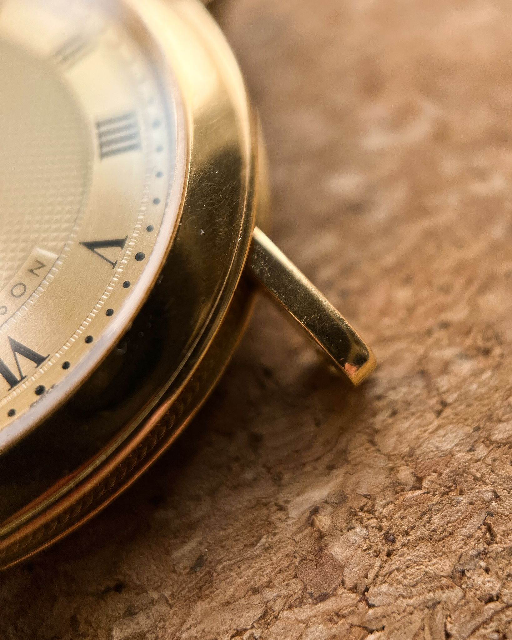 What I love — Gold on gold 80’s rarity with a sprinkling of double-signed delight and rosey patina! This gorgeous watch is covered in French hallmarks and features the smooth case back with hand engraved serial. Overall fantastic vintage condition coming with original buckle and classic Breguet charm, find me another …