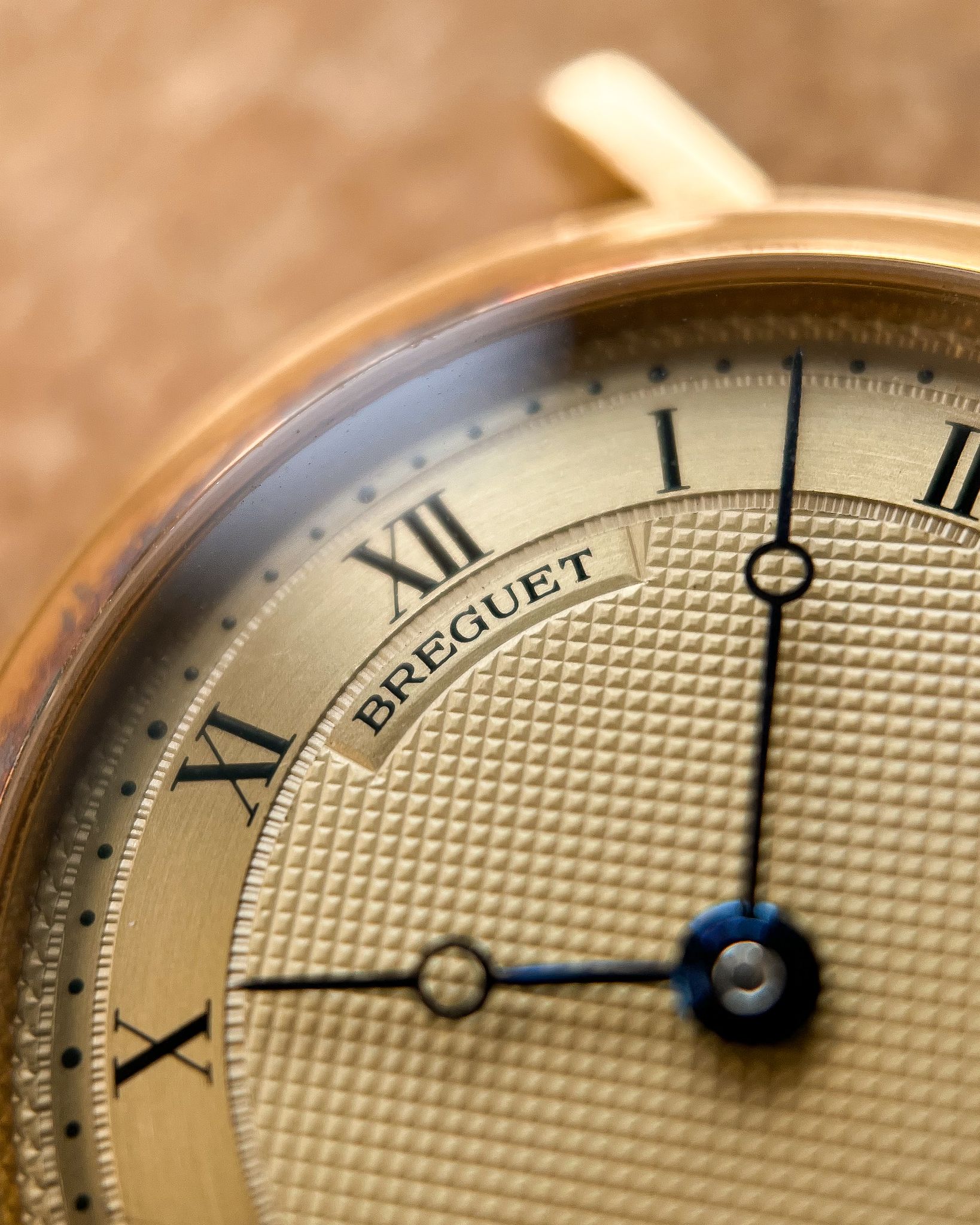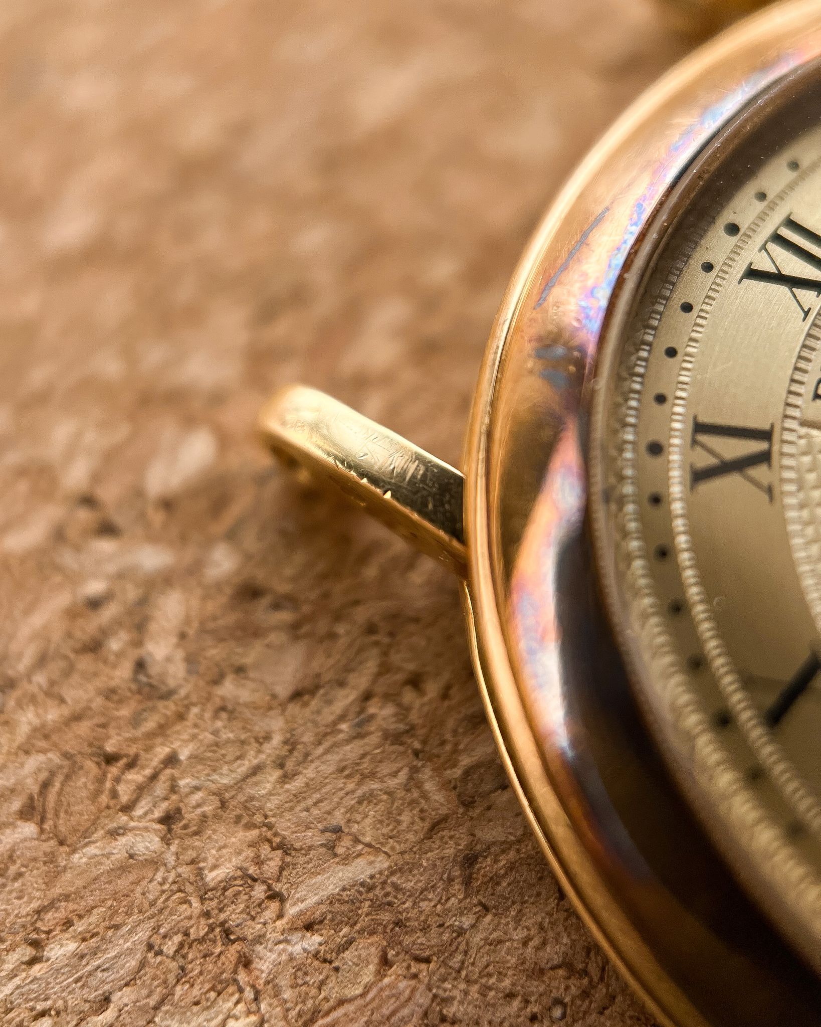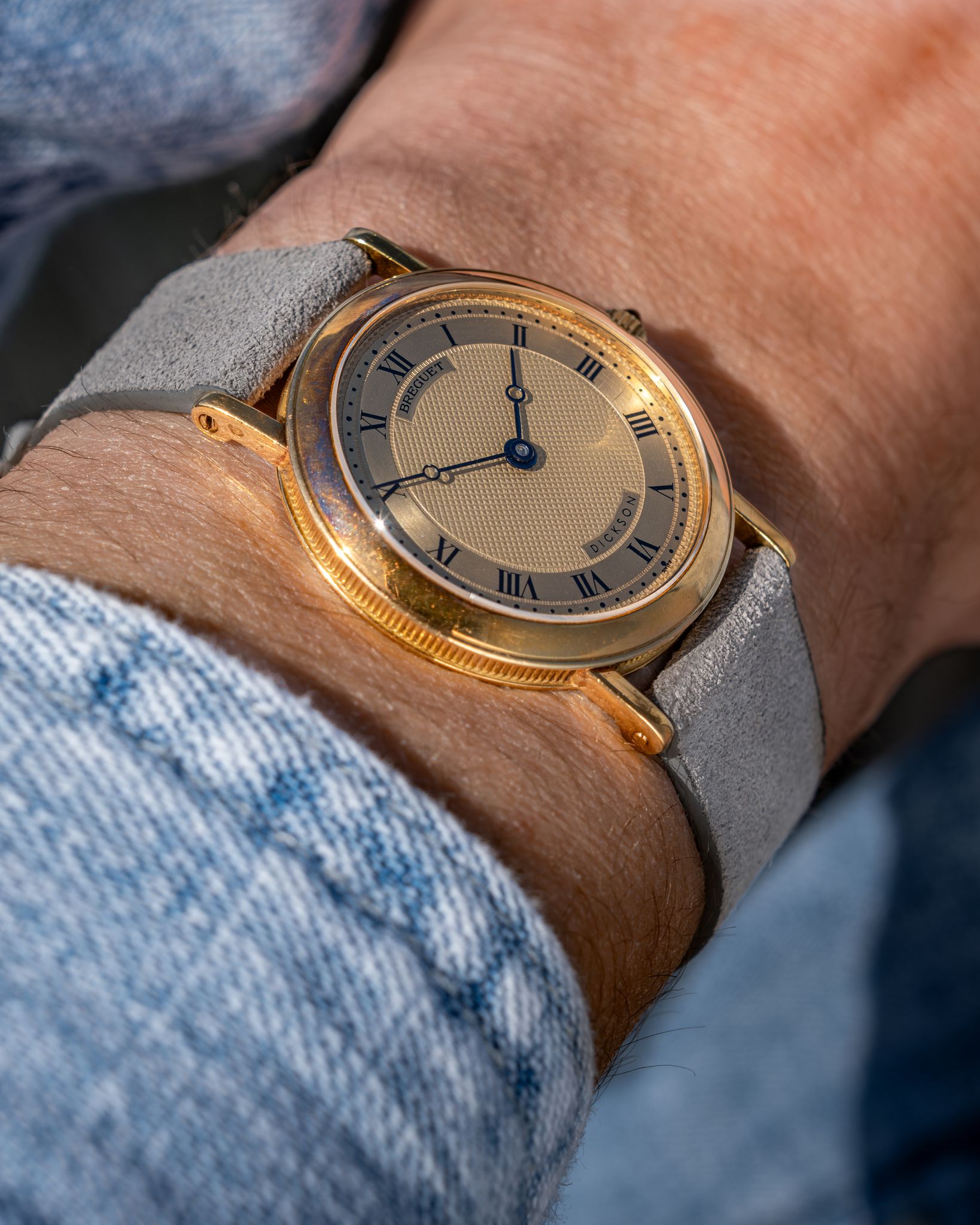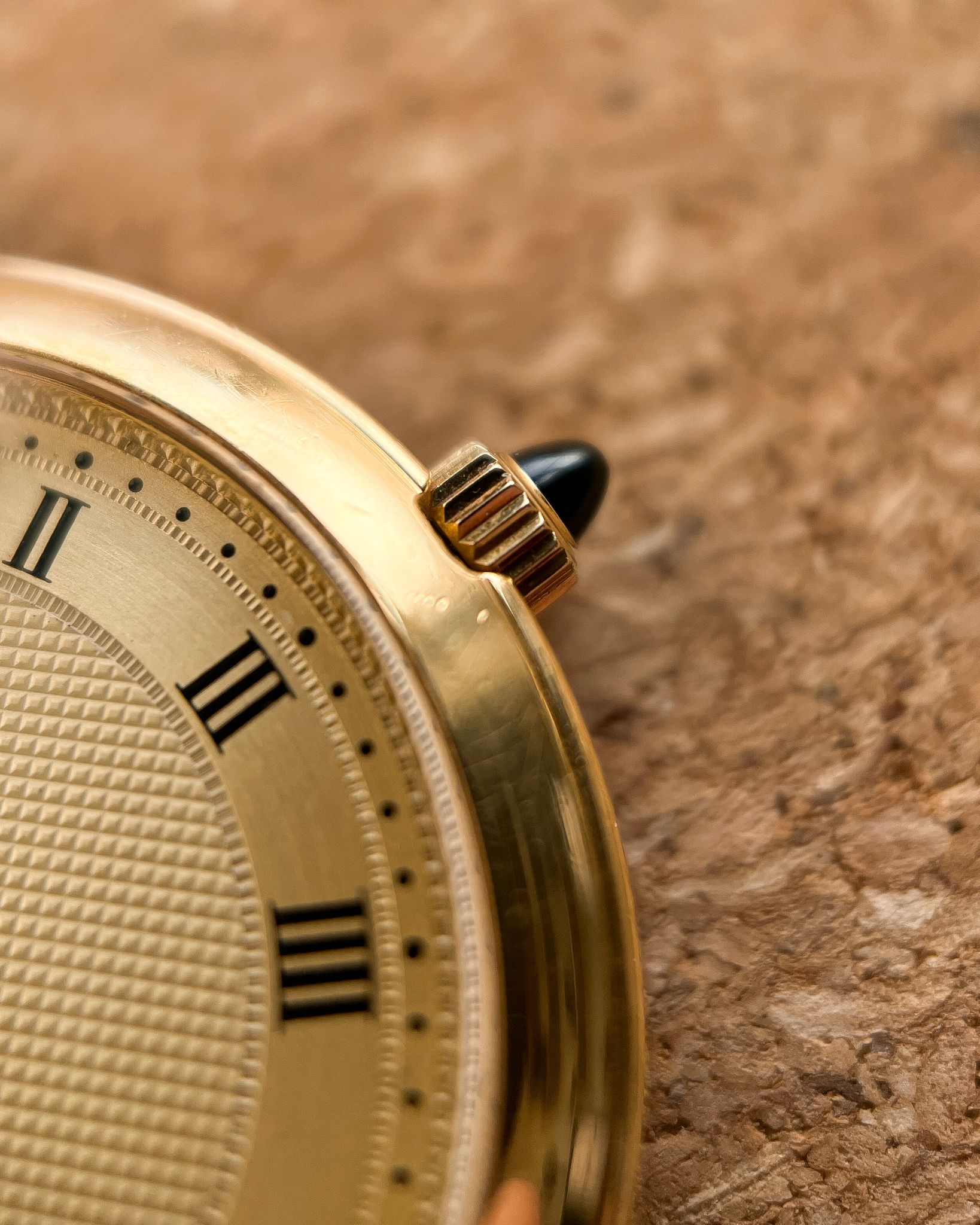 What I love — Gold on gold 80’s rarity with a sprinkling of double-signed delight and rosey patina! This gorgeous watch is covered in French hallmarks and features the smooth case back with hand engraved serial. Overall fantastic vintage condition coming with original buckle and classic Breguet charm, find me another …