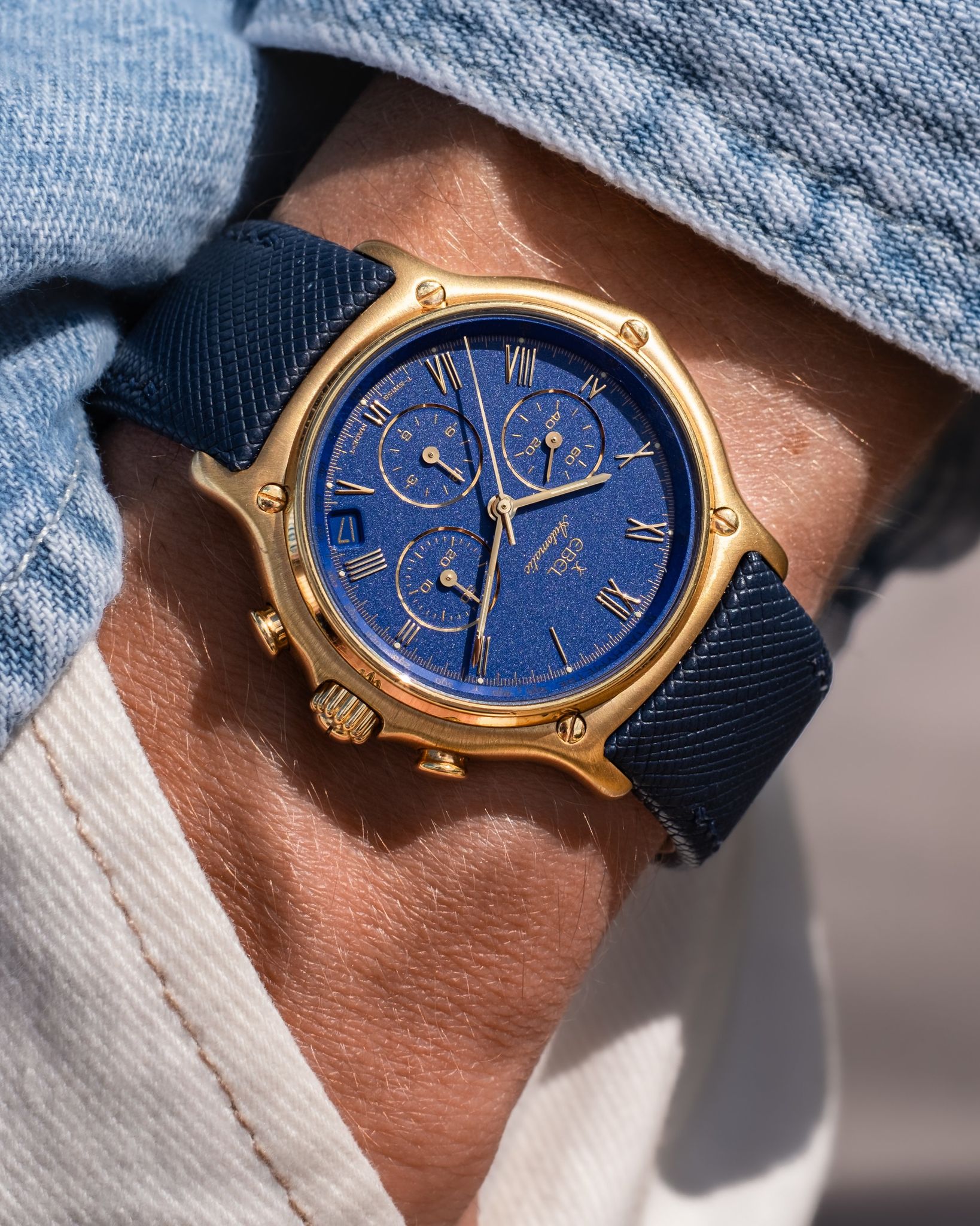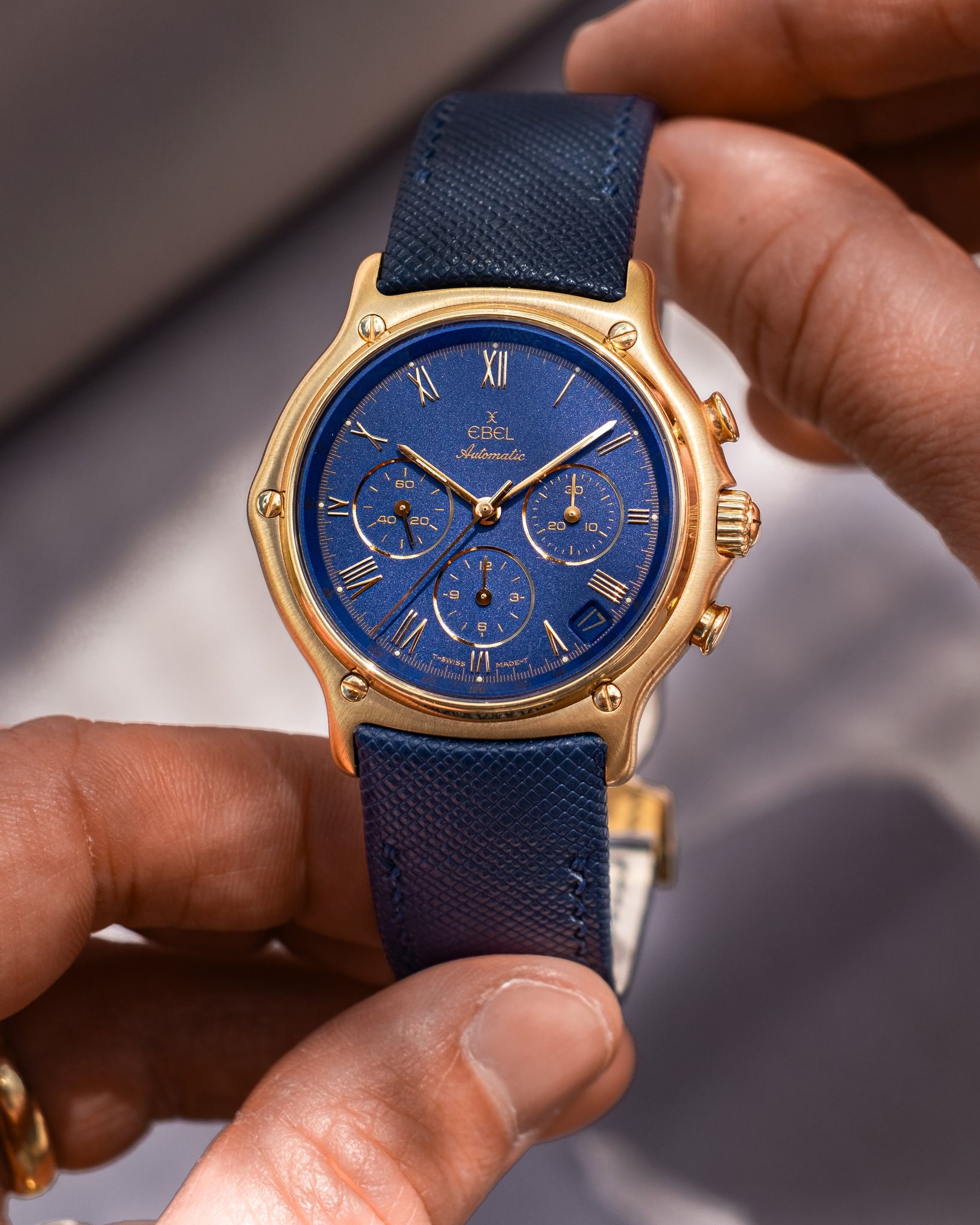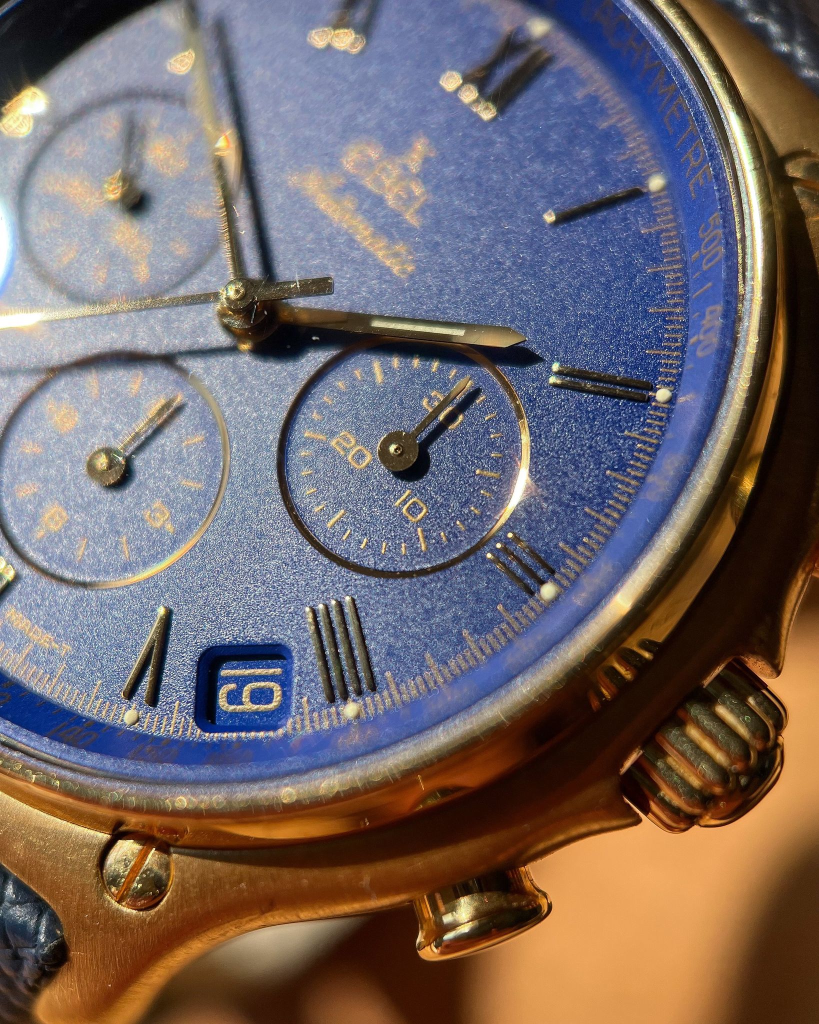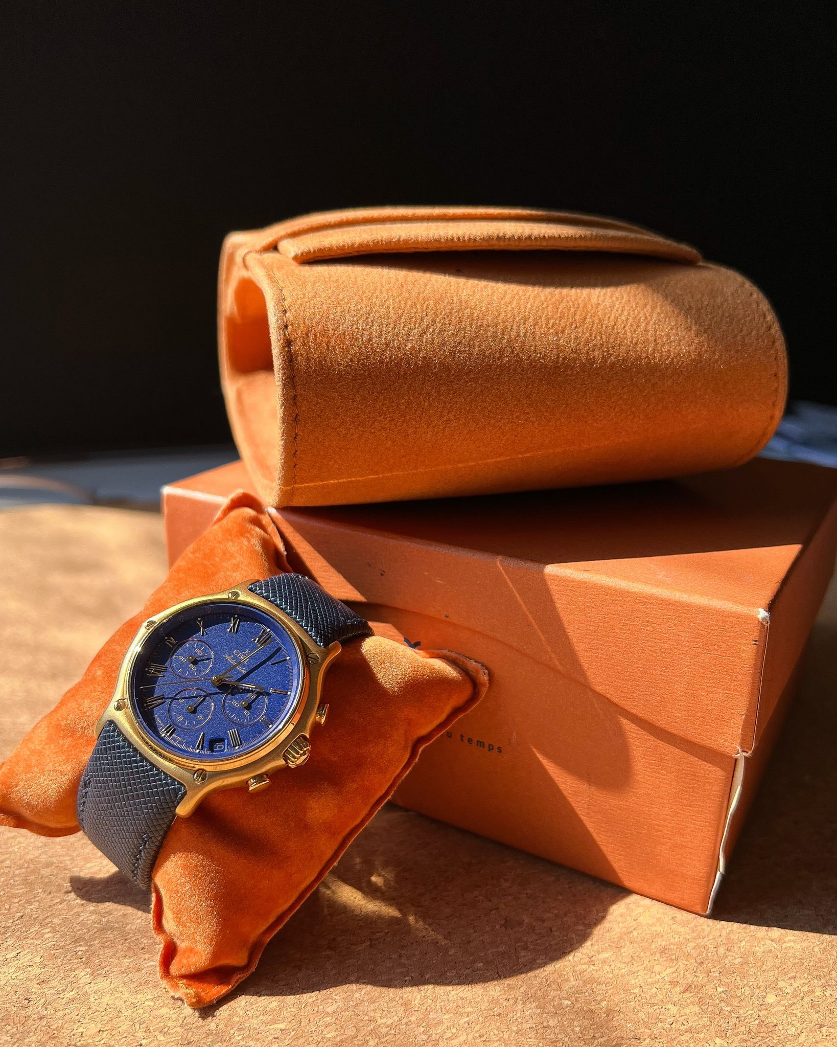 What I love — 30 years old and barely a scratch on the watch, a real time capsule. The matte blue dial is flawless with beautiful gold accents, the original handset is also in perfect condition. The 18k yellow gold case has the original unpolished factory finish with the hallmarks and engravings crisp. The original 18k yellow gold deployant accompanies the watch, as does the boxset.