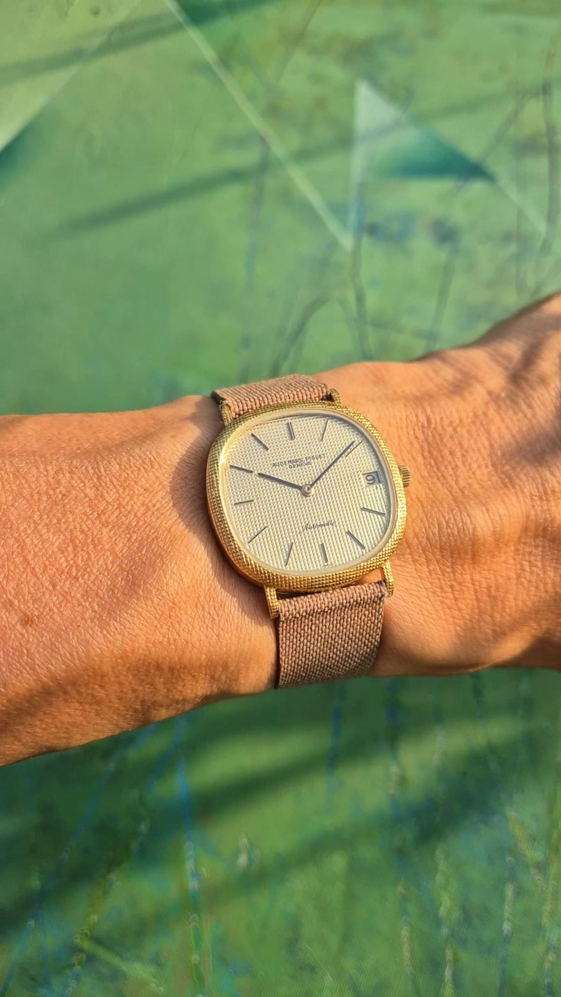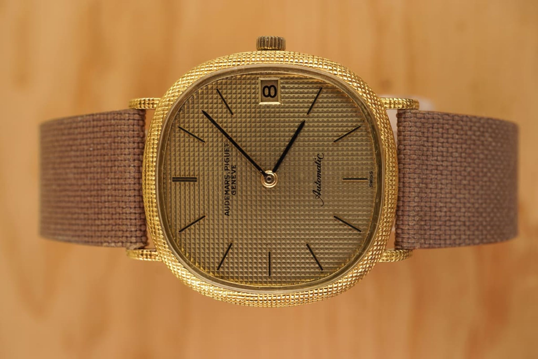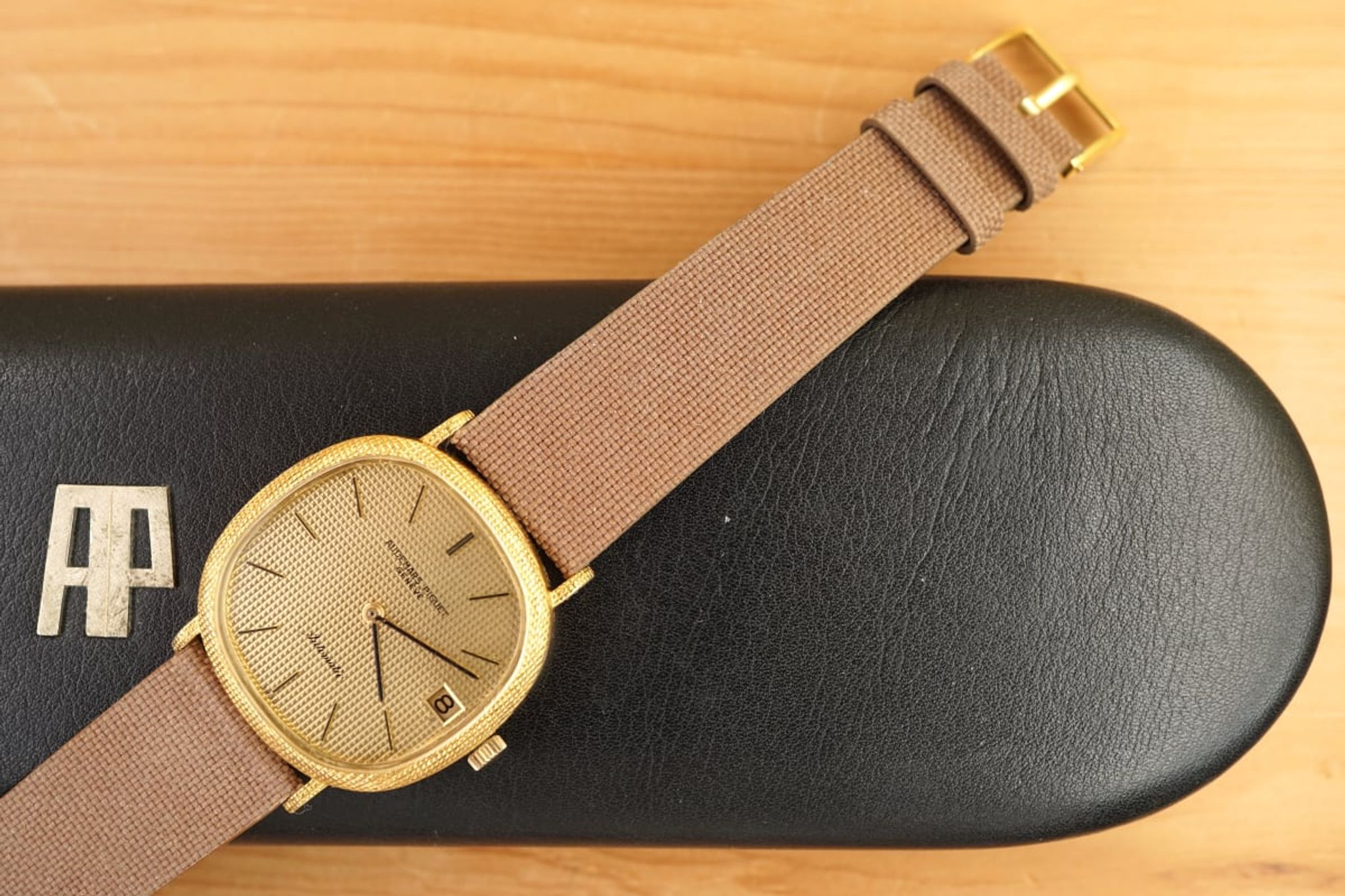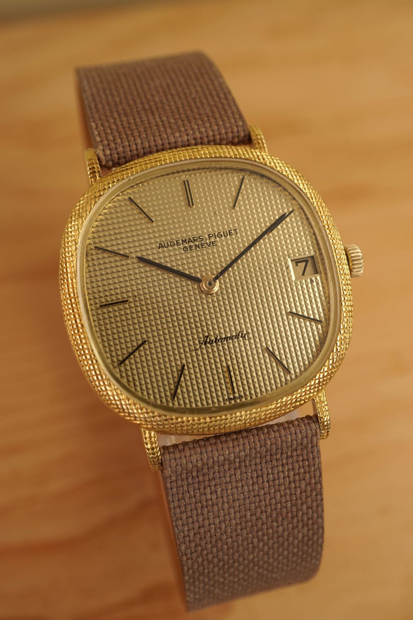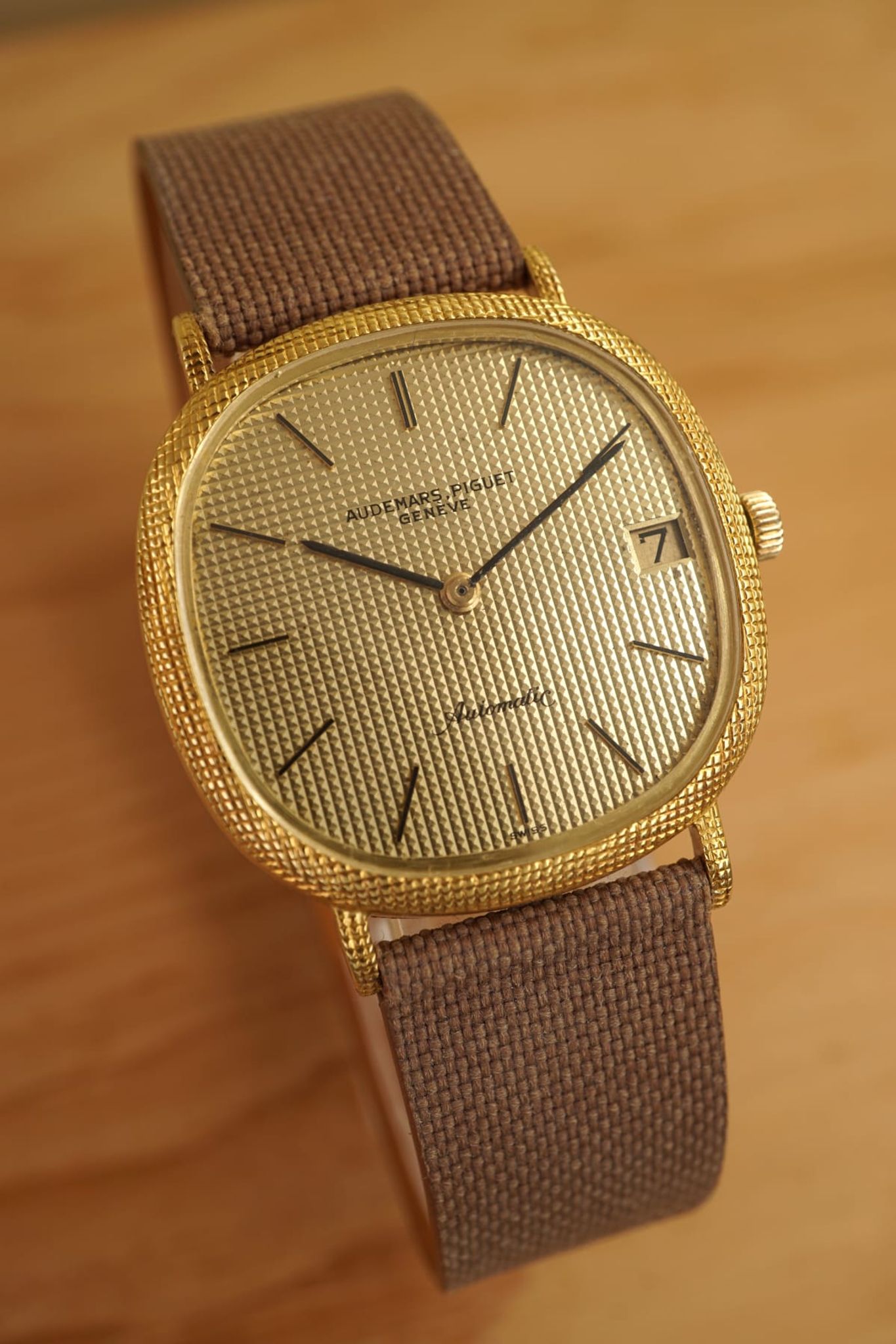 This beauty was made in 1969 or 1970 according to our books and research and is still in beautiful condition & appearance: a very rare Clous-de-Paris- / Hobnail-decorated AP Jumbo-Ellipse with the well known and celebrated cal2121 (serviced) -- the cal2120 with date-mechanism. We decided to add a linen-strap to it, which holds the original gold-plated AW-buckle on the other side.