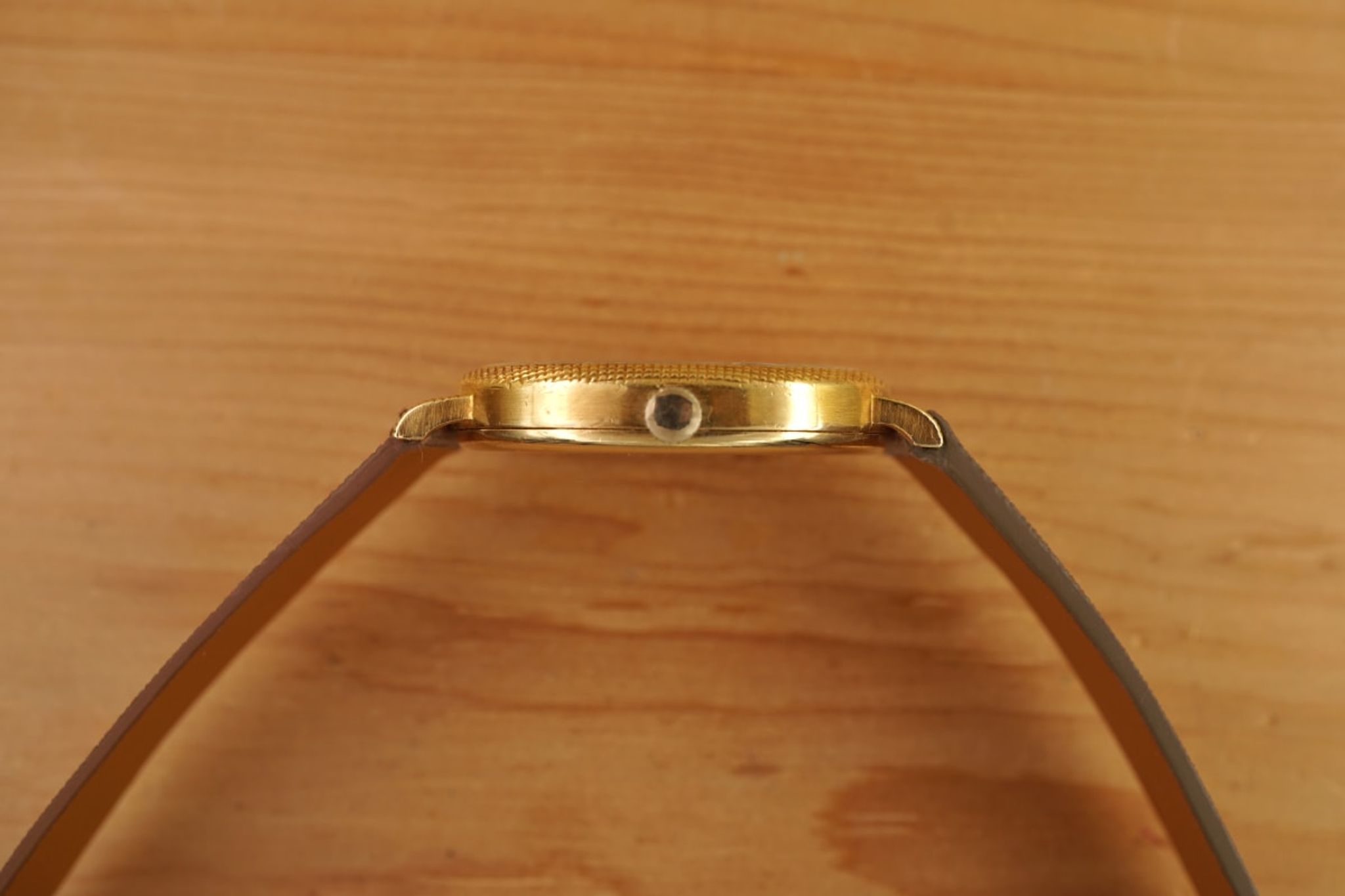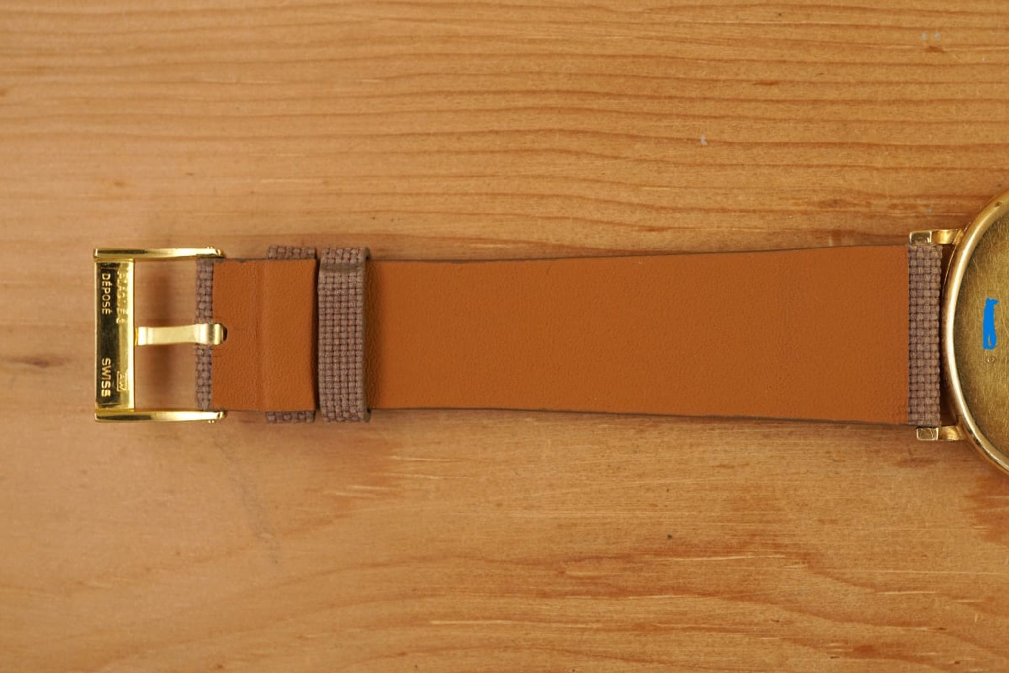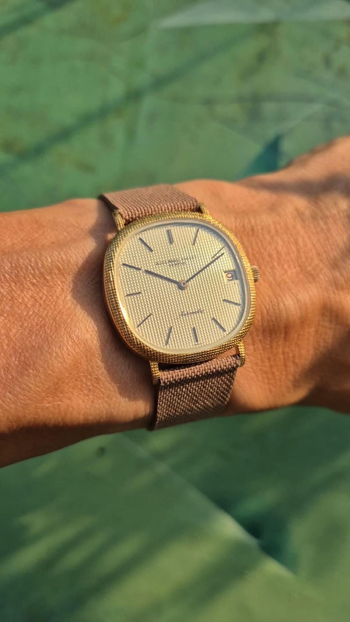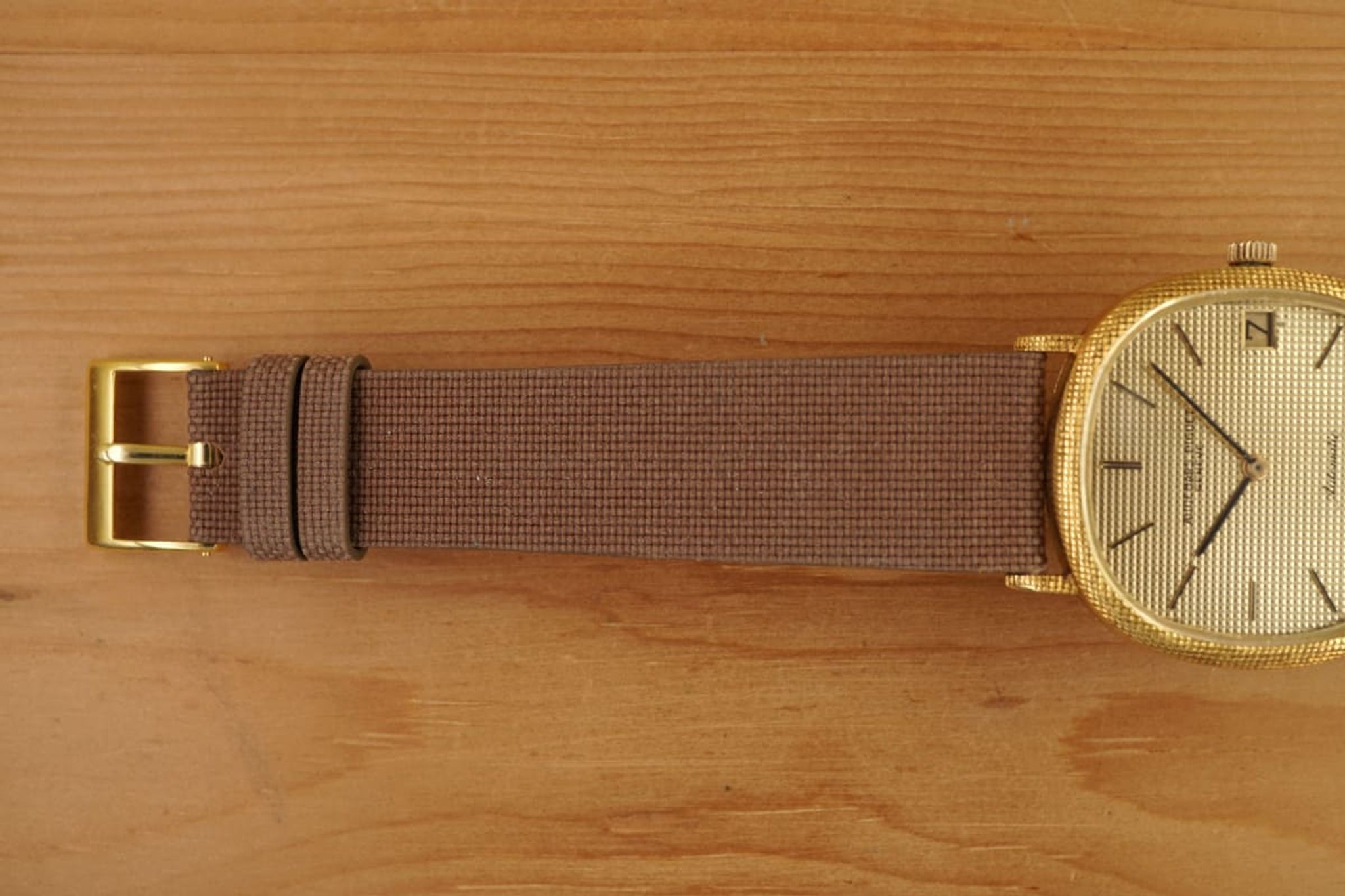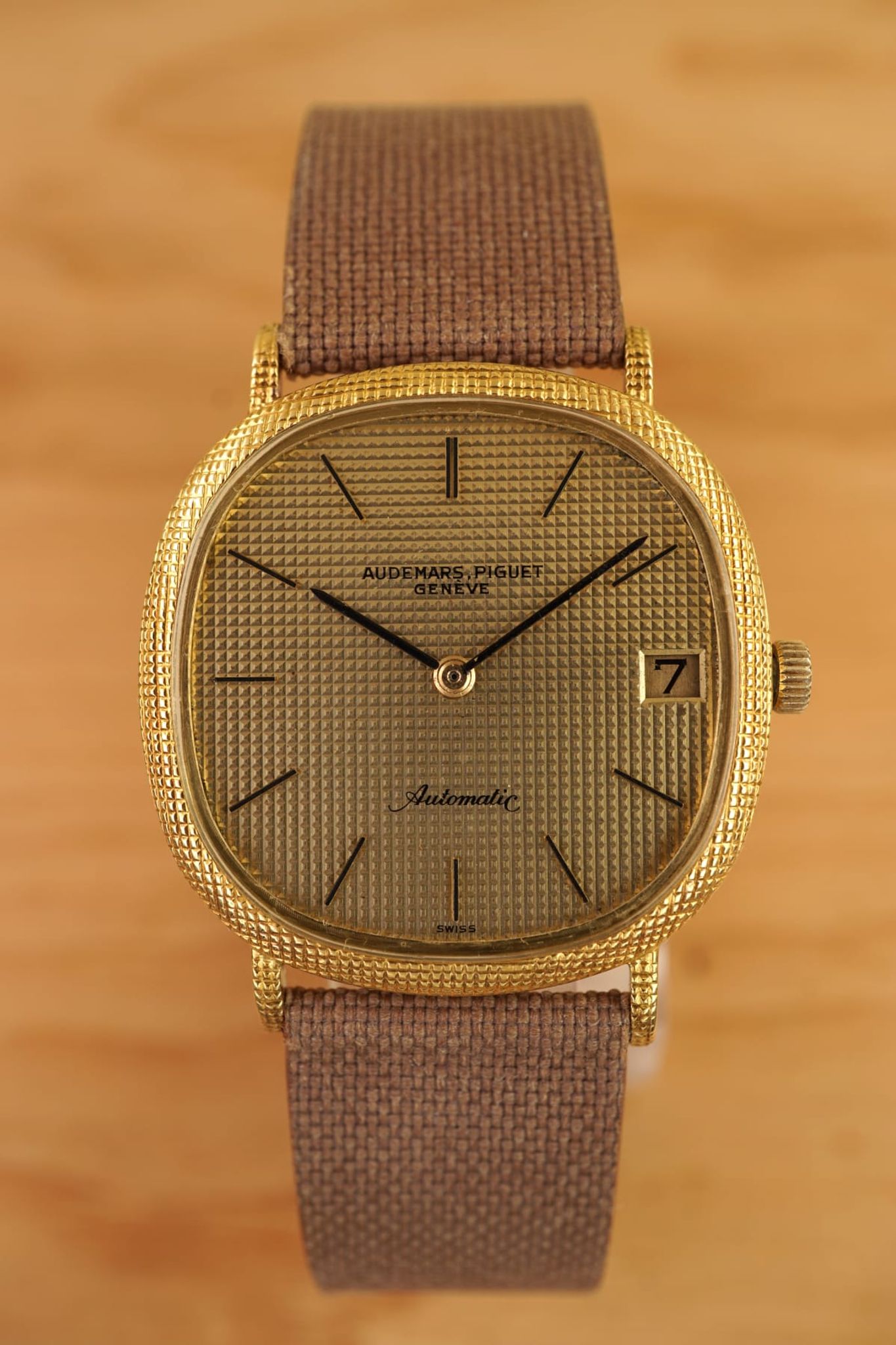 This beauty was made in 1969 or 1970 according to our books and research and is still in beautiful condition & appearance: a very rare Clous-de-Paris- / Hobnail-decorated AP Jumbo-Ellipse with the well known and celebrated cal2121 (serviced) -- the cal2120 with date-mechanism. We decided to add a linen-strap to it, which holds the original gold-plated AW-buckle on the other side.