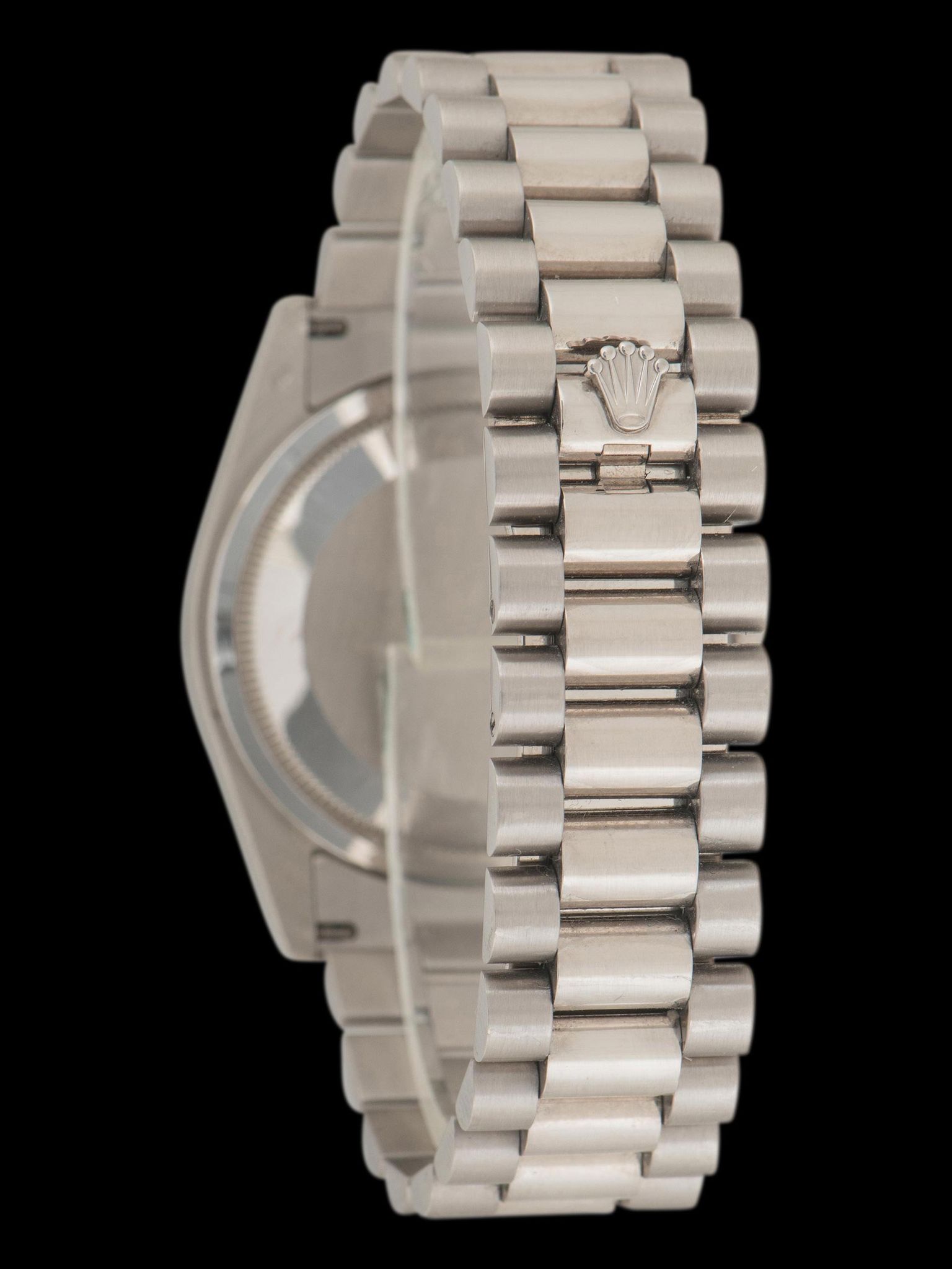 The 18K white gold case is in excellent overall condition, showing factory dimensions throughout showing with honest signs of gentle use. The fluted 18K white gold bezel retains crisp edges with no notable wear present. The original Rolex 18K white gold President bracelet retains 22 links that show nominal stretch and will fit up to a 7-inch wrist.